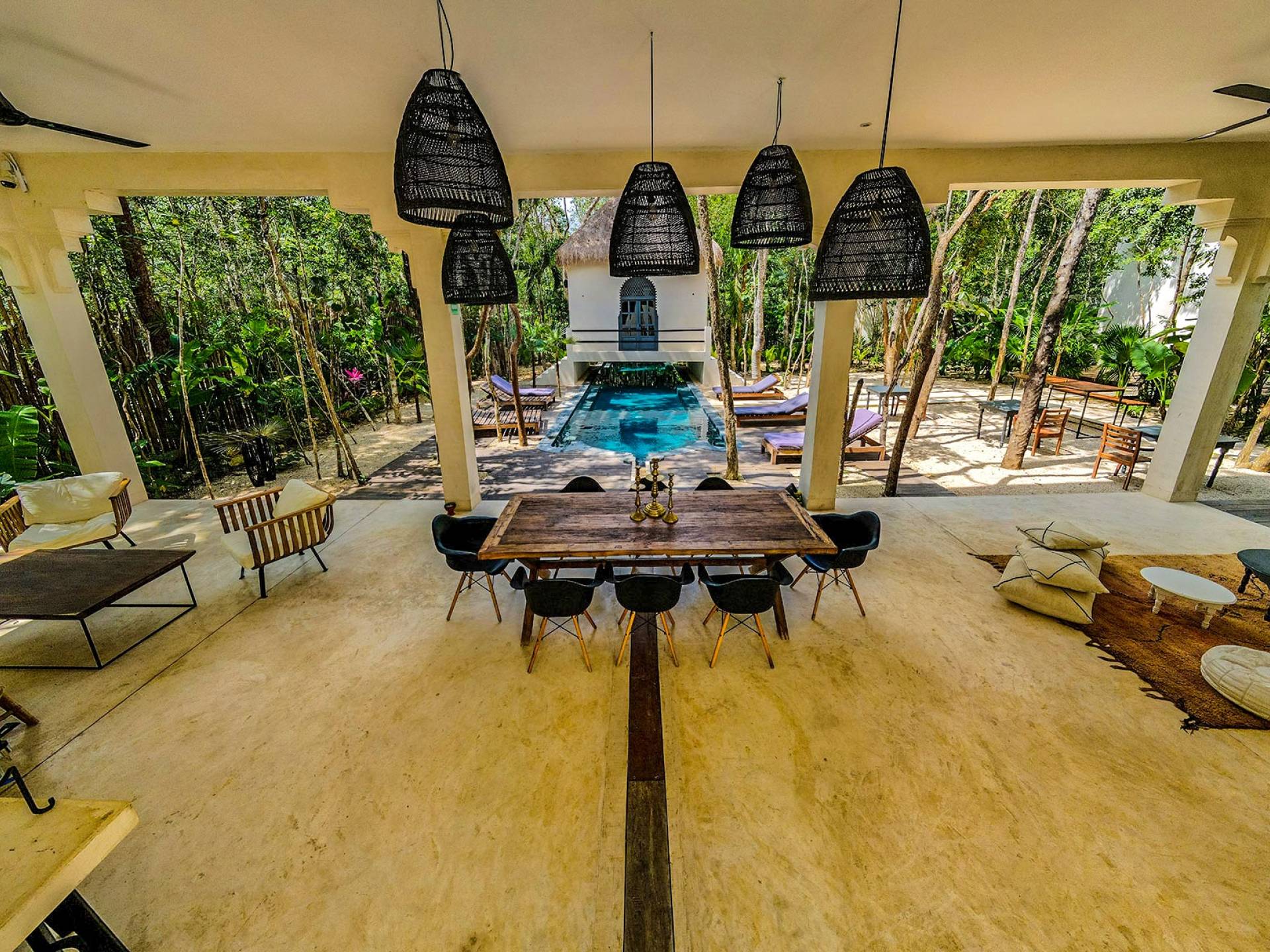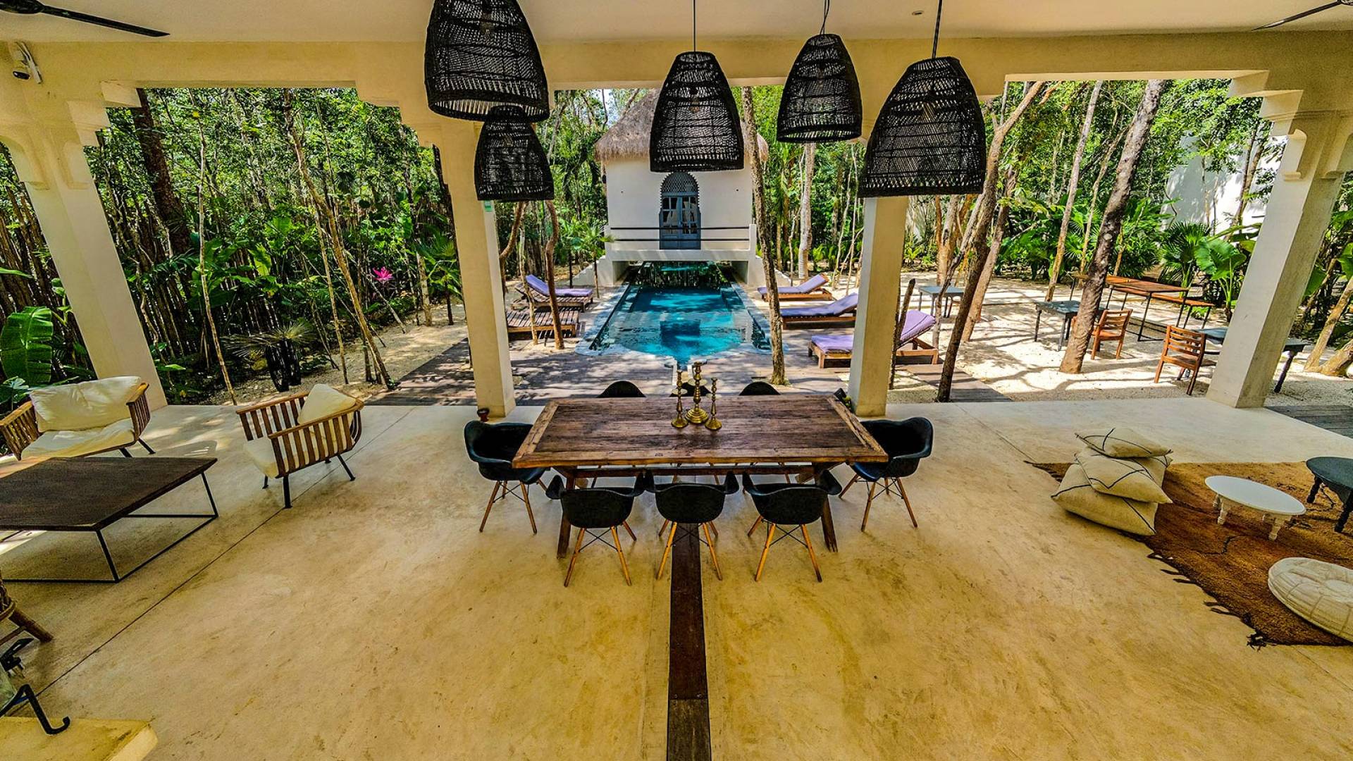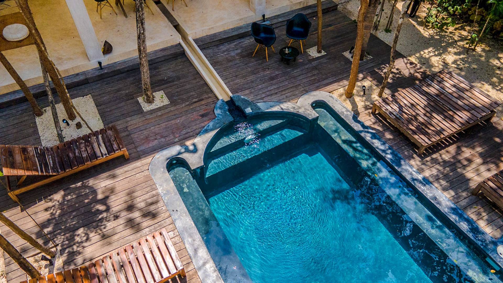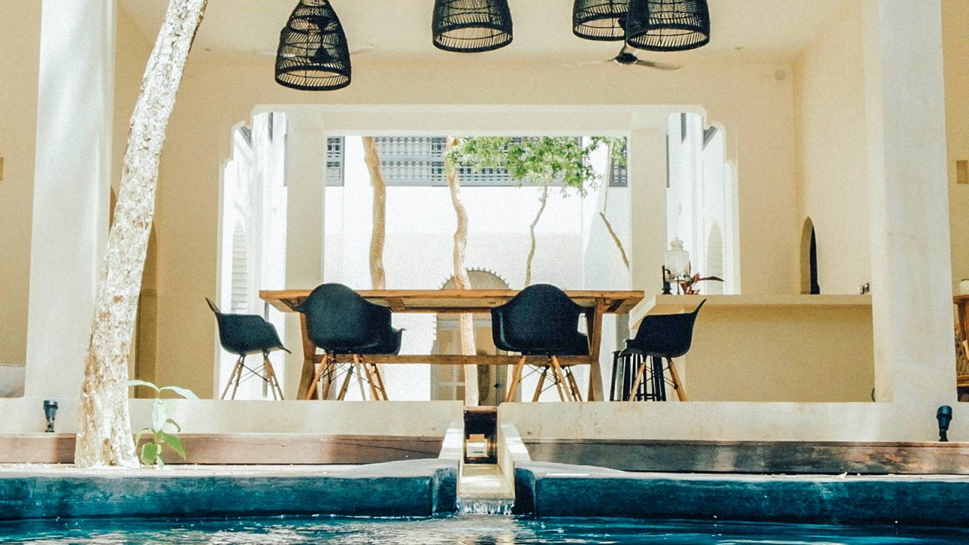 The openness of the architecture, distributed around the courtyards, is an invitation to enjoy outdoor living. The large dining tables by the pools integrate into the gardens and their endemic trees, while fully-equipped kitchens are perfect for preparing large family meals. There is even a personal chef available during your stay. Further, both homes are equipped with air conditioning, Wi-Fi. Villa Riad Ambre et Epices is located in one of Tulum’s newest neighborhoods, just 15 minutes away from the beach and very close to the town’s vibrant center.