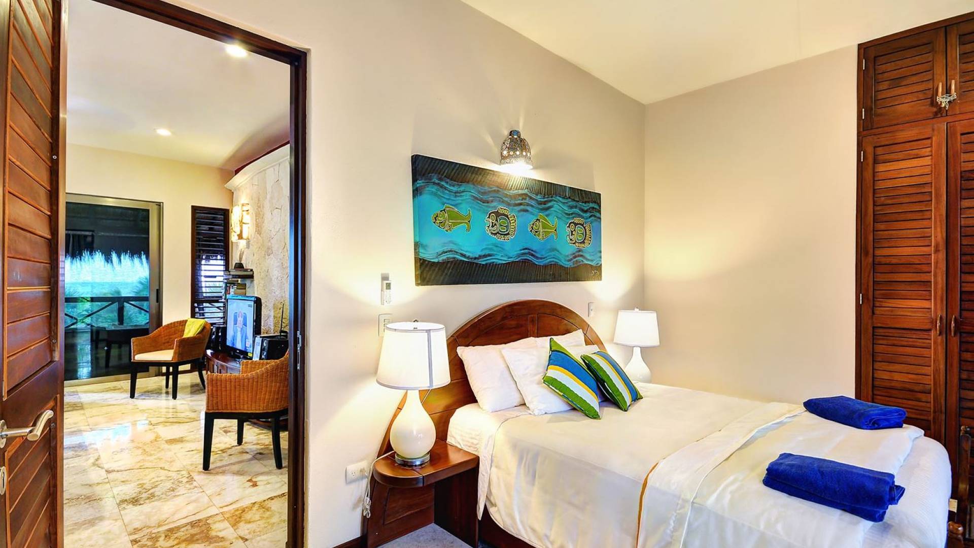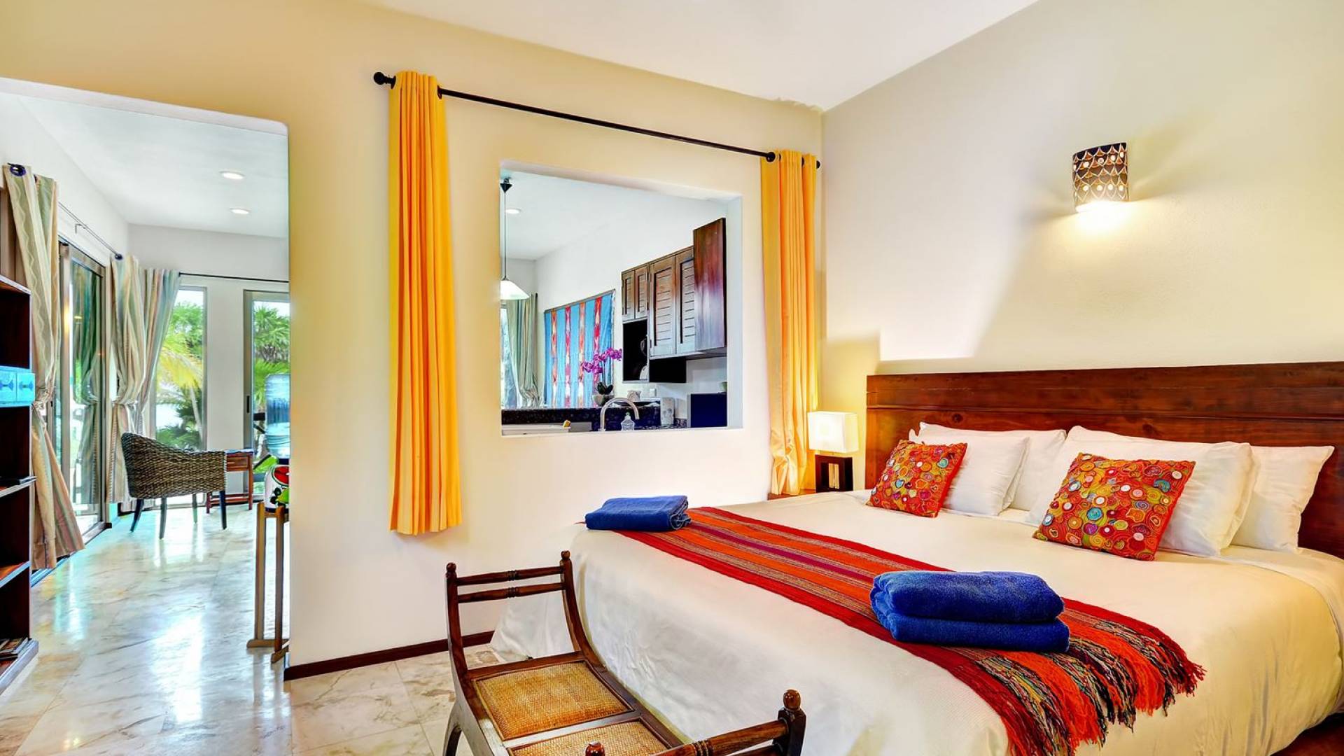 Sirocco: has a living room with an American-style kitchen fully furnished, 1 king-size bedroom room facing the sea & a second room with 1 queen-size and 1 single bed facing the tropical garden and a large terrace facing the beach.