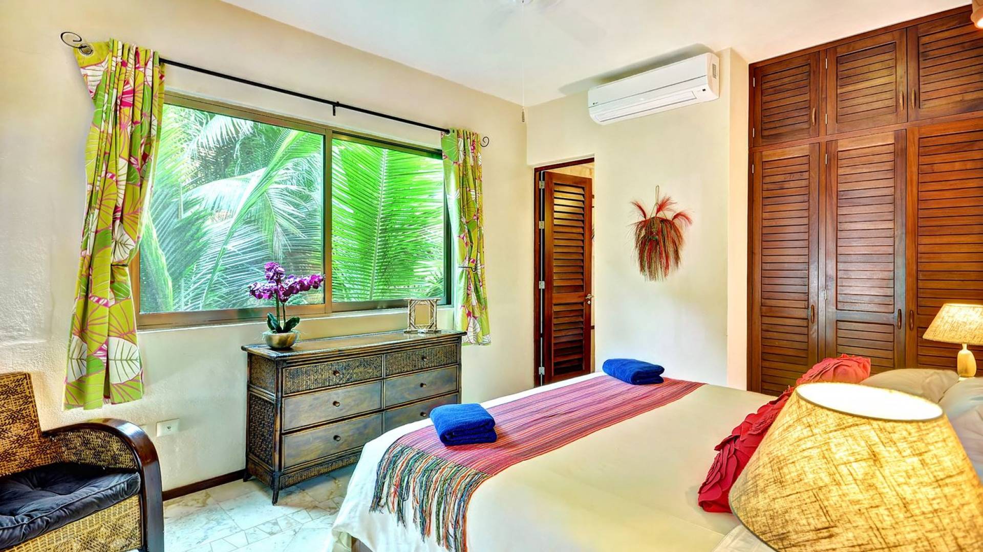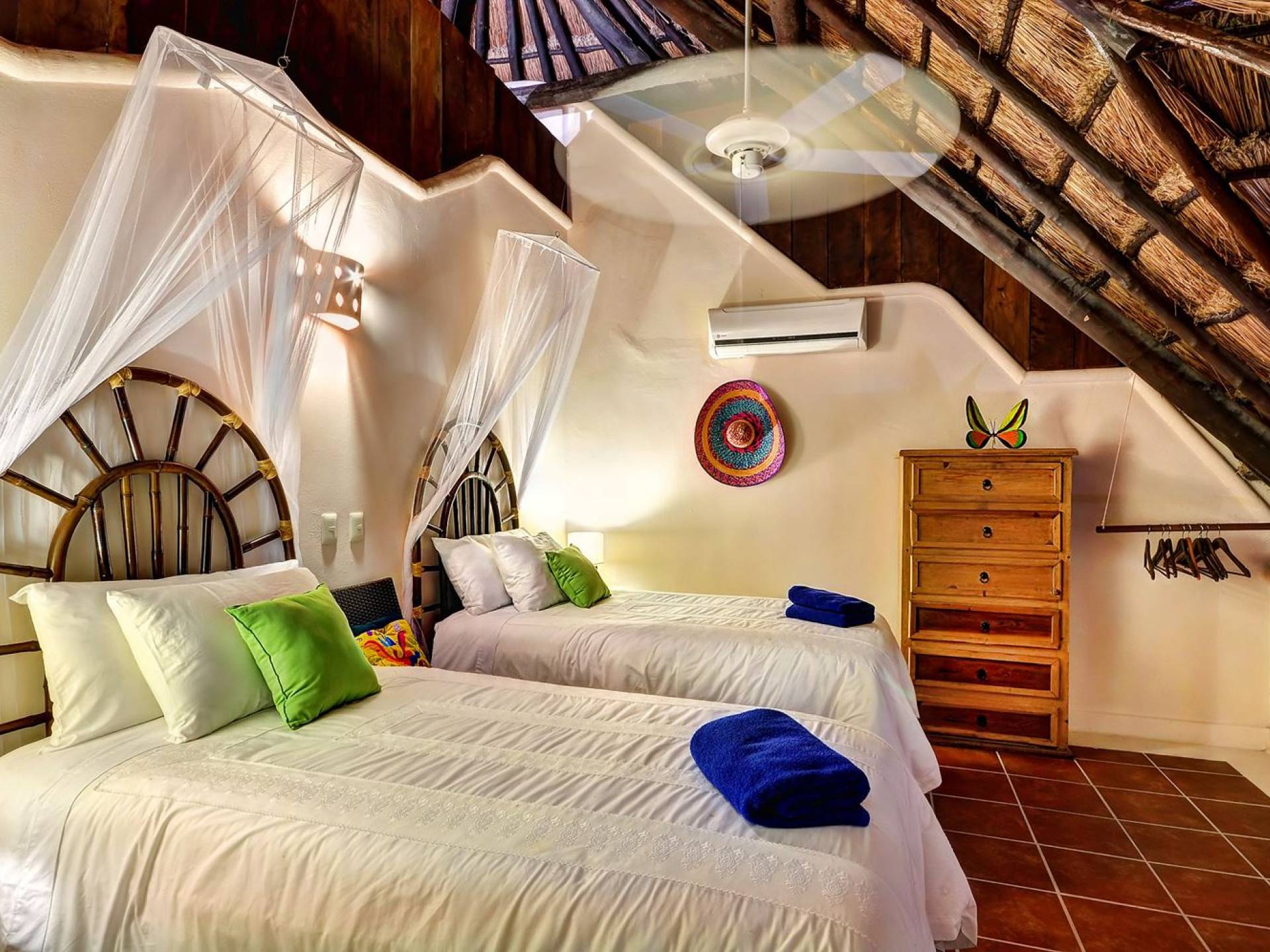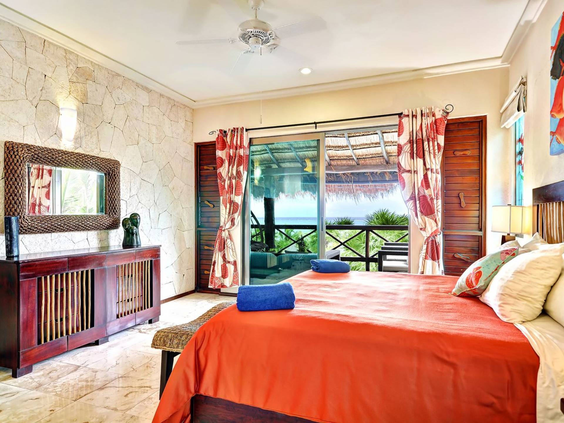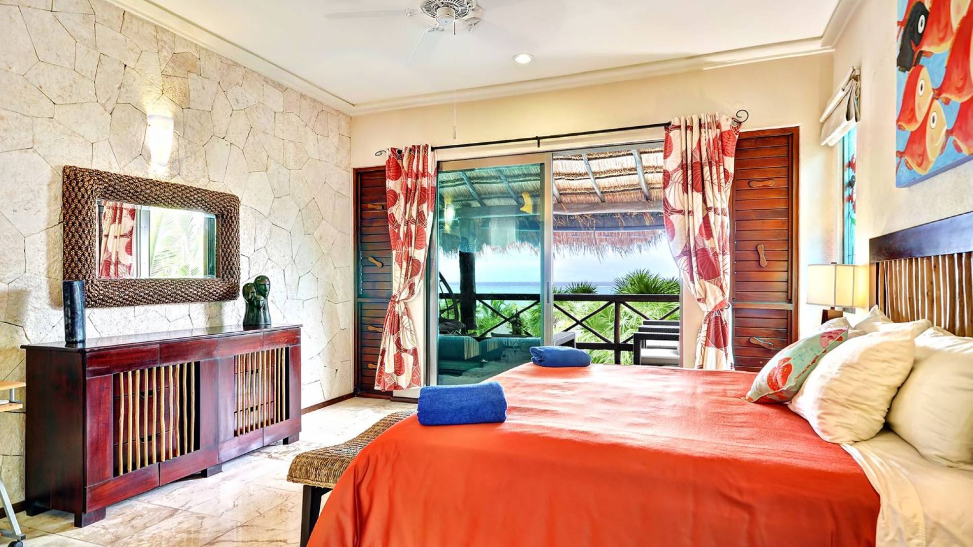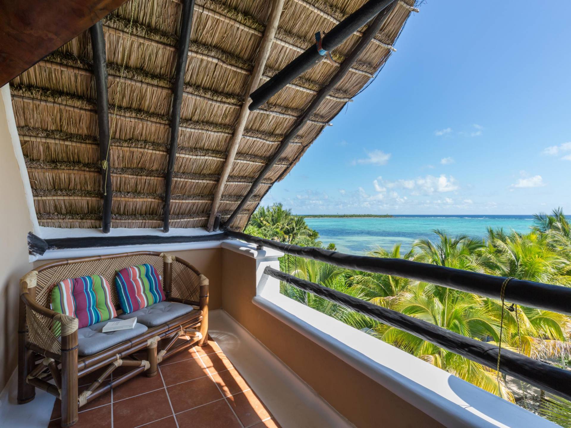 Mistral features 2 large bedrooms with A/C and private bathrooms to complete the package. One bedroom features a king-size bed facing the sea and the second bedroom features a queen-size bed with a private terrace facing the tropical garden. These 2 separate accommodations are for 2–5 people; enjoy the sea breeze as you relax in comfortable outdoor loungers. On the top floor, under the palapa, a Caribbean atmosphere is assured. You will discover a large king-size bedroom with an ensuite bathroom. It also has a private terrace where you will enjoy the beautiful picture-frame view of the bay.
