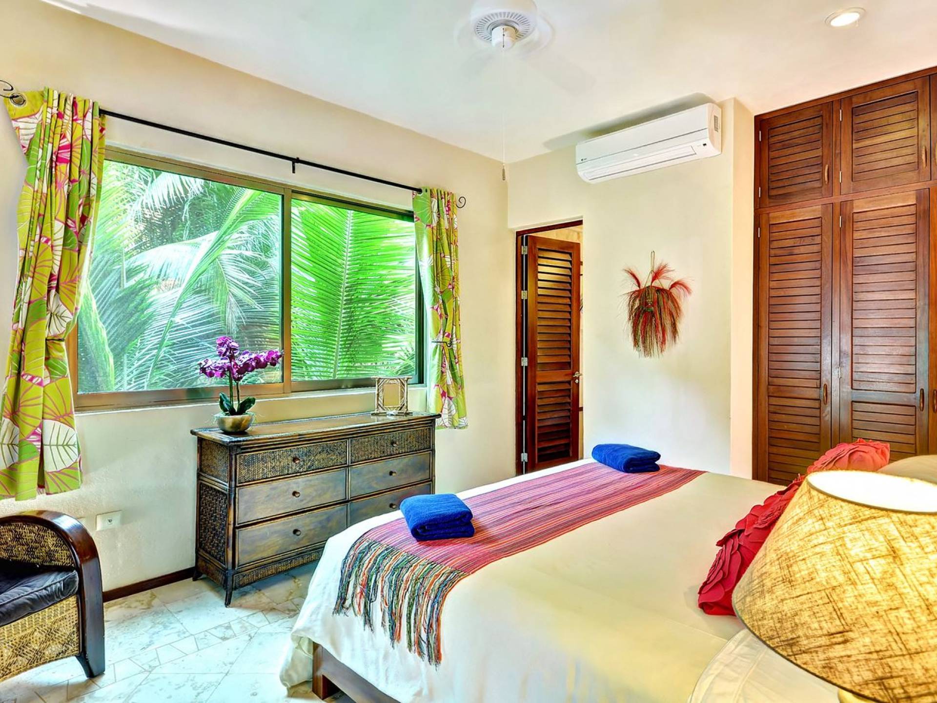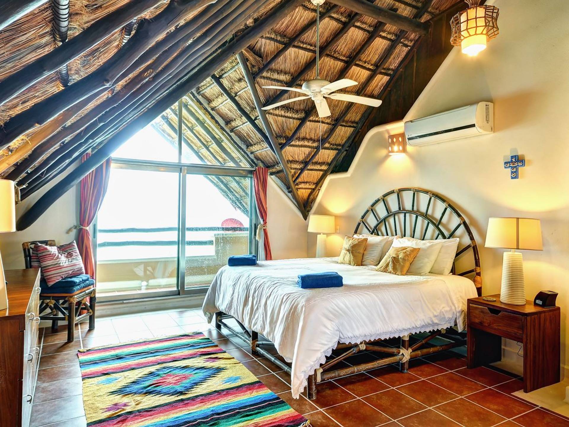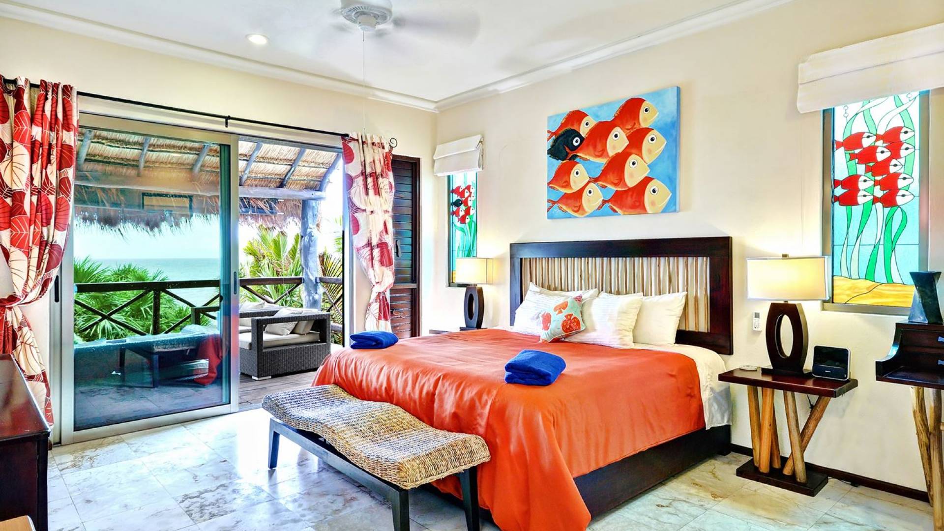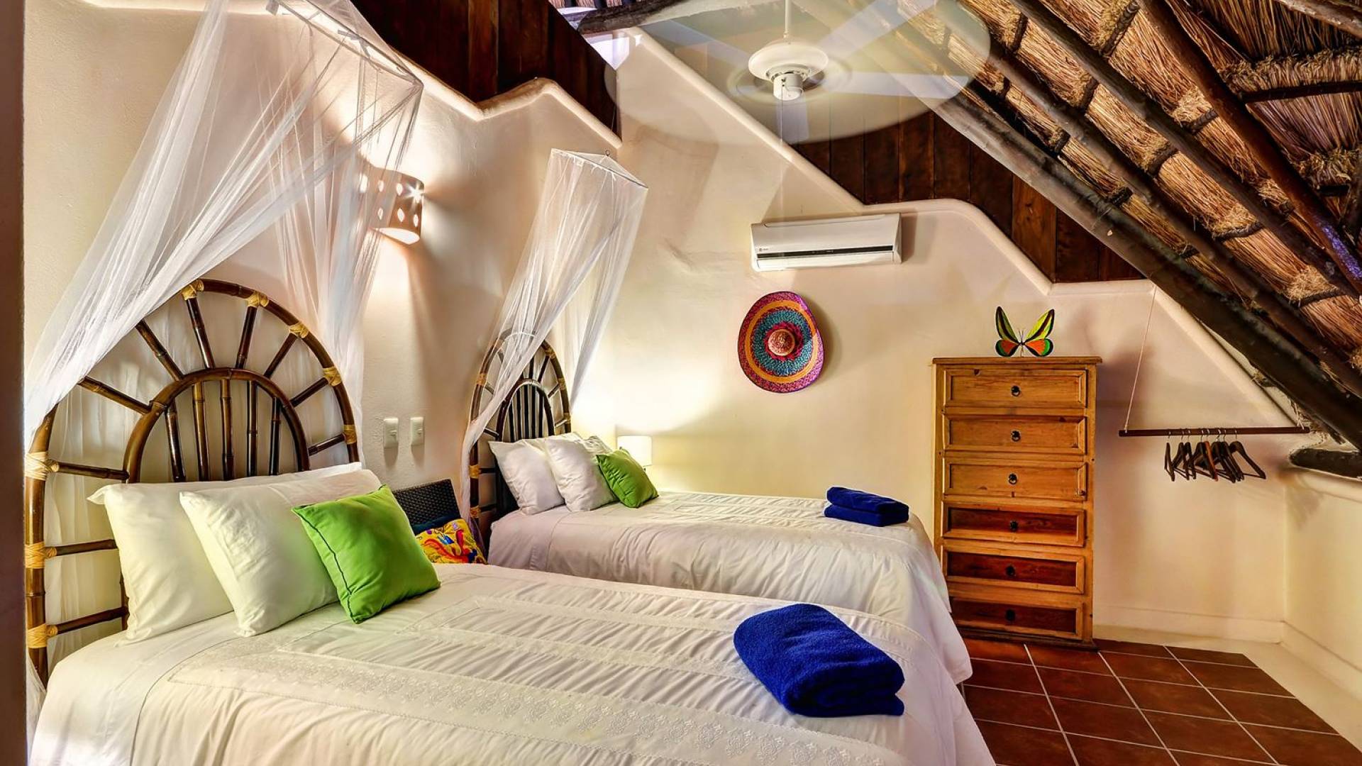 Mistral features 2 large bedrooms with A/C and private bathrooms to complete the package. One bedroom features a king-size bed facing the sea and the second bedroom features a queen-size bed with a private terrace facing the tropical garden. These 2 separate accommodations are for 2–5 people; enjoy the sea breeze as you relax in comfortable outdoor loungers. On the top floor, under the palapa, a Caribbean atmosphere is assured. You will discover a large king-size bedroom with an ensuite bathroom. It also has a private terrace where you will enjoy the beautiful picture-frame view of the bay.
