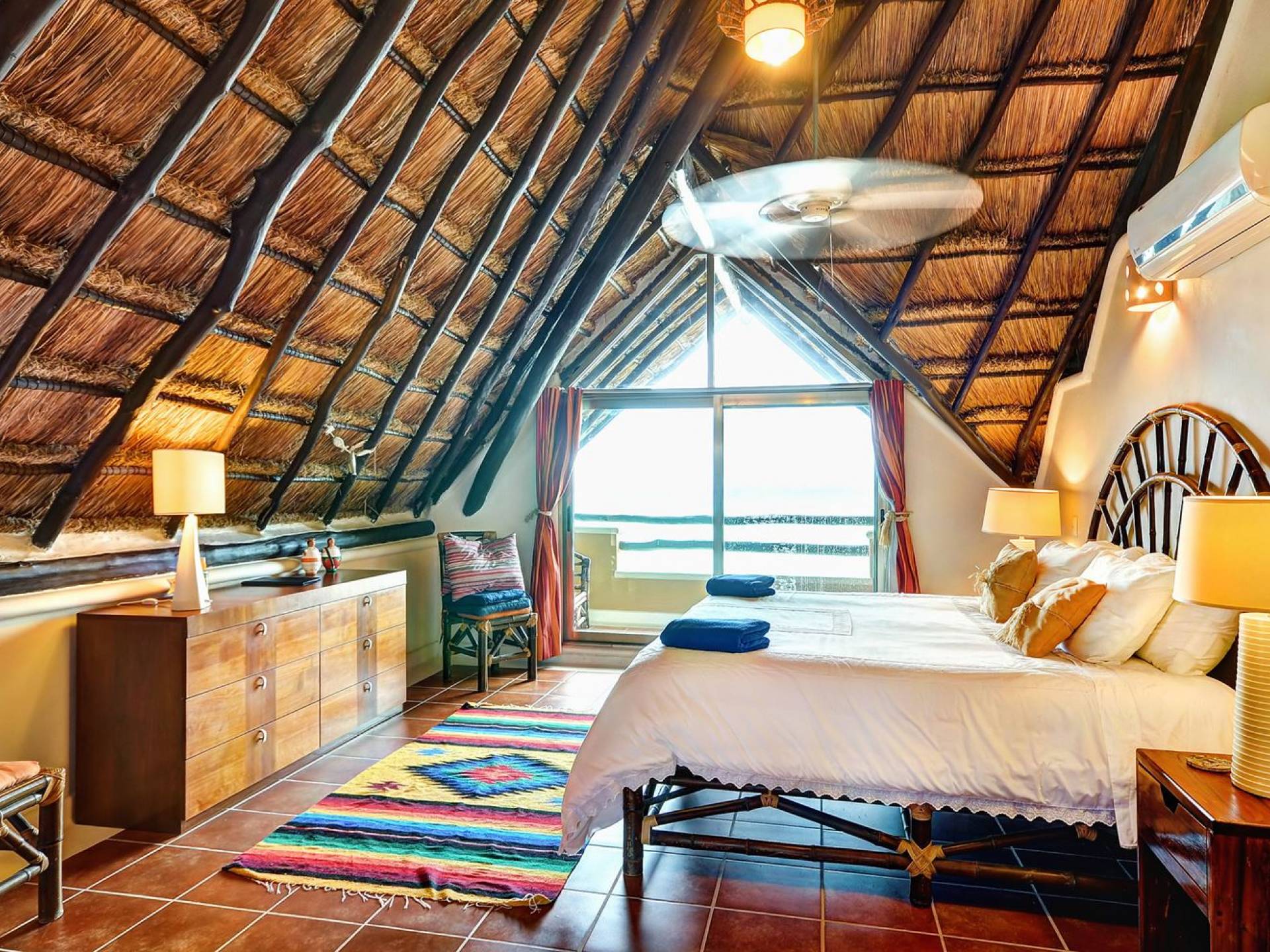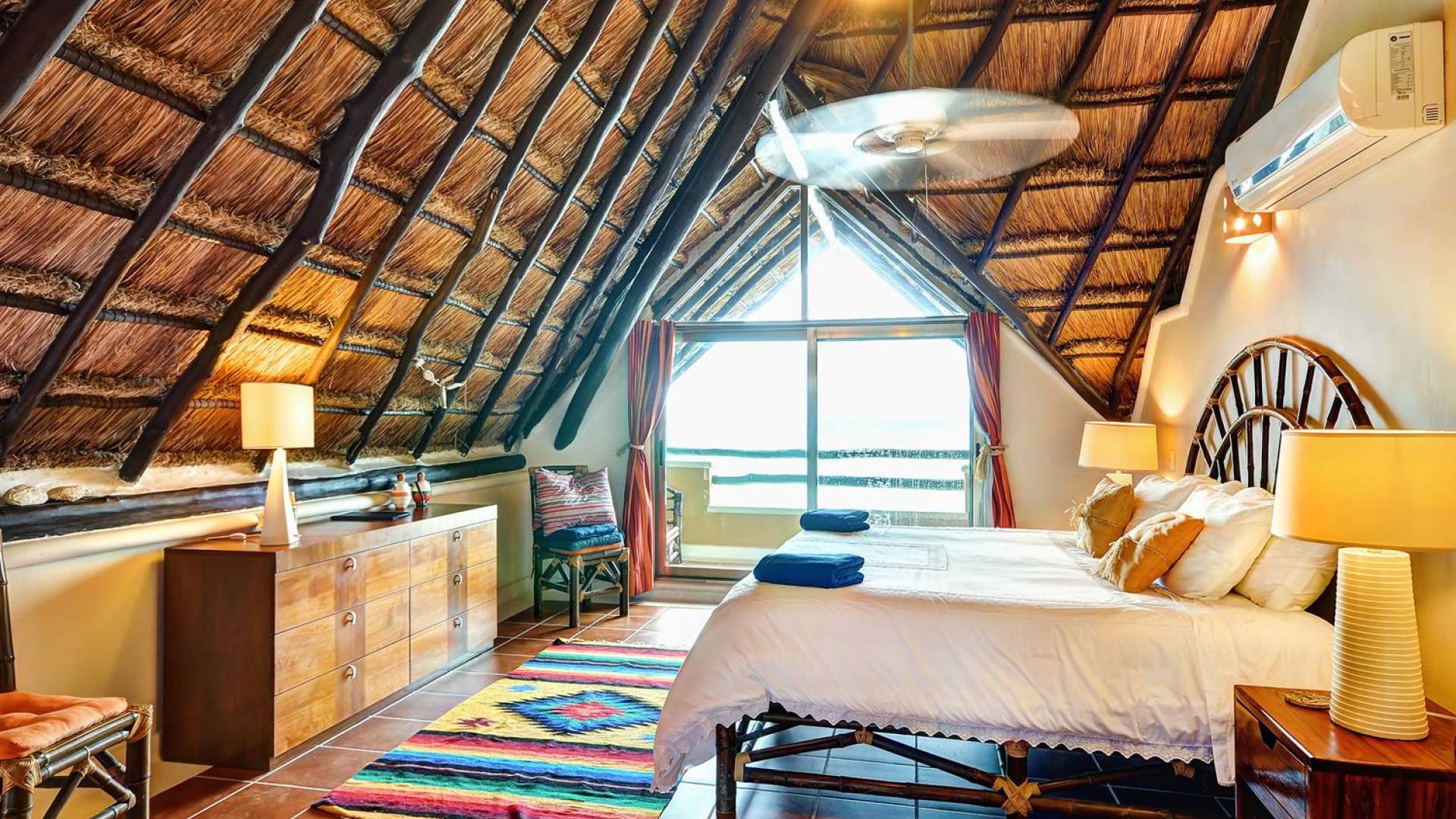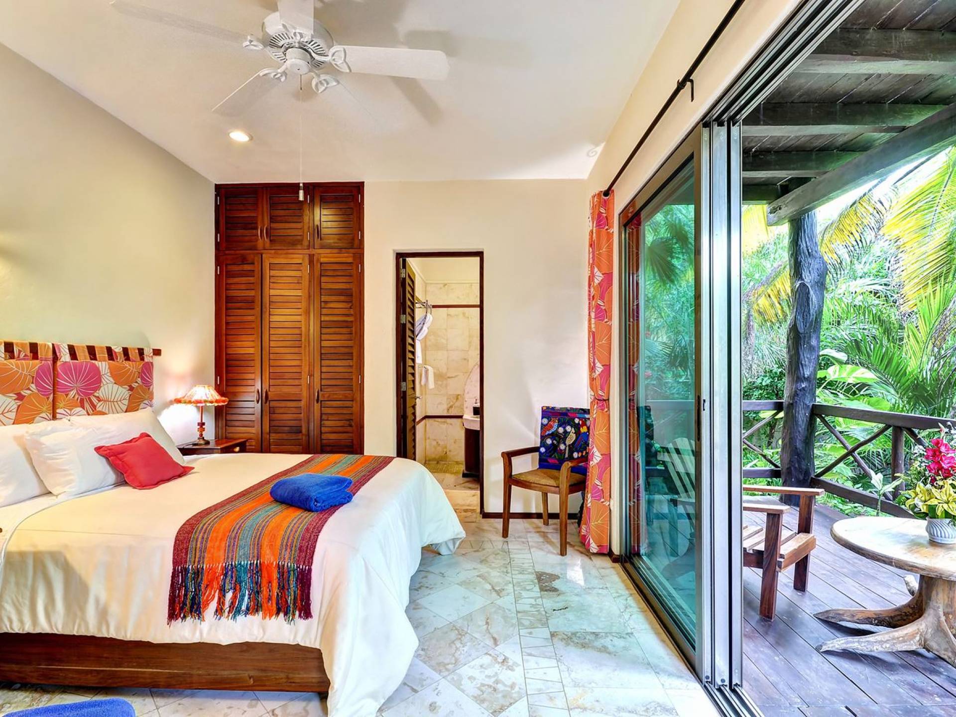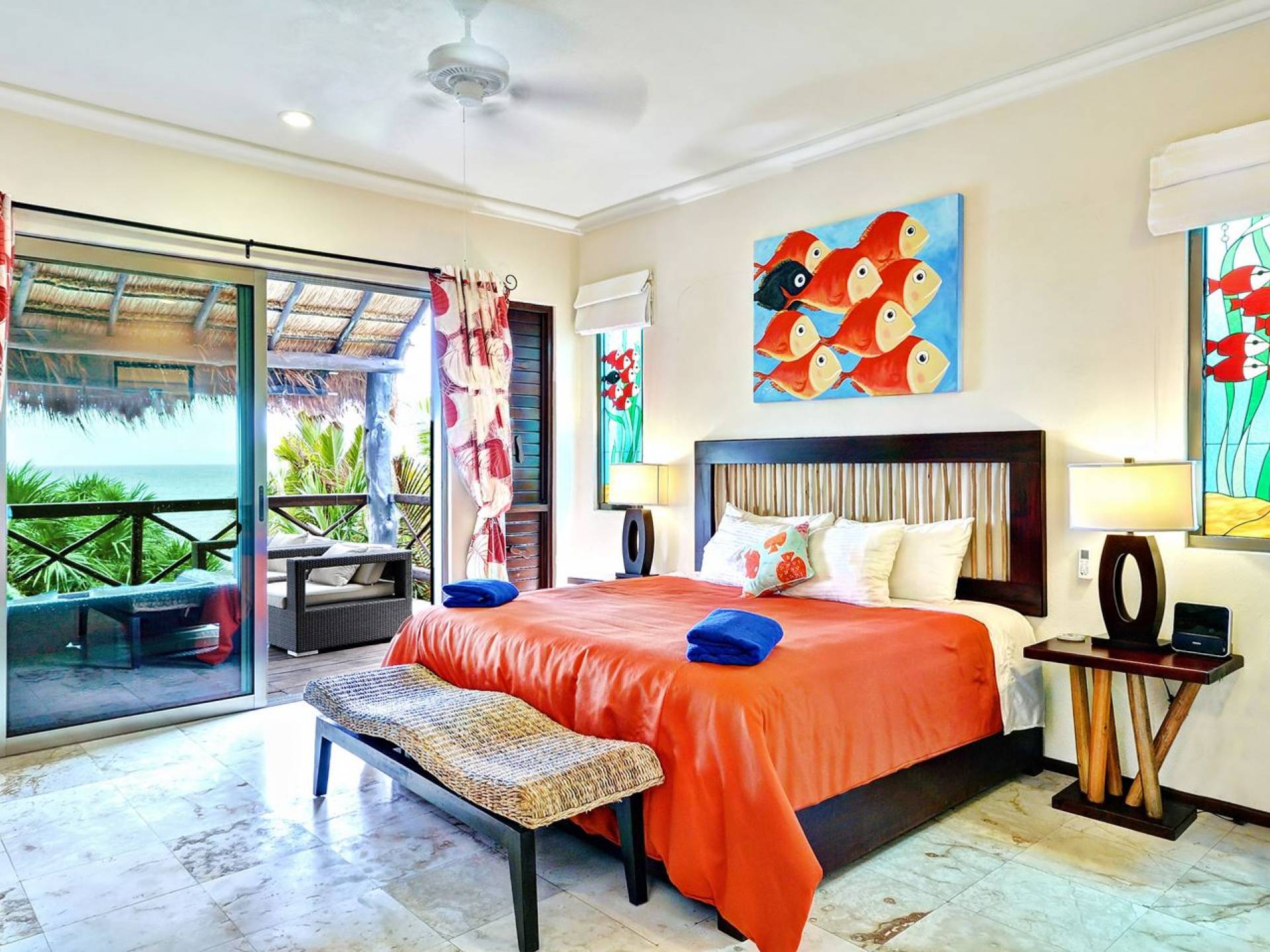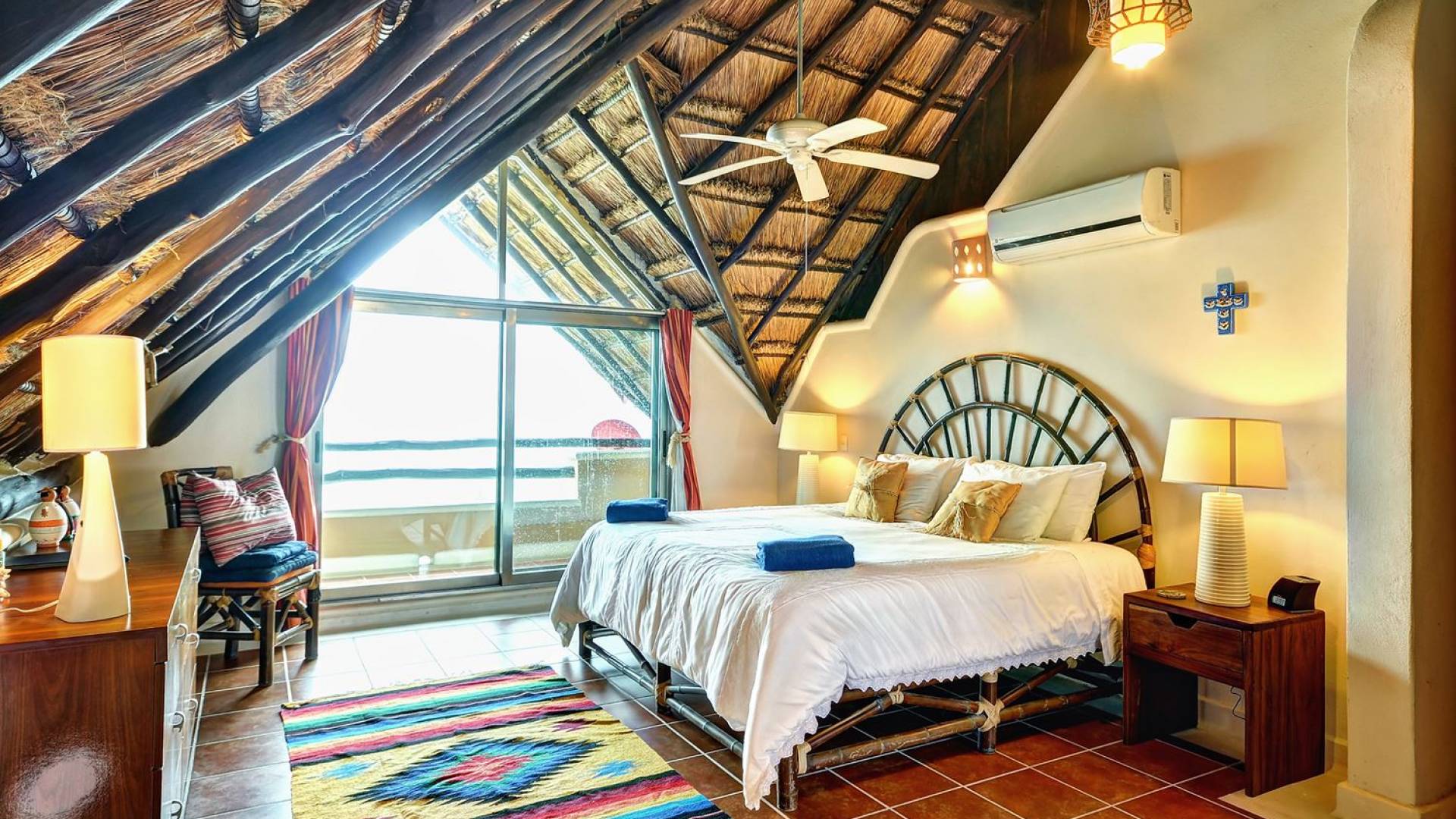 Mistral features 2 large bedrooms with A/C and private bathrooms to complete the package. One bedroom features a king-size bed facing the sea and the second bedroom features a queen-size bed with a private terrace facing the tropical garden. These 2 separate accommodations are for 2–5 people; enjoy the sea breeze as you relax in comfortable outdoor loungers. On the top floor, under the palapa, a Caribbean atmosphere is assured. You will discover a large king-size bedroom with an ensuite bathroom. It also has a private terrace where you will enjoy the beautiful picture-frame view of the bay.