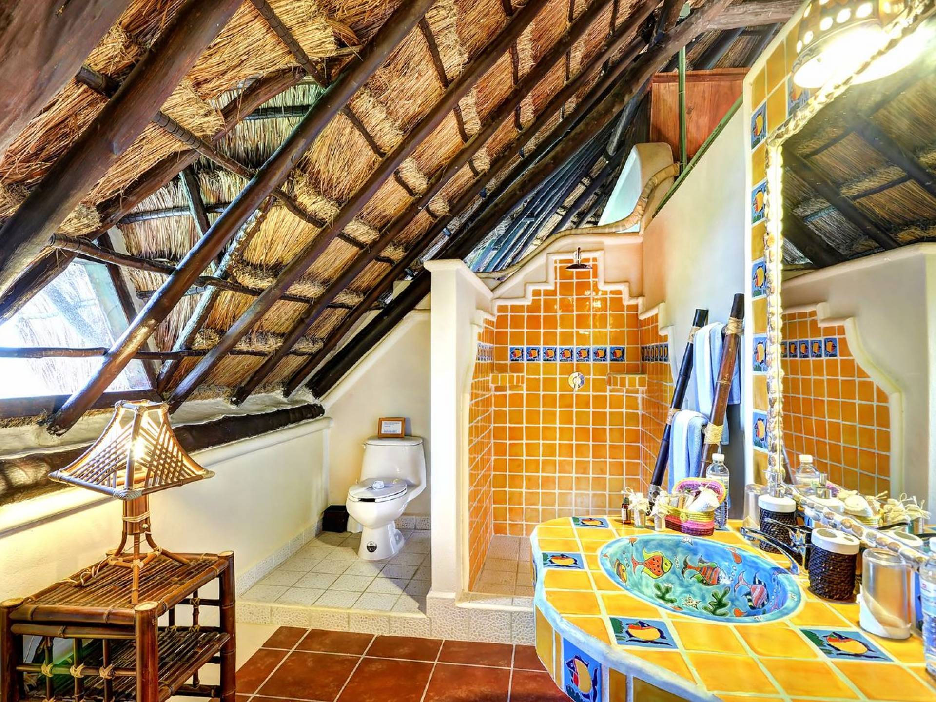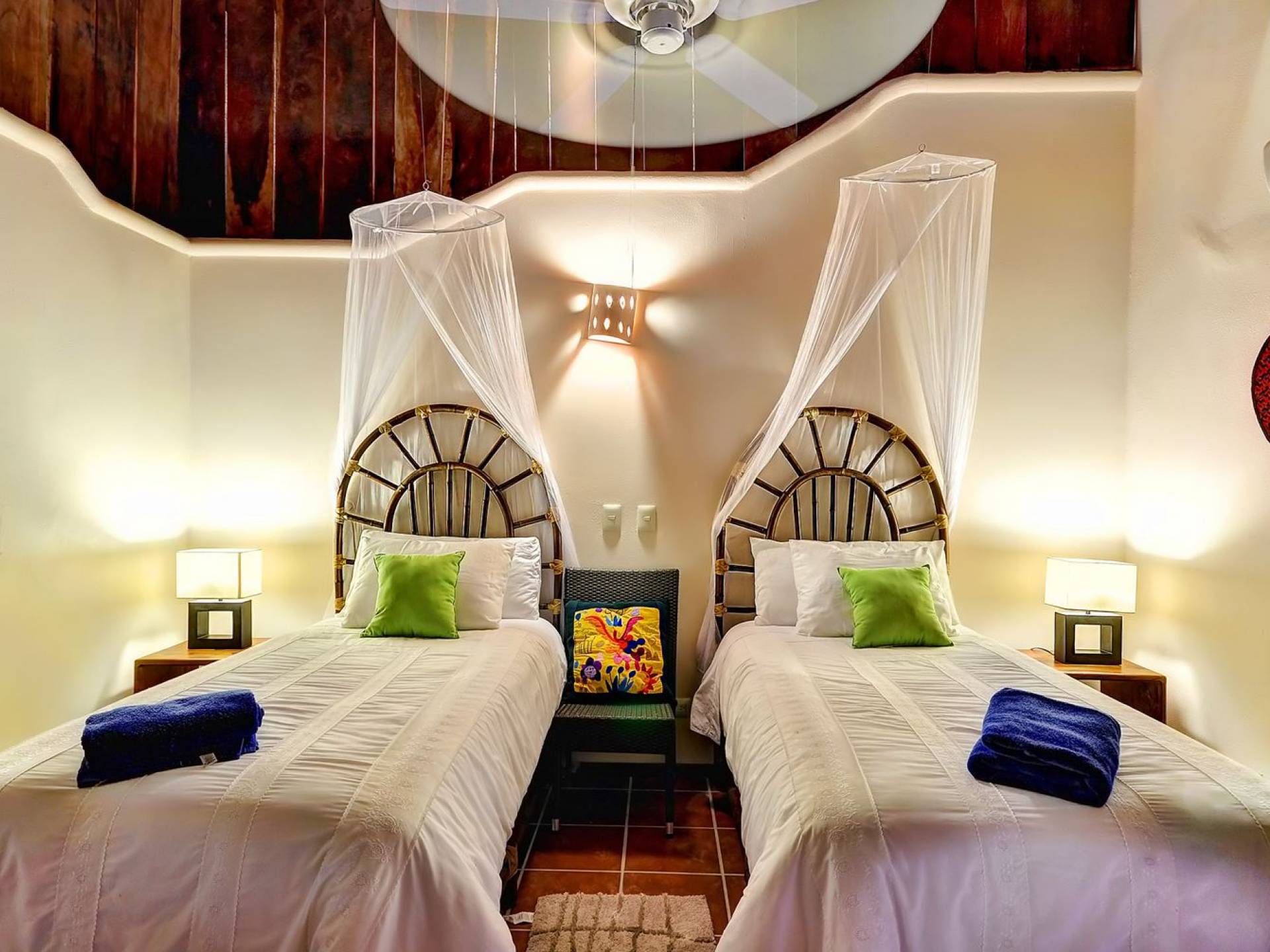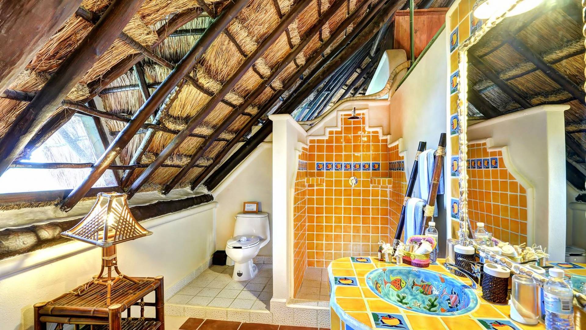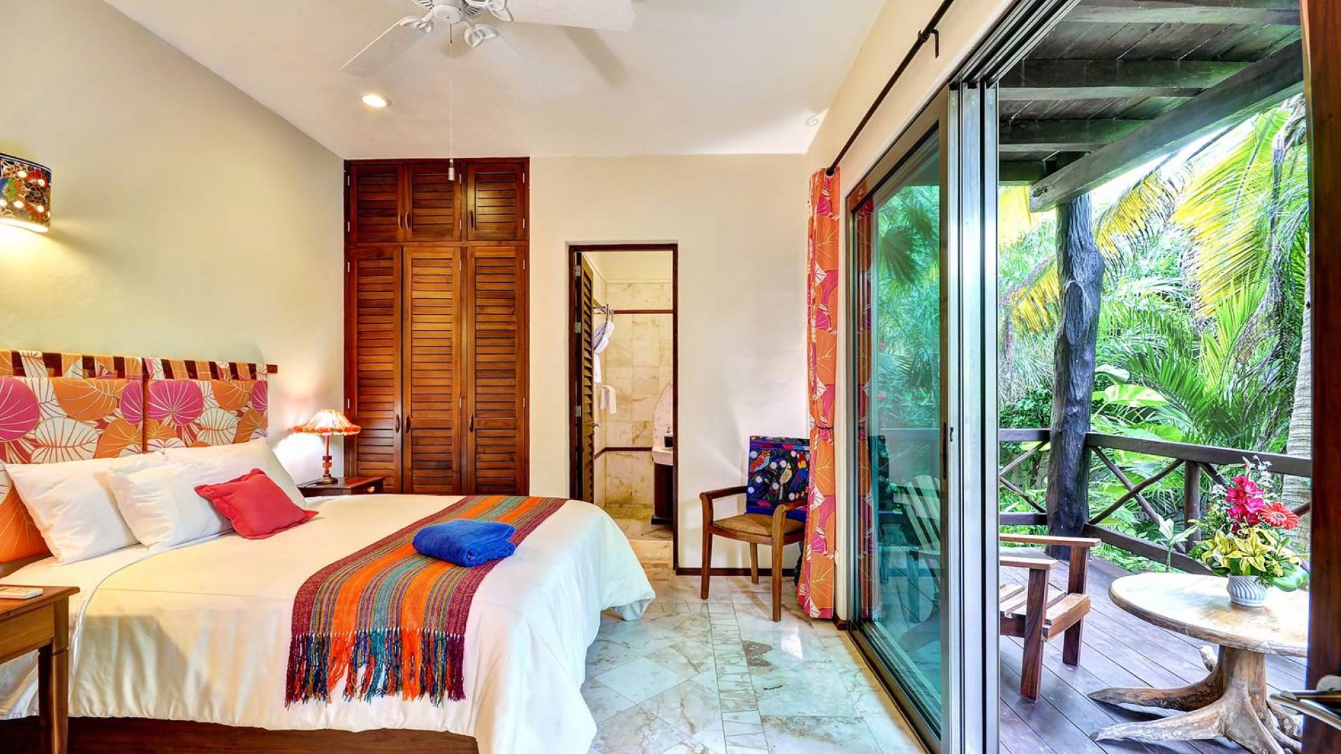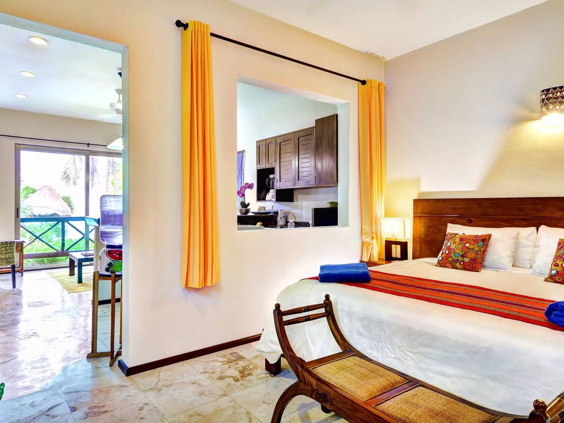 Mistral features 2 large bedrooms with A/C and private bathrooms to complete the package. One bedroom features a king-size bed facing the sea and the second bedroom features a queen-size bed with a private terrace facing the tropical garden. These 2 separate accommodations are for 2–5 people; enjoy the sea breeze as you relax in comfortable outdoor loungers. On the top floor, under the palapa, a Caribbean atmosphere is assured. You will discover a large king-size bedroom with an ensuite bathroom. It also has a private terrace where you will enjoy the beautiful picture-frame view of the bay.