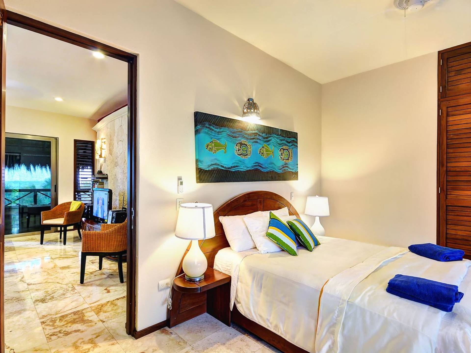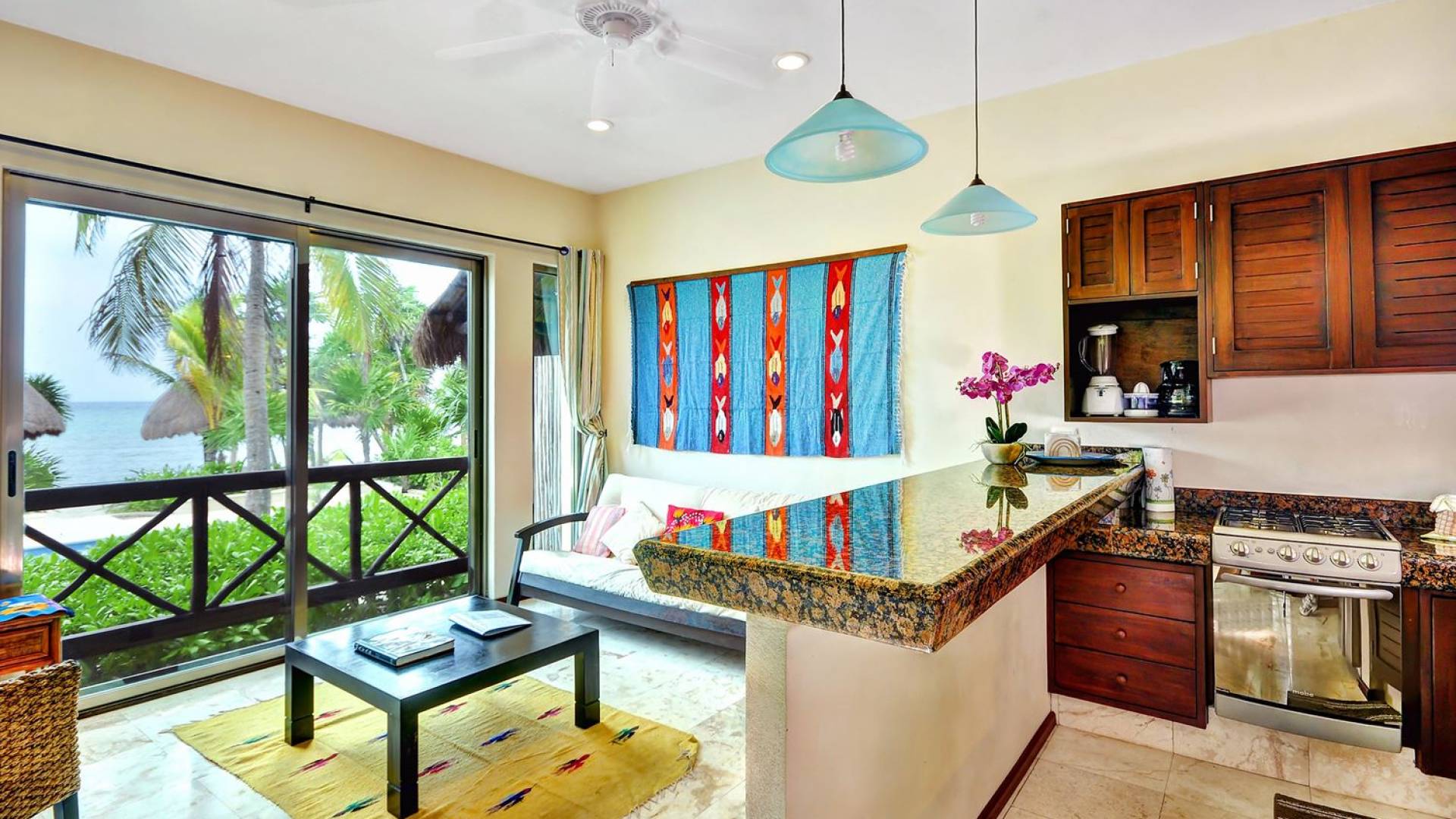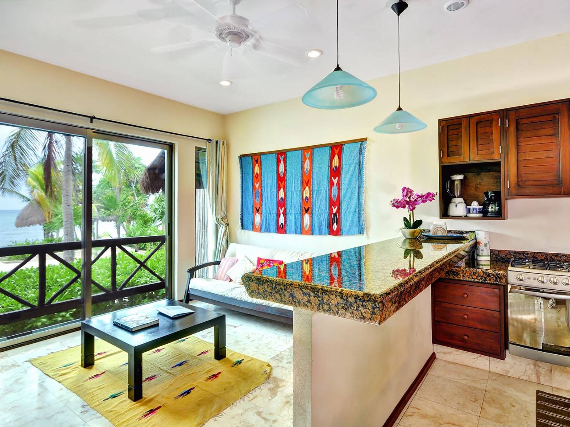 Bora: has a living room with an American-style kitchen fully furnished & 1 king-size bedroom, 1 futon, and a large covered deck overlooking the beach.