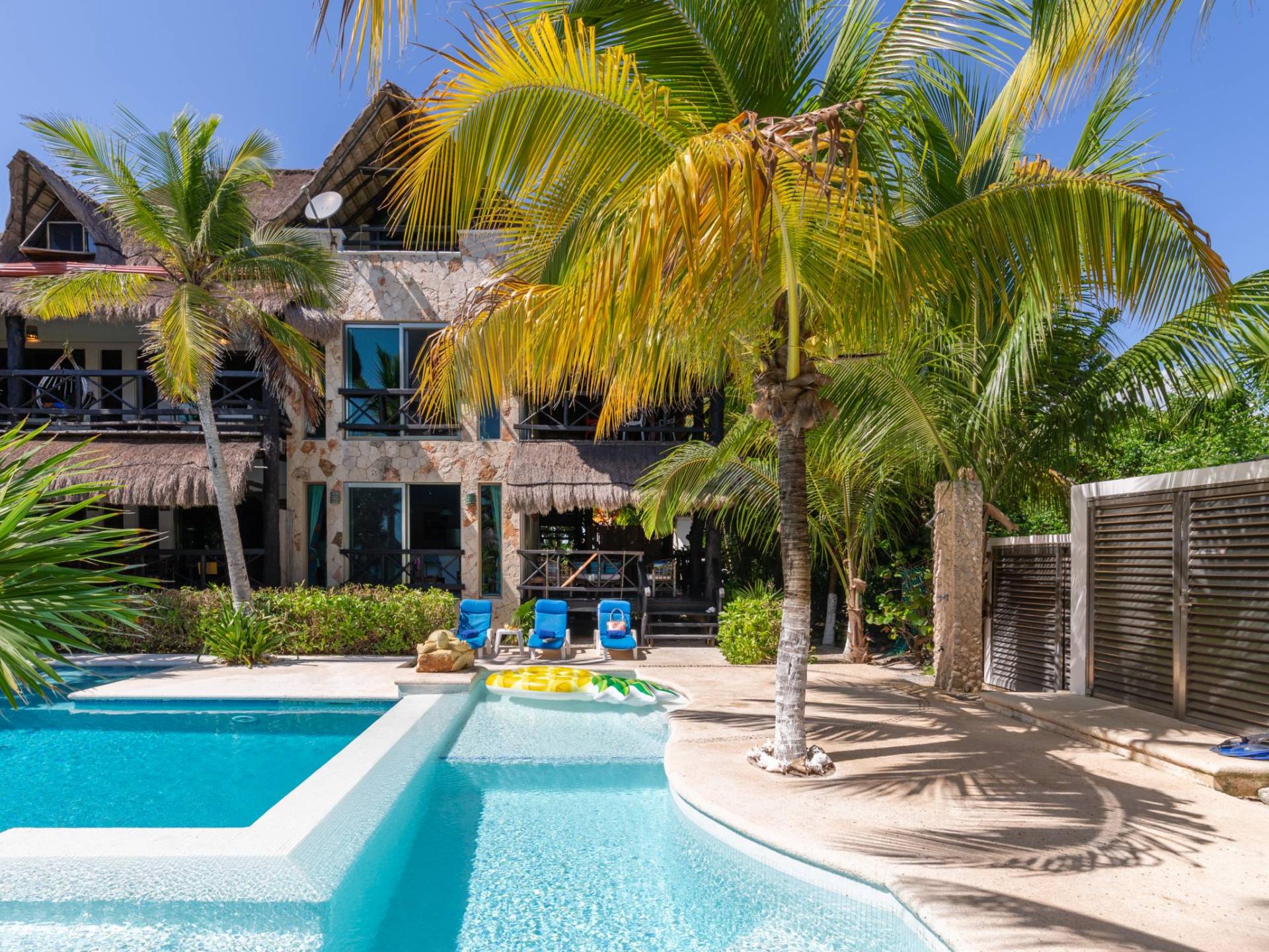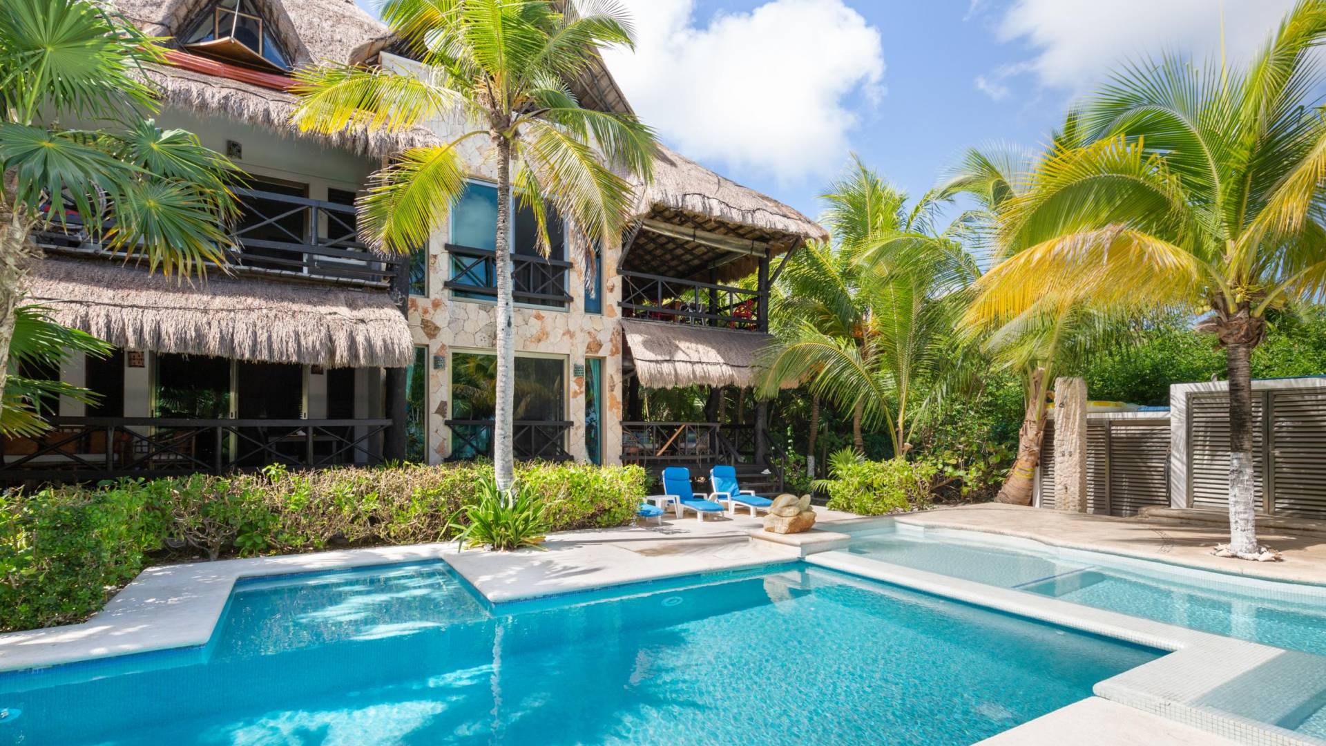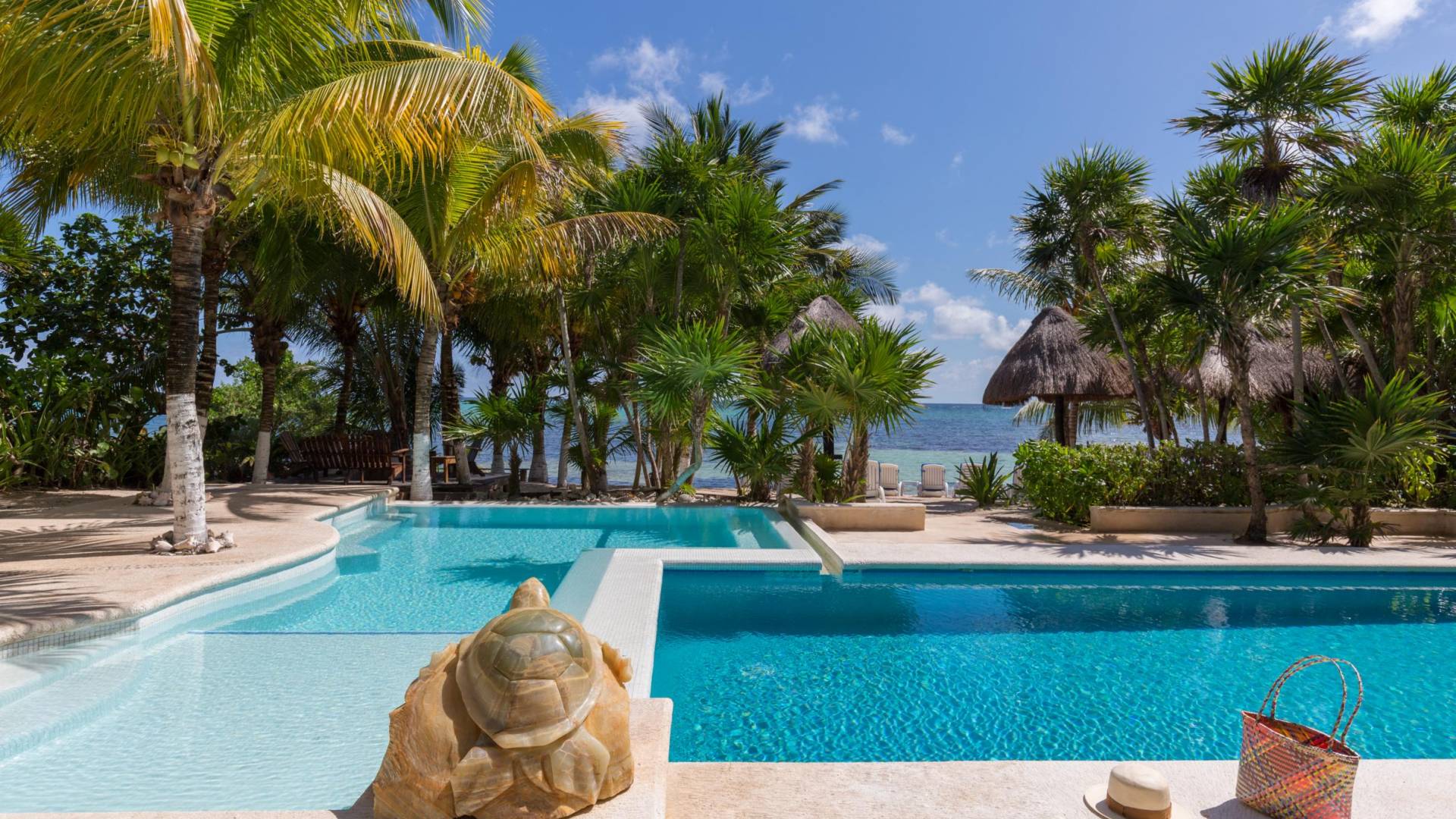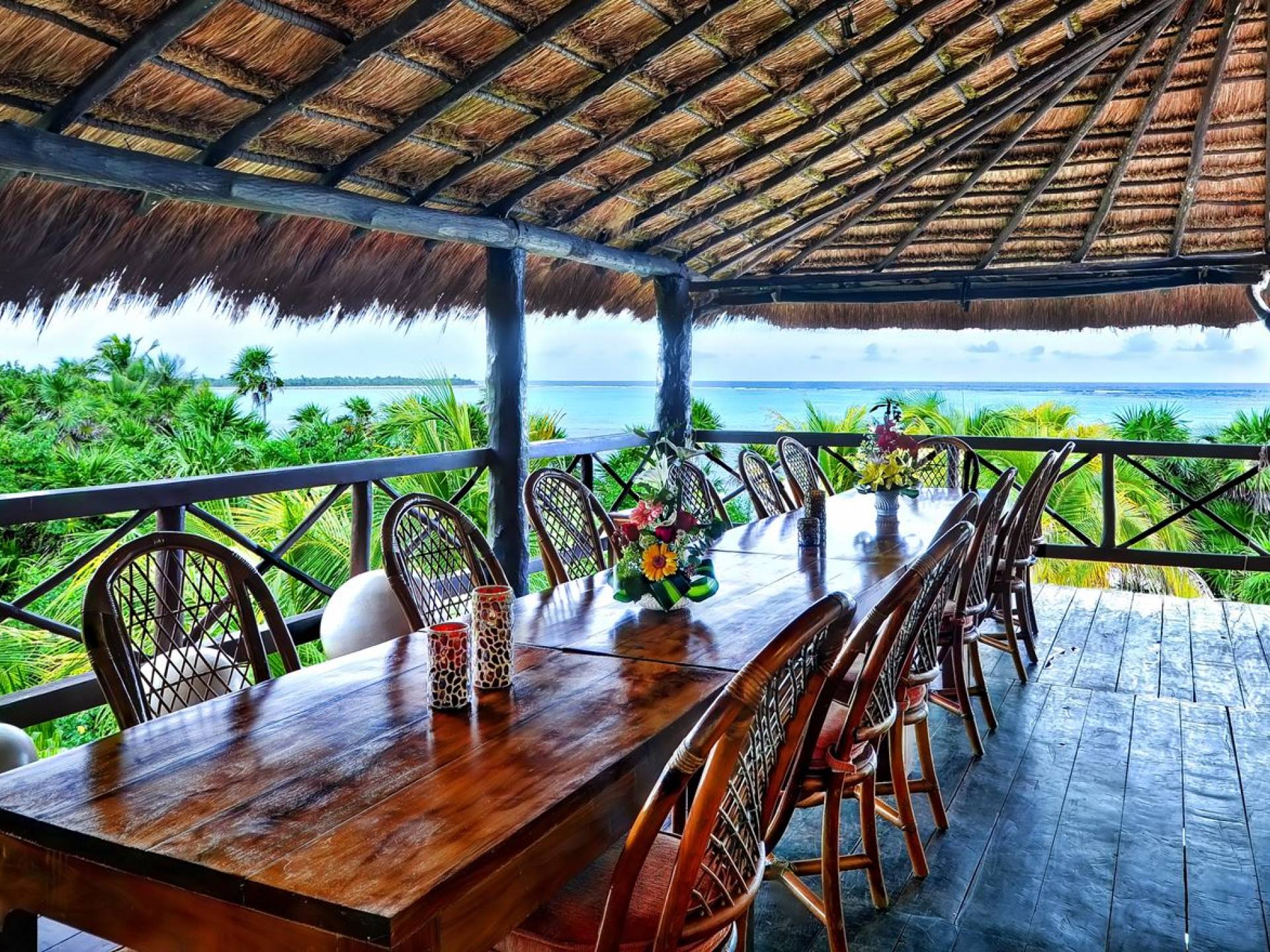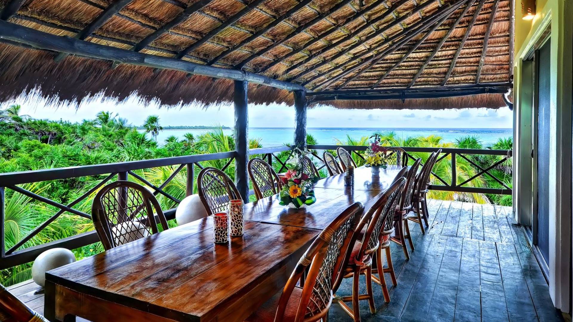 Sombras del Viento is nestled between the lush tropical jungle and Soliman Bay, a beautiful nature reserve. This tropical haven will encourage you to relax while admiring the magnificent colors of the Caribbean Sea. Its blend of natural materials (exotic woods, palapas) with luxurious finishes (marble, granite), graced with the presence of the sea and breathtaking ocean views make Sombras del Viento one of the nicest private villas in Soliman Bay.