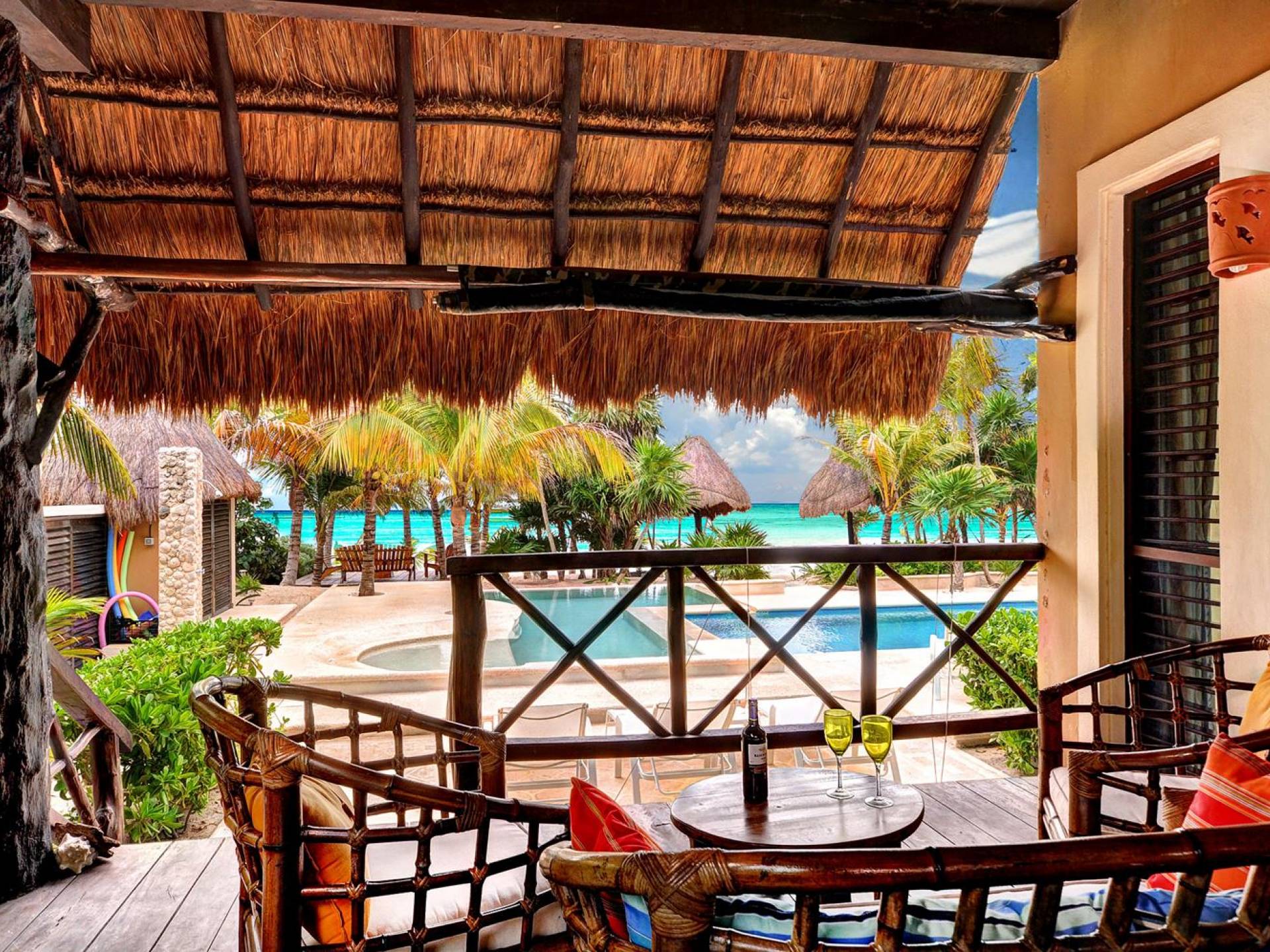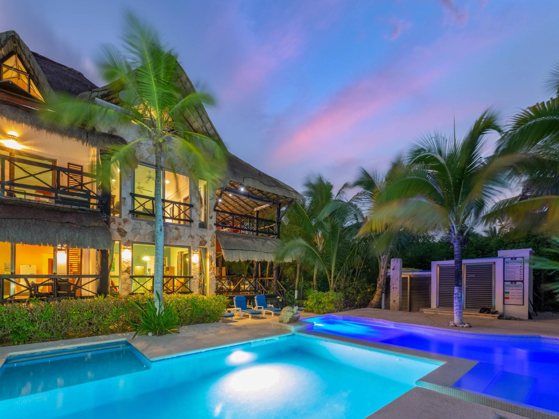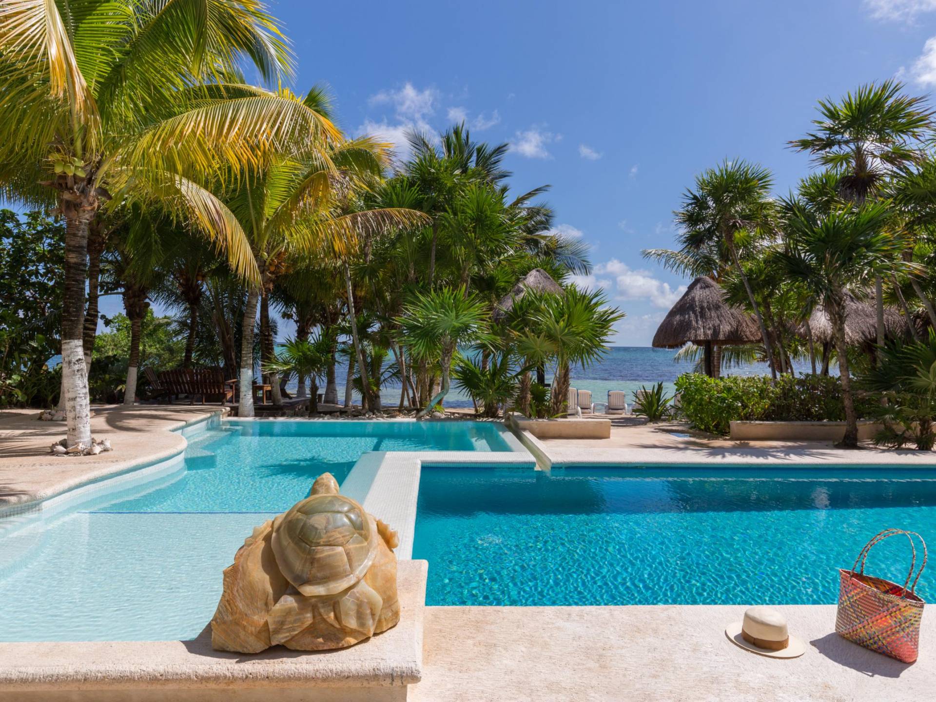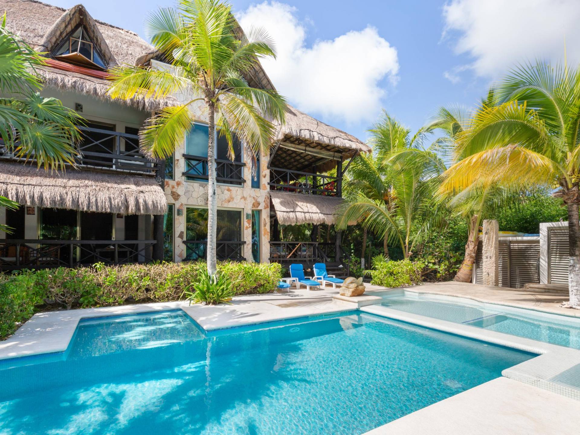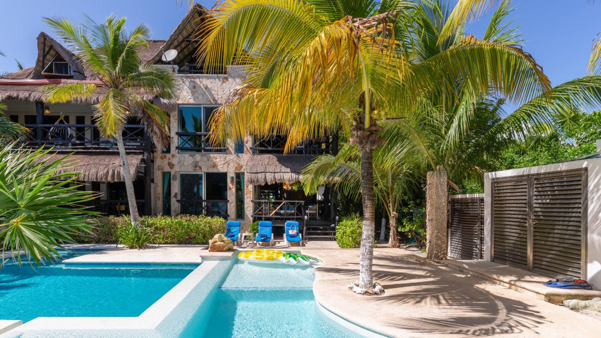 Sombras del Viento is nestled between the lush tropical jungle and Soliman Bay, a beautiful nature reserve. This tropical haven will encourage you to relax while admiring the magnificent colors of the Caribbean Sea. Its blend of natural materials (exotic woods, palapas) with luxurious finishes (marble, granite), graced with the presence of the sea and breathtaking ocean views make Sombras del Viento one of the nicest private villas in Soliman Bay.