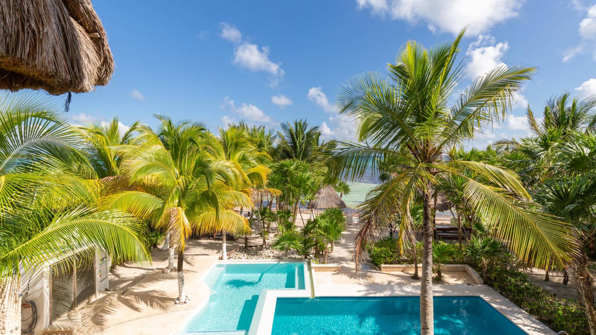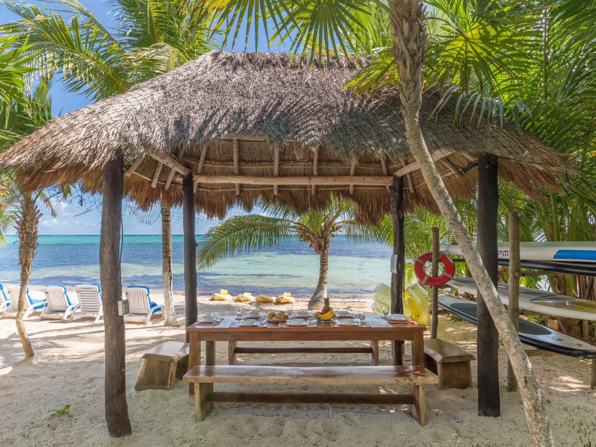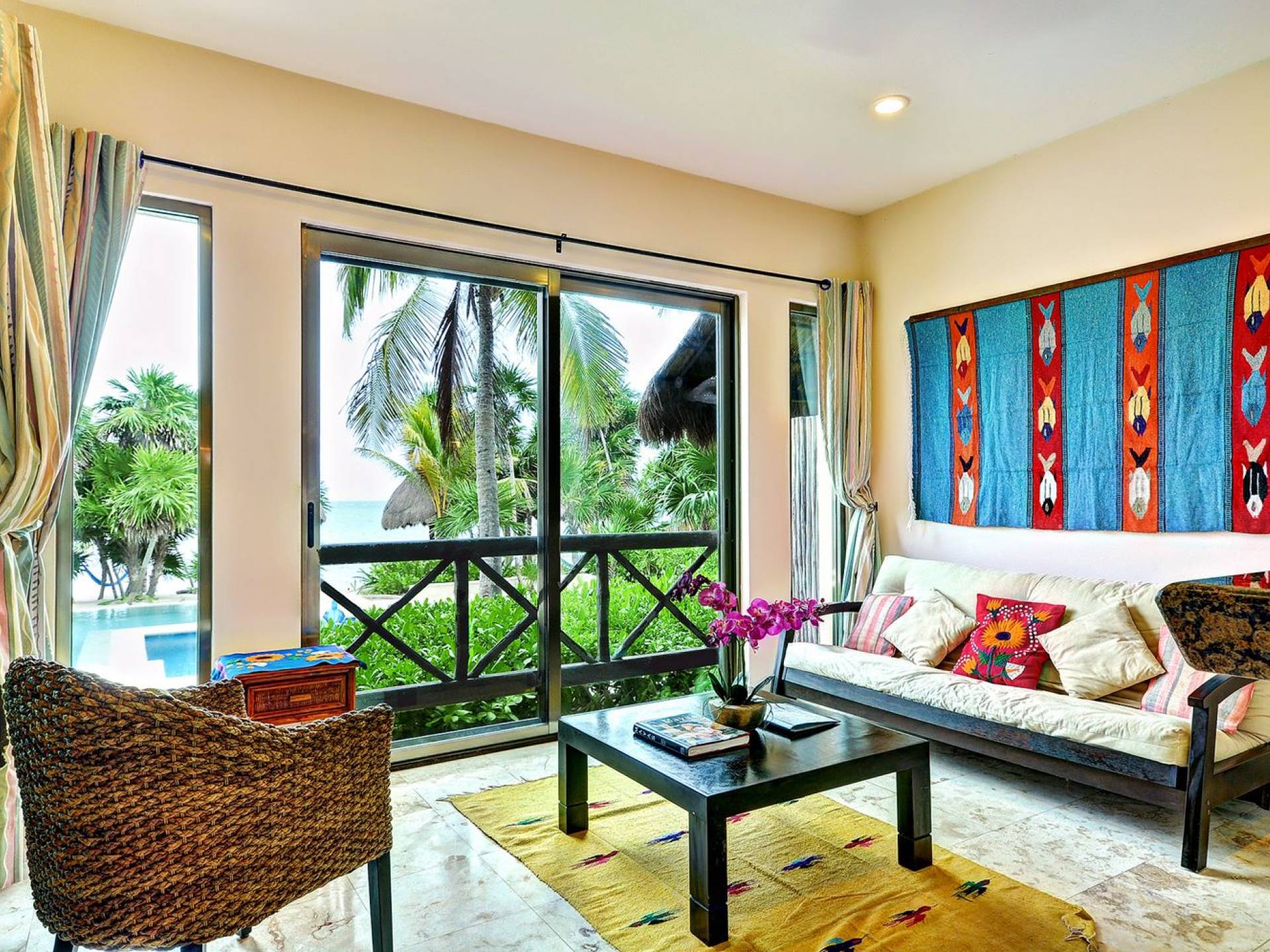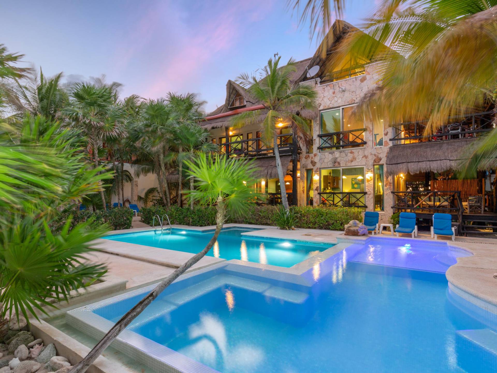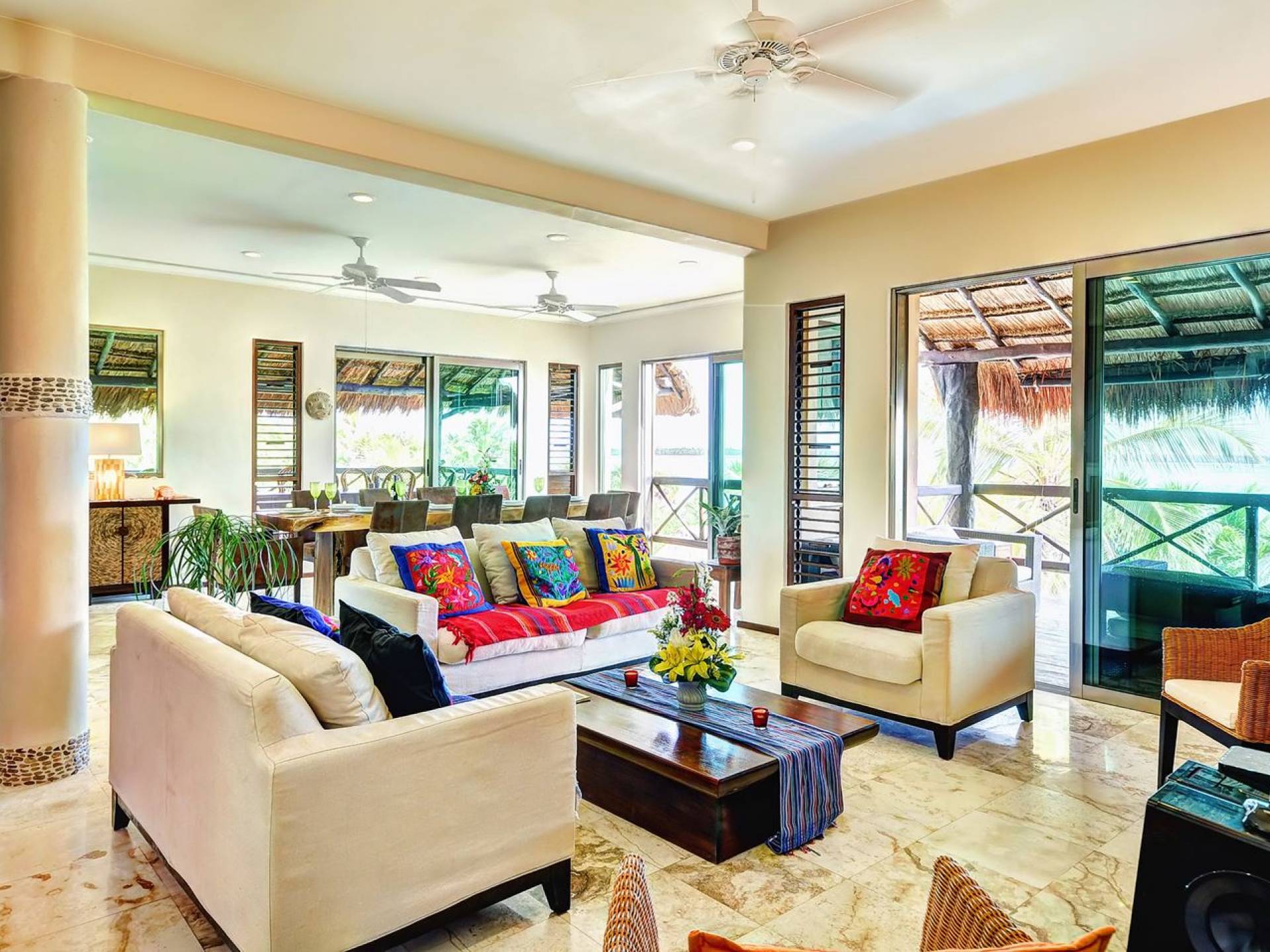 Sombras del Viento is nestled between the lush tropical jungle and Soliman Bay, a beautiful nature reserve. This tropical haven will encourage you to relax while admiring the magnificent colors of the Caribbean Sea. Its blend of natural materials (exotic woods, palapas) with luxurious finishes (marble, granite), graced with the presence of the sea and breathtaking ocean views make Sombras del Viento one of the nicest private villas in Soliman Bay.