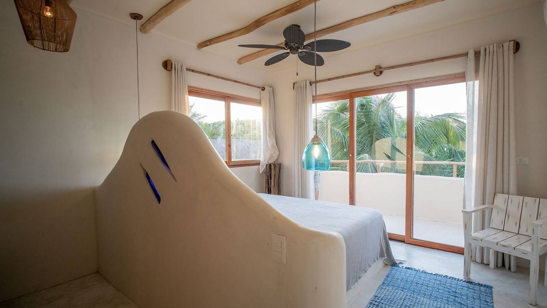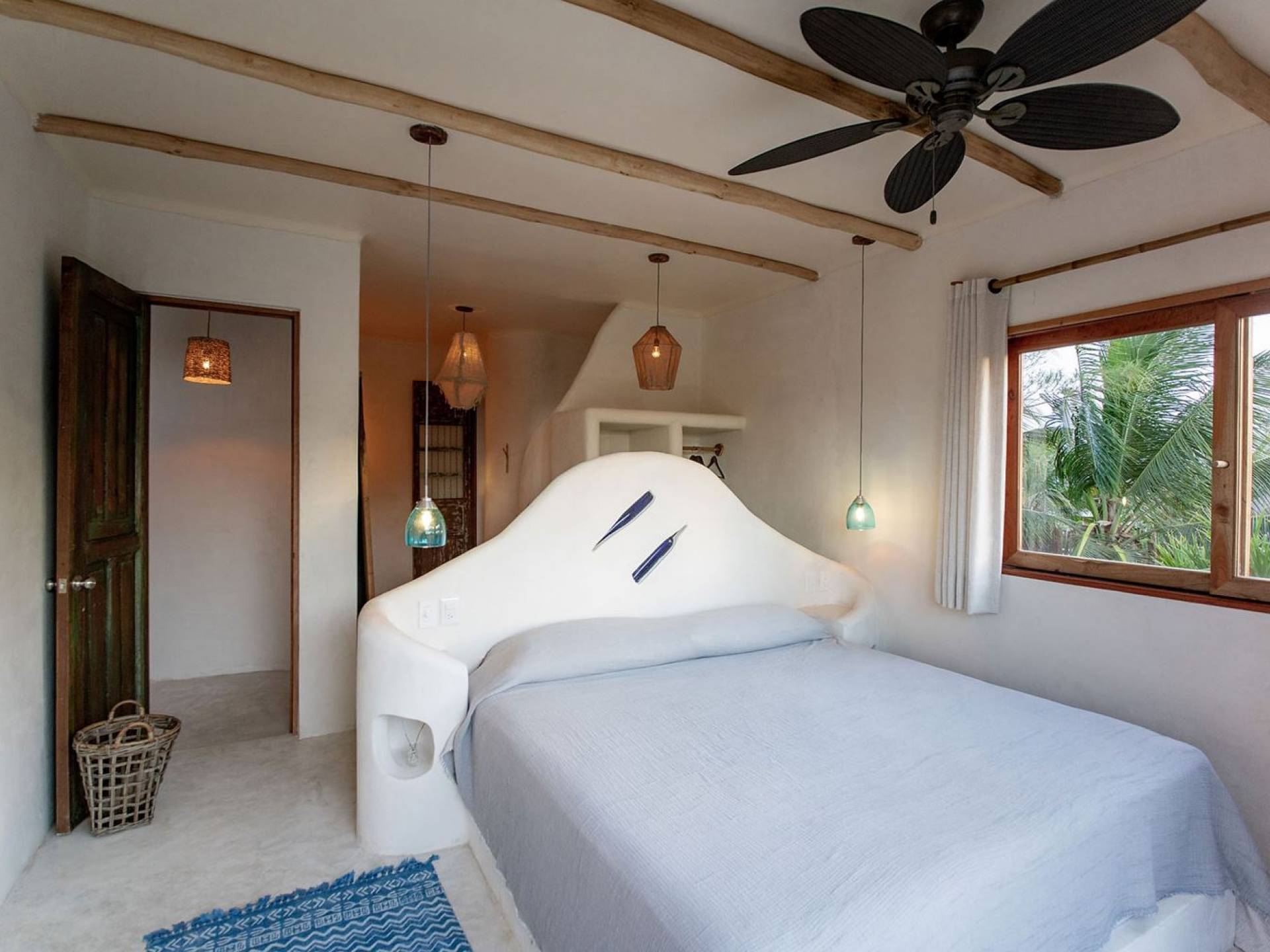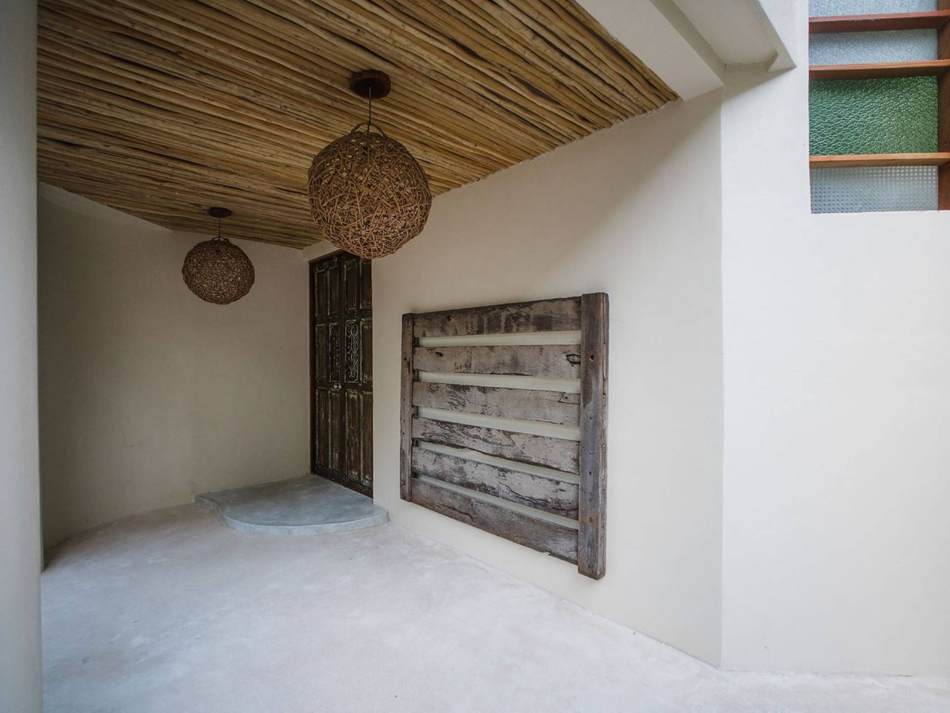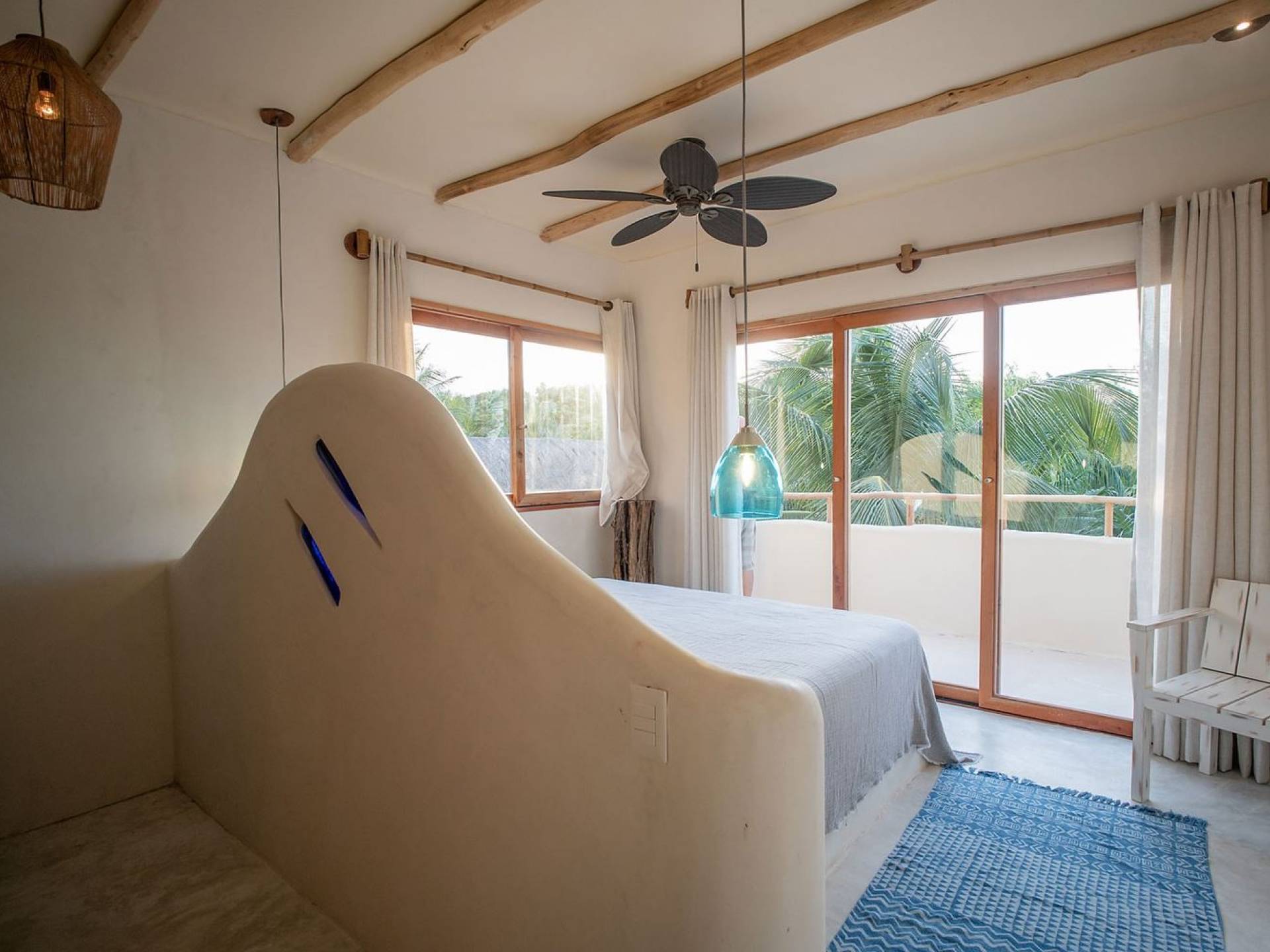 Carefully designed to connect with the breathtaking beauty of Tulum from each room. Natural elements and artistic touches throughout the house reflect the lovely laid-back vibe and feel of Tulum. Prepare meals in the kitchen and enjoy the sounds of the sea. The layout provides a home suitable for two couples or a family. The master bedroom has a king-size bed and ensuite bathroom. The second bedroom has a queen bed and two singles with an ensuite bathroom. Sleeps 4-6. Both bedrooms overlook the pool. This home is accessed by a private entrance via an exterior staircase.