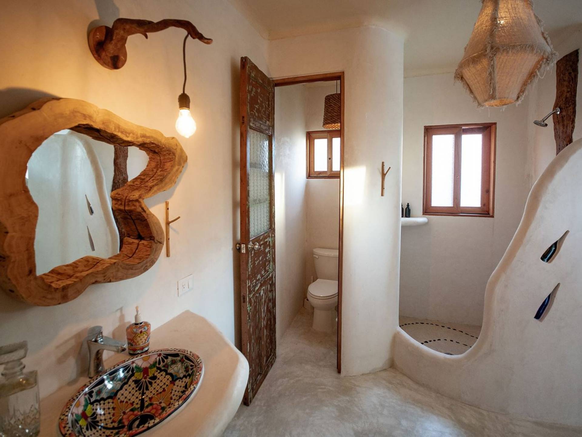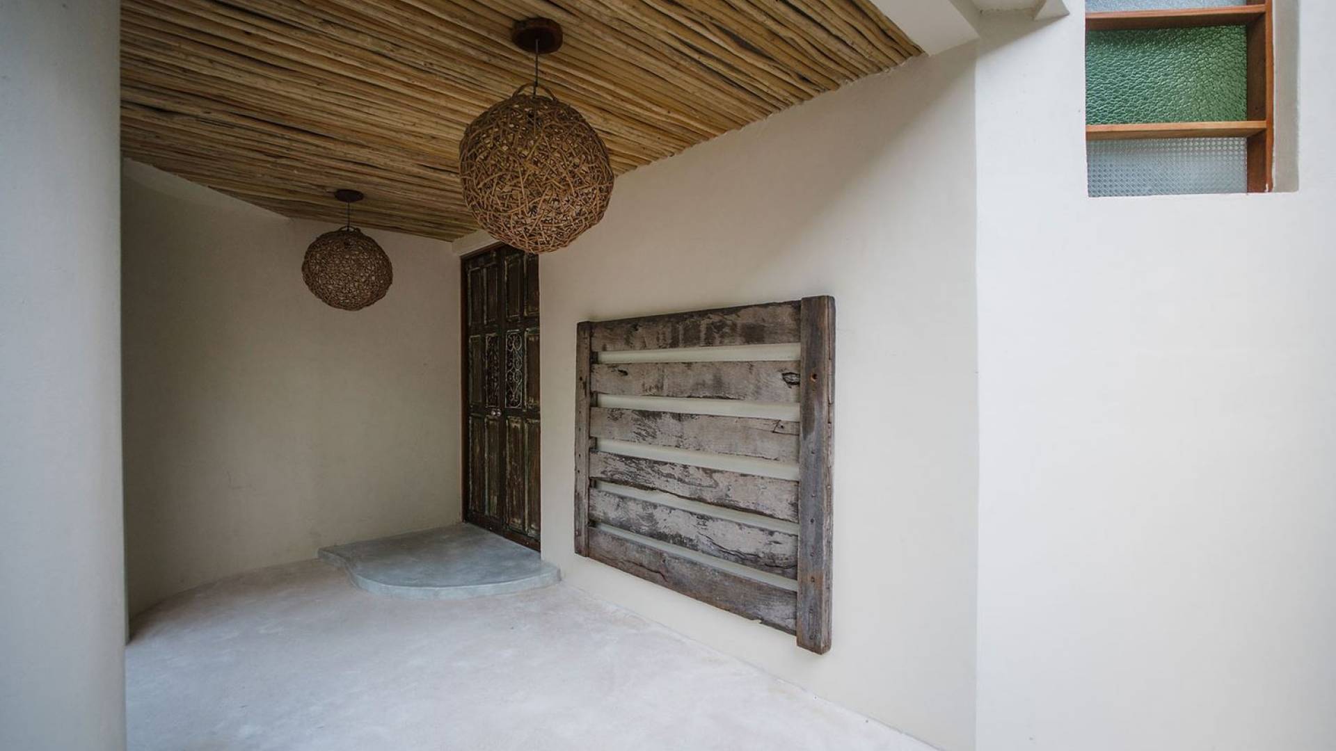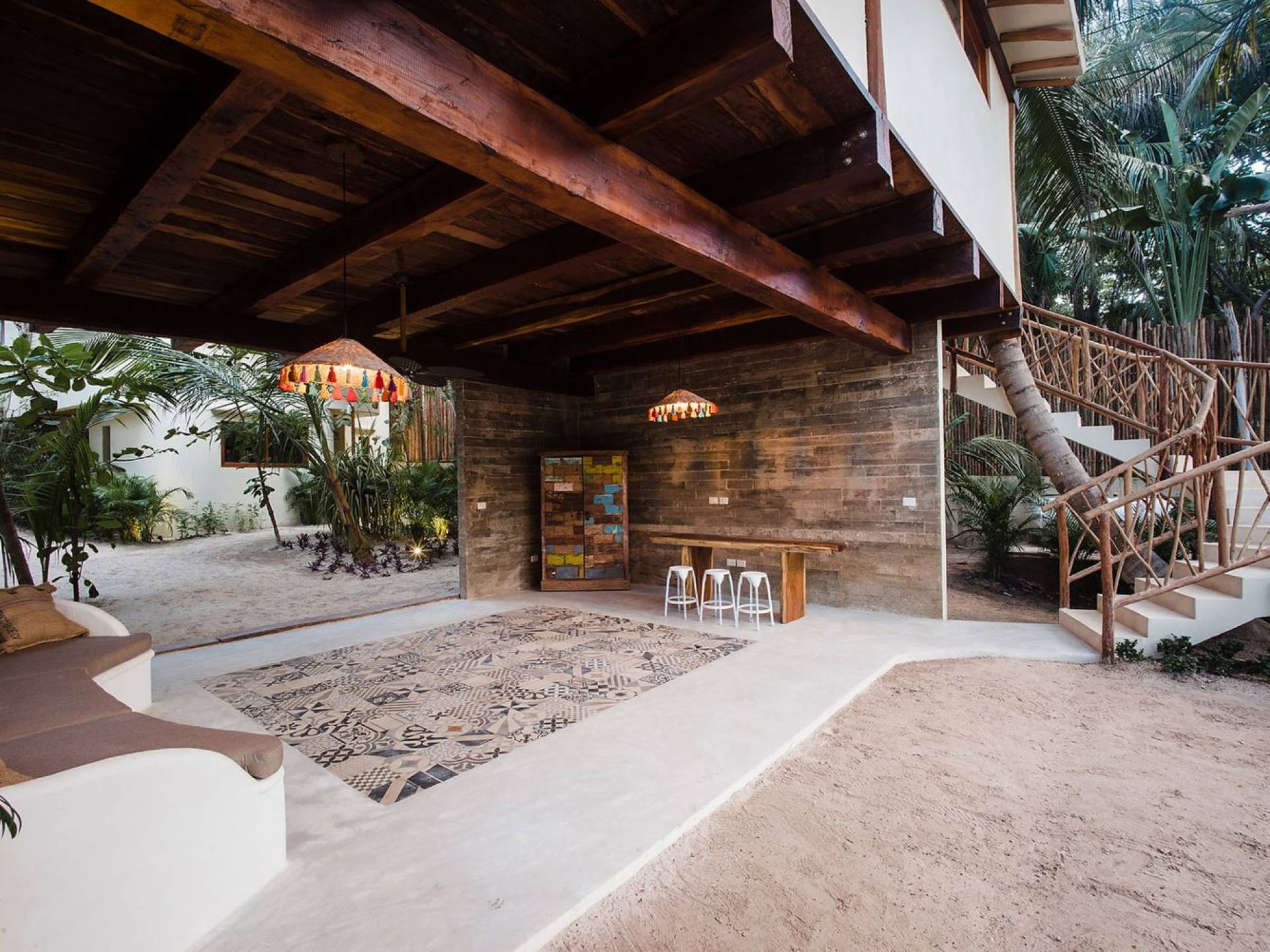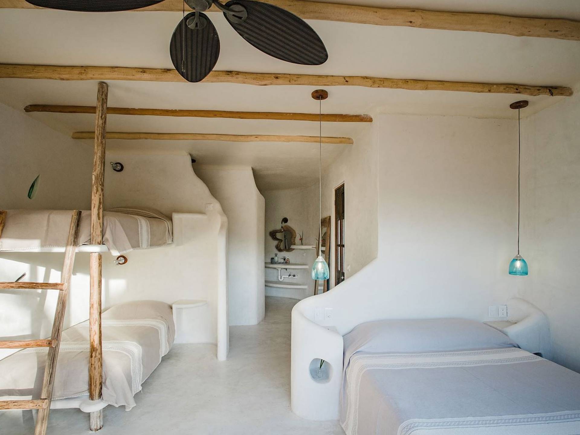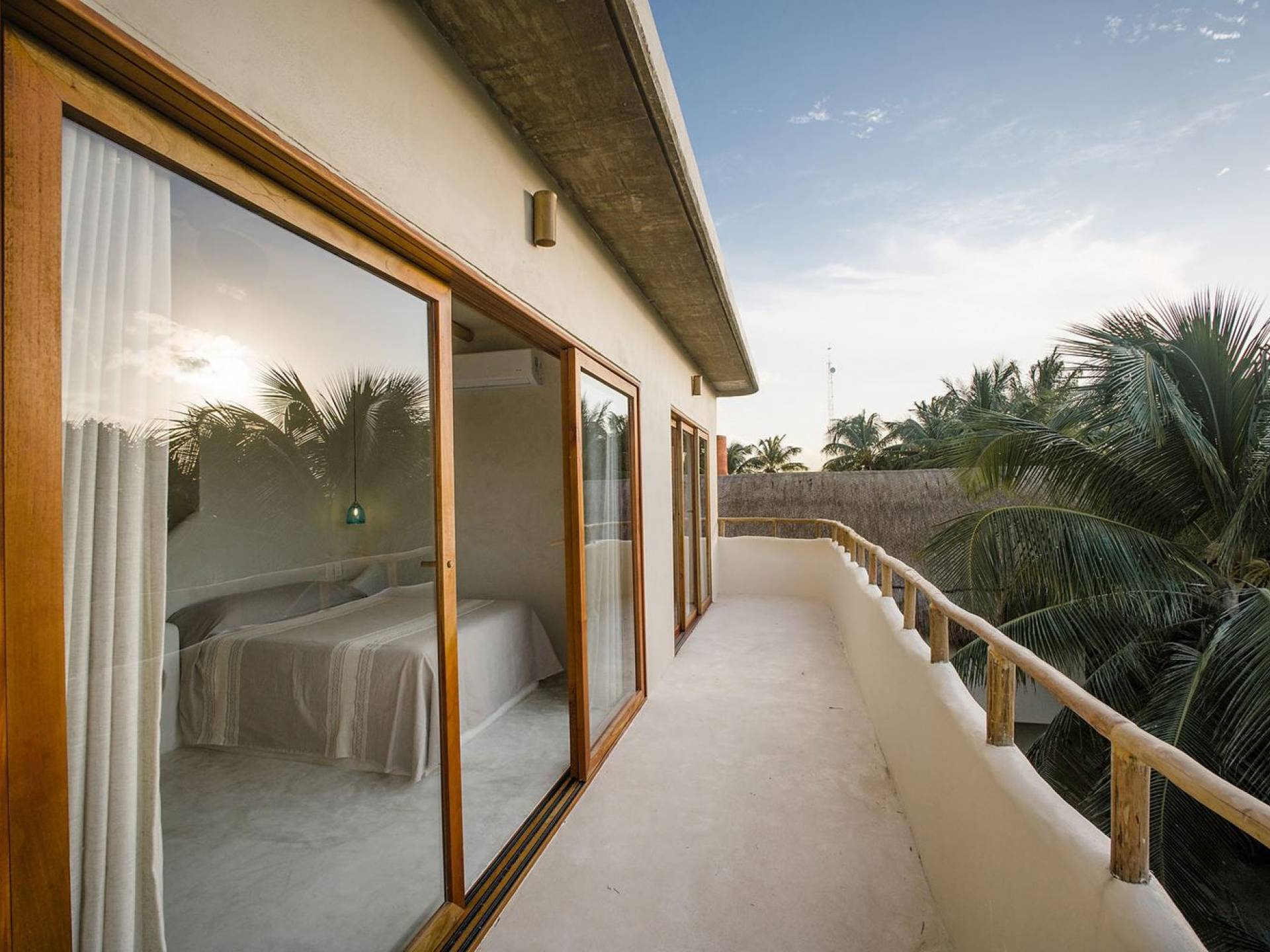 Carefully designed to connect with the breathtaking beauty of Tulum from each room. Natural elements and artistic touches throughout the house reflect the lovely laid-back vibe and feel of Tulum. Prepare meals in the kitchen and enjoy the sounds of the sea. The layout provides a home suitable for two couples or a family. The master bedroom has a king-size bed and ensuite bathroom. The second bedroom has a queen bed and two singles with an ensuite bathroom. Sleeps 4-6. Both bedrooms overlook the pool. This home is accessed by a private entrance via an exterior staircase.