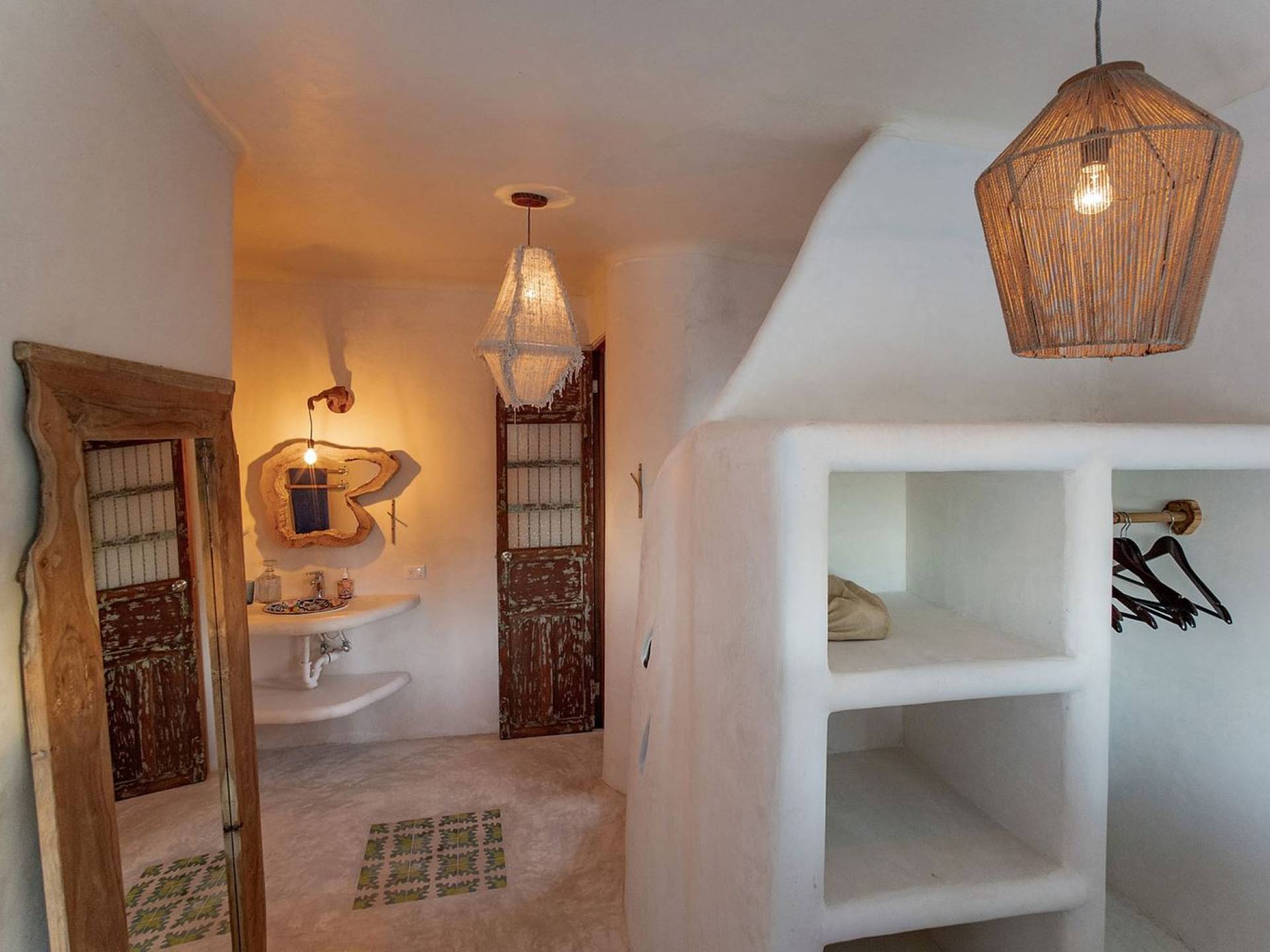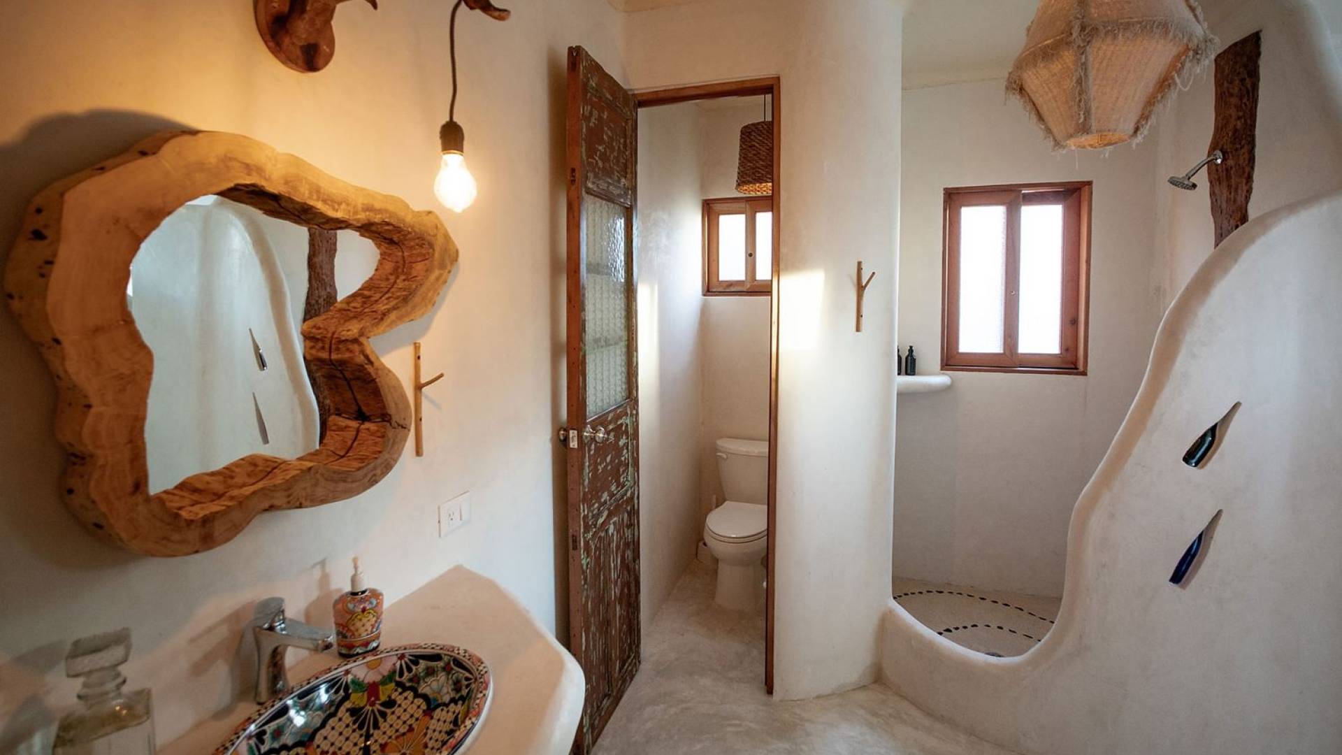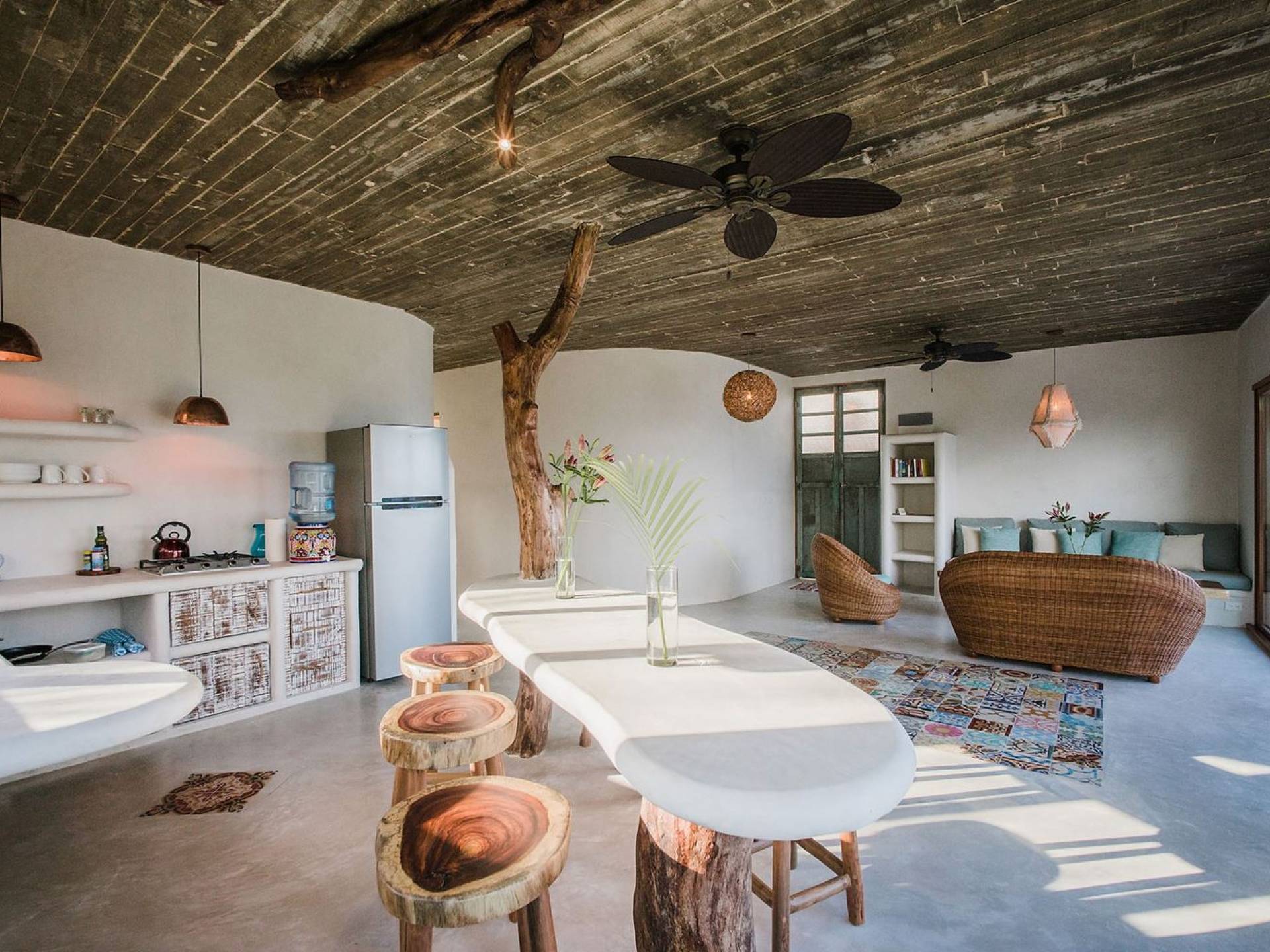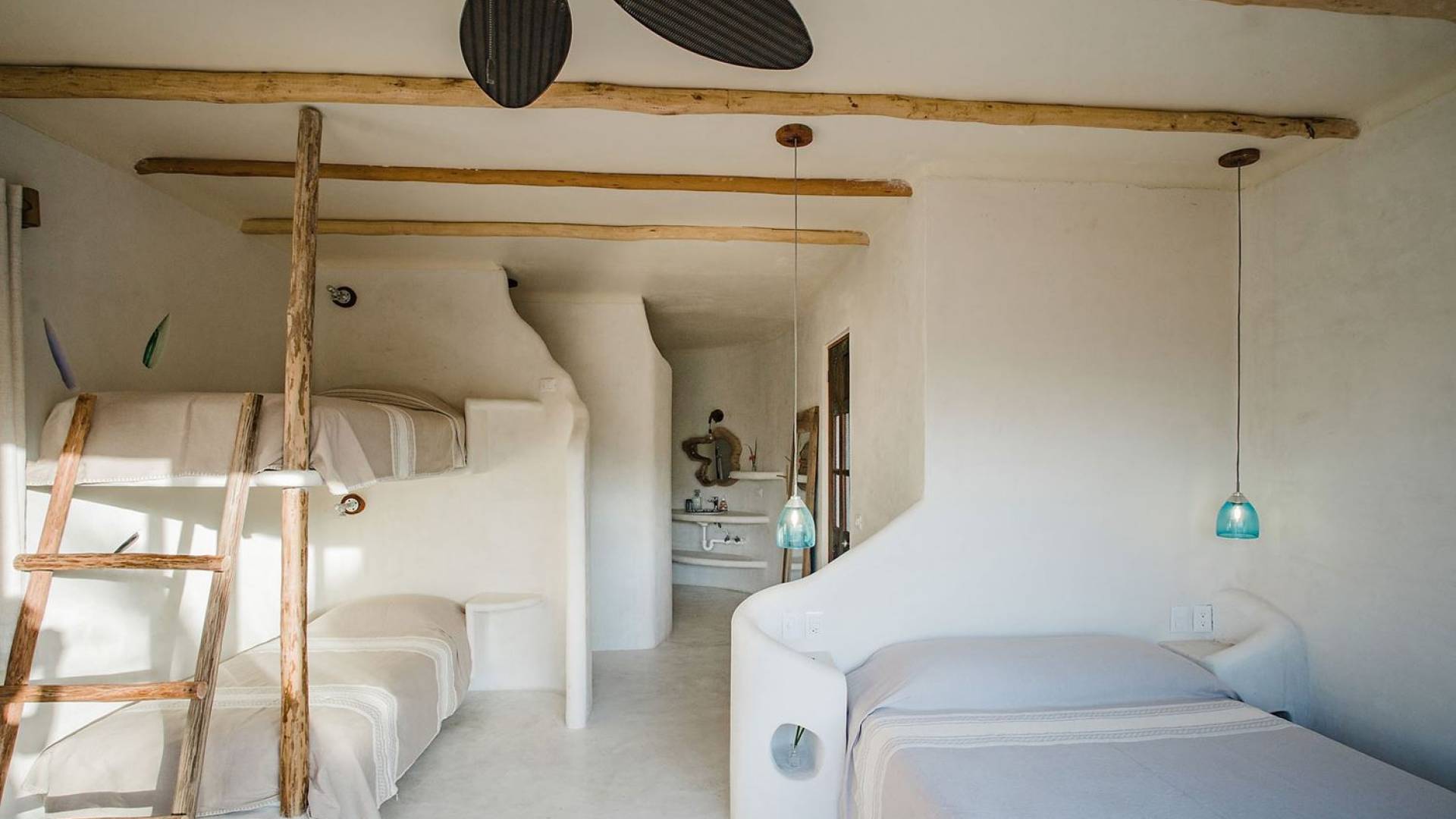 Carefully designed to connect with the breathtaking beauty of Tulum from each room. Natural elements and artistic touches throughout the house reflect the lovely laid-back vibe and feel of Tulum. Prepare meals in the kitchen and enjoy the sounds of the sea. The layout provides a home suitable for two couples or a family. The master bedroom has a king-size bed and ensuite bathroom. The second bedroom has a queen bed and two singles with an ensuite bathroom. Sleeps 4-6. Both bedrooms overlook the pool. This home is accessed by a private entrance via an exterior staircase.