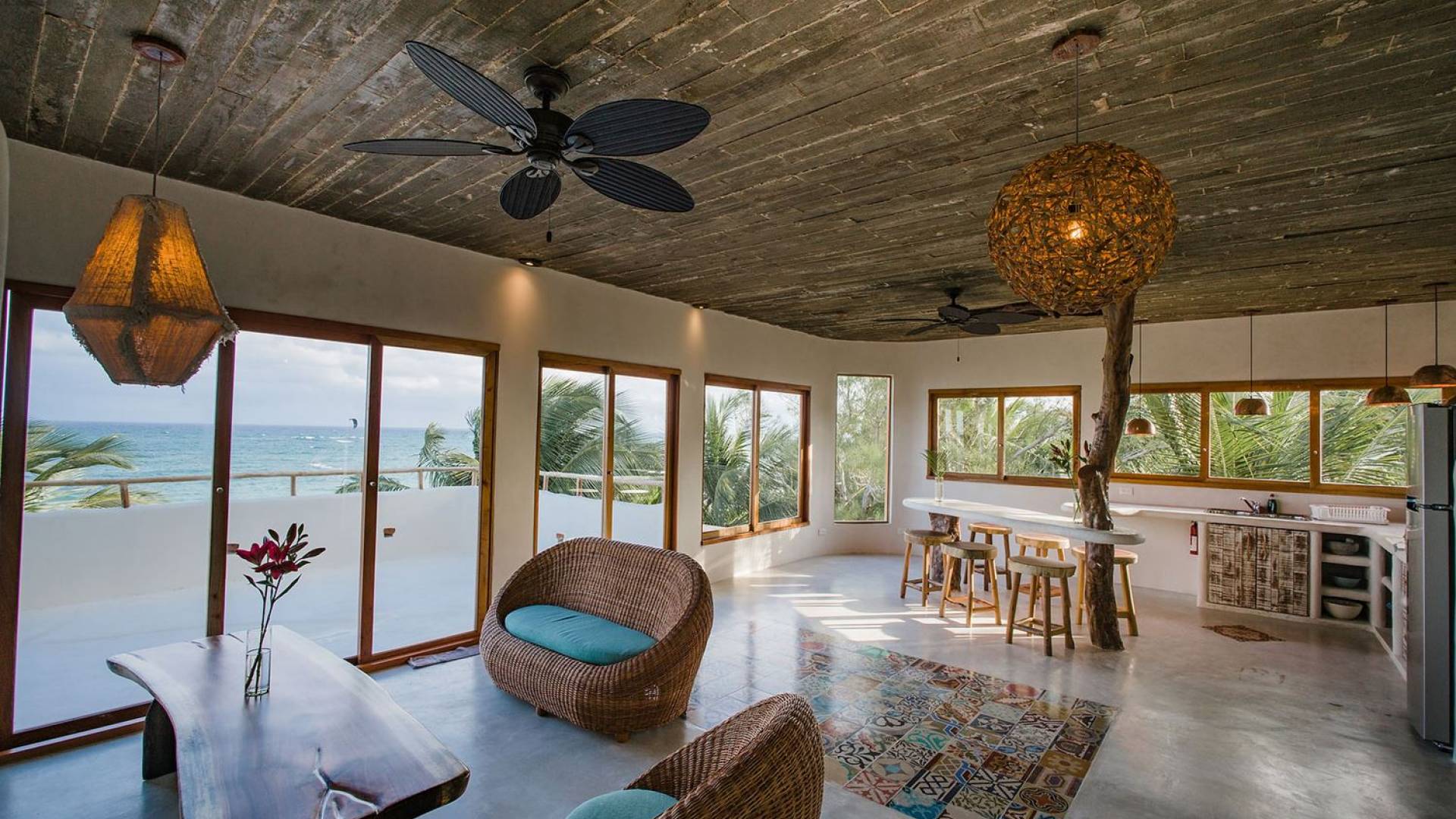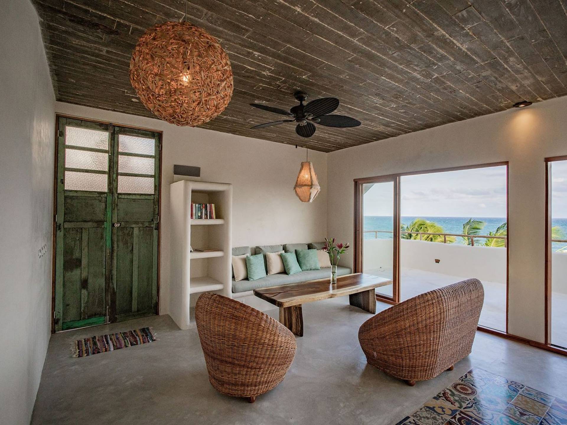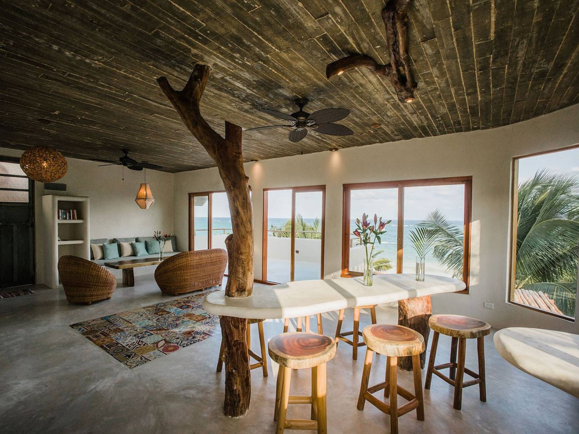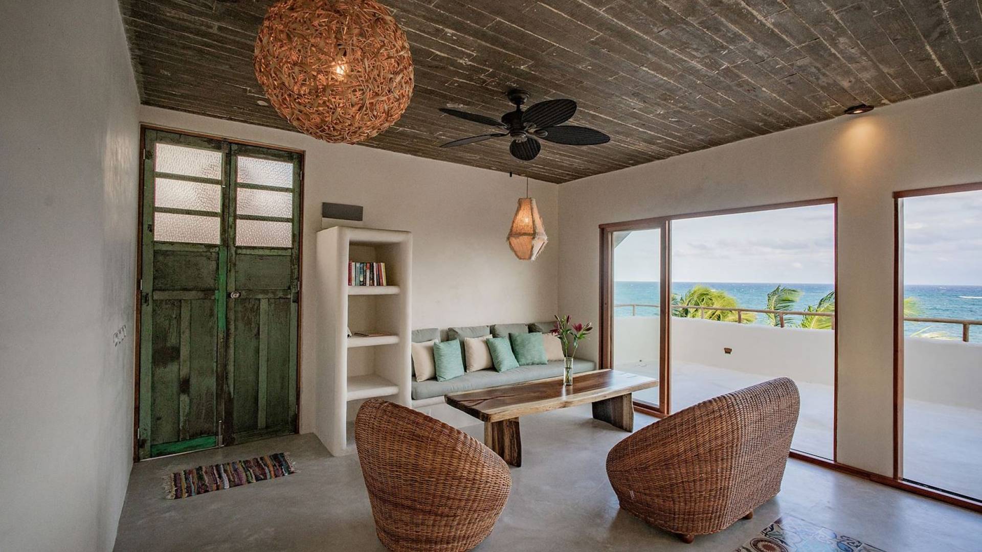Zorba PenthouseTulum is a luxury villa rental with 2 bedrooms. Enjoy stellar views of Tulum beach from this incredible penthouse perch! Bird’s eye view of the white sand and turquoise sea from this exclusive 2BR home. Let the sea breezes flow through the glass doors into your open living area or sit outside on the patio to enjoy the incredible vista.