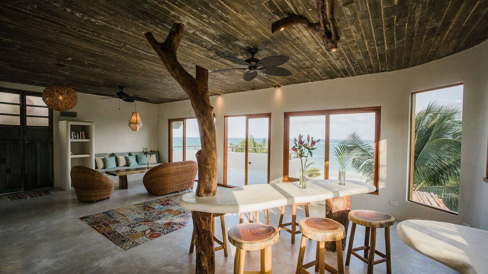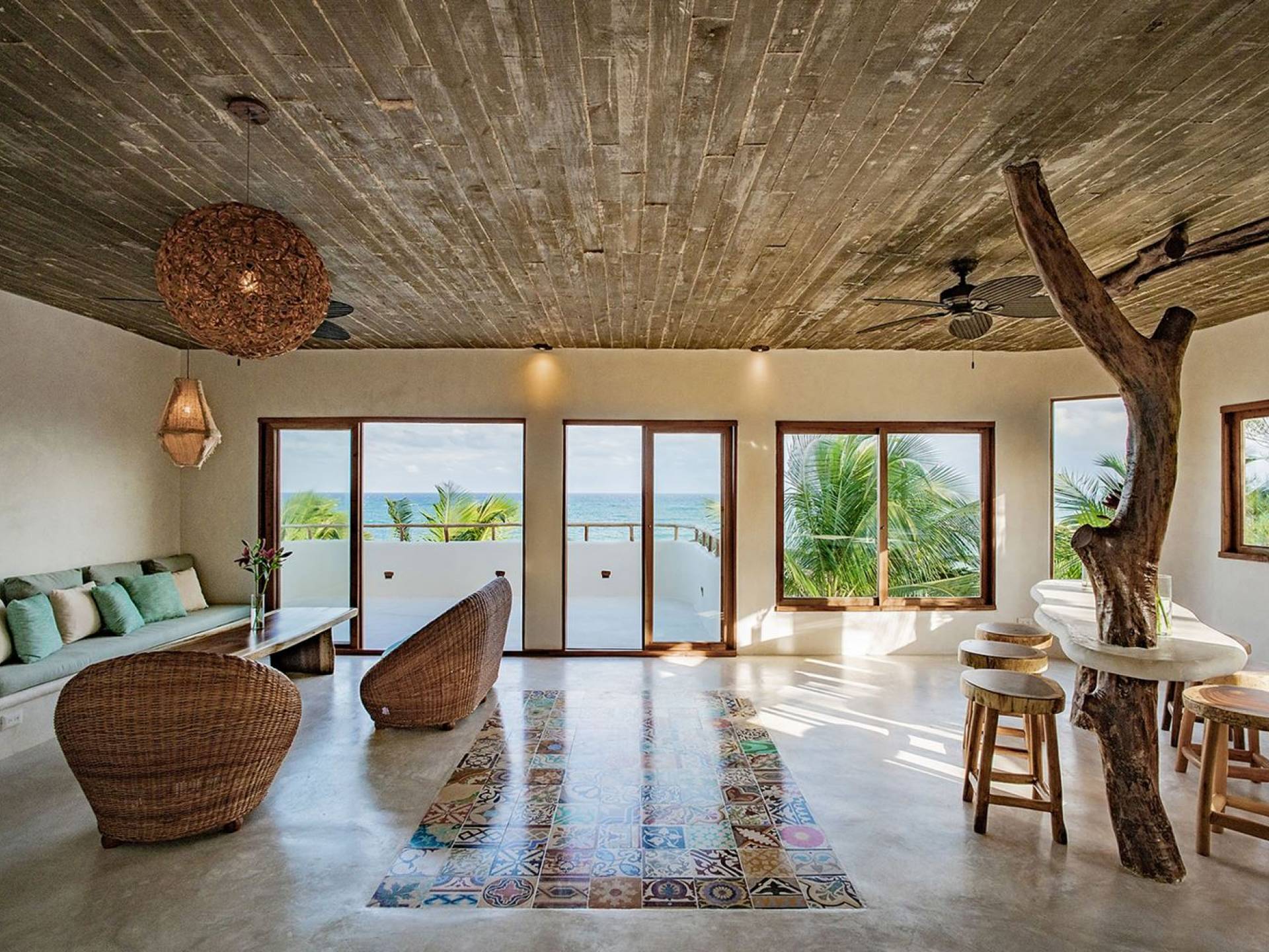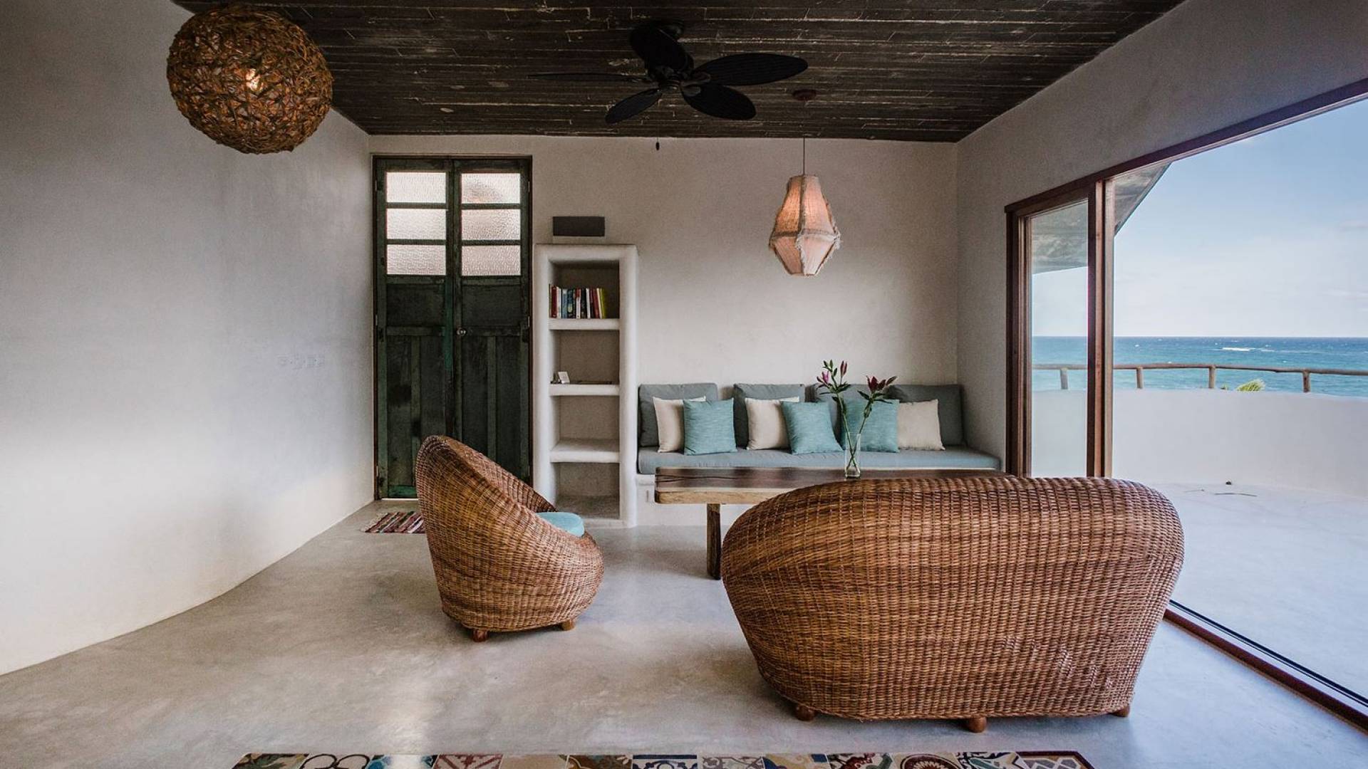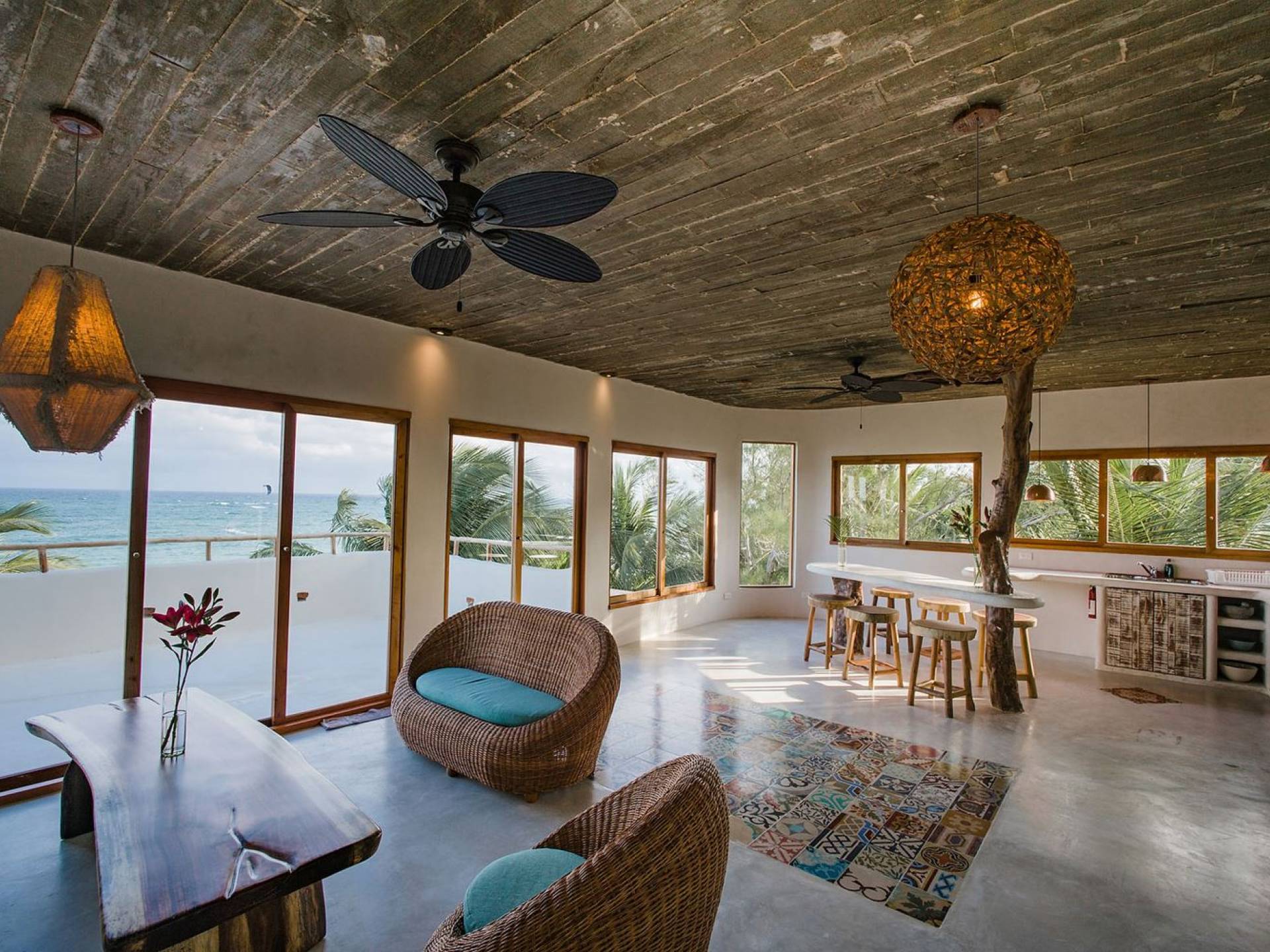 Zorba PenthouseTulum is a luxury villa rental with 2 bedrooms. Enjoy stellar views of Tulum beach from this incredible penthouse perch! Bird’s eye view of the white sand and turquoise sea from this exclusive 2BR home. Let the sea breezes flow through the glass doors into your open living area or sit outside on the patio to enjoy the incredible vista.
