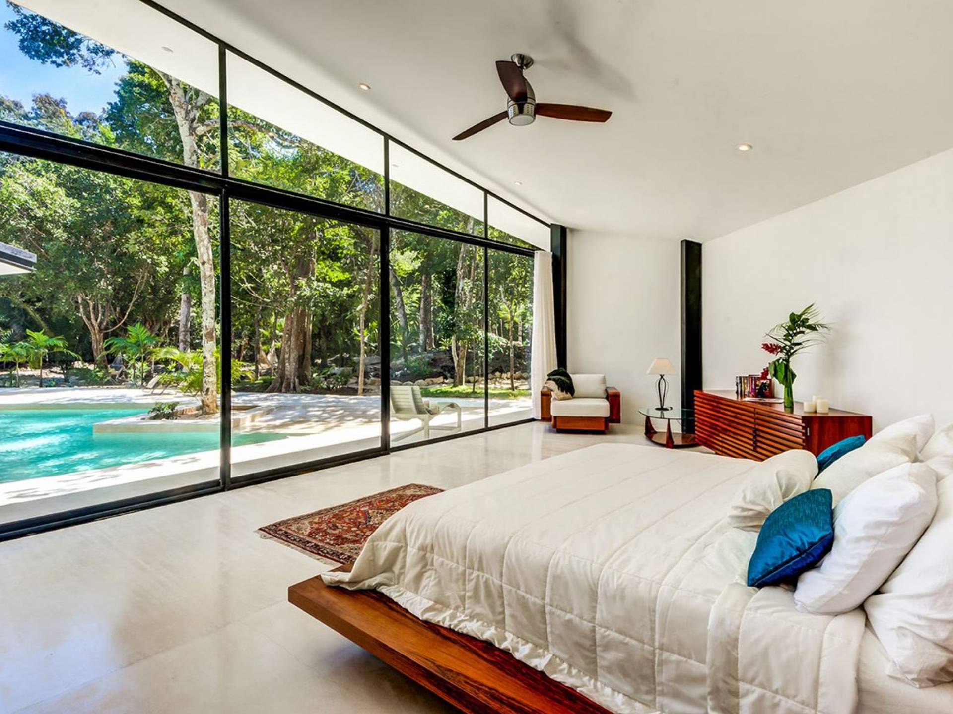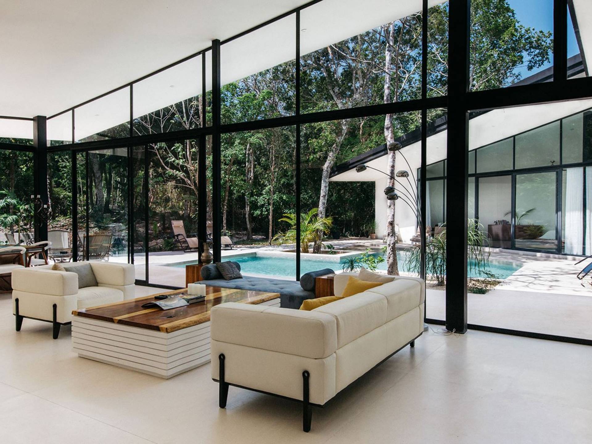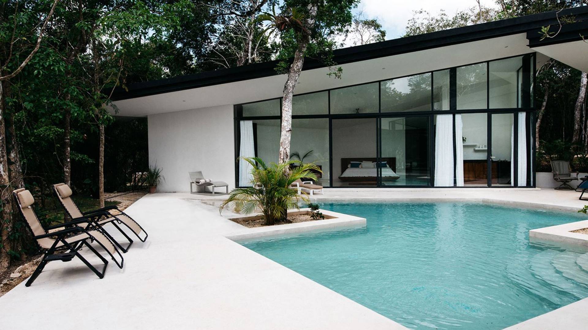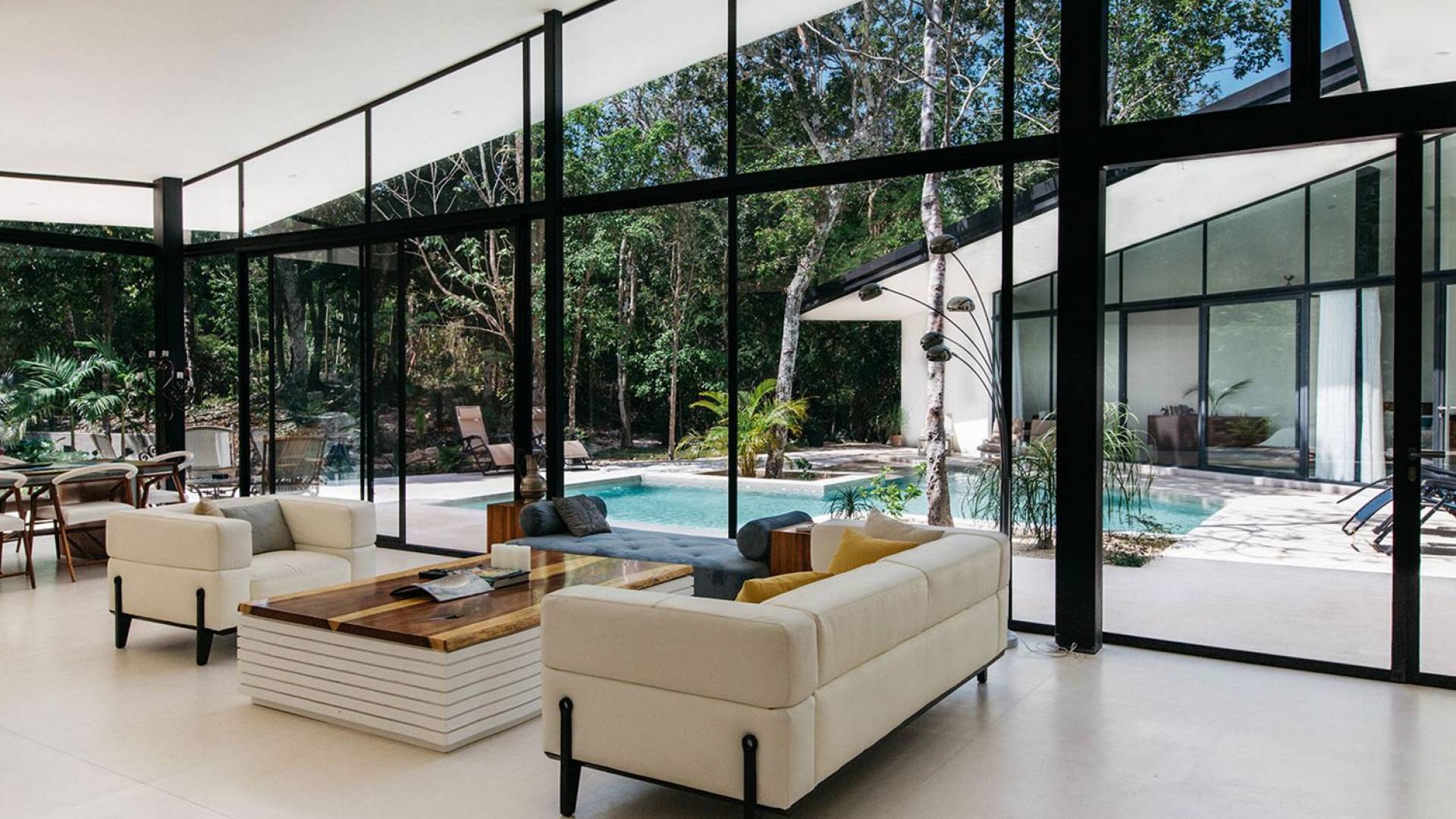 The villa nestles on top of the Yucatan peninsula’s typical cenote ground, which means there is fresh water on the lot, just a few steps from the house in an underground stalactite cave where the wild animals come to drink.