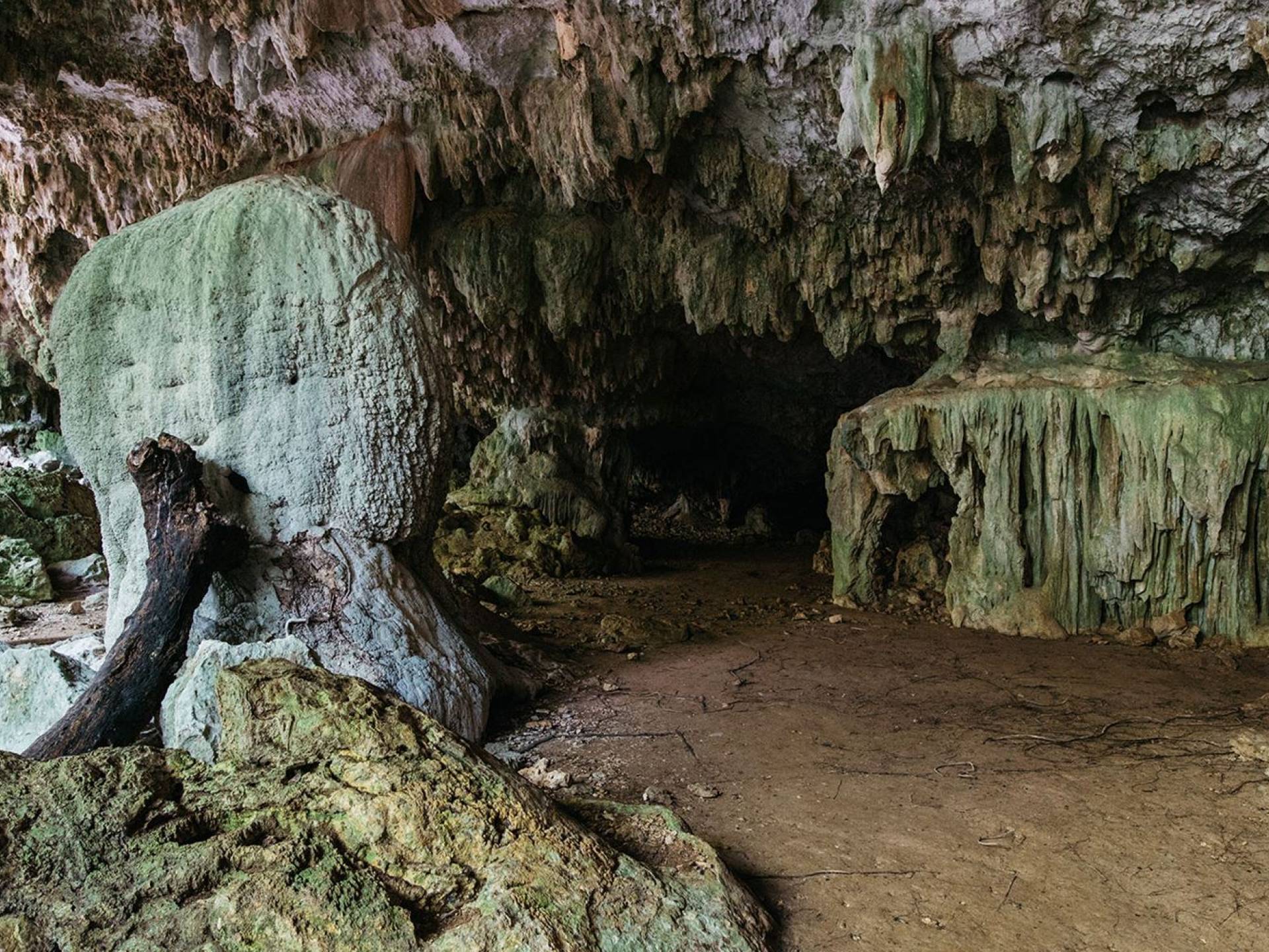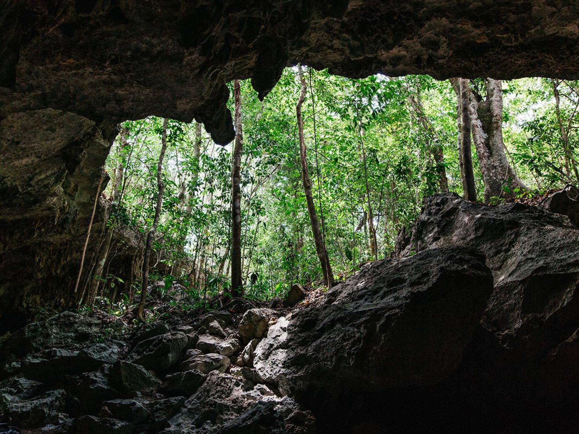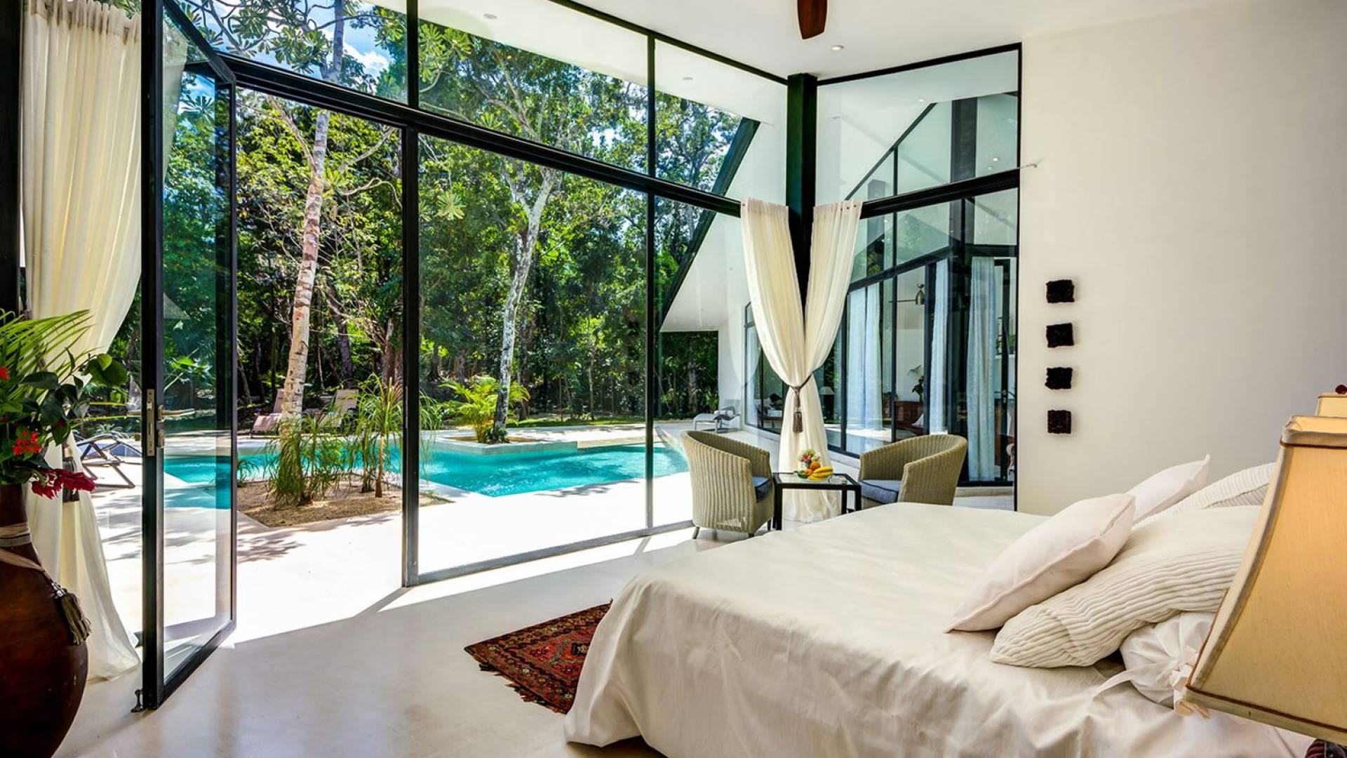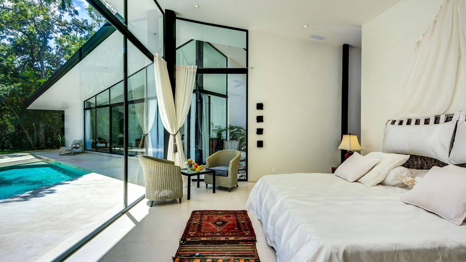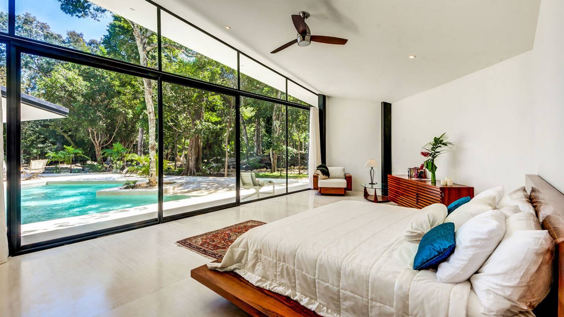 The villa nestles on top of the Yucatan peninsula’s typical cenote ground, which means there is fresh water on the lot, just a few steps from the house in an underground stalactite cave where the wild animals come to drink.