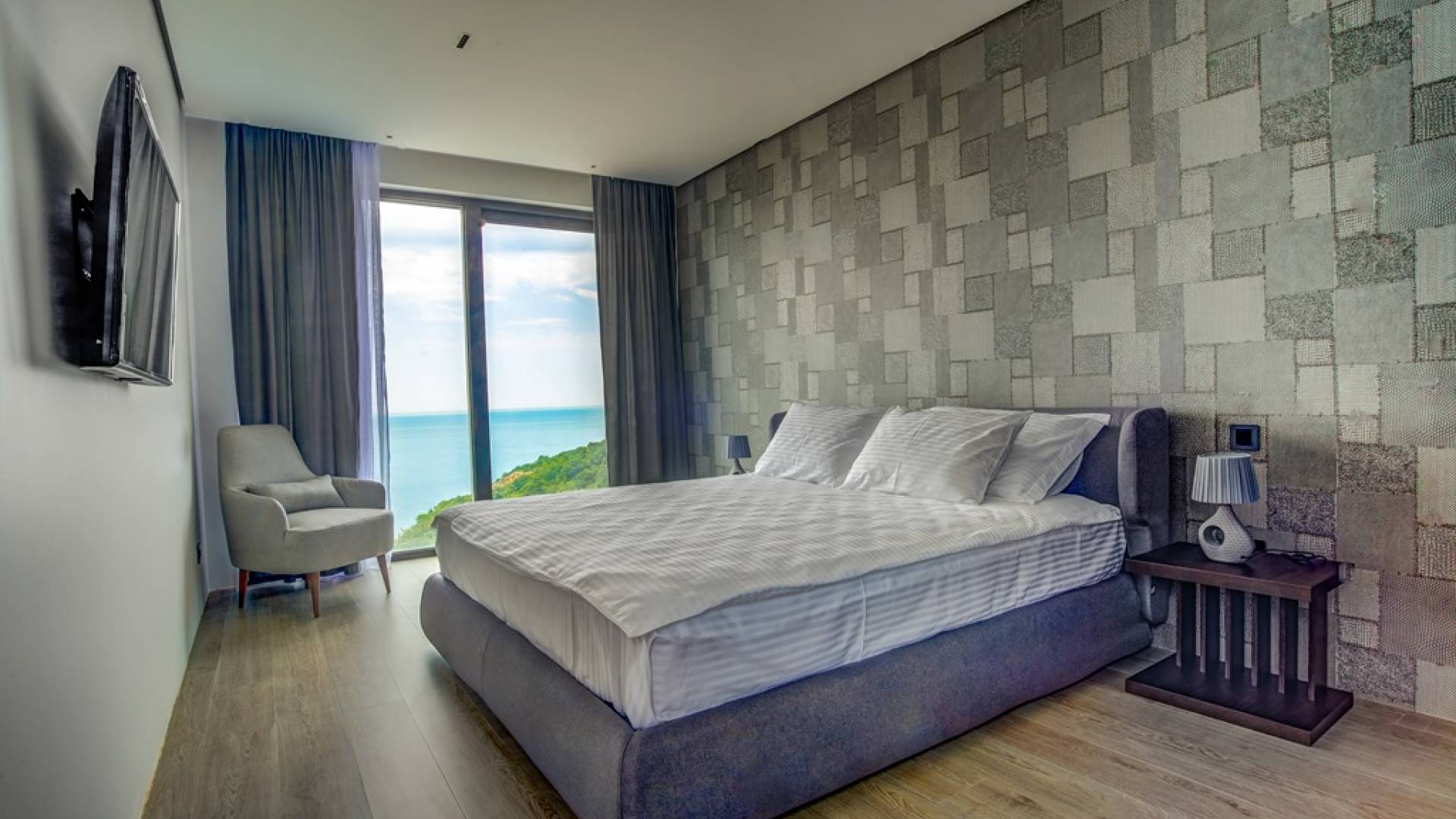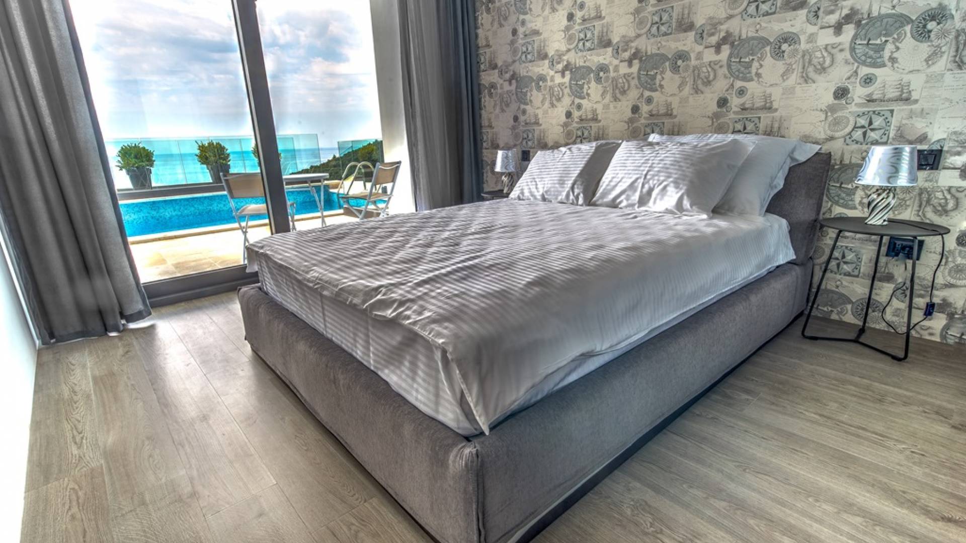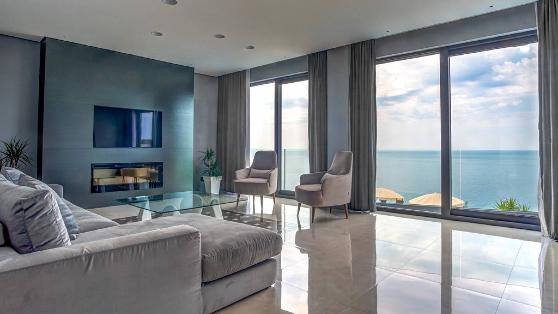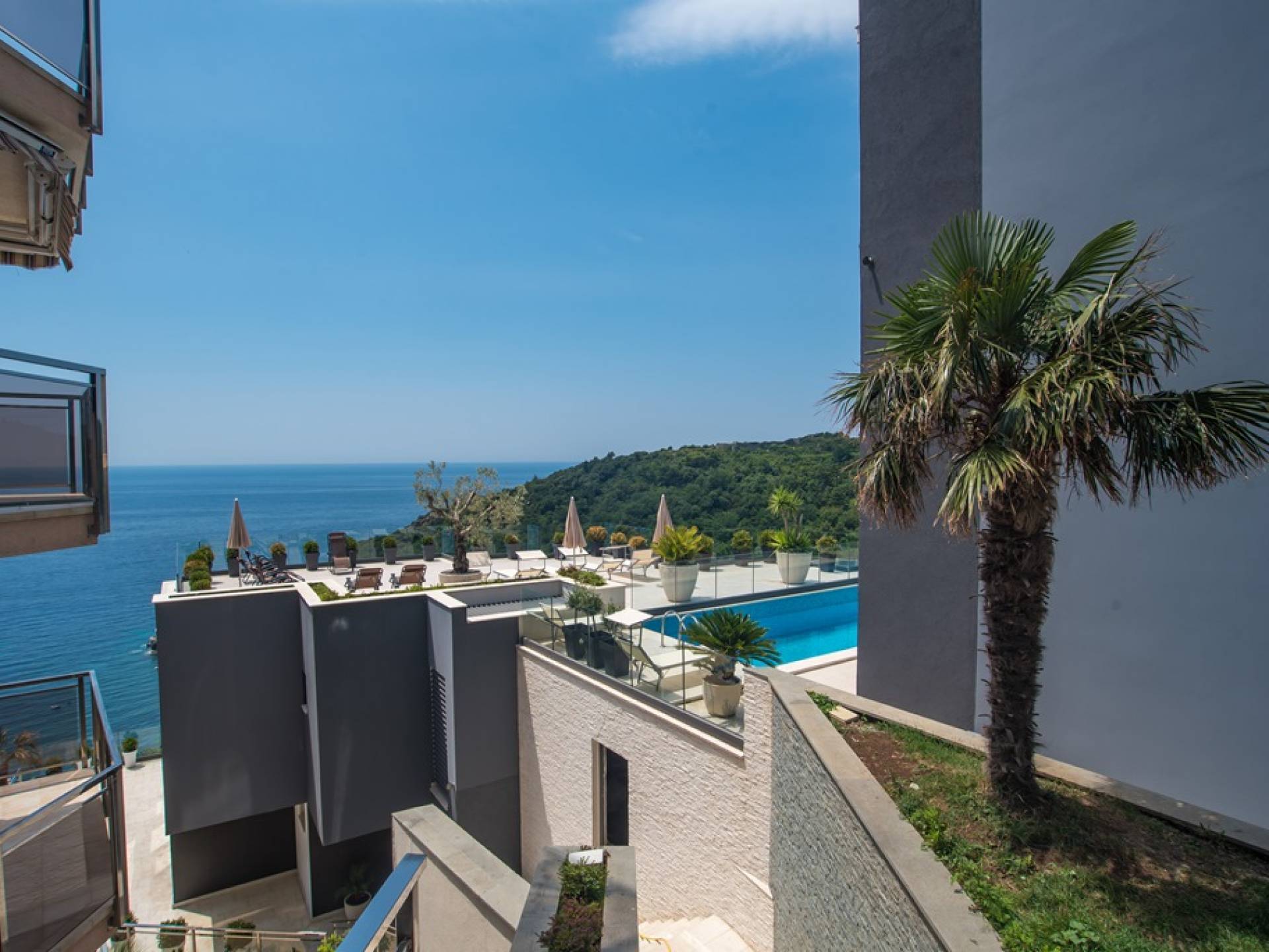 Each room has a fantastic and spectacular view of the open sea. A brand new road from Budva leads directly to the villa. The center of Budva, the Old Town, can be reached in 1 minute by car. Villas have private parking, video surveillance system, smart home system, maintenance, daily basic cleaning.