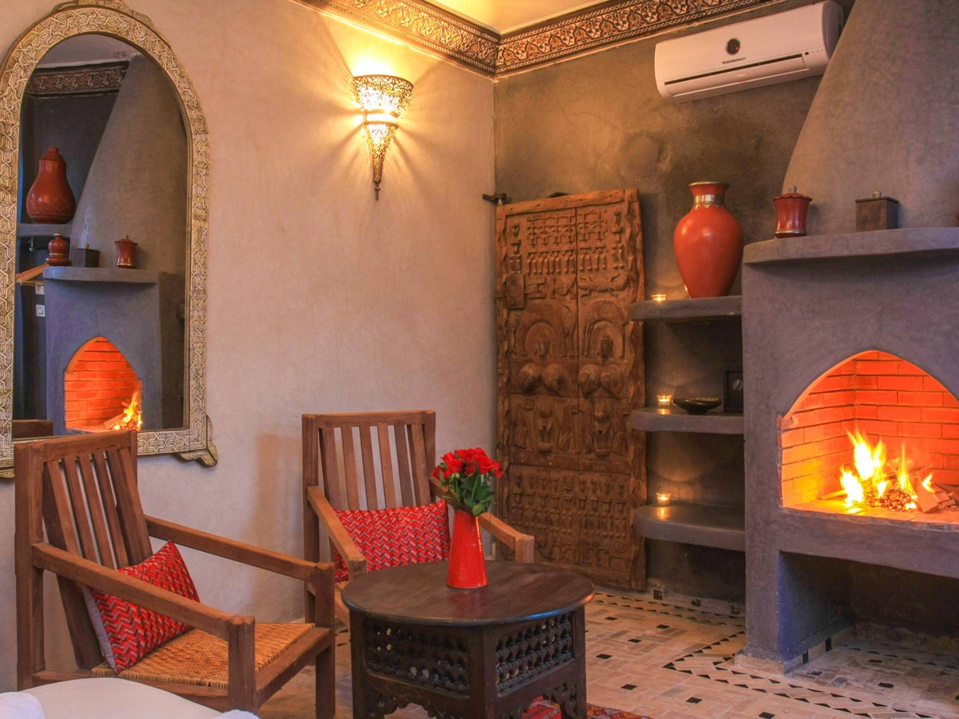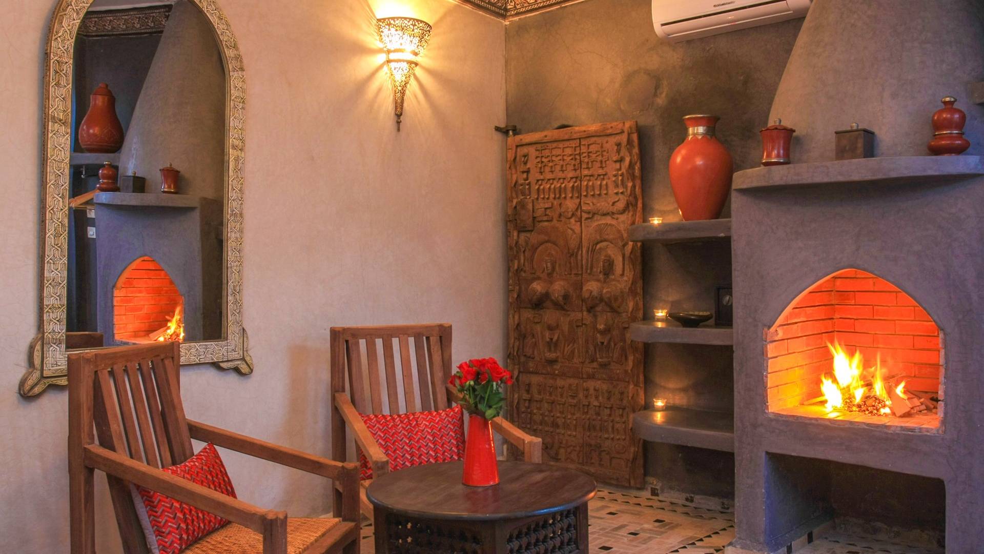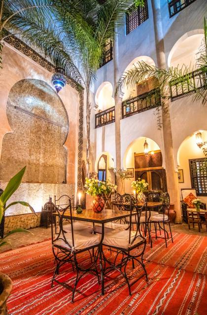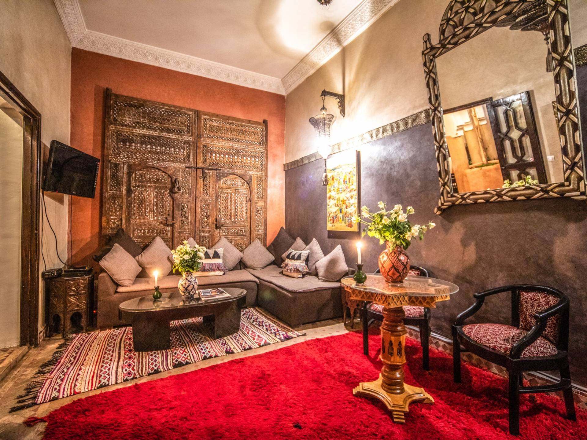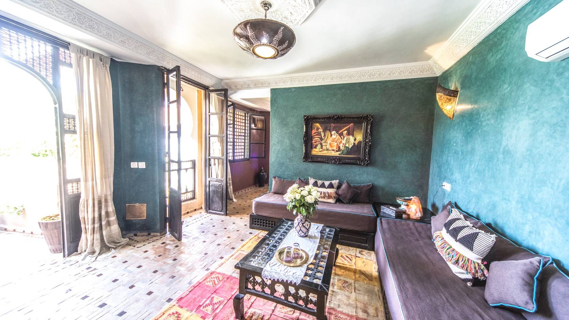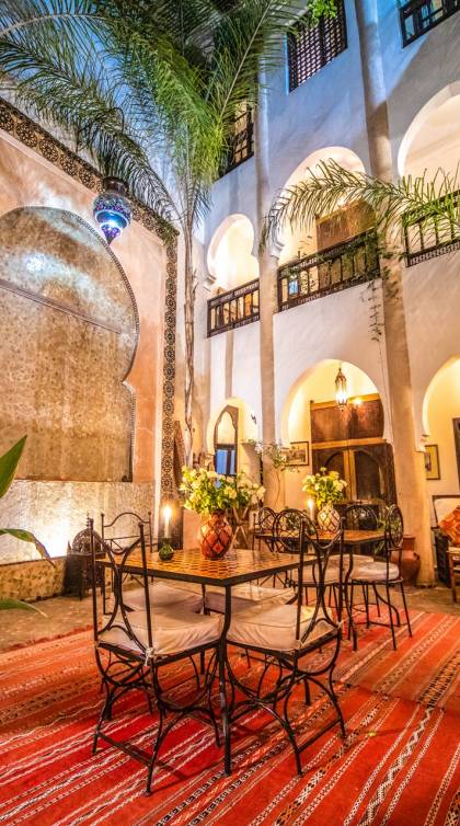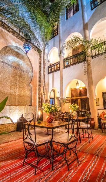 The riad has a number of areas for you to use and has been designed to ensure comfort and style not only within your own room but also at the rest of the house. The large courtyard is the hub of the house and its majestic focal point is the wall fountain, which soothes the senses and cools the atmosphere. The candlelit courtyard will welcome you on your way back from the busy souks and will purify your senses with its spicy smells, seductive noises, and mysterious lights. This is the space to meet up with other guests, enjoy a drink or read a book.