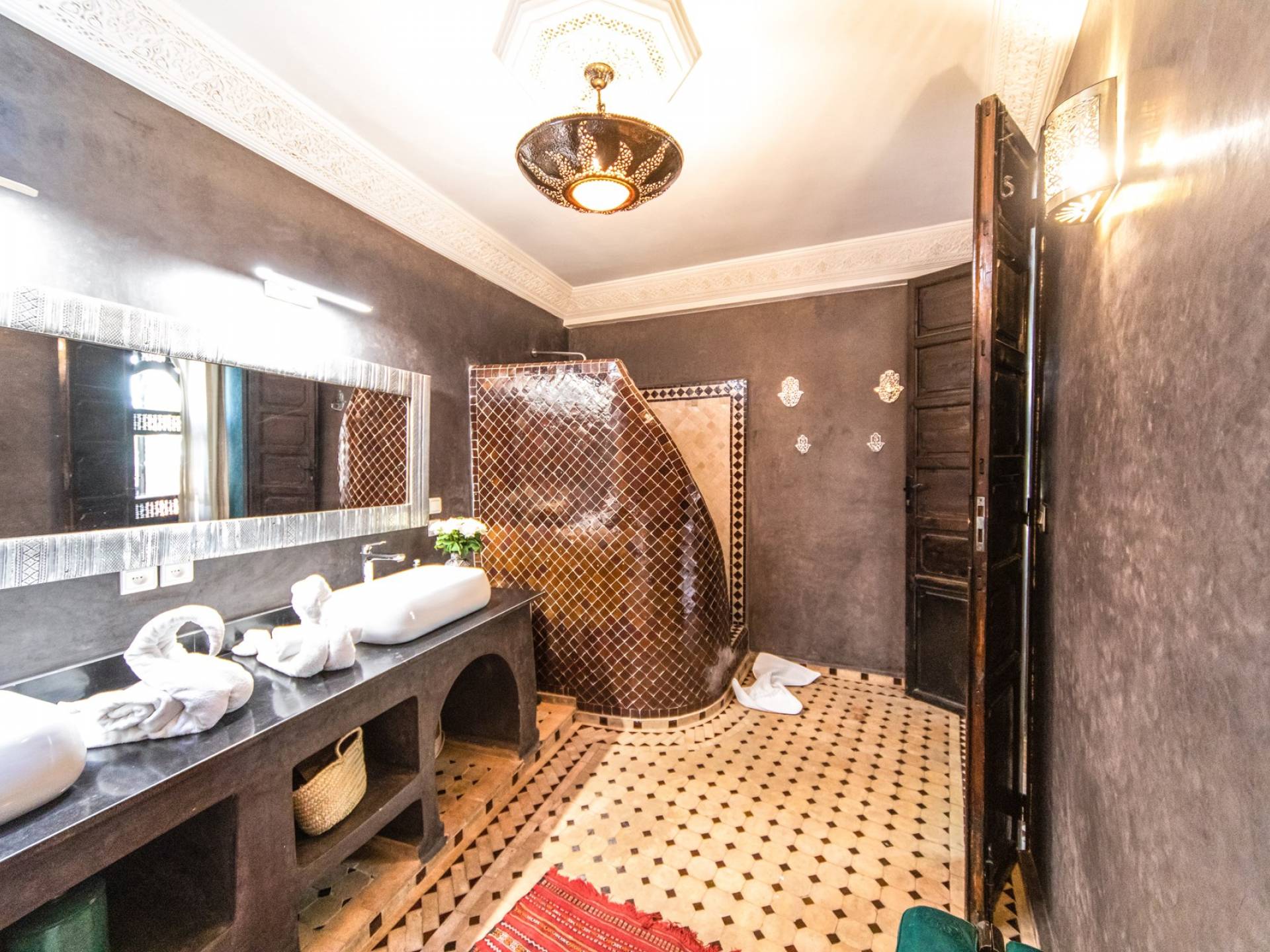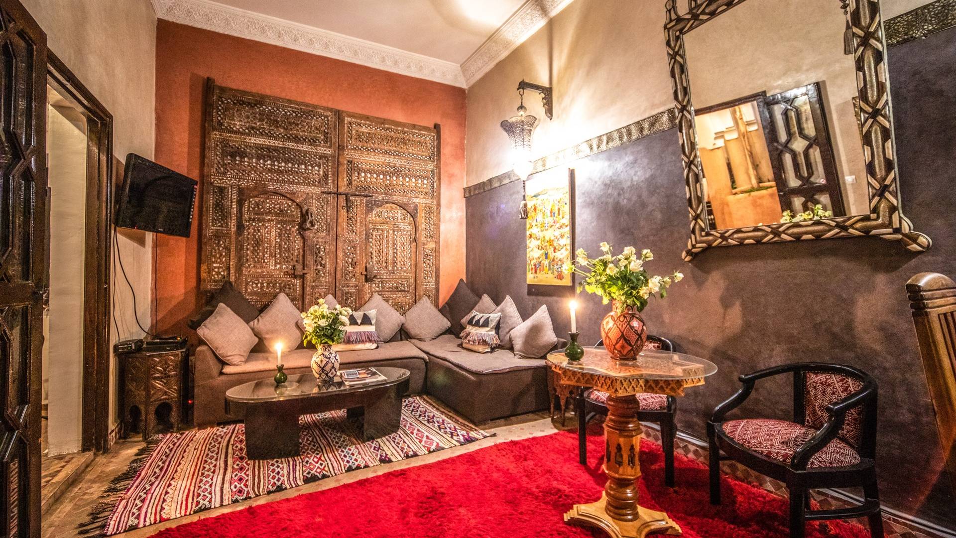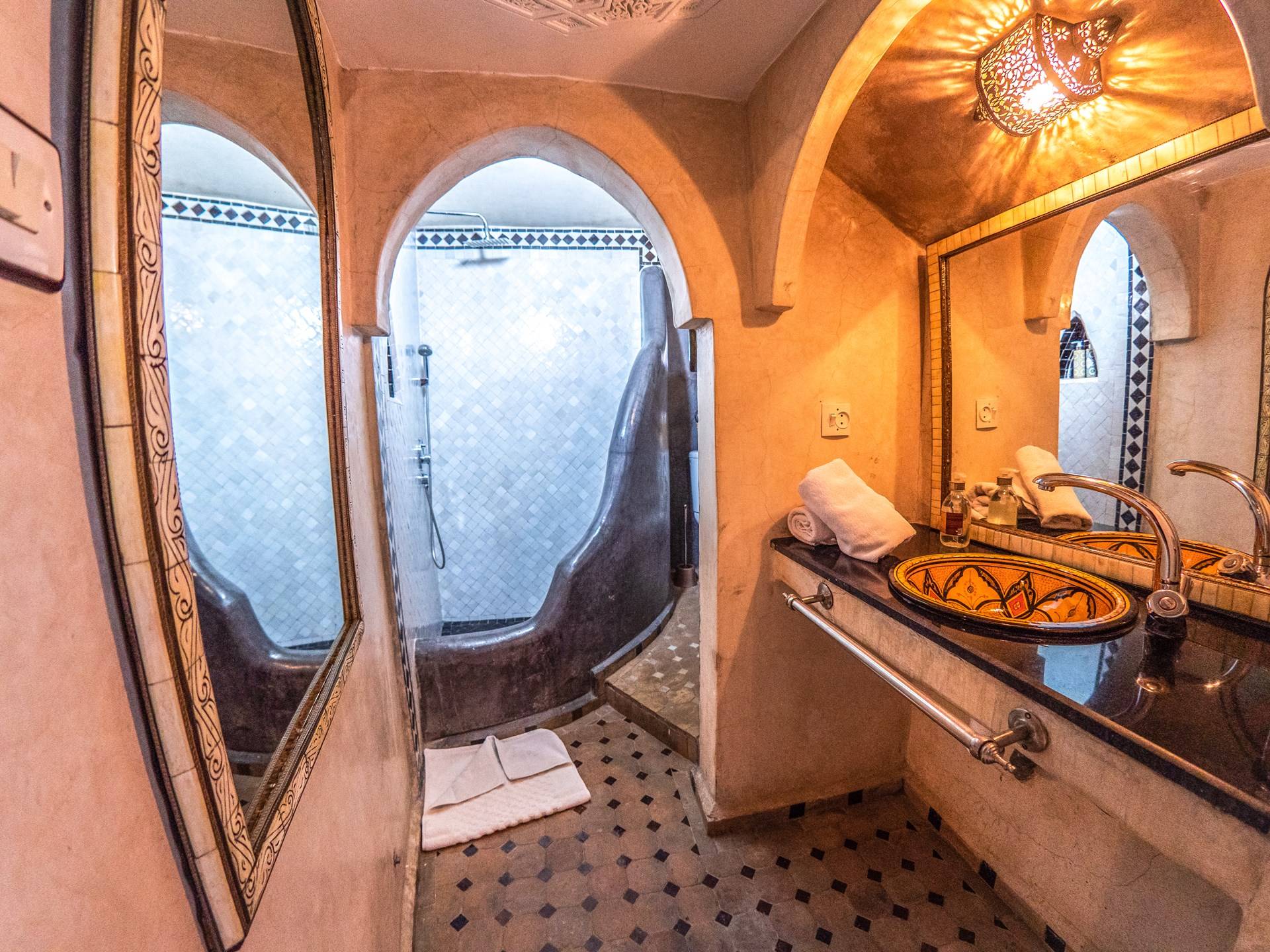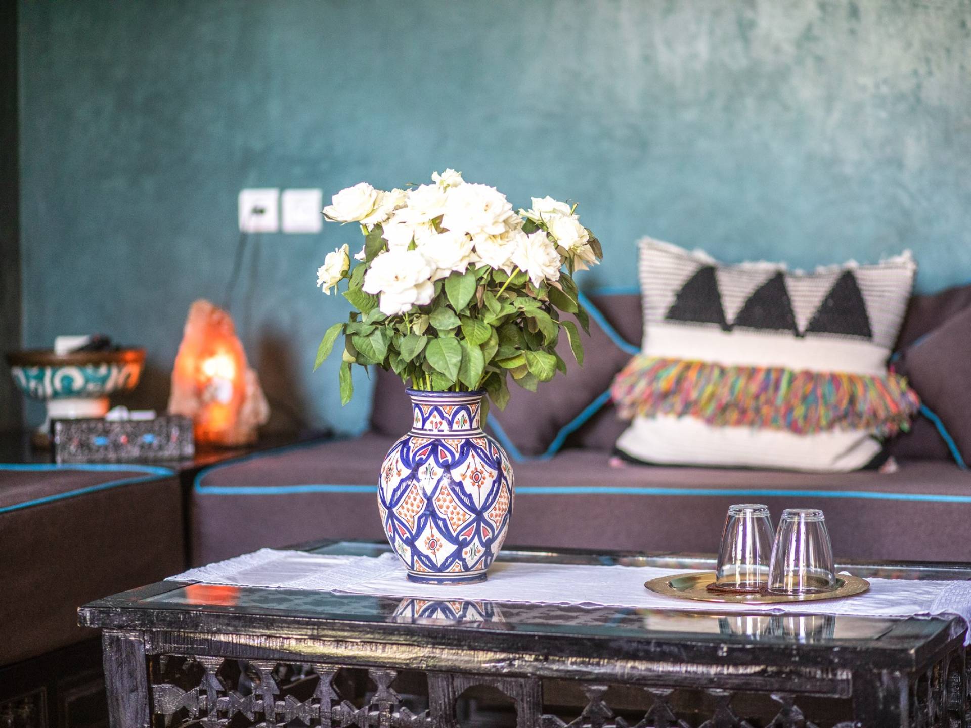 The riad has a number of areas for you to use and has been designed to ensure comfort and style not only within your own room but also at the rest of the house. The large courtyard is the hub of the house and its majestic focal point is the wall fountain, which soothes the senses and cools the atmosphere. The candlelit courtyard will welcome you on your way back from the busy souks and will purify your senses with its spicy smells, seductive noises, and mysterious lights. This is the space to meet up with other guests, enjoy a drink or read a book.
