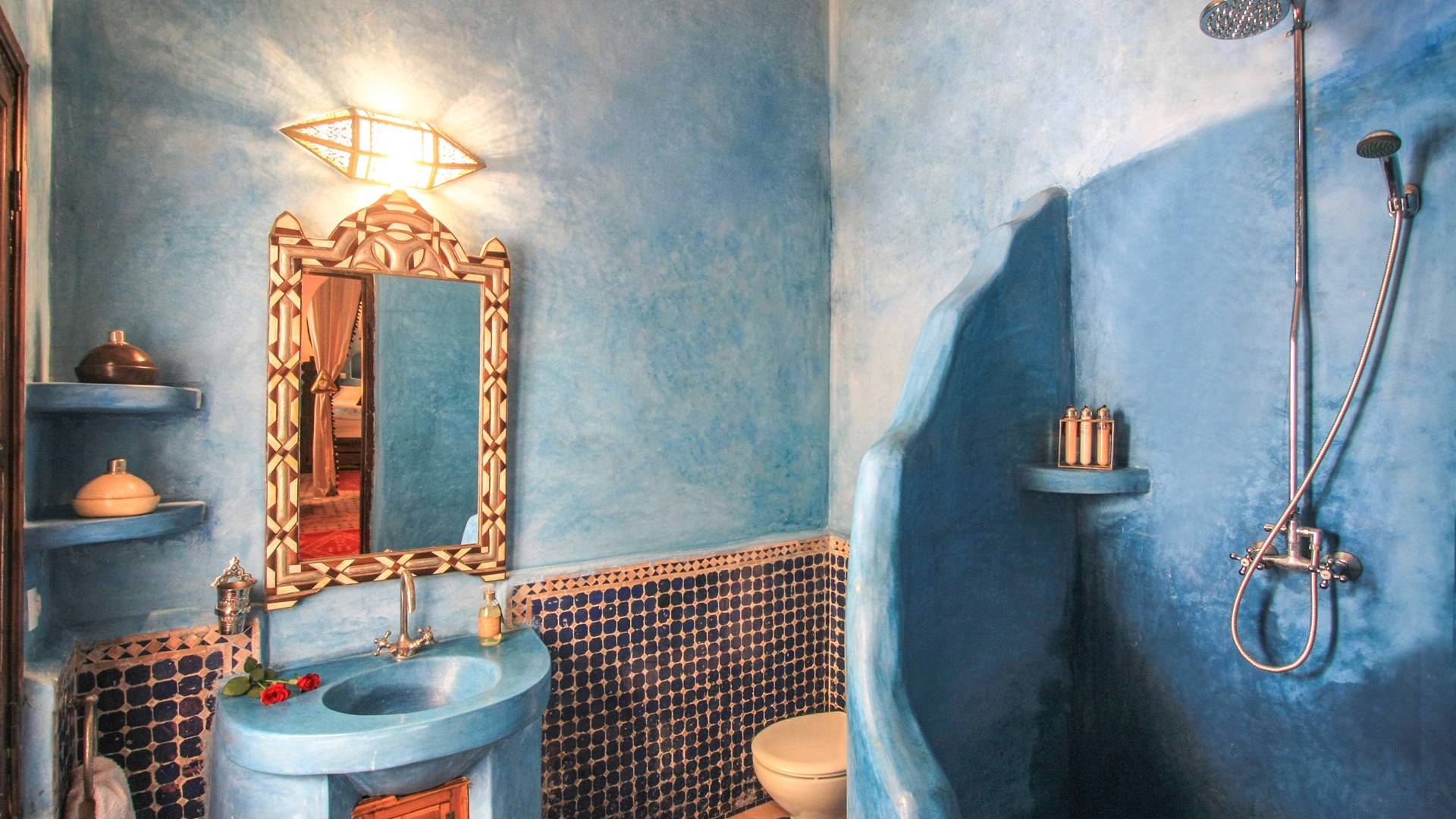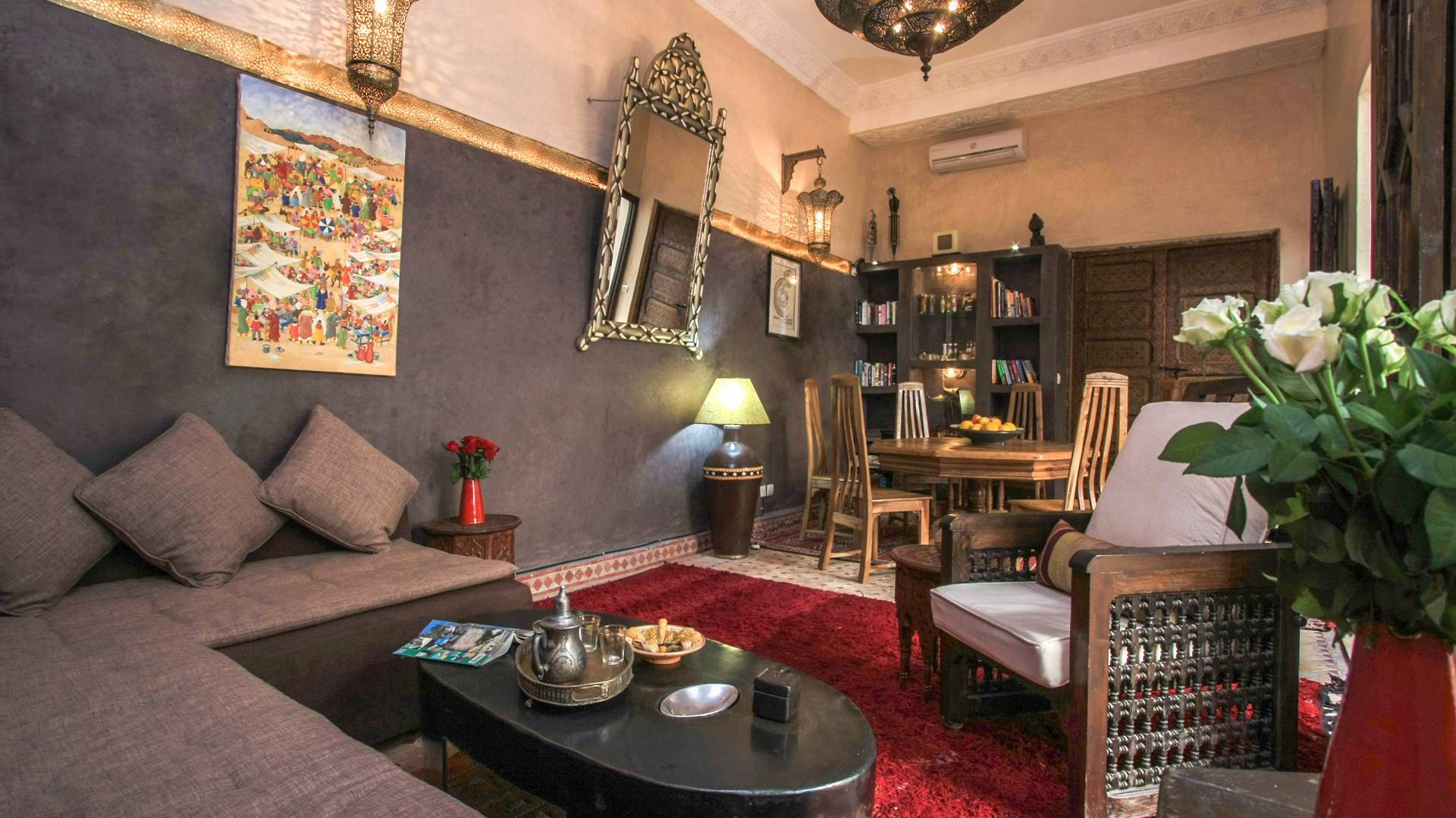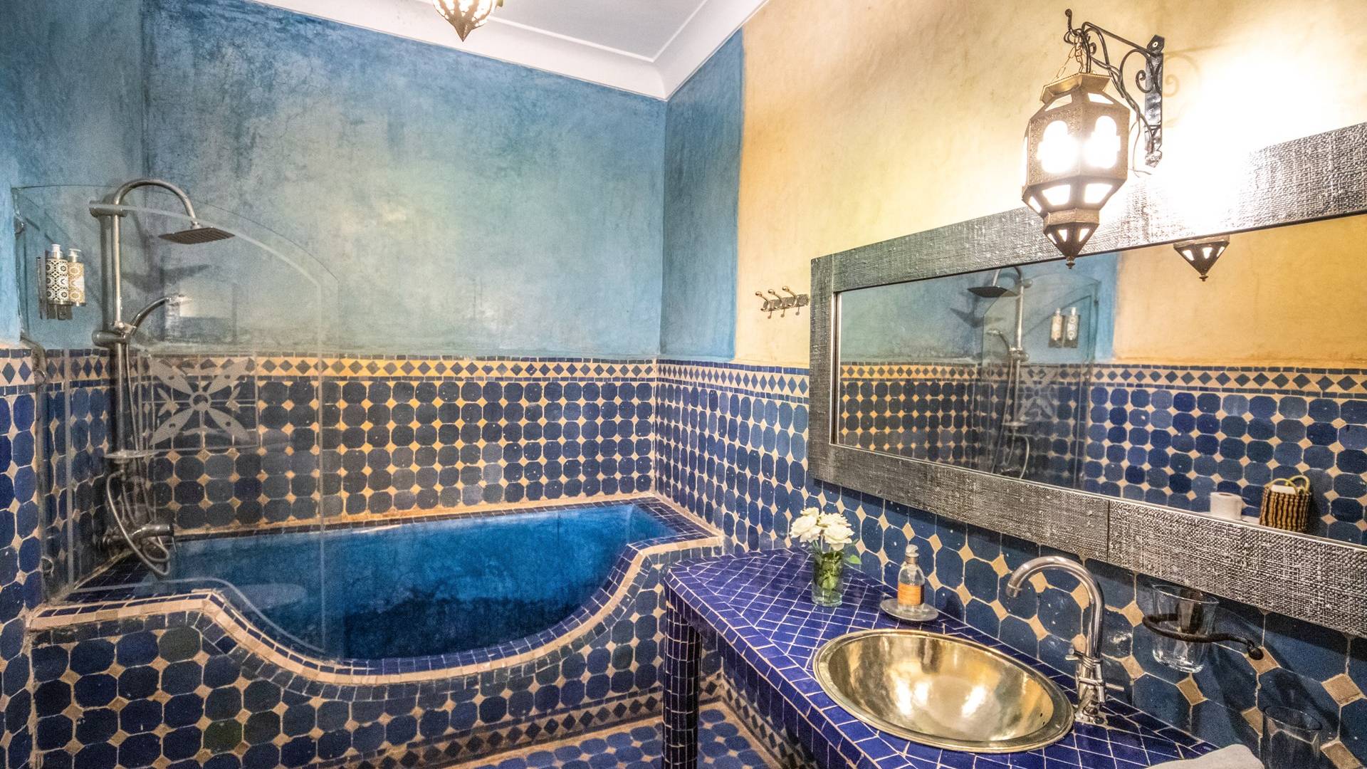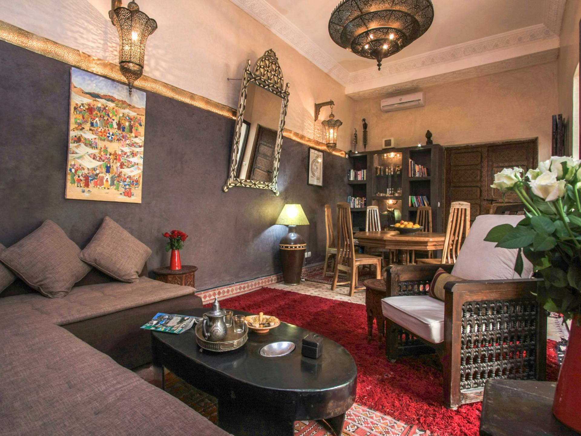 The riad has a number of areas for you to use and has been designed to ensure comfort and style not only within your own room but also at the rest of the house. The large courtyard is the hub of the house and its majestic focal point is the wall fountain, which soothes the senses and cools the atmosphere. The candlelit courtyard will welcome you on your way back from the busy souks and will purify your senses with its spicy smells, seductive noises, and mysterious lights. This is the space to meet up with other guests, enjoy a drink or read a book.
