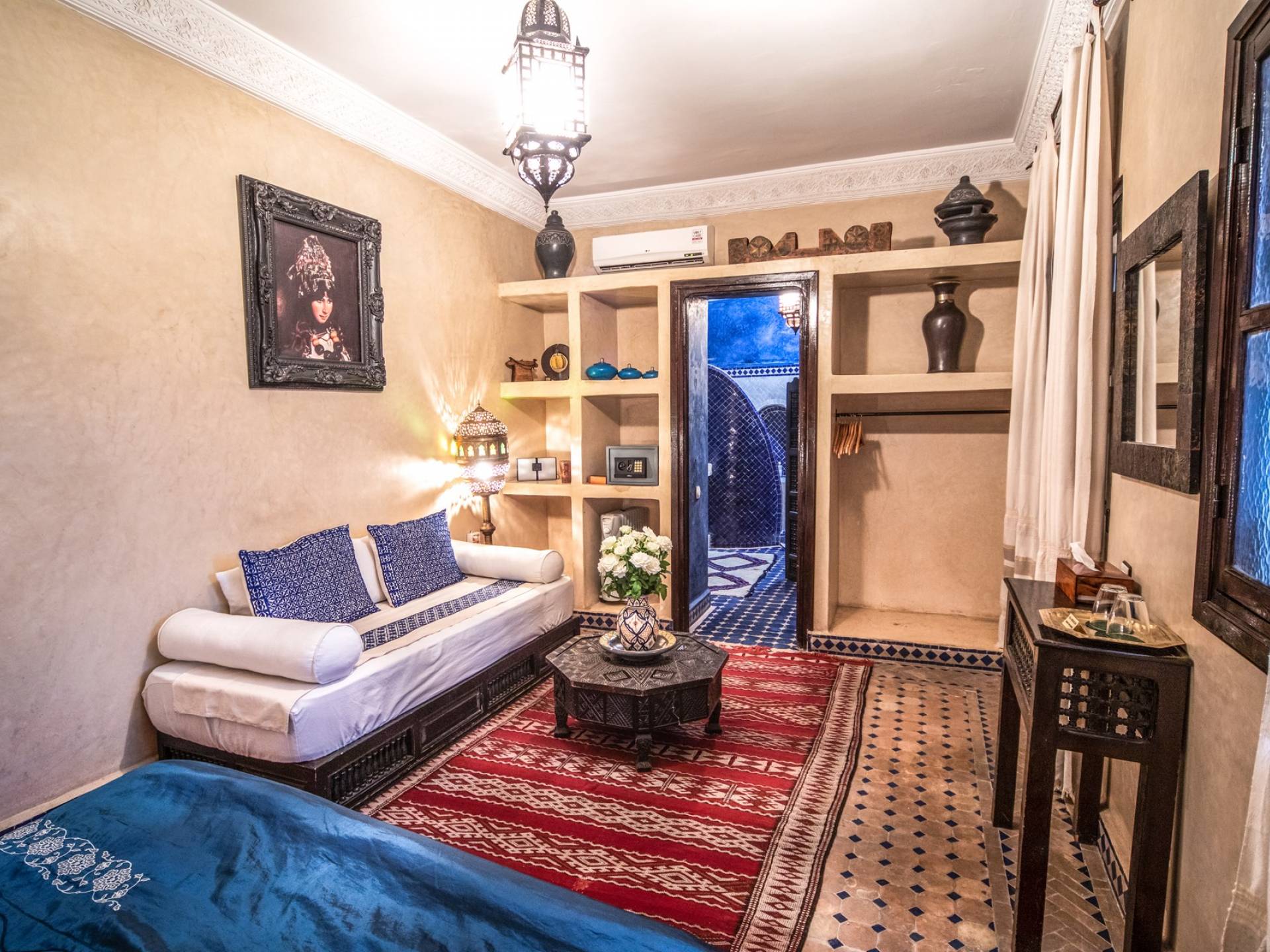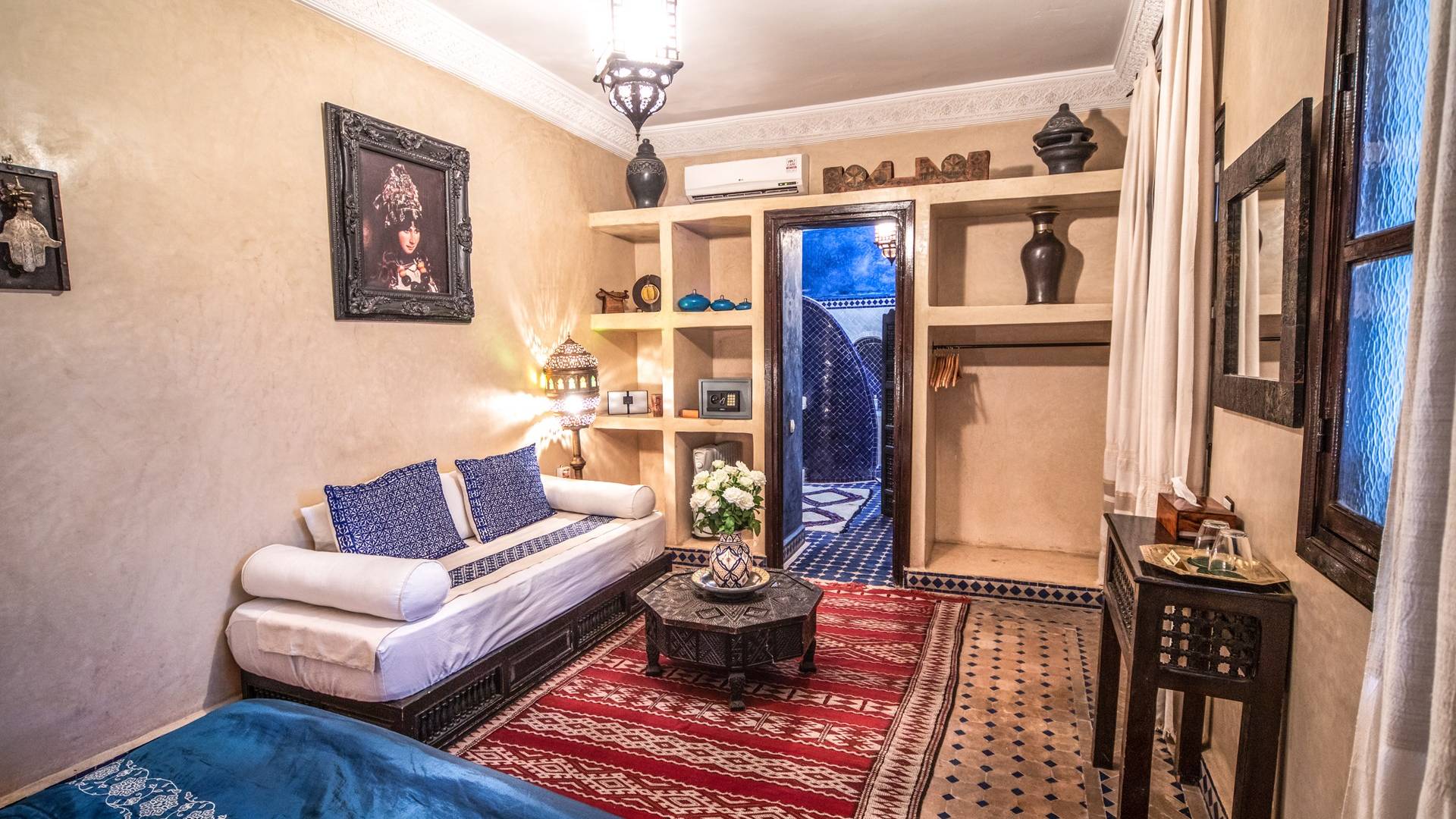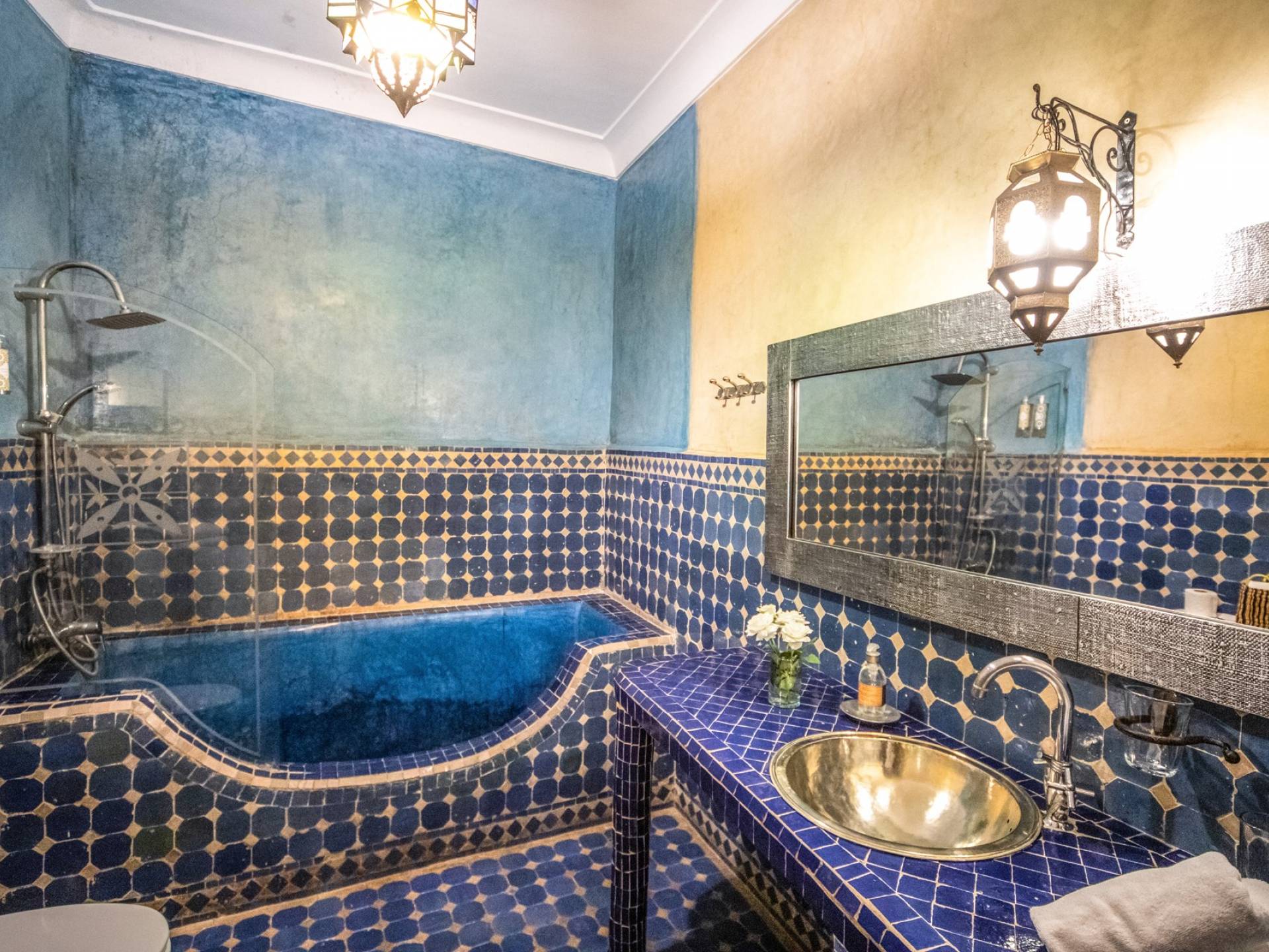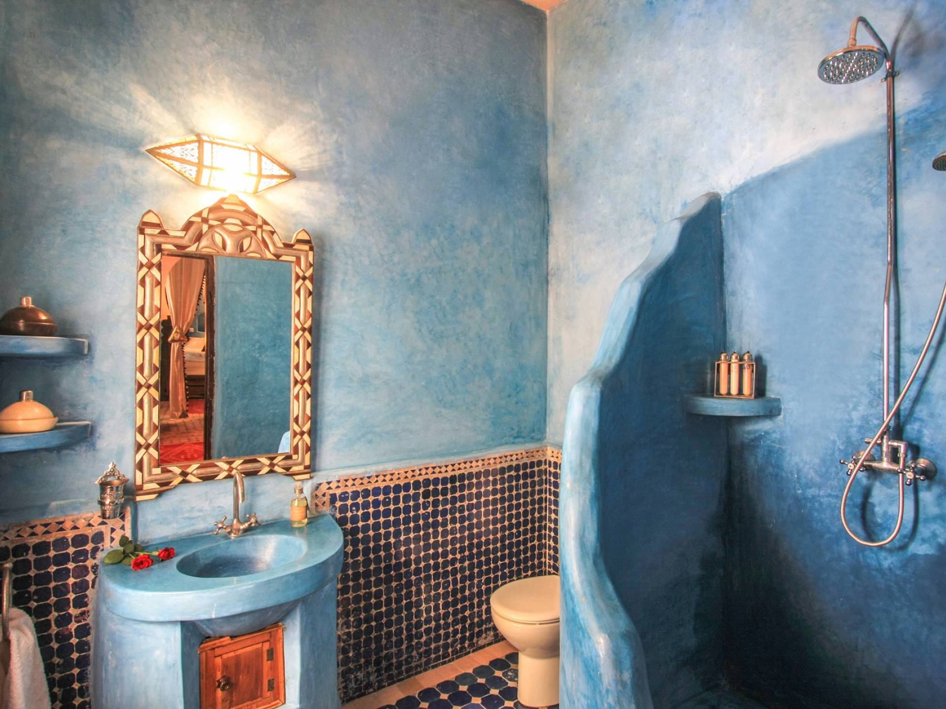 The riad has a number of areas for you to use and has been designed to ensure comfort and style not only within your own room but also at the rest of the house. The large courtyard is the hub of the house and its majestic focal point is the wall fountain, which soothes the senses and cools the atmosphere. The candlelit courtyard will welcome you on your way back from the busy souks and will purify your senses with its spicy smells, seductive noises, and mysterious lights. This is the space to meet up with other guests, enjoy a drink or read a book.
