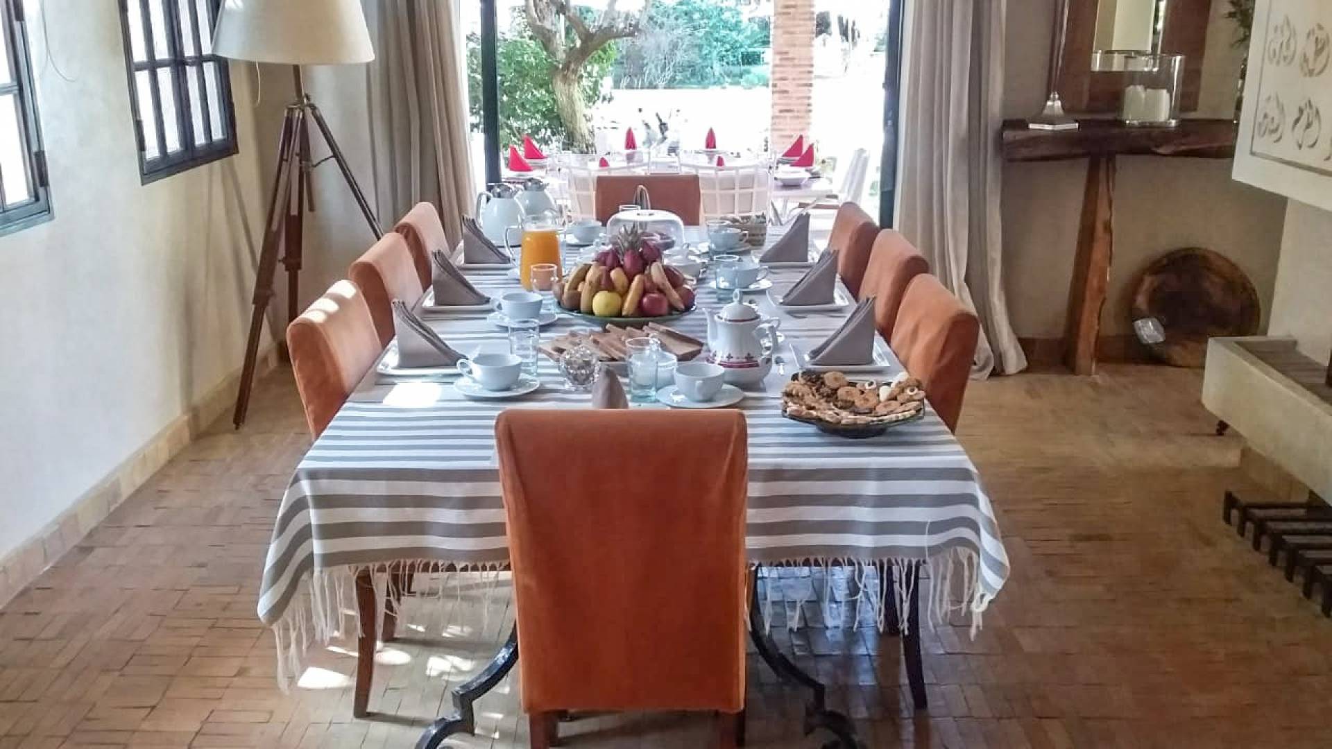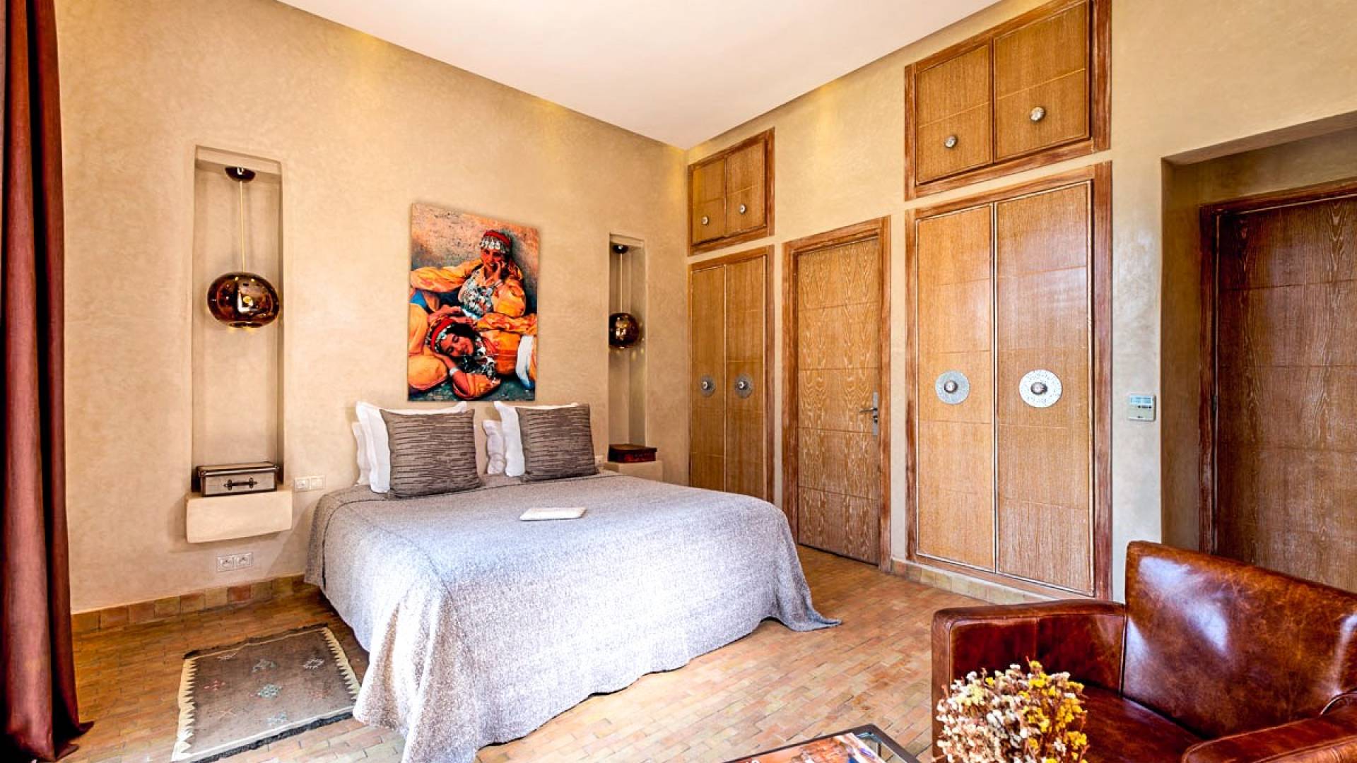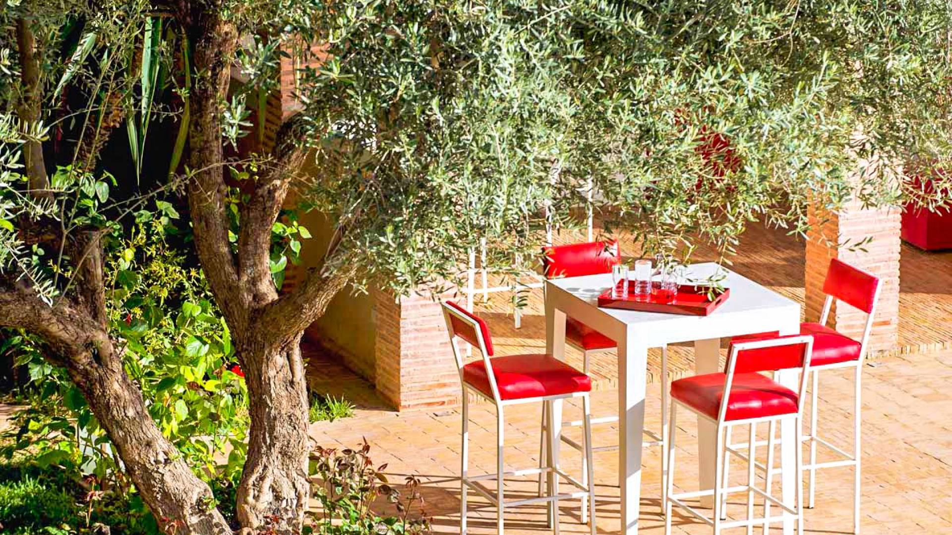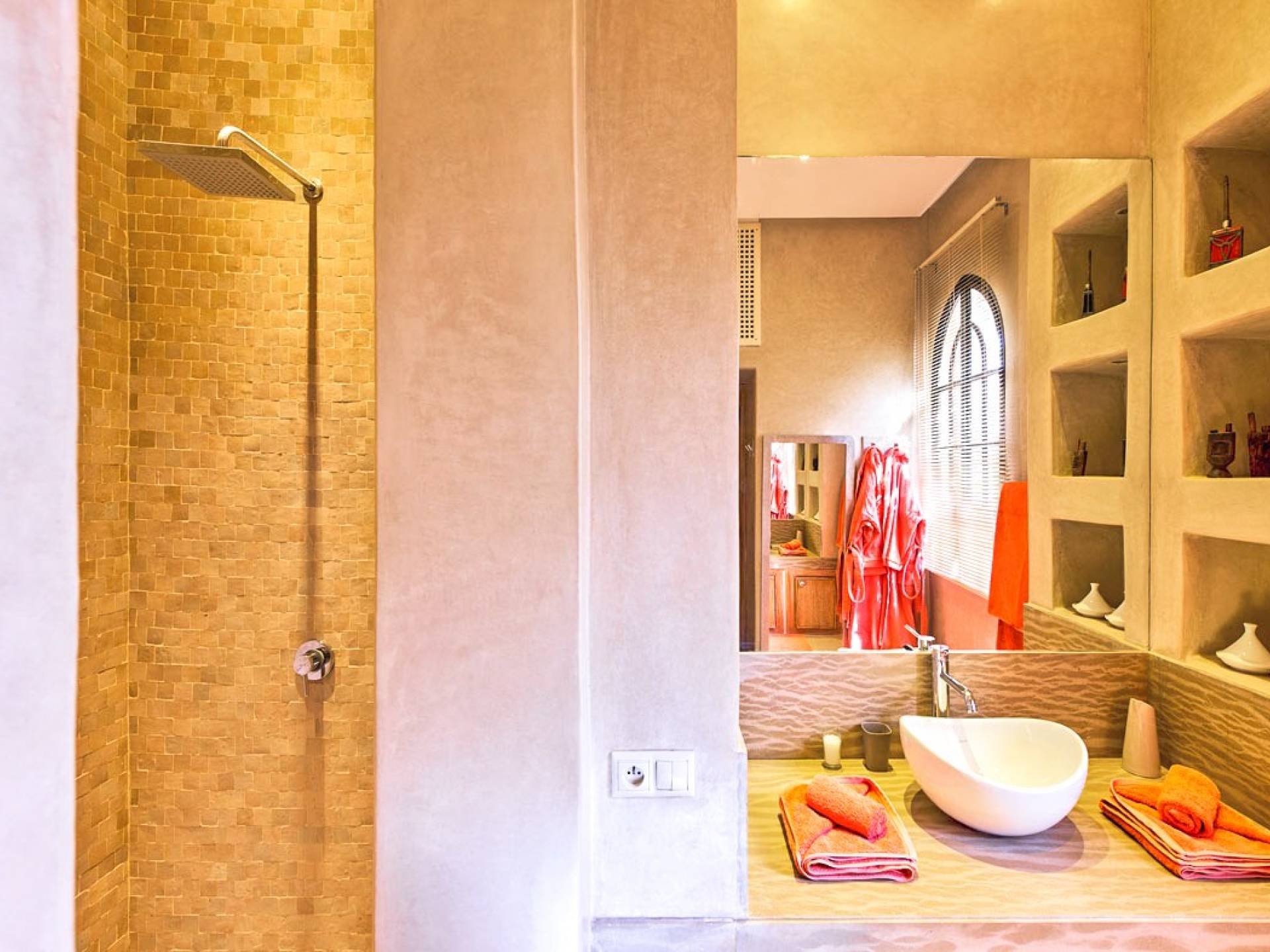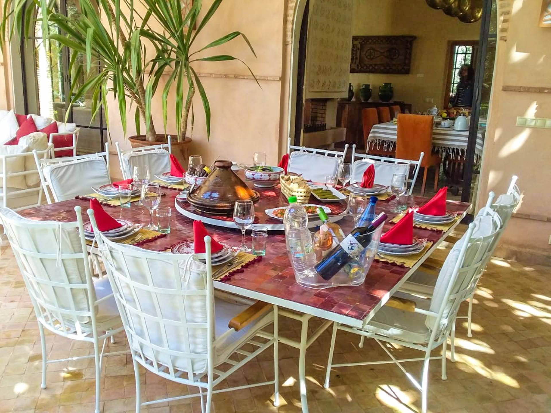 A large terrace overlooking the garden and the swimming pool where you can eat and relax in the open air and a perfectly fitted interior kitchen. An outdoor kitchen with plancha and barbecue and a laundry/laundry room. Villa Saada is designed around a patio pierced with arches of red briquettes over a large lush garden where the different species (olive trees, palm trees, orange trees, lemon trees, etc.) combine in perfect harmony. This villa is ideal for your stay with friends or family in Marrakech, 7 minutes from the famous Jemaa El Fna square in the Medina and from Guéliz the modern city.