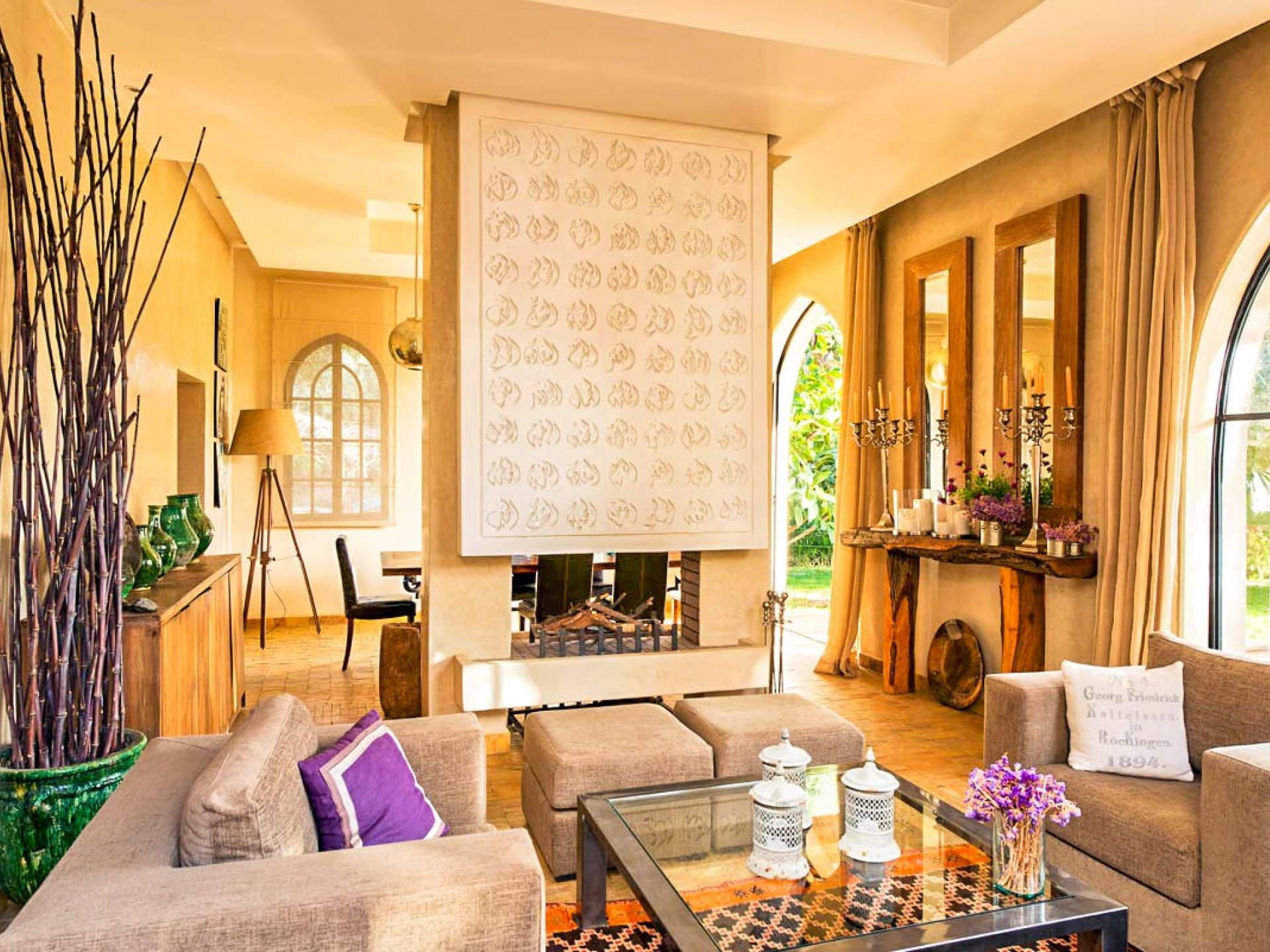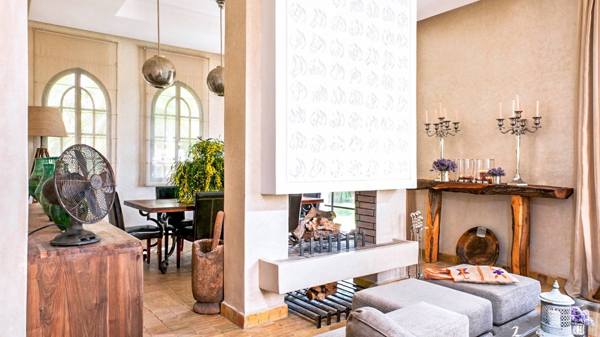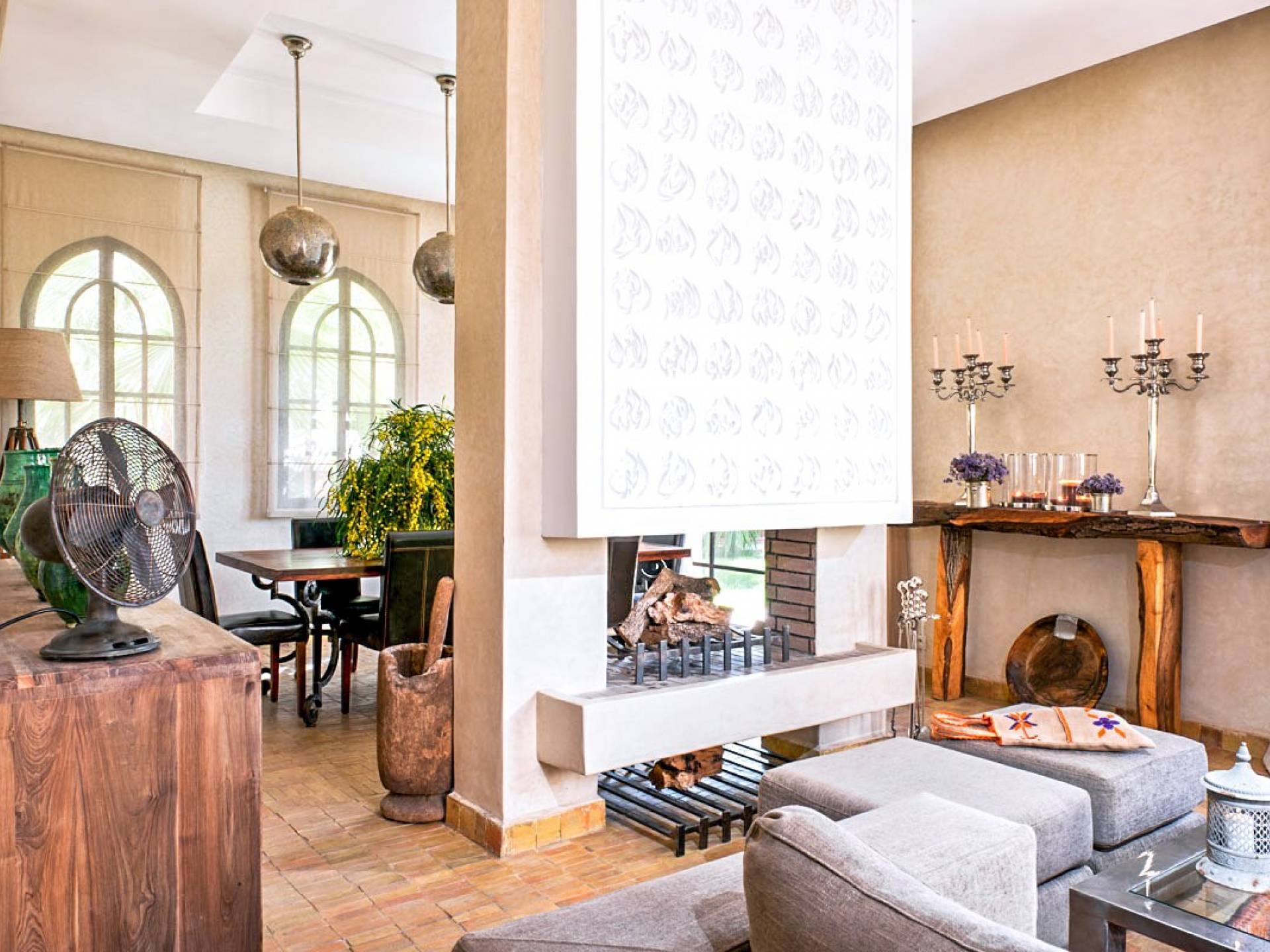 The villa consists of 4 Suites with large bathrooms, a dressing room, and 1 separate bedroom with a bathroom and dressing room. There is also a private terrace for 3 suites with an outdoor lounge and solarium. A Moroccan and contemporary living room with fireplace, Satellite TV (all channels + canal + included), CD / DVD player. A European living room and dining room with a central fireplace carved in Arabic calligraphy. A patio decorated with green plants with dining room, living room, and wall fountain.