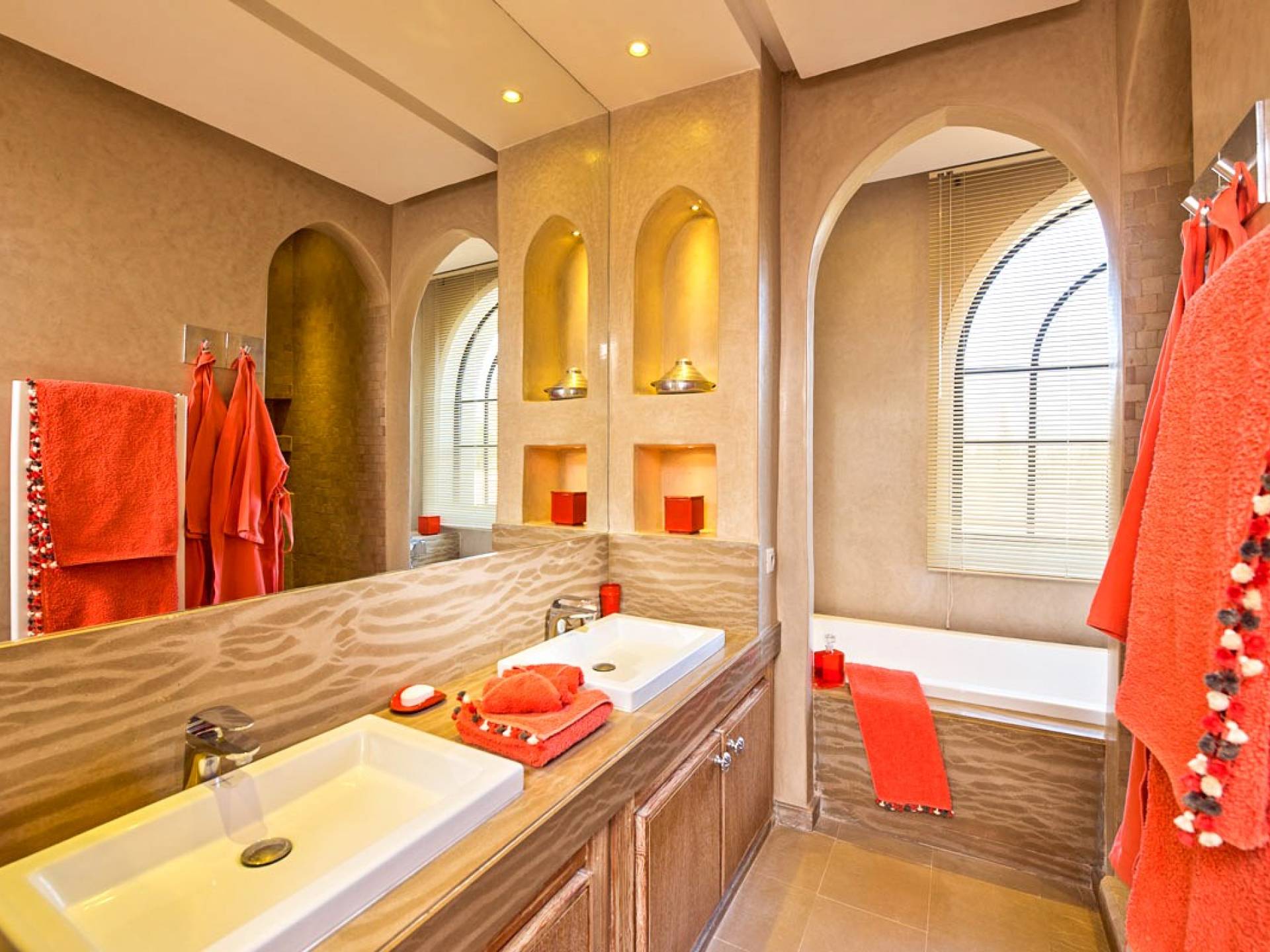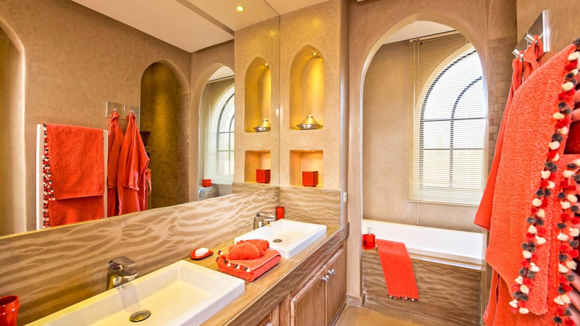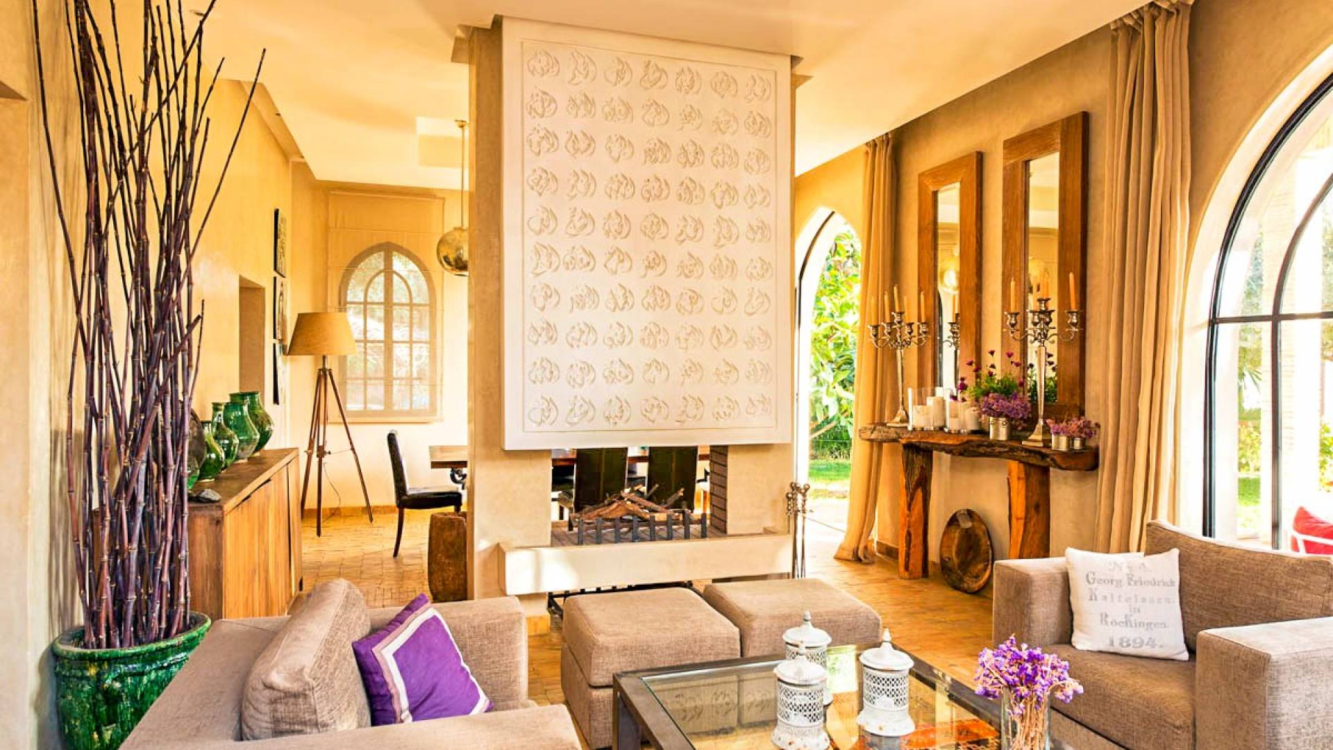 The villa consists of 4 Suites with large bathrooms, a dressing room, and 1 separate bedroom with a bathroom and dressing room. There is also a private terrace for 3 suites with an outdoor lounge and solarium. A Moroccan and contemporary living room with fireplace, Satellite TV (all channels + canal + included), CD / DVD player. A European living room and dining room with a central fireplace carved in Arabic calligraphy. A patio decorated with green plants with dining room, living room, and wall fountain.