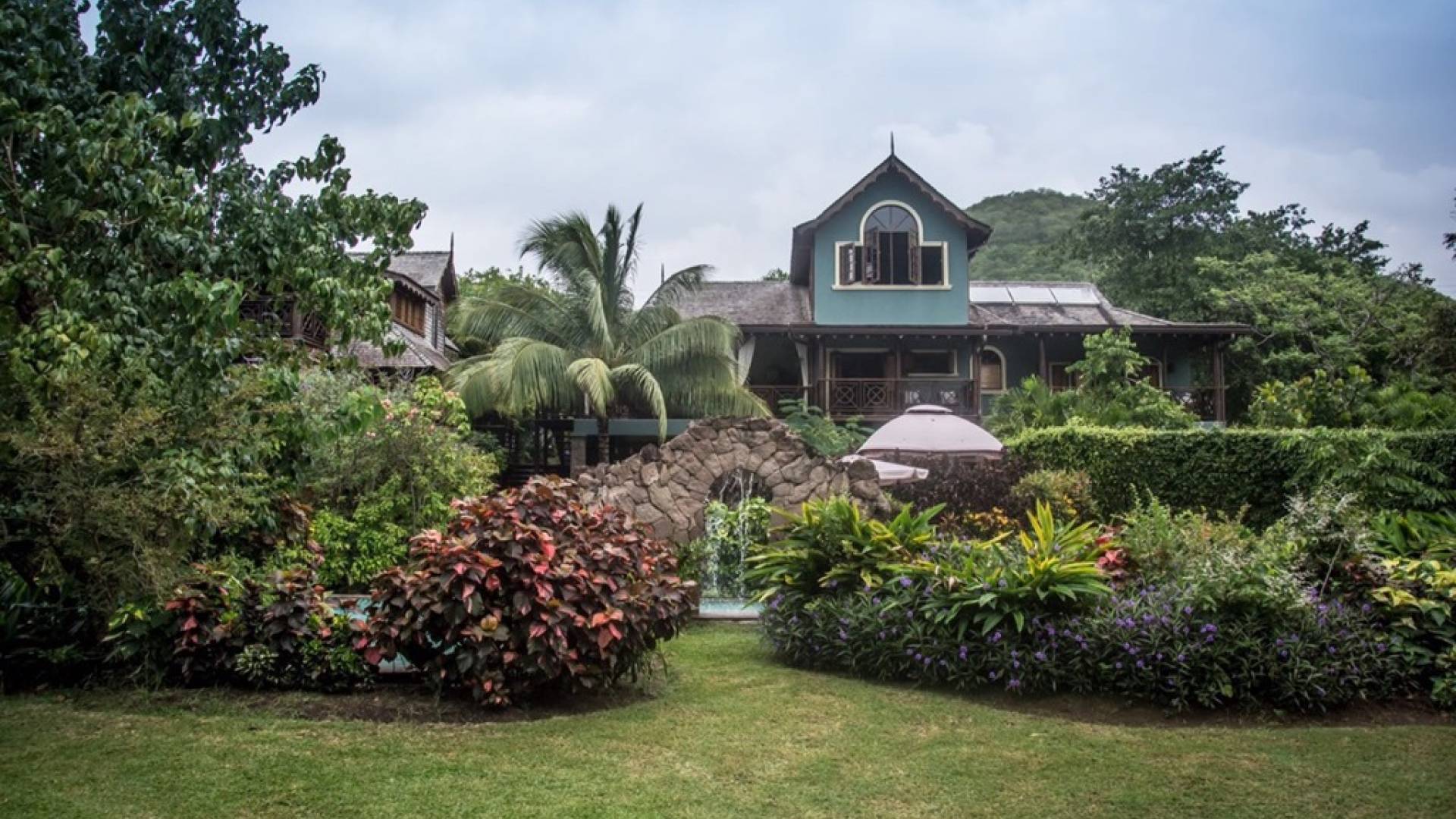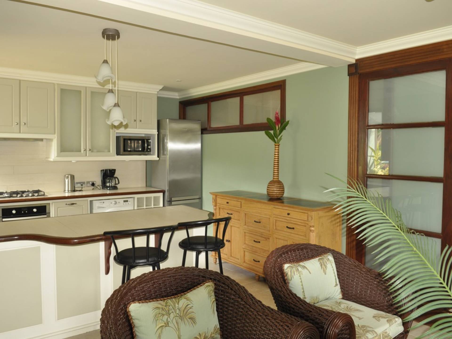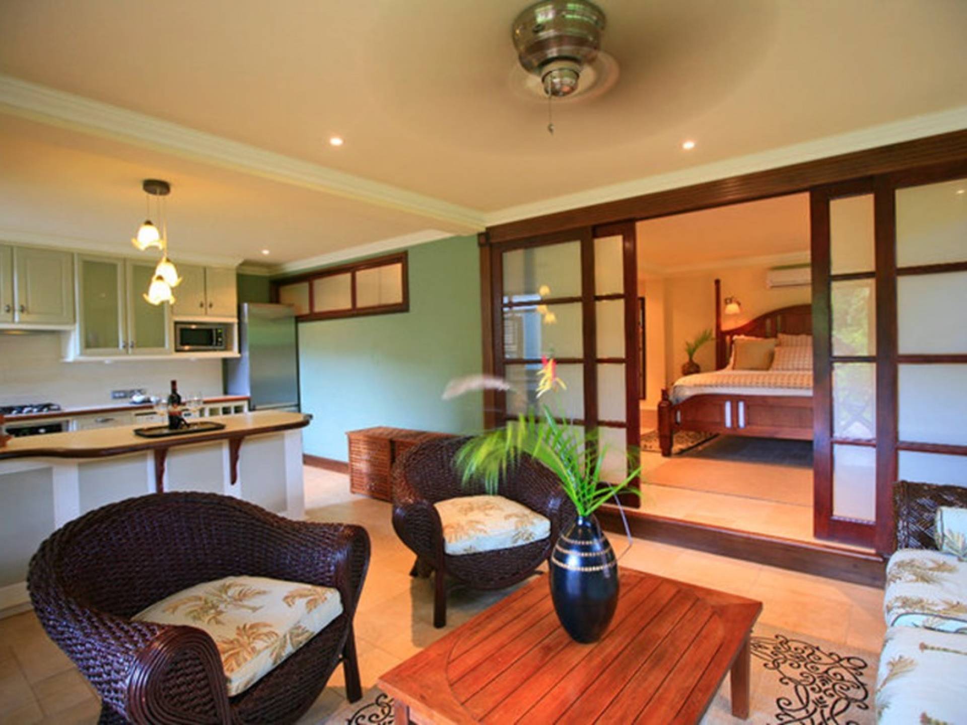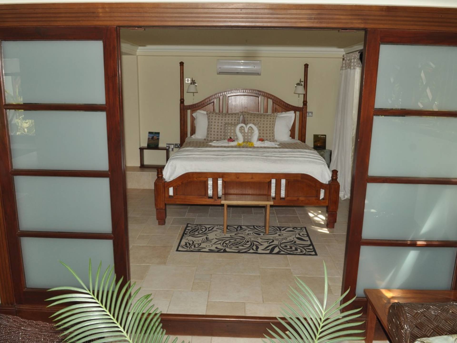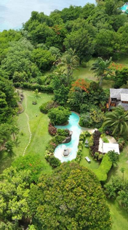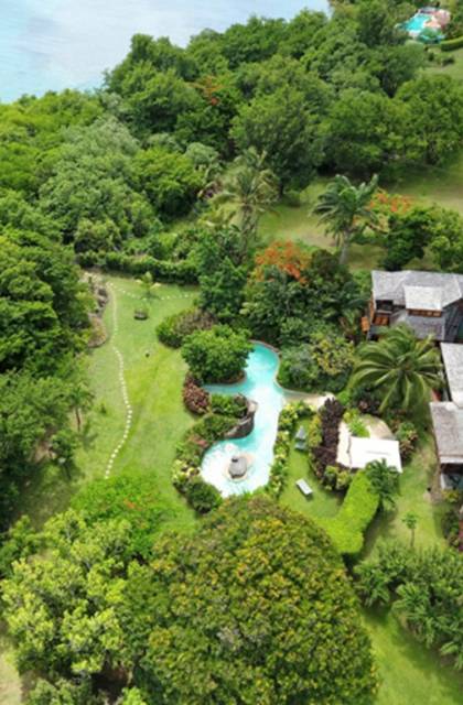 Beautifully appointed, set at pool level under the Flamboyant Villa’s bedroom wing and surrounded by flowering shrubs and fruits, this spacious one-bedroom apartment leads into “C’est la Vie’s” tropical garden. The verandah is comfortably furnished for relaxing during the day and perhaps dining in the evening. The Master bedroom is reached through double sliding doors and leads into the large ensuite bathroom where the handmade soaking tub immediately catches the eye.