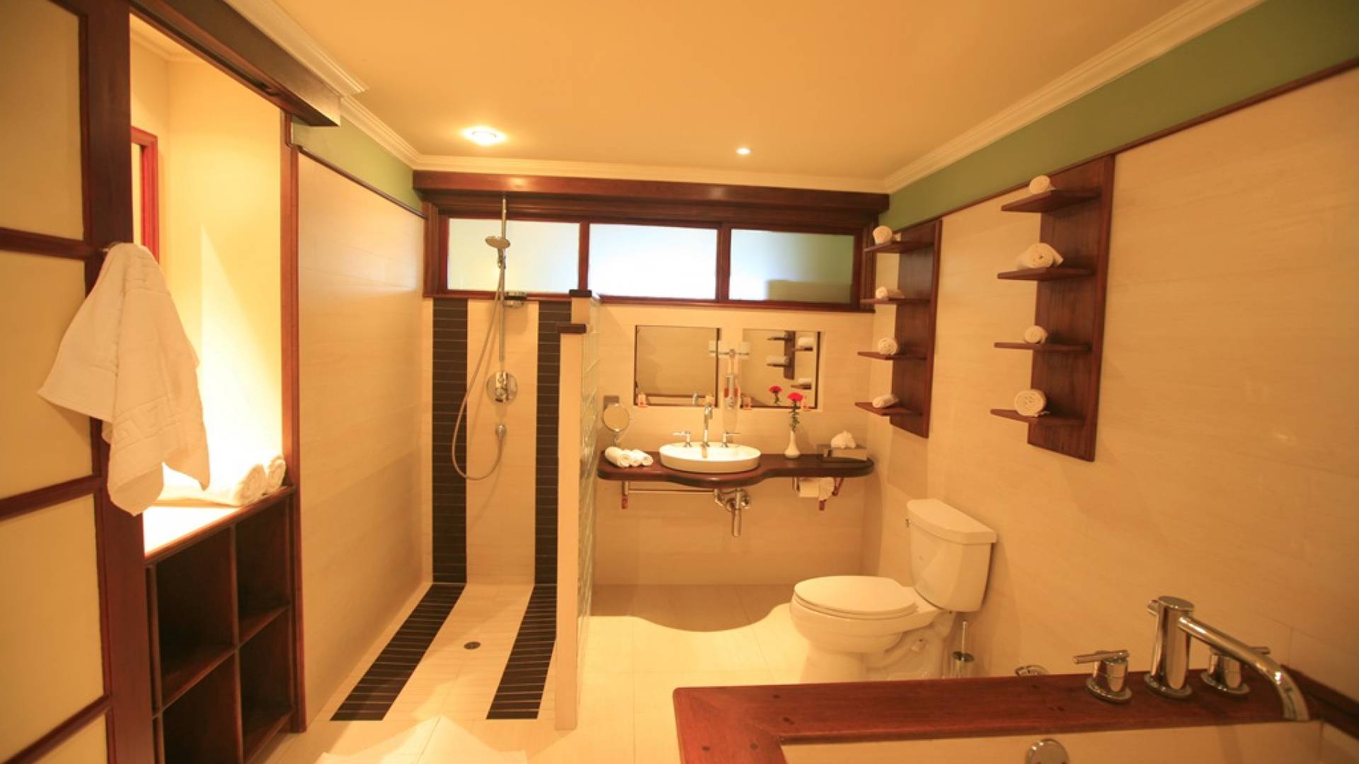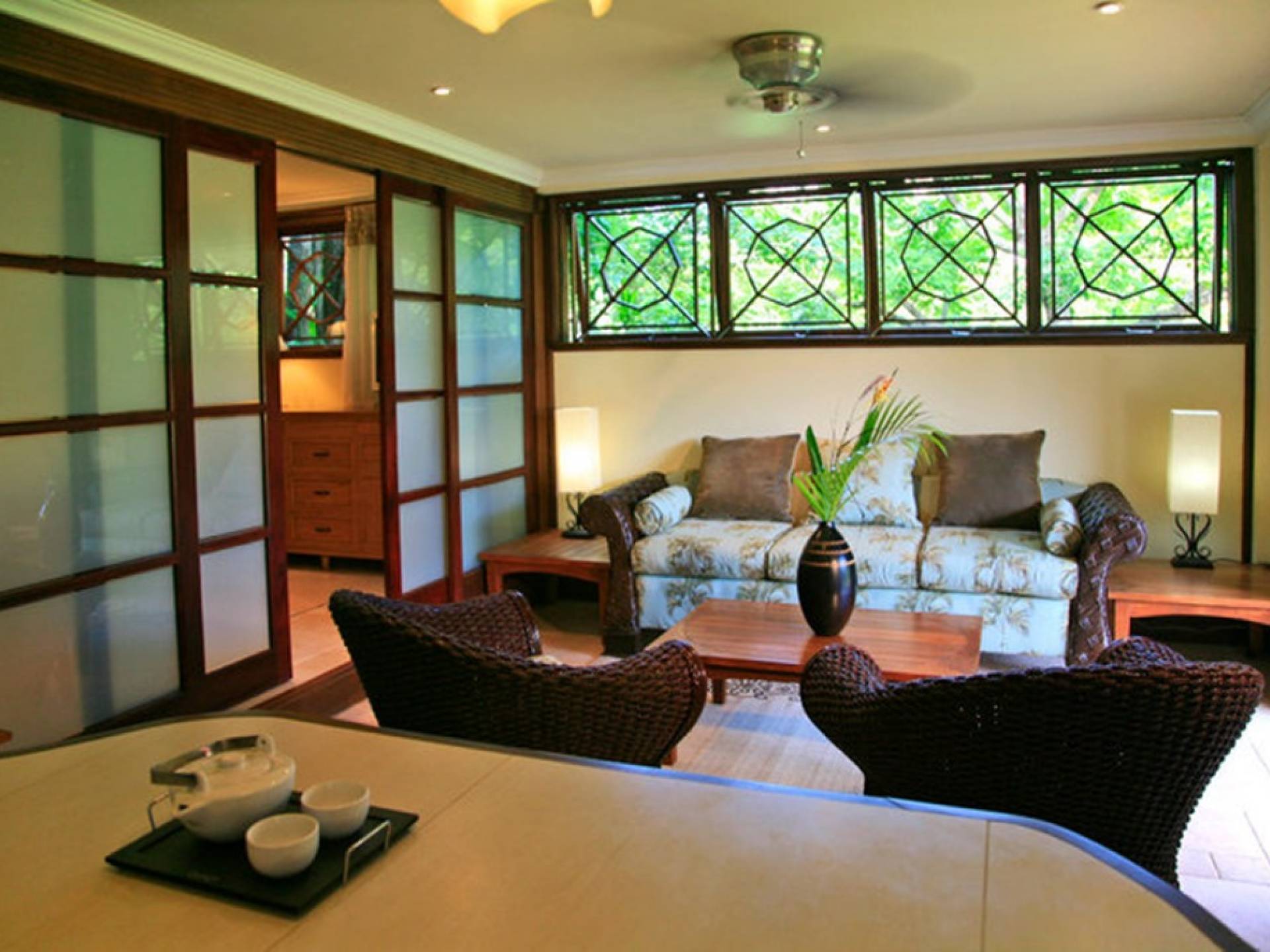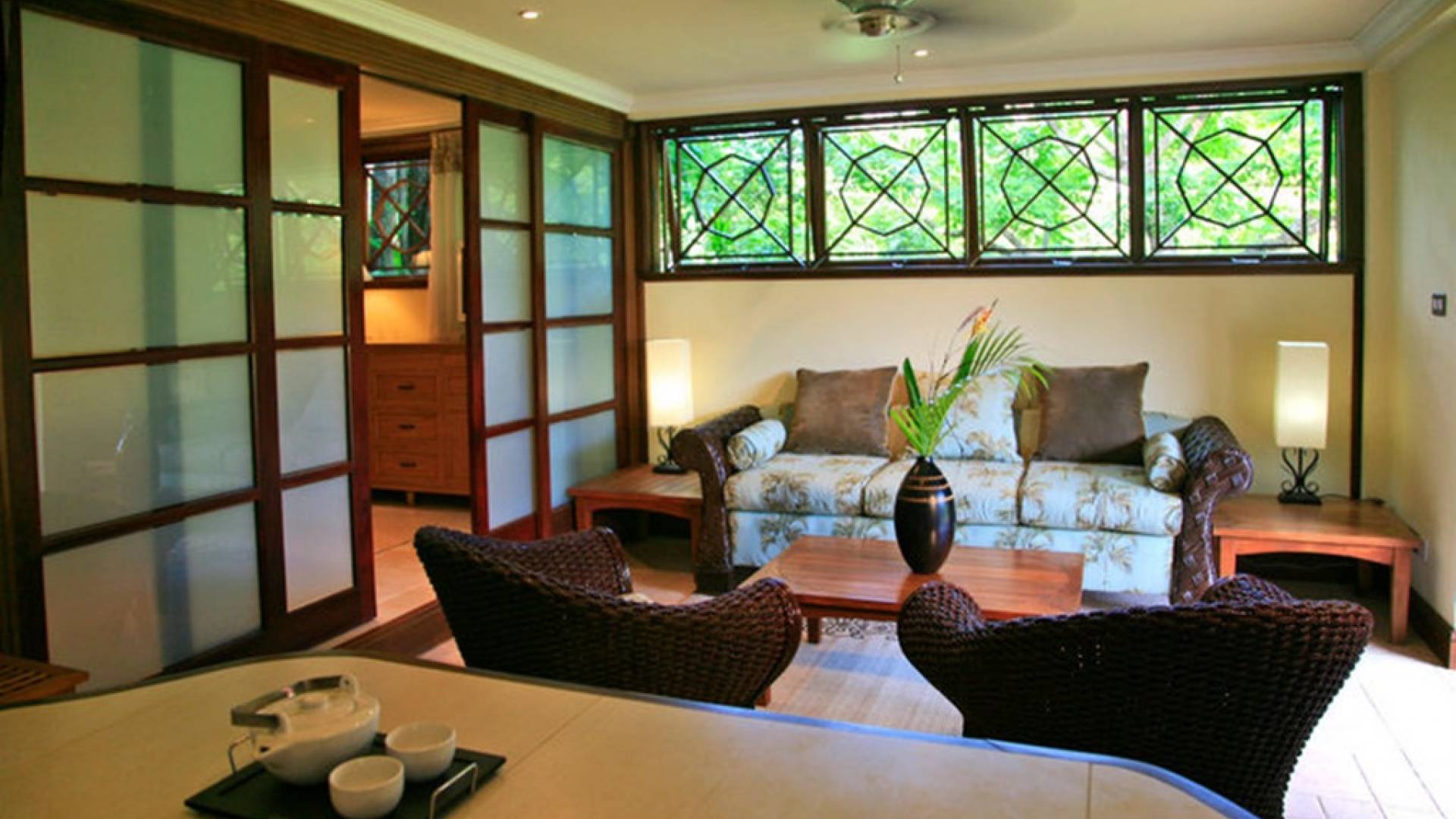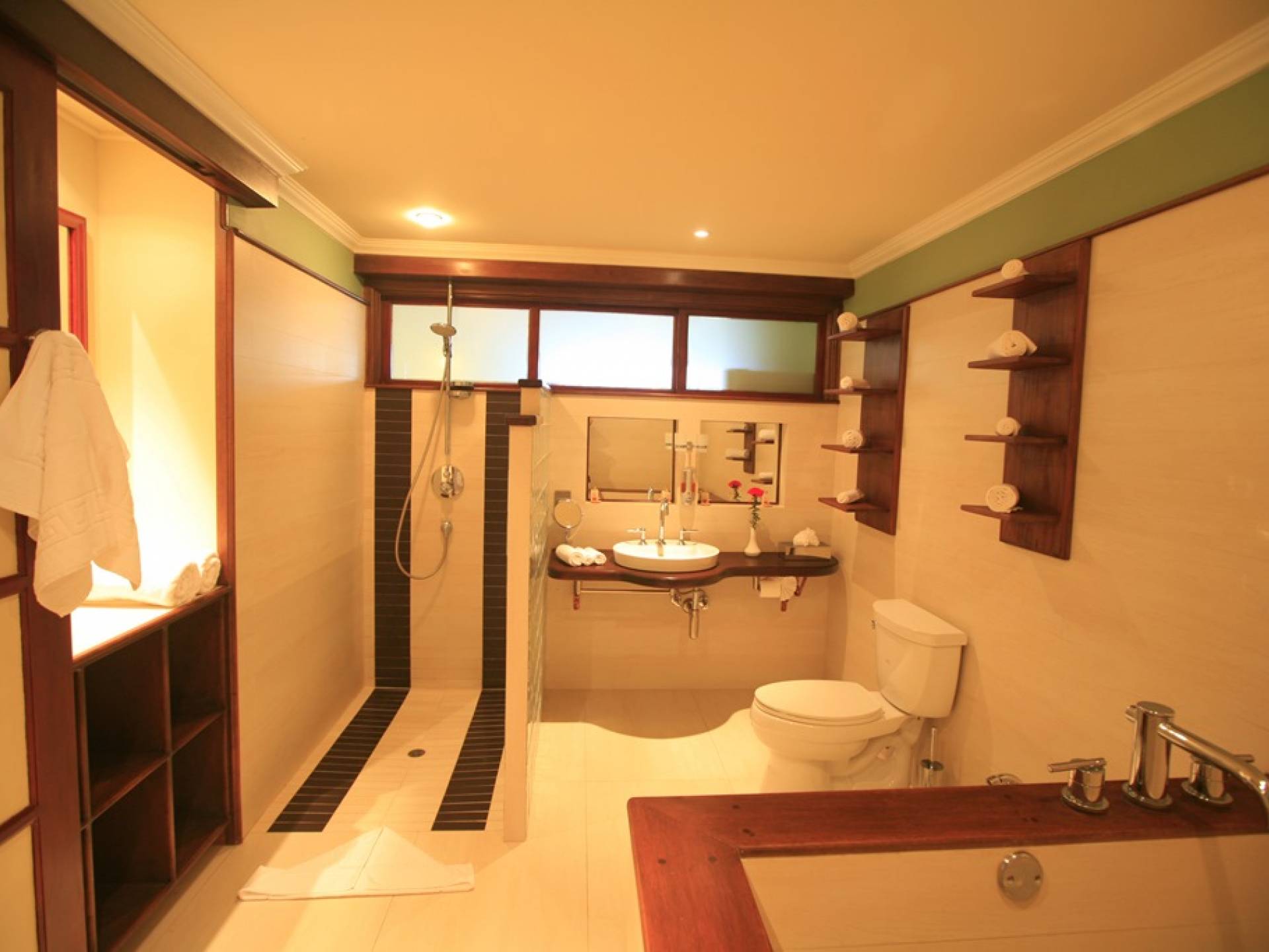 Beautifully appointed, set at pool level under the Flamboyant Villa’s bedroom wing and surrounded by flowering shrubs and fruits, this spacious one-bedroom apartment leads into “C’est la Vie’s” tropical garden. The verandah is comfortably furnished for relaxing during the day and perhaps dining in the evening. The Master bedroom is reached through double sliding doors and leads into the large ensuite bathroom where the handmade soaking tub immediately catches the eye.
