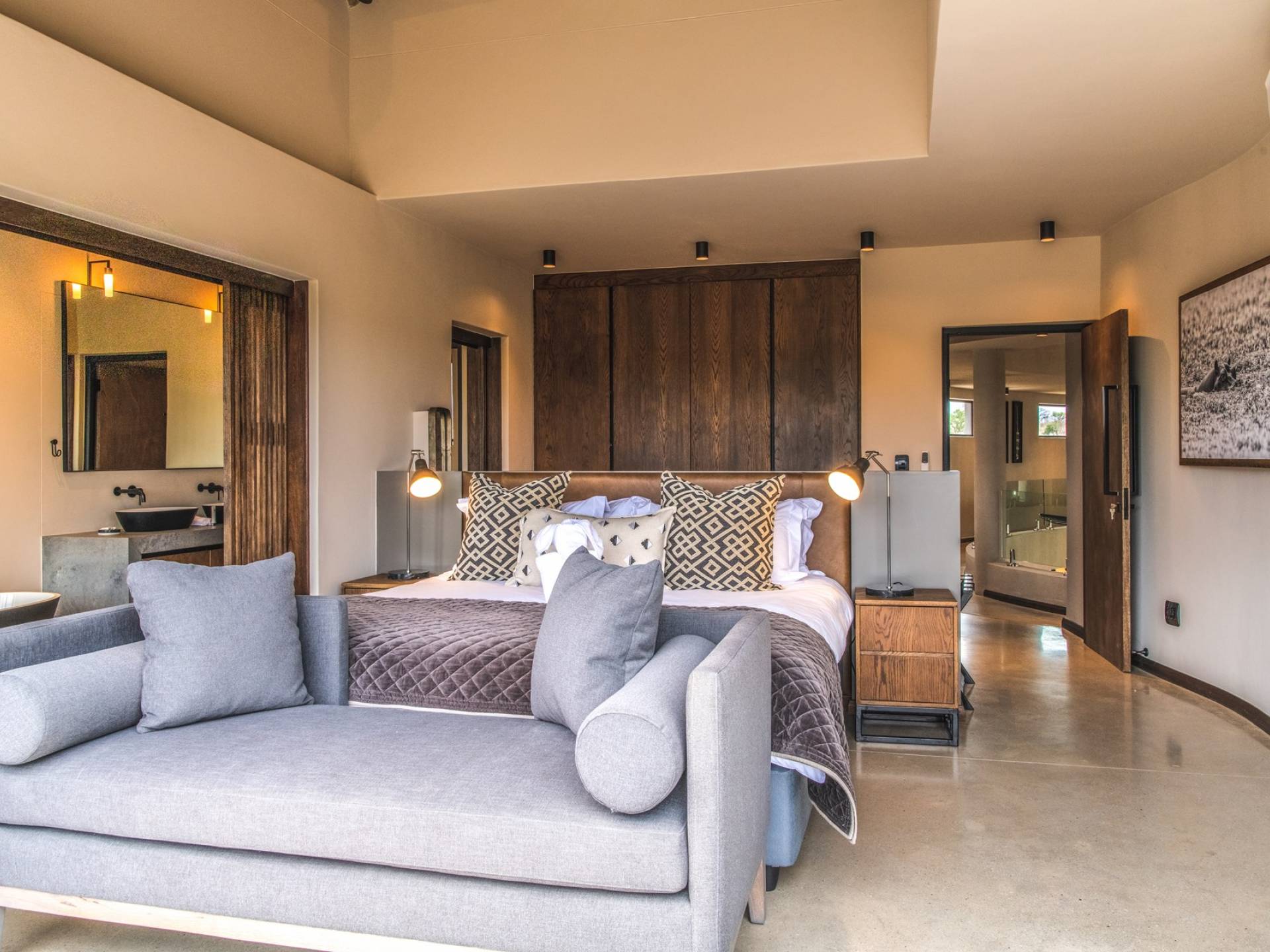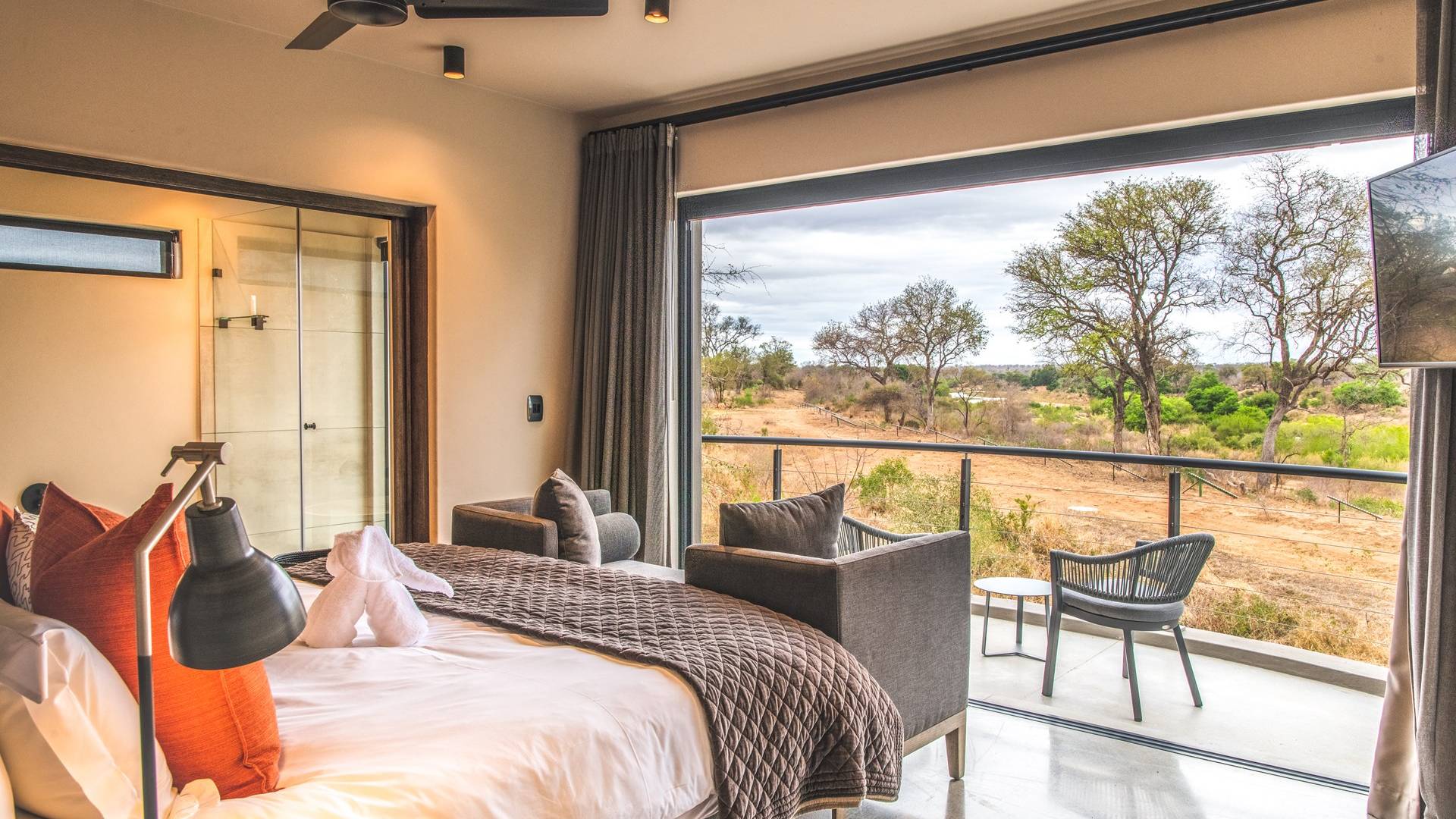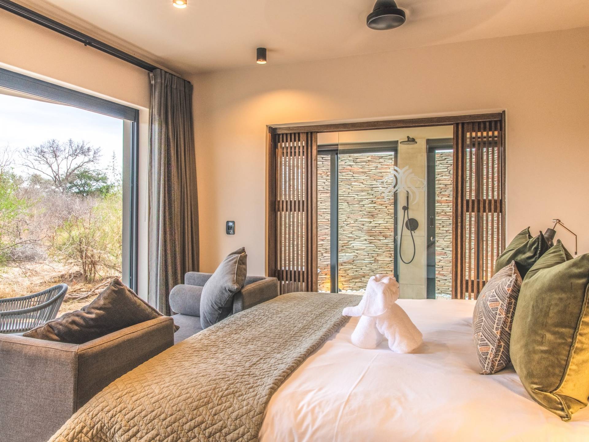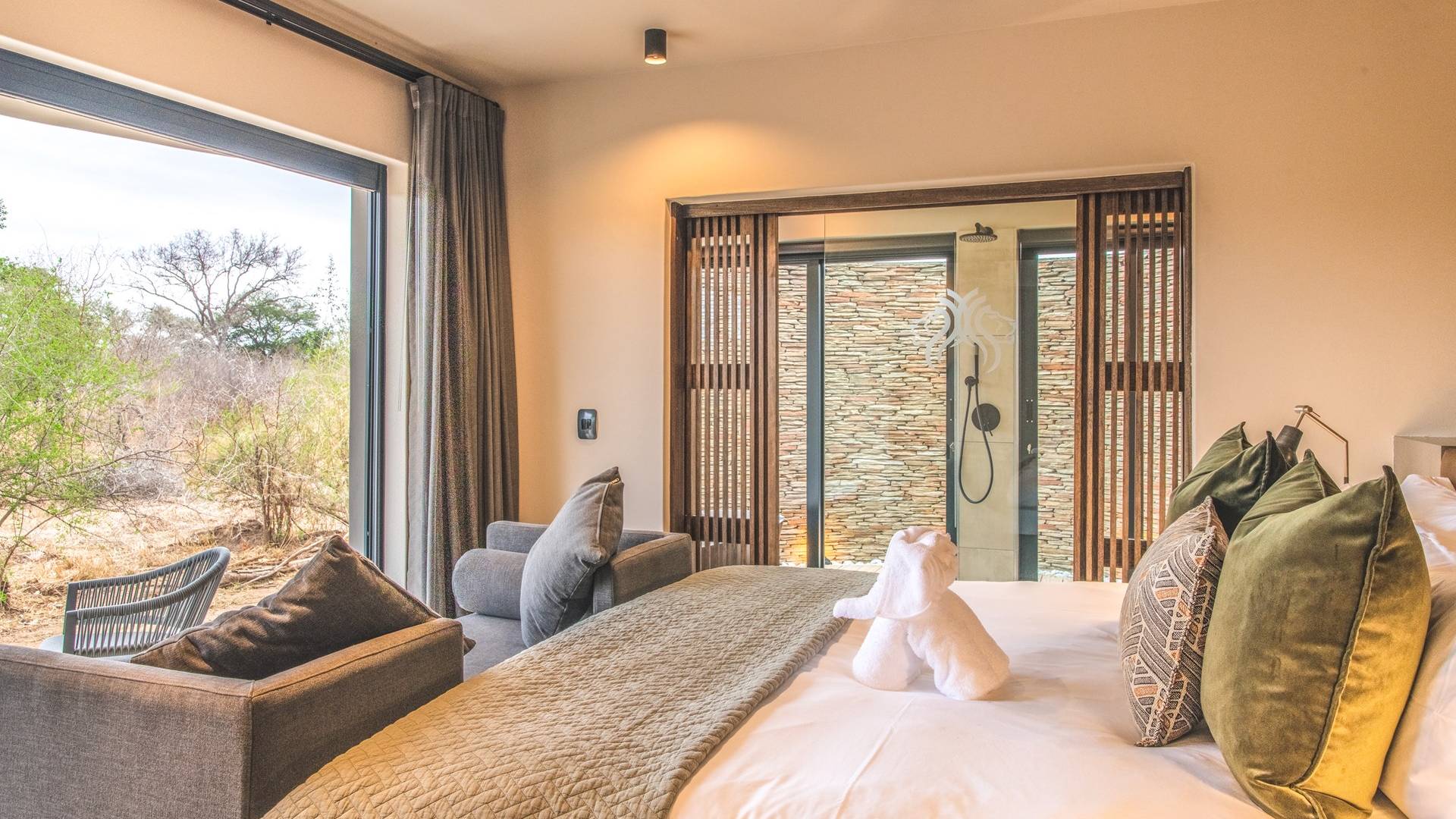 The estate is conveniently located only 6km from the Paul Kruger Gate, 26km from Skukuza Airport, or a 5-hour drive from Johannesburg. Although not in the park itself, the lodges are set alongside the banks of the majestic Sabie River where mighty Elephants can often be seen grazing and drinking – from which the estate takes its name. nWithin close proximity to other comparable exclusive world-famous game reserves, Elephant Point can be said to be in a league of its own. With every comfort possible, game viewing from your lodge, nature walks within the estate, various dining options available, a mobile spa on call, and intuitive service – you’ll never need to leave your luxurious private lodge.
