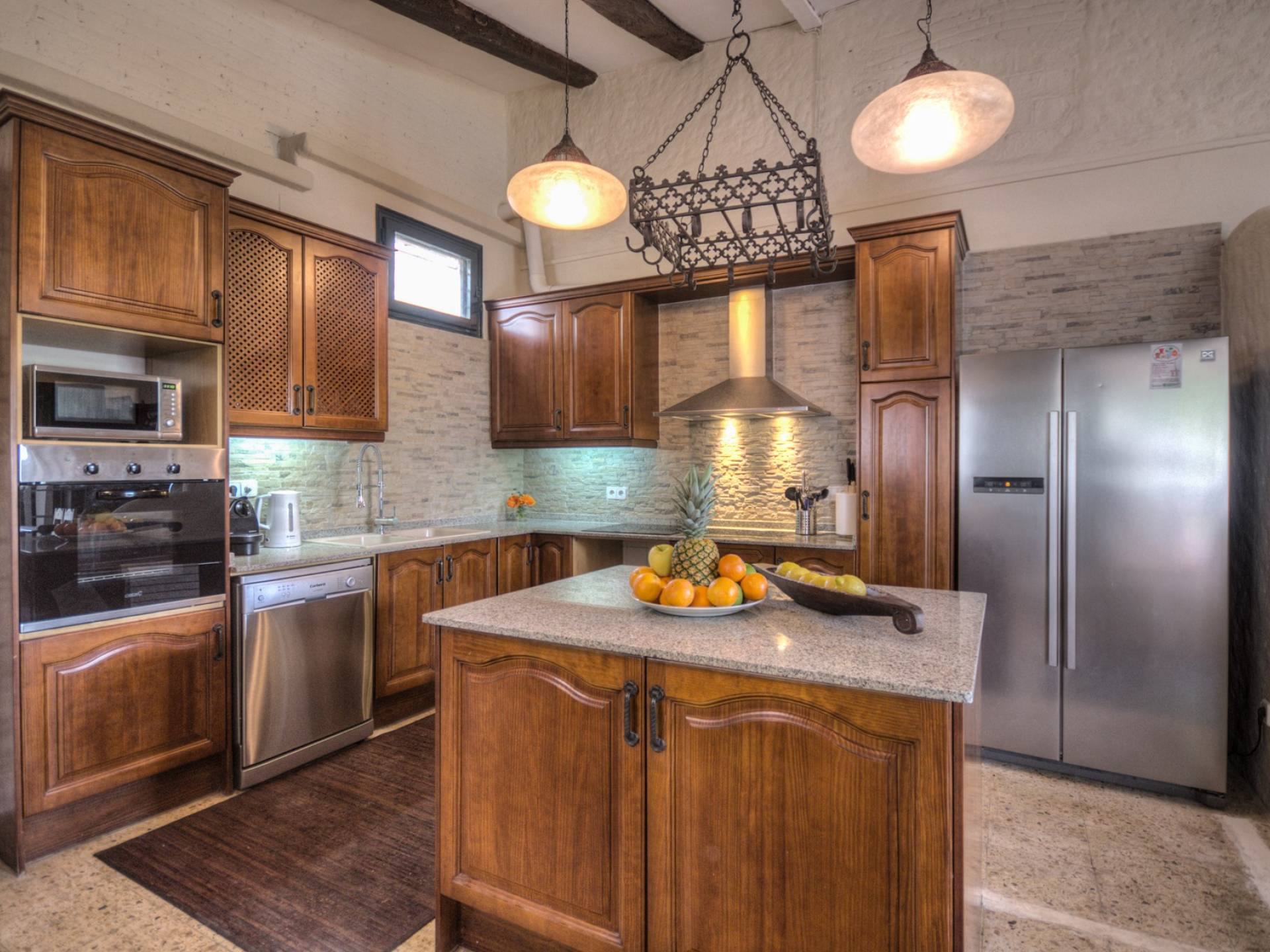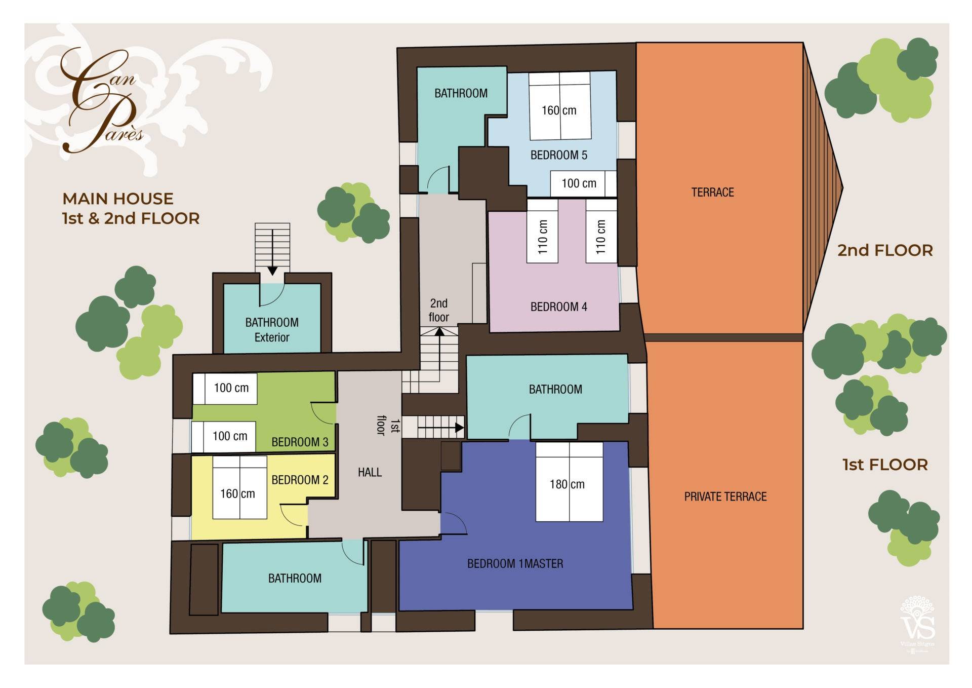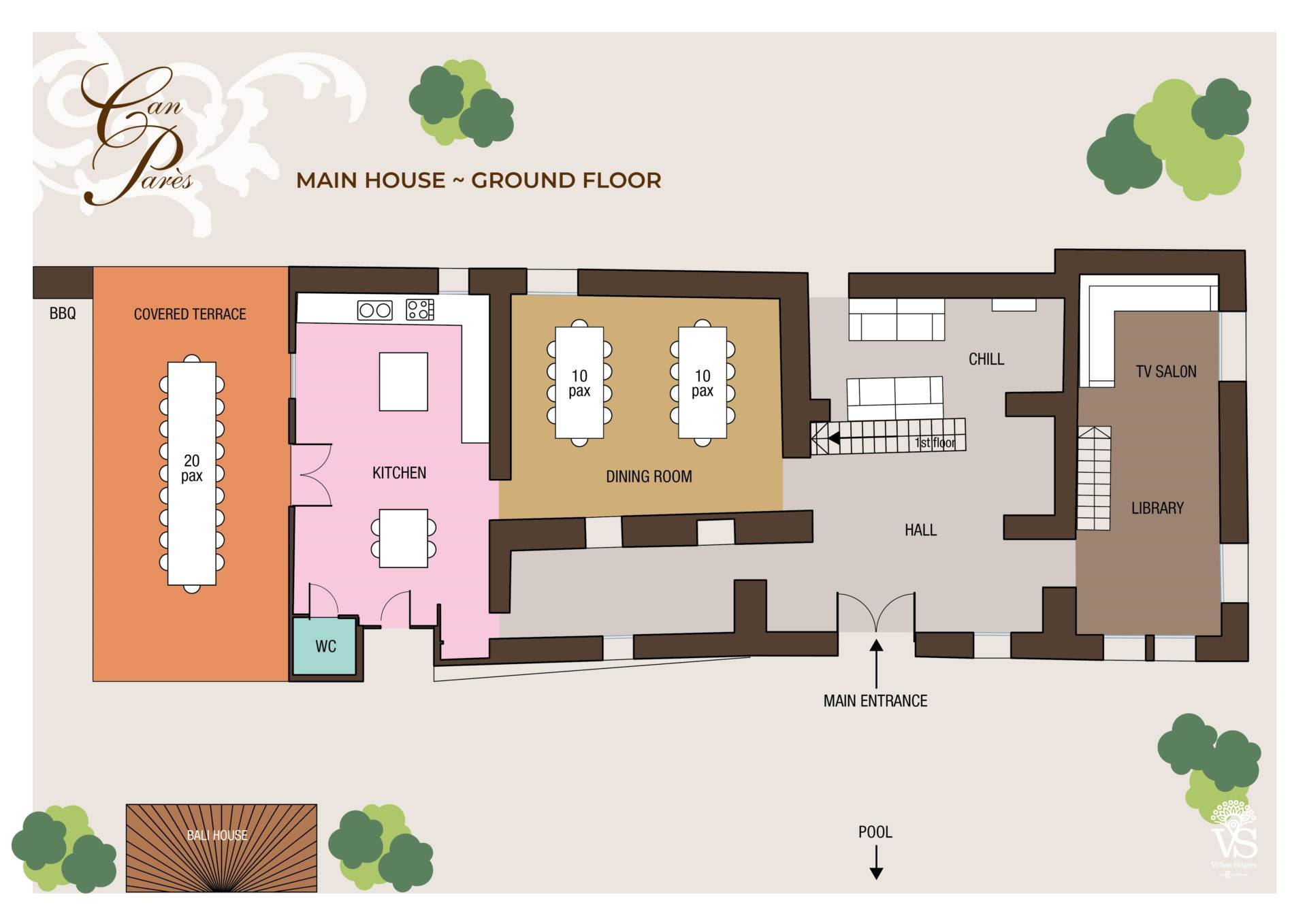 Masia Can Pares is divided into three buildings. The main villa dates back to the 16th century and features a cavernous entrance hall, with two enormous stone arches and a cozy lounge with an open fire. On the right of the entrance hall is the well-stocked library, split over two levels. On the left is the delightful dining room with seating for up to 24 guests. The ground floor includes an office, with a phone for local calls, iPod Dock, and a spacious lounge area with a plasma TV, DVD player, and a DVD library for adults and kids.