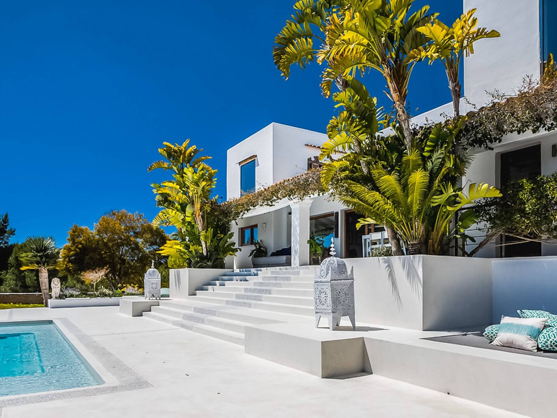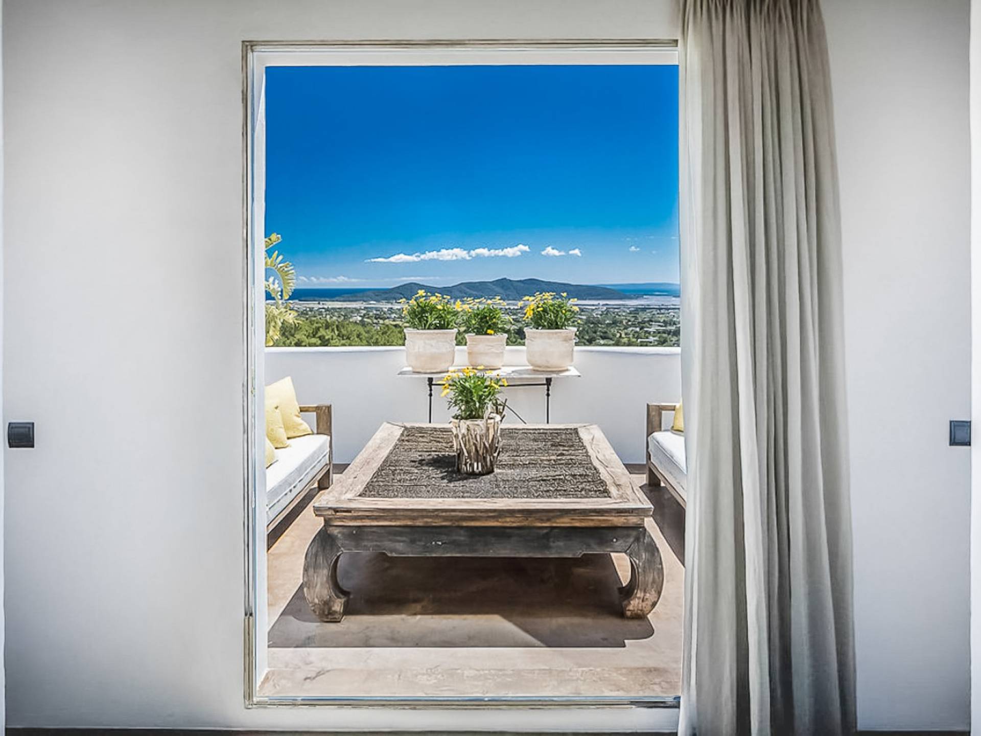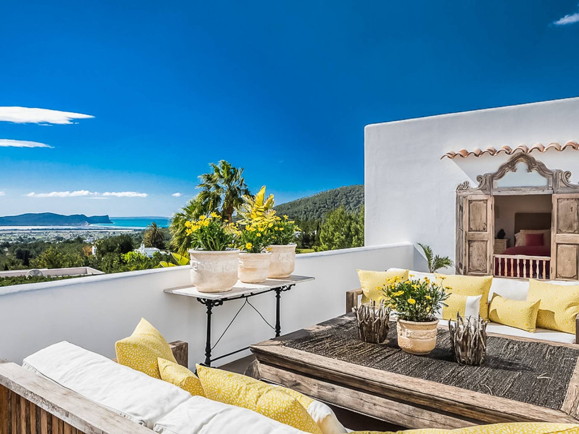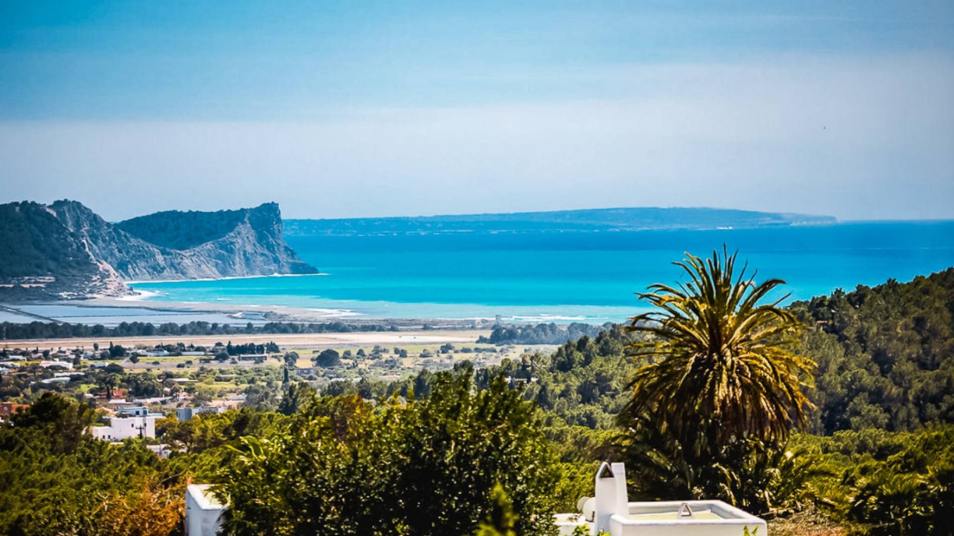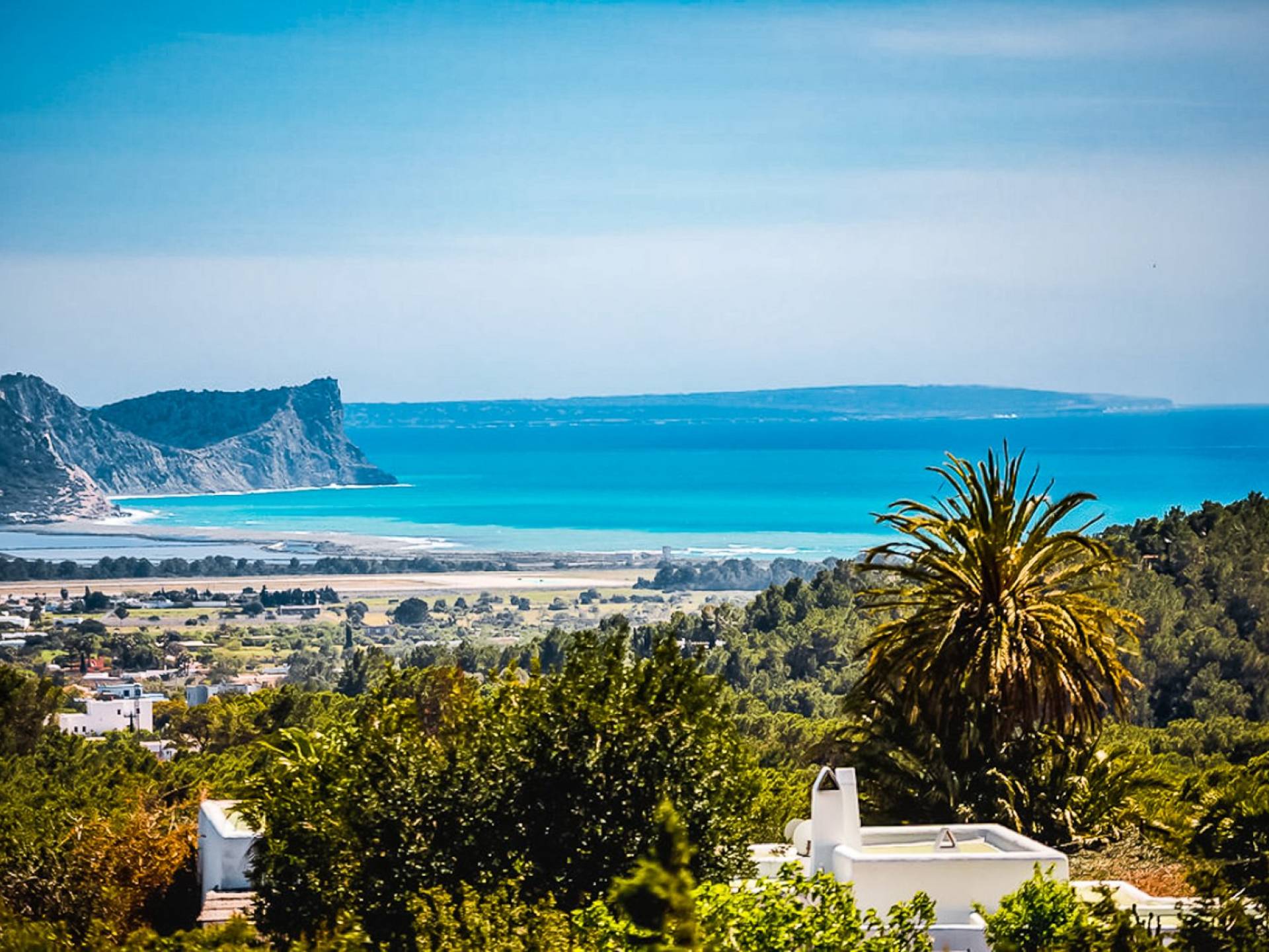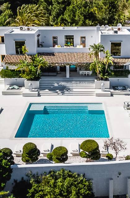 El Zafiro Villa Ibiza is located on a hill only 4 km away from Ibiza town and 5 minutes from the airport. The property is orientated south and has spectacular panoramic sea views overlooking Playa den Bossa, Salinas, Cap des Falco, and Formentera. The property sits on 8,000 m2 of land and the villa has 450 m2 plus a guesthouse of 120 m2.