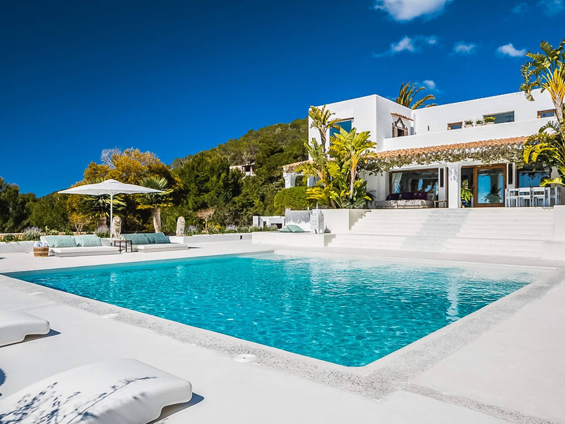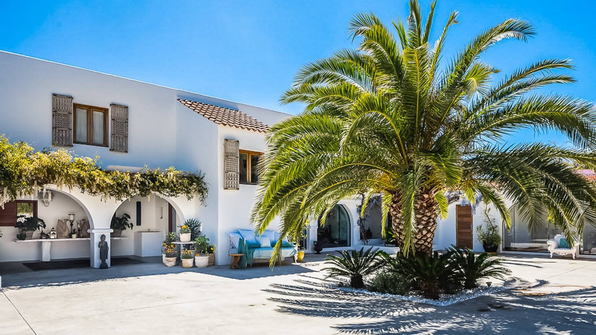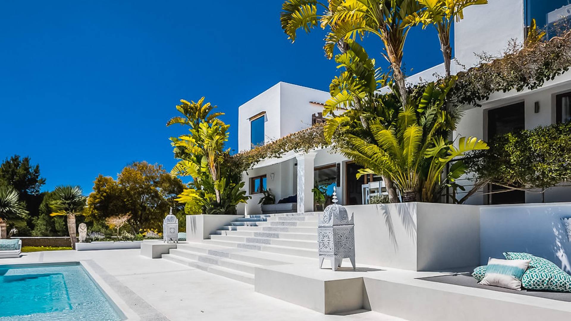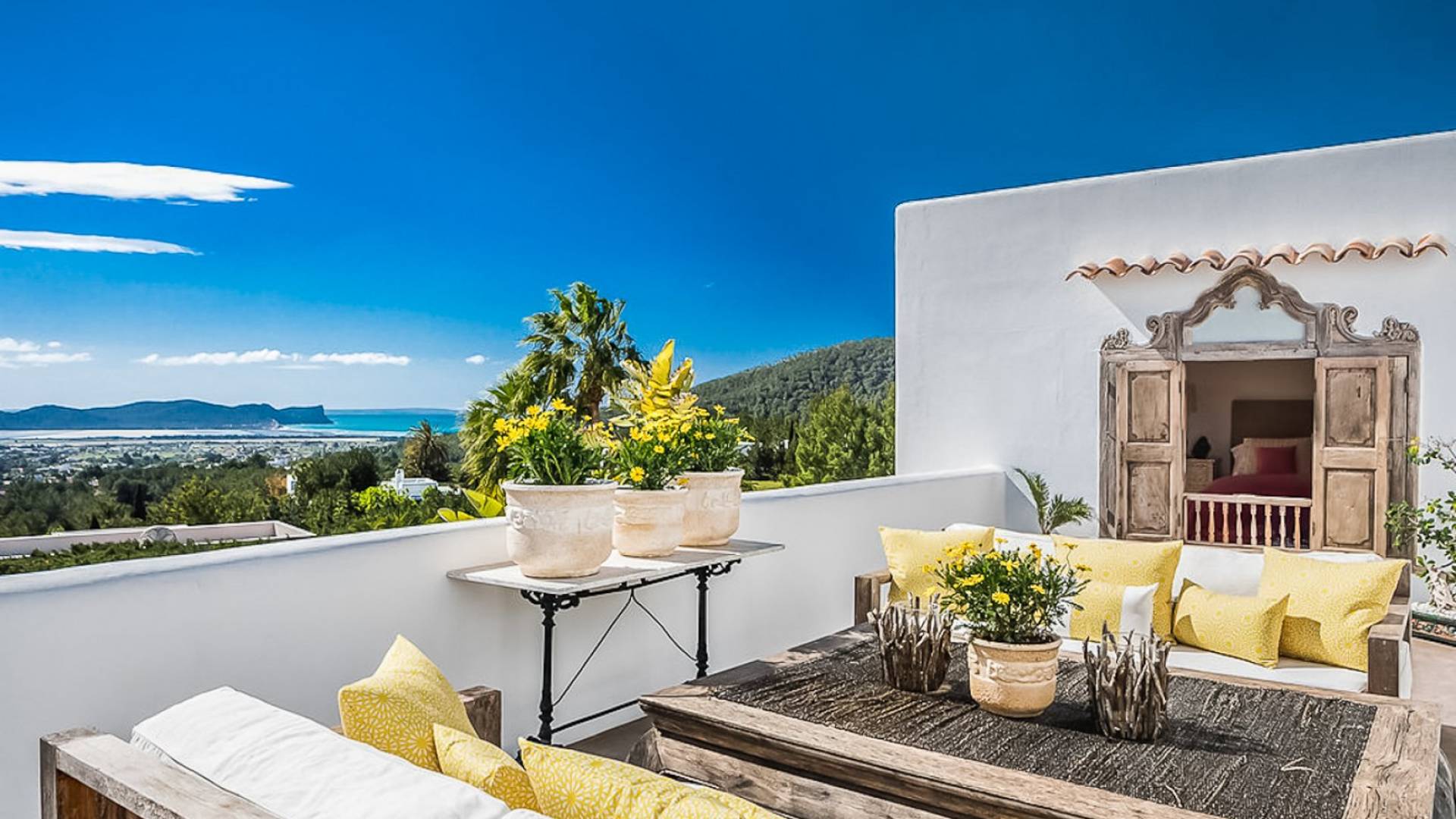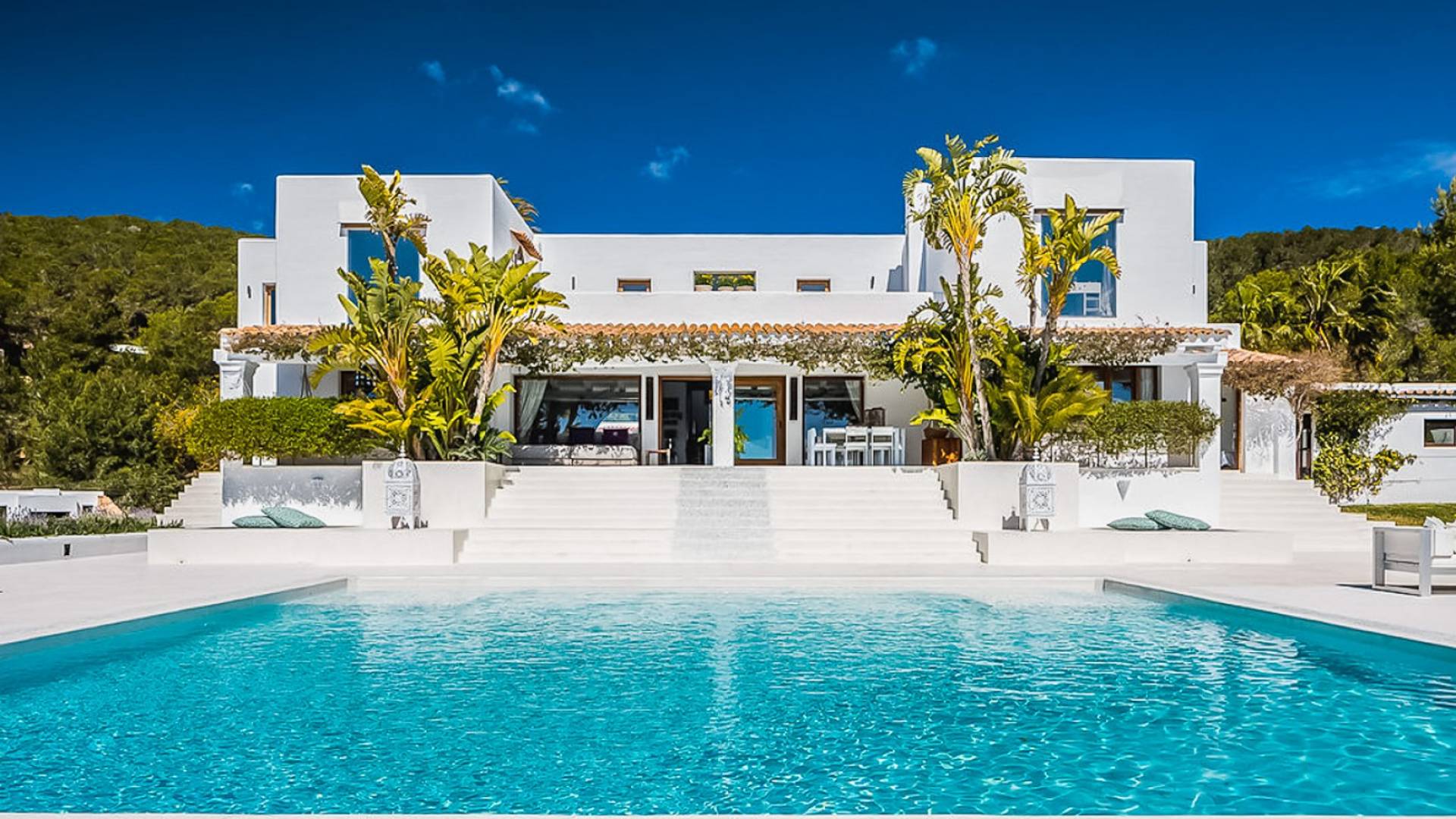 El Zafiro Villa Ibiza is located on a hill only 4 km away from Ibiza town and 5 minutes from the airport. The property is orientated south and has spectacular panoramic sea views overlooking Playa den Bossa, Salinas, Cap des Falco, and Formentera. The property sits on 8,000 m2 of land and the villa has 450 m2 plus a guesthouse of 120 m2.