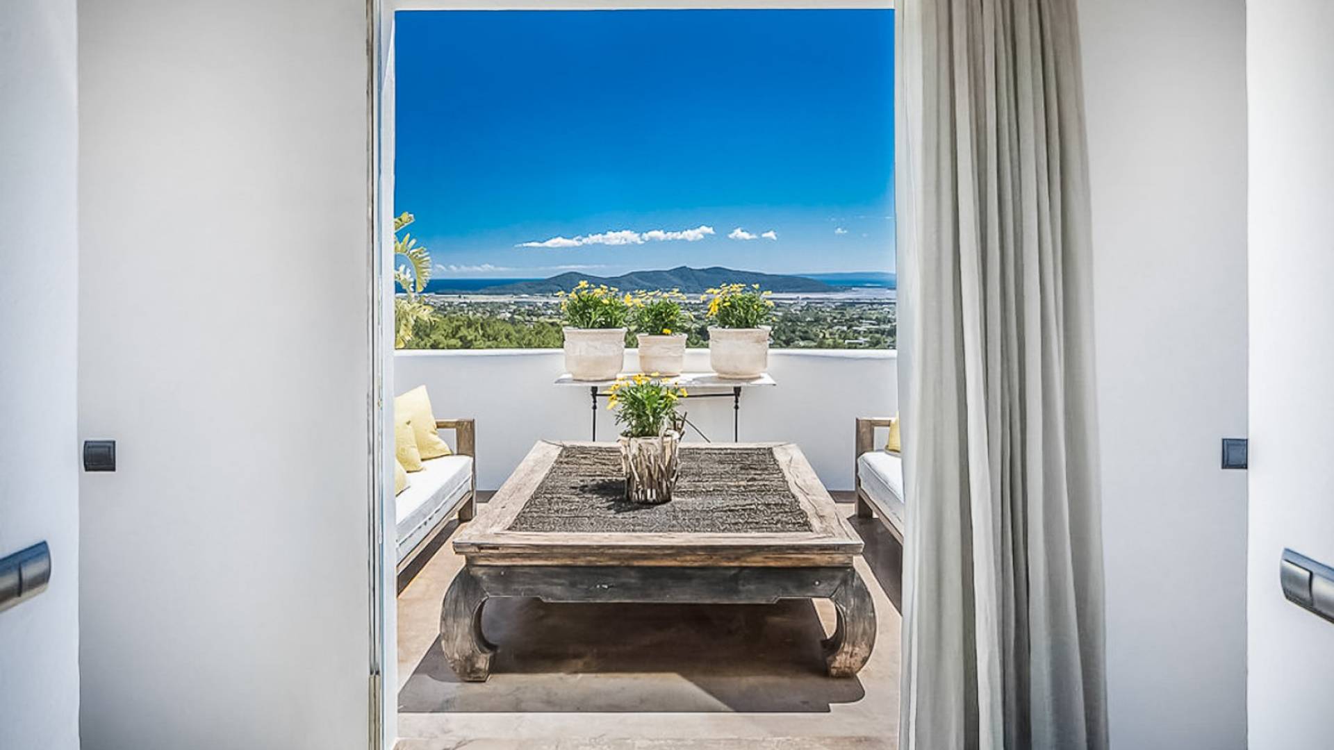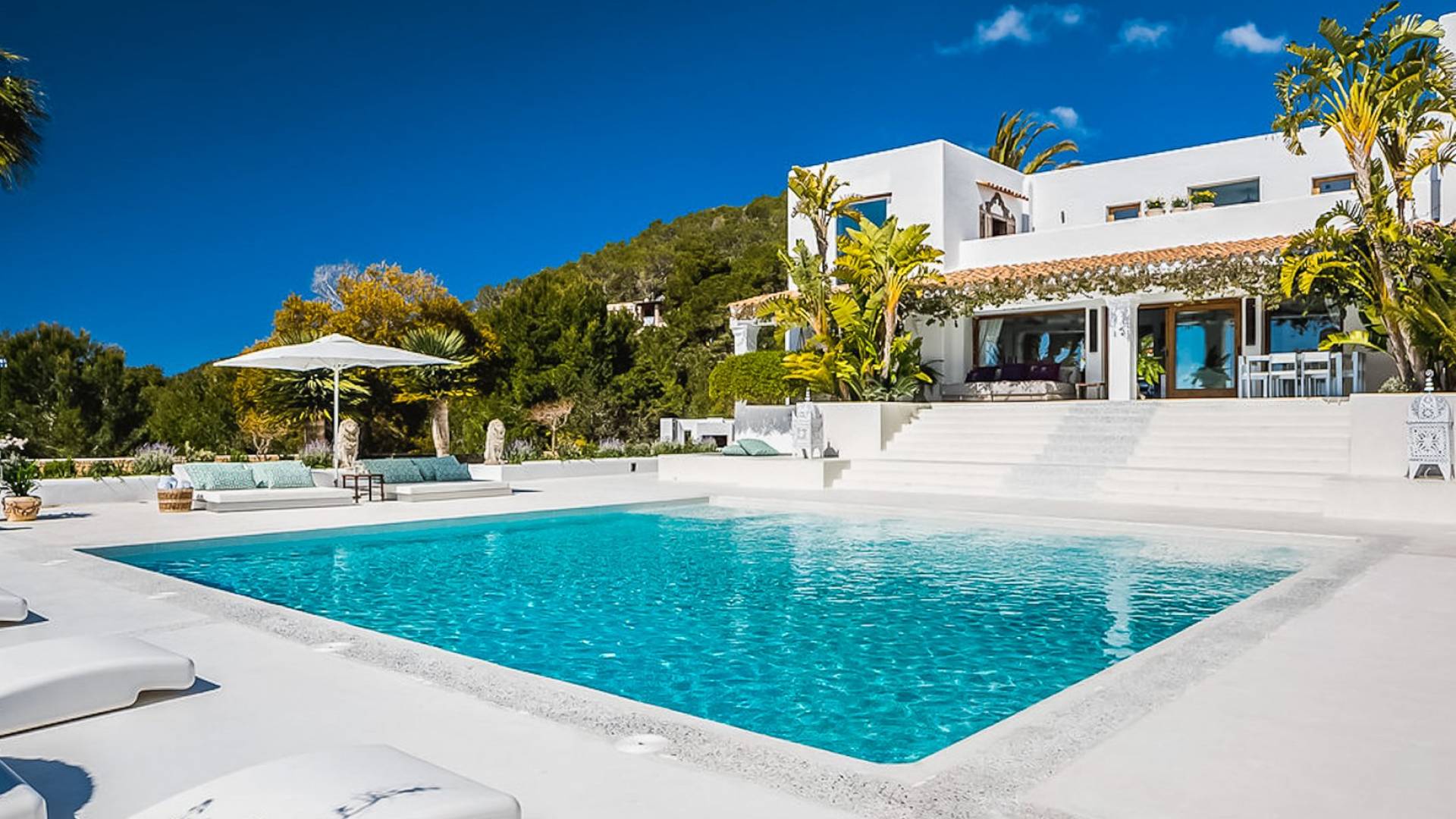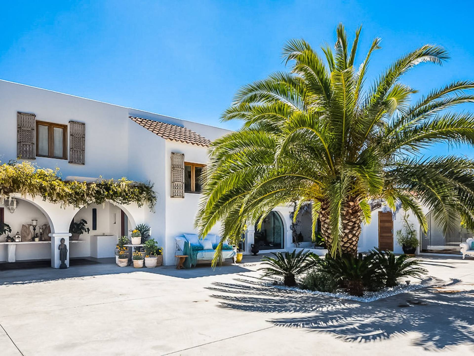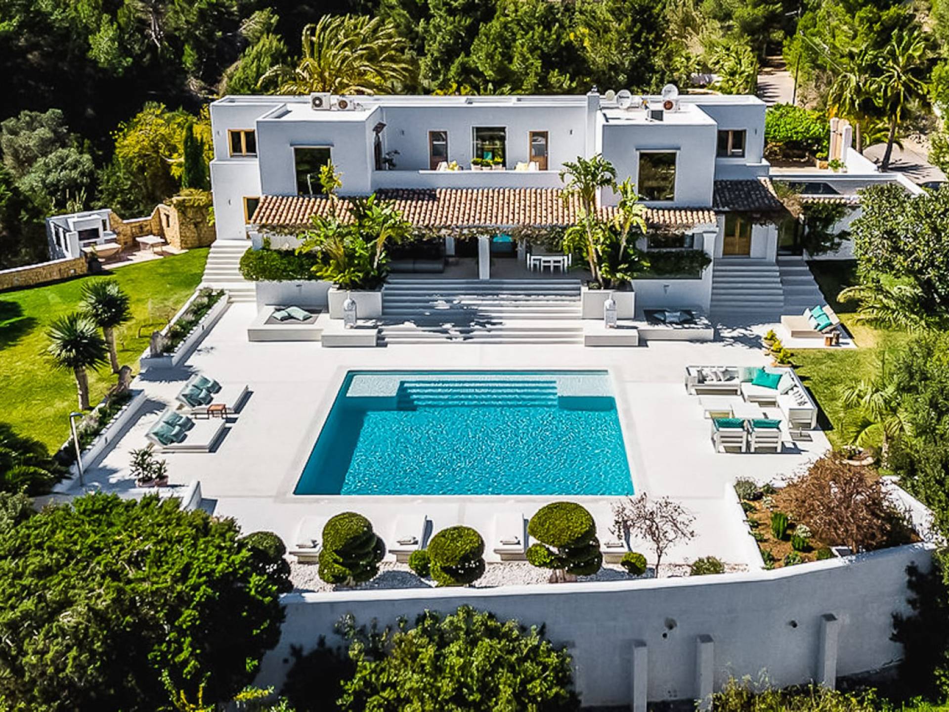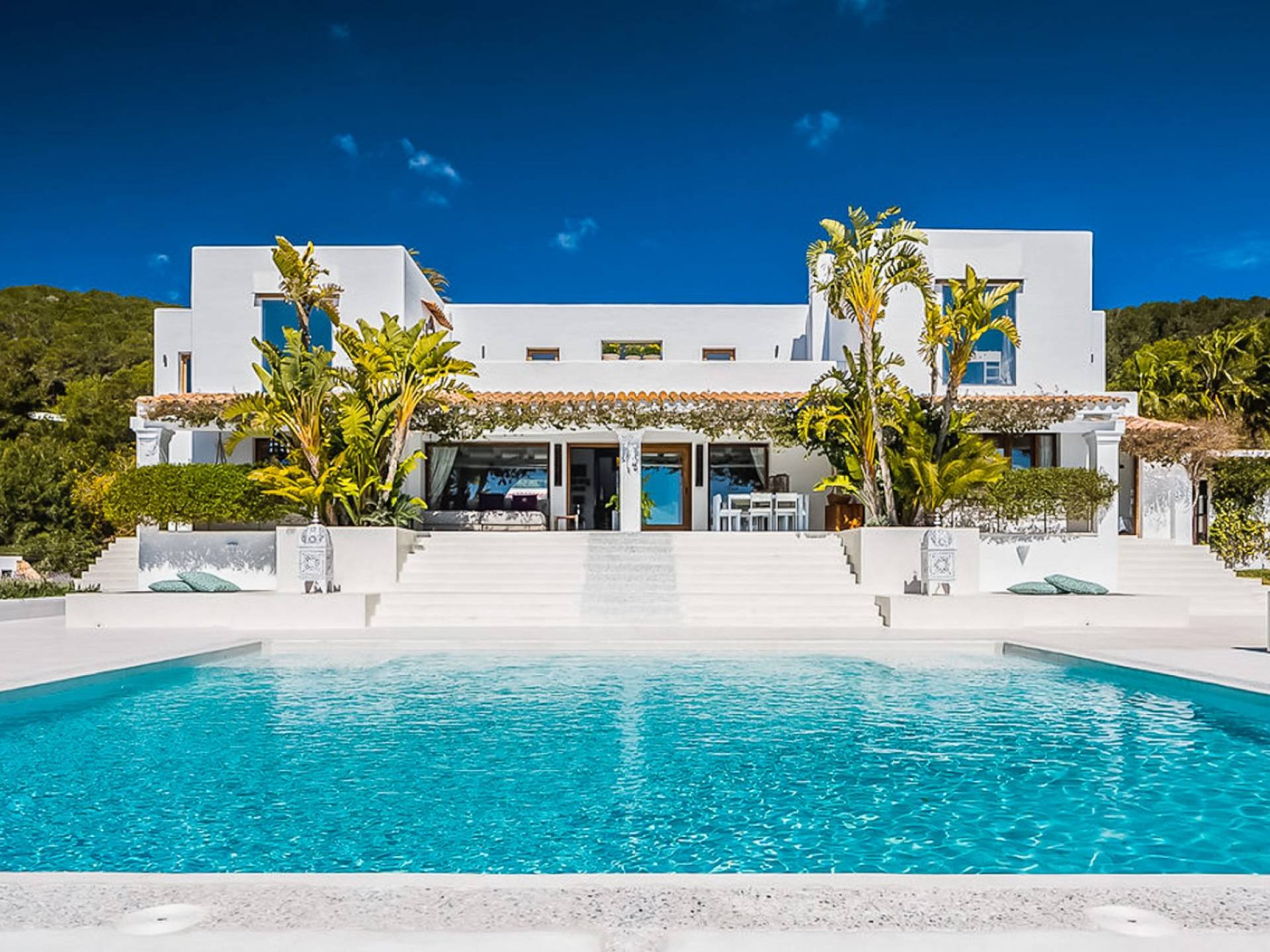El Zafiro Villa Ibiza is located on a hill only 4 km away from Ibiza town and 5 minutes from the airport. The property is orientated south and has spectacular panoramic sea views overlooking Playa den Bossa, Salinas, Cap des Falco, and Formentera. The property sits on 8,000 m2 of land and the villa has 450 m2 plus a guesthouse of 120 m2.