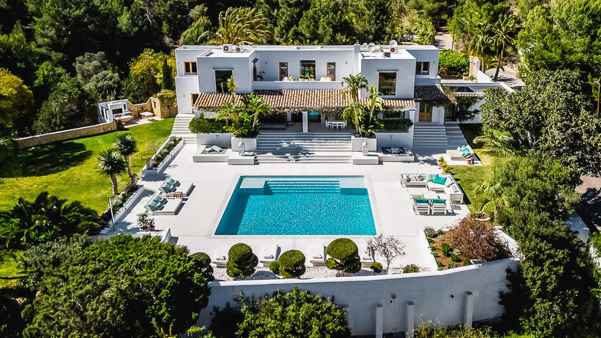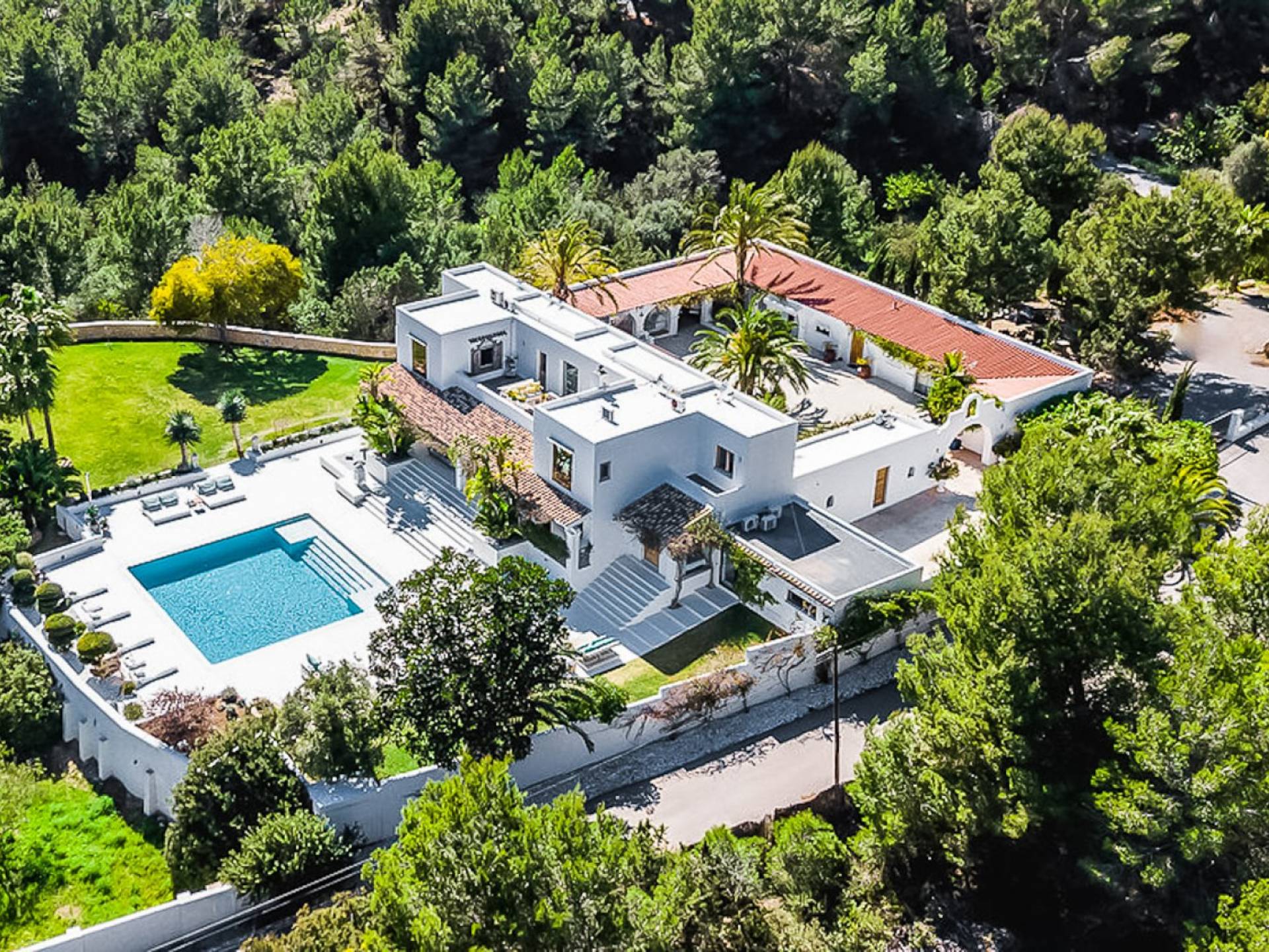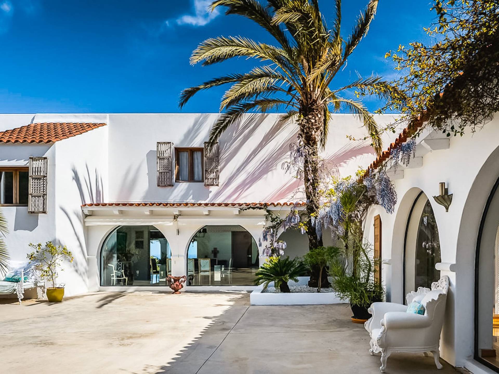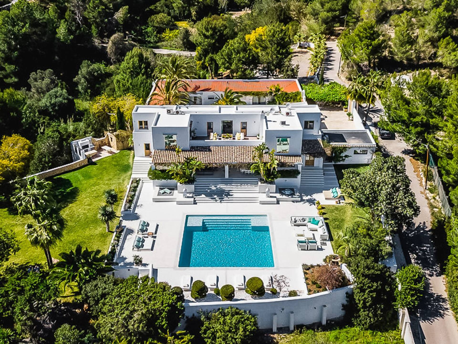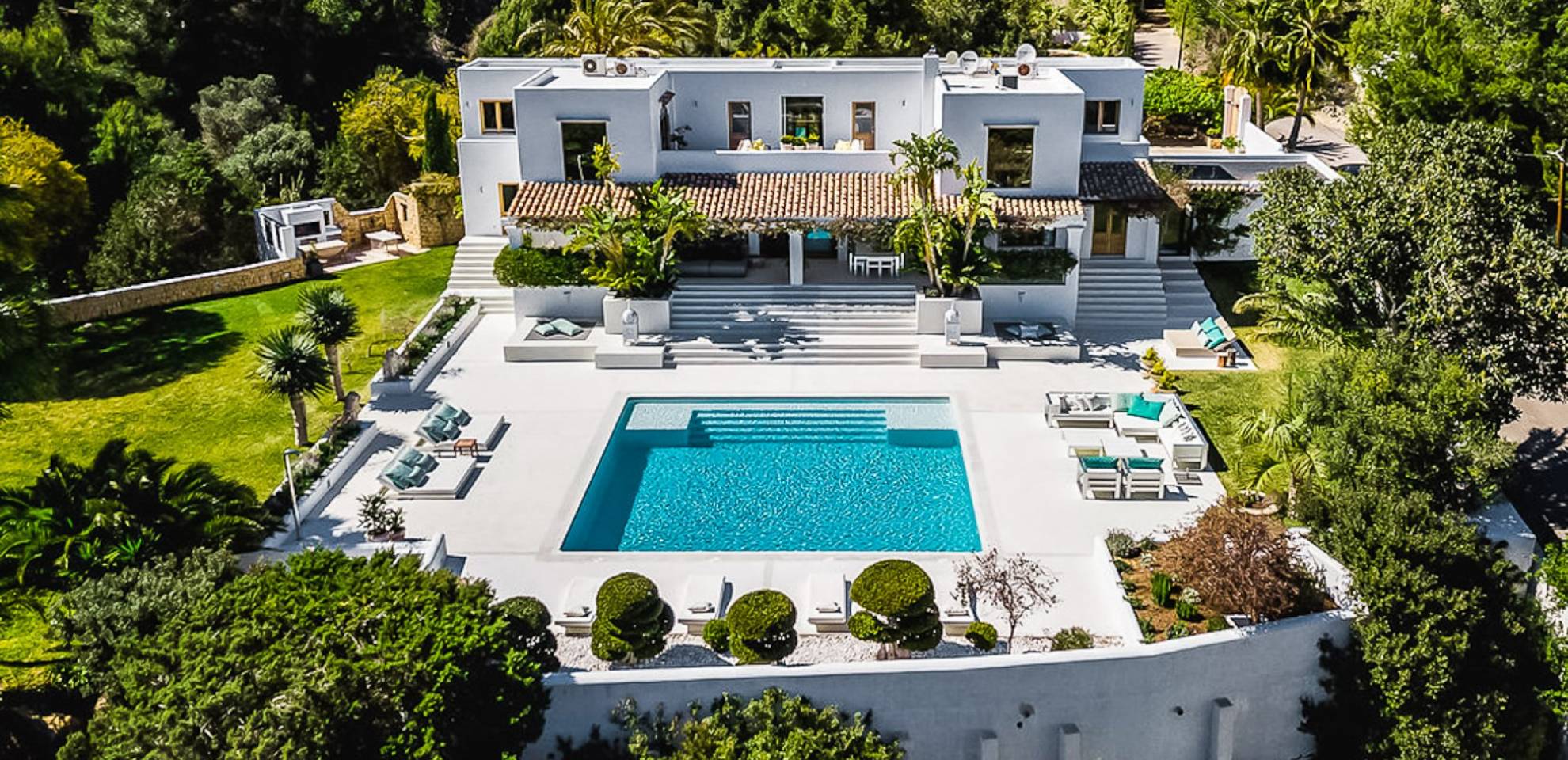 El Zafiro Villa Ibiza is located on a hill only 4 km away from Ibiza town and 5 minutes from the airport. The property is orientated south and has spectacular panoramic sea views overlooking Playa den Bossa, Salinas, Cap des Falco, and Formentera. The property sits on 8,000 m2 of land and the villa has 450 m2 plus a guesthouse of 120 m2.