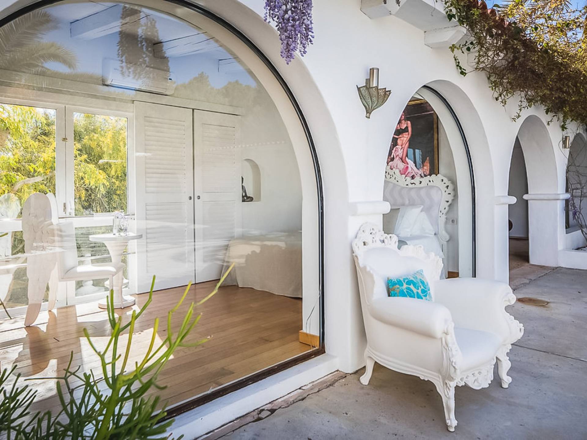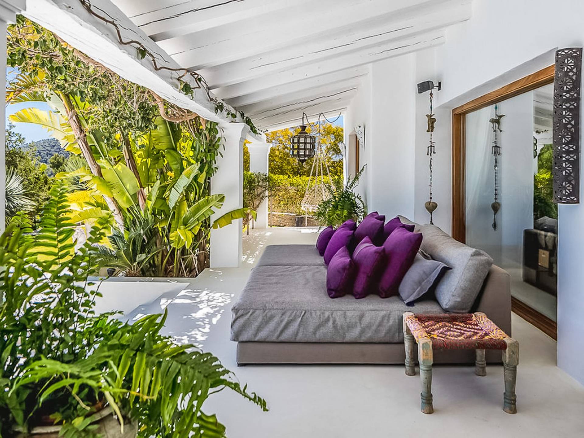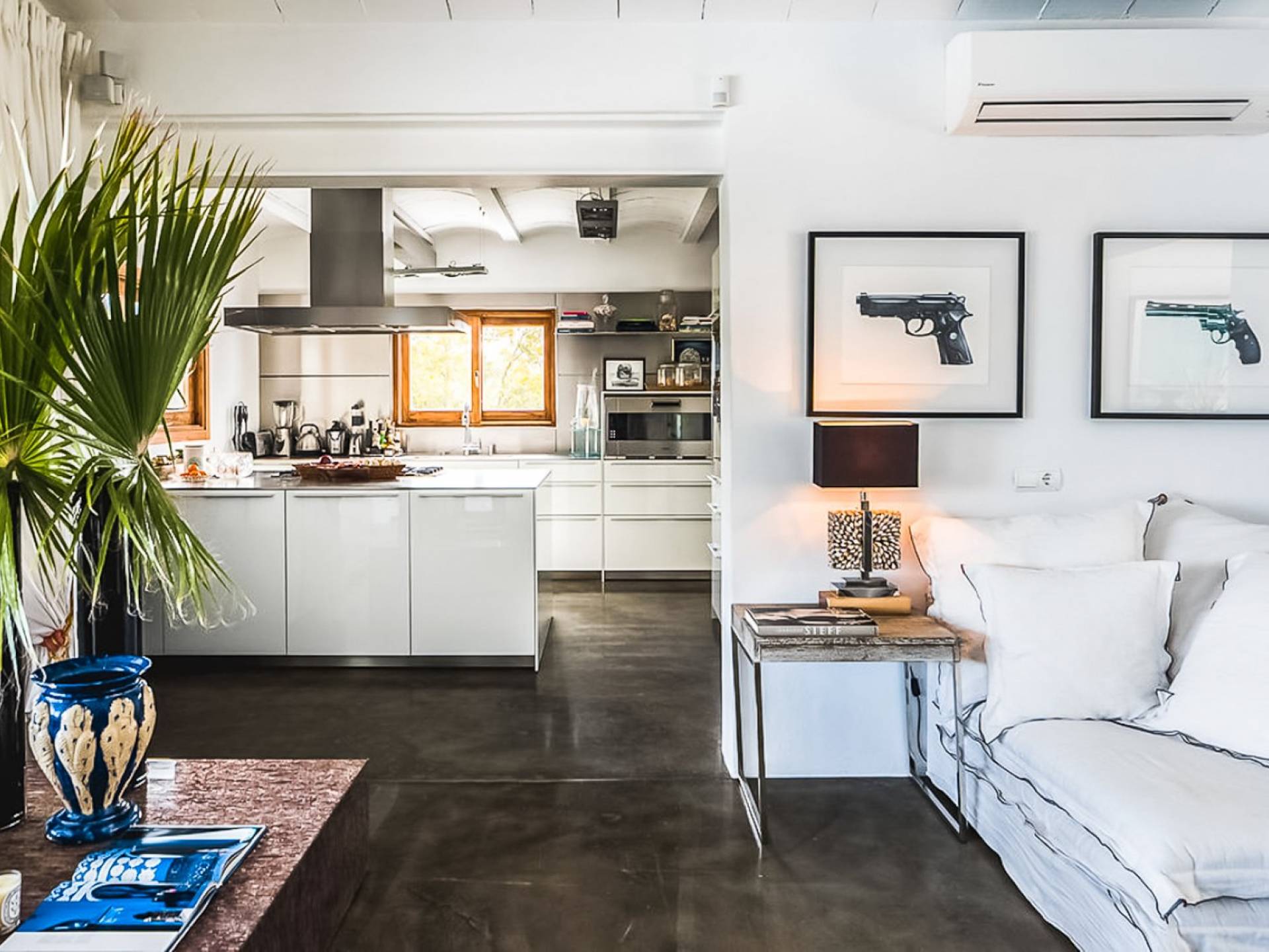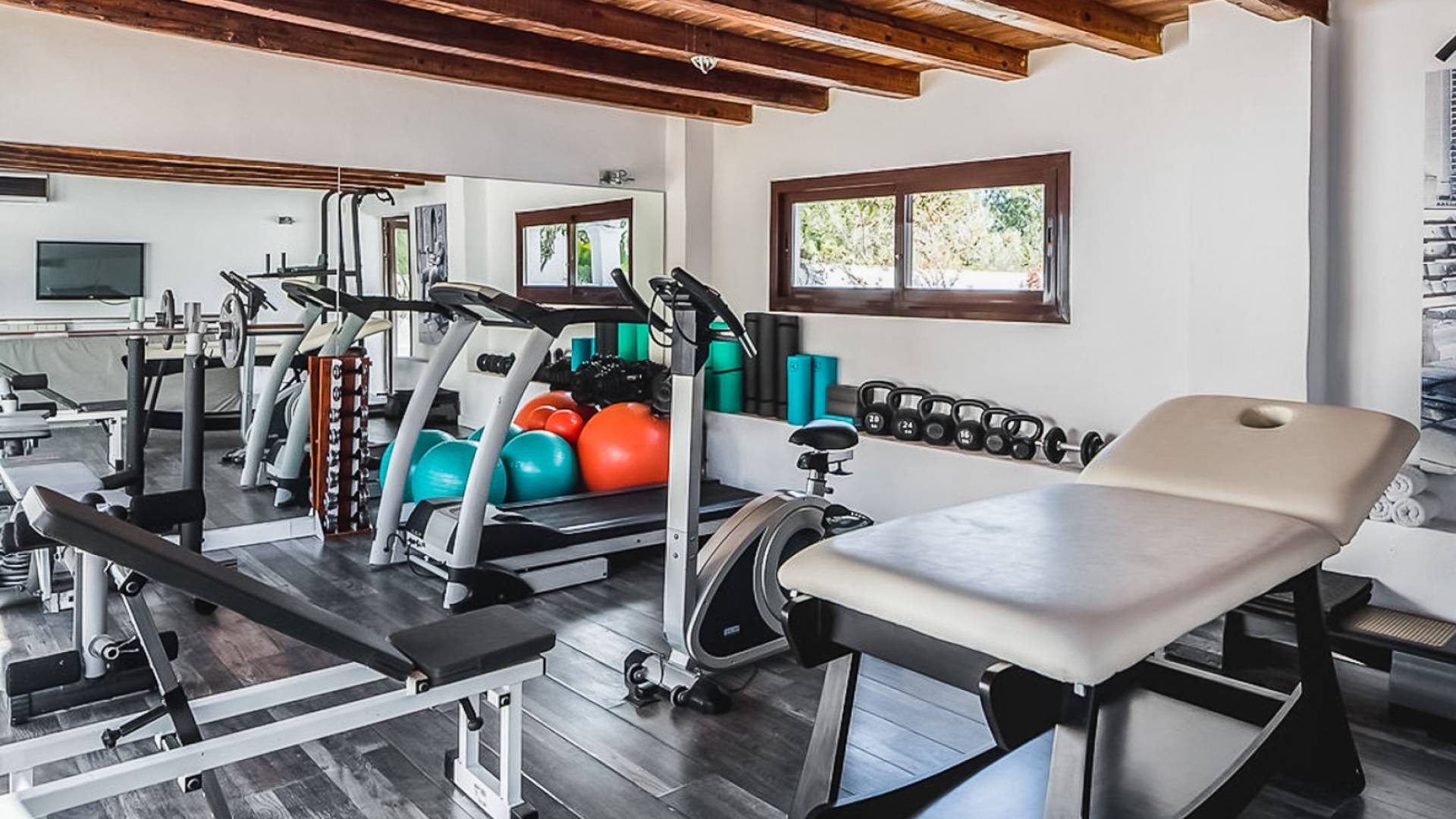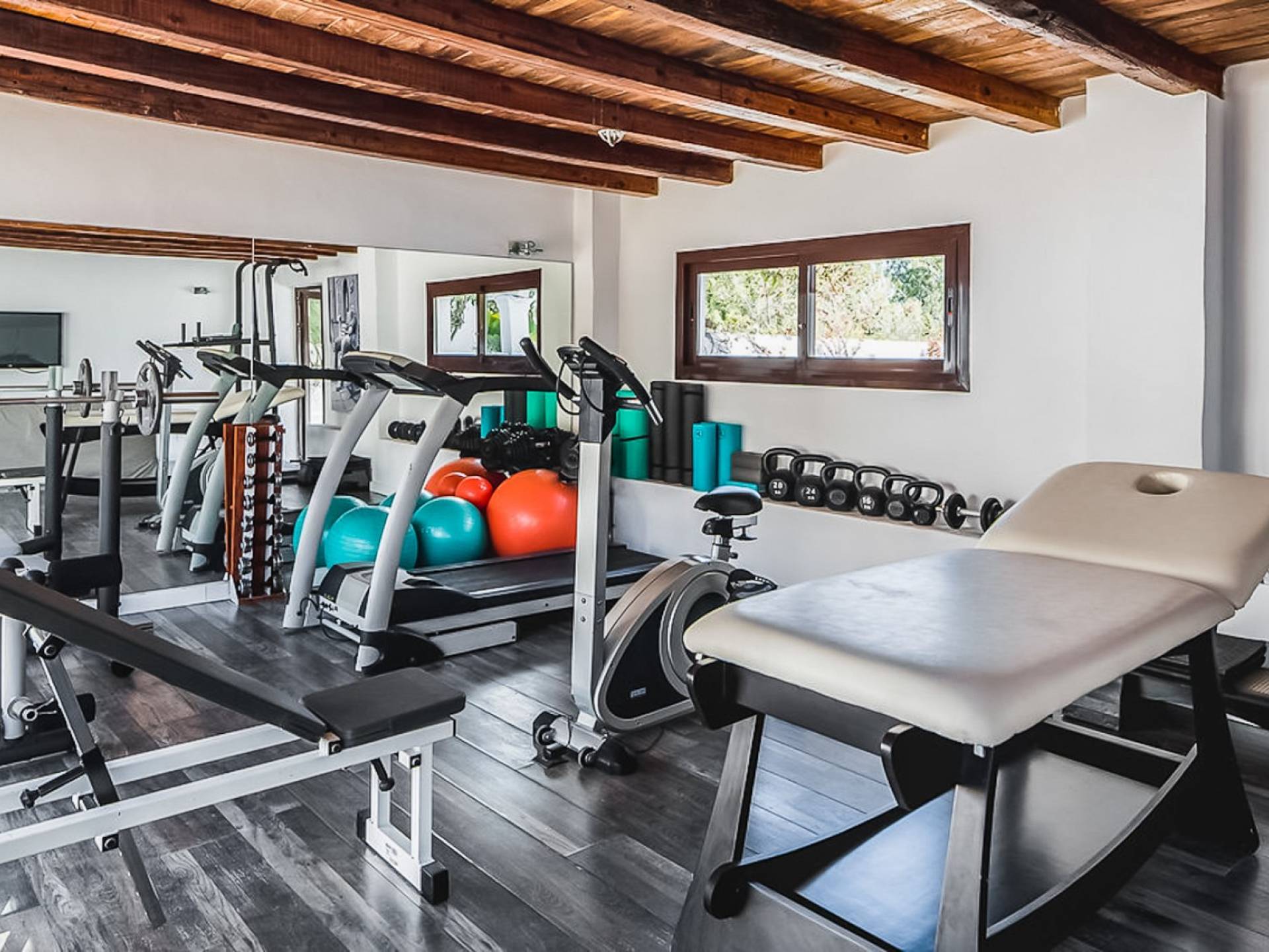 Inside El Zafiro Villa Ibiza is beautifully furnished and styled with high-quality fixtures and fittings, as well as a private gym. The lounge area has a huge sumptuous sofa, a flat-screen Samsung TV + Bose surround system, blue ray DVD player, Spanish and Dutch satellite TV, there are also 2 Bose speakers on the outdoor terrace. The interior dining table seats 8 people comfortably and there is sufficient porcelain, silverware, and glasses to serve all. The kitchen is modern and fully equipped including a double fronted Liebherr fridge/freezer/wine cooler, a Gaggenau microwave and coffee machine which are built into the kitchen front; a Gaggenau dishwasher, oven, and hob with 5 gas flames and the laundry room has a Siemens washing machine and tumble dryer. The house has access to WiFi and is protected with an interior alarm system, which is connected to an alarm company called Red Seguridad, the staff of the house are also available.