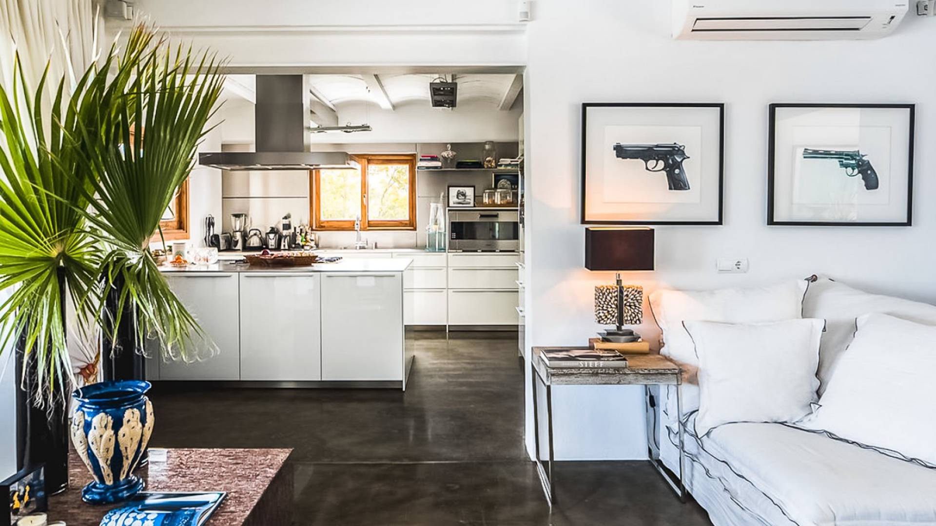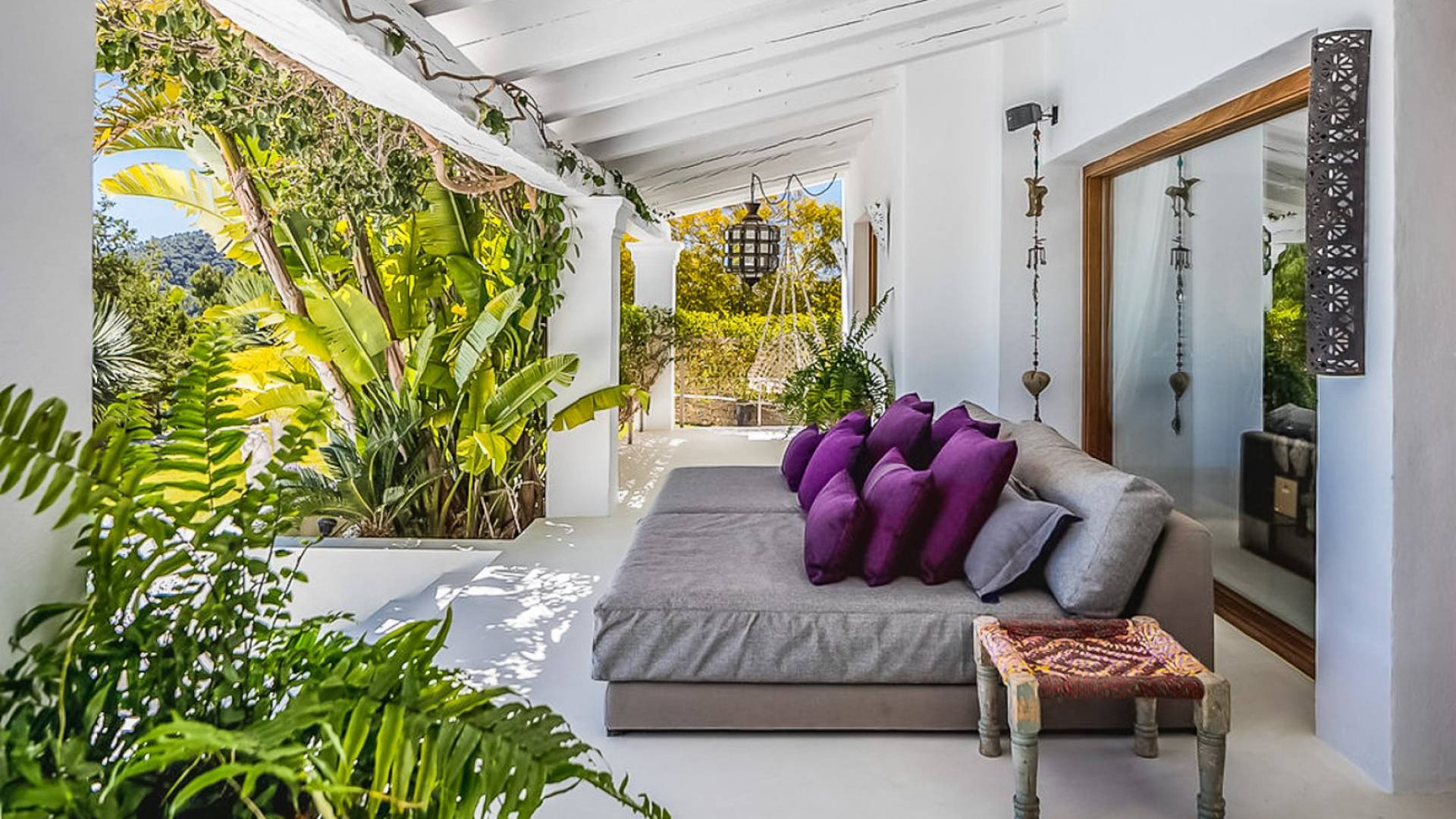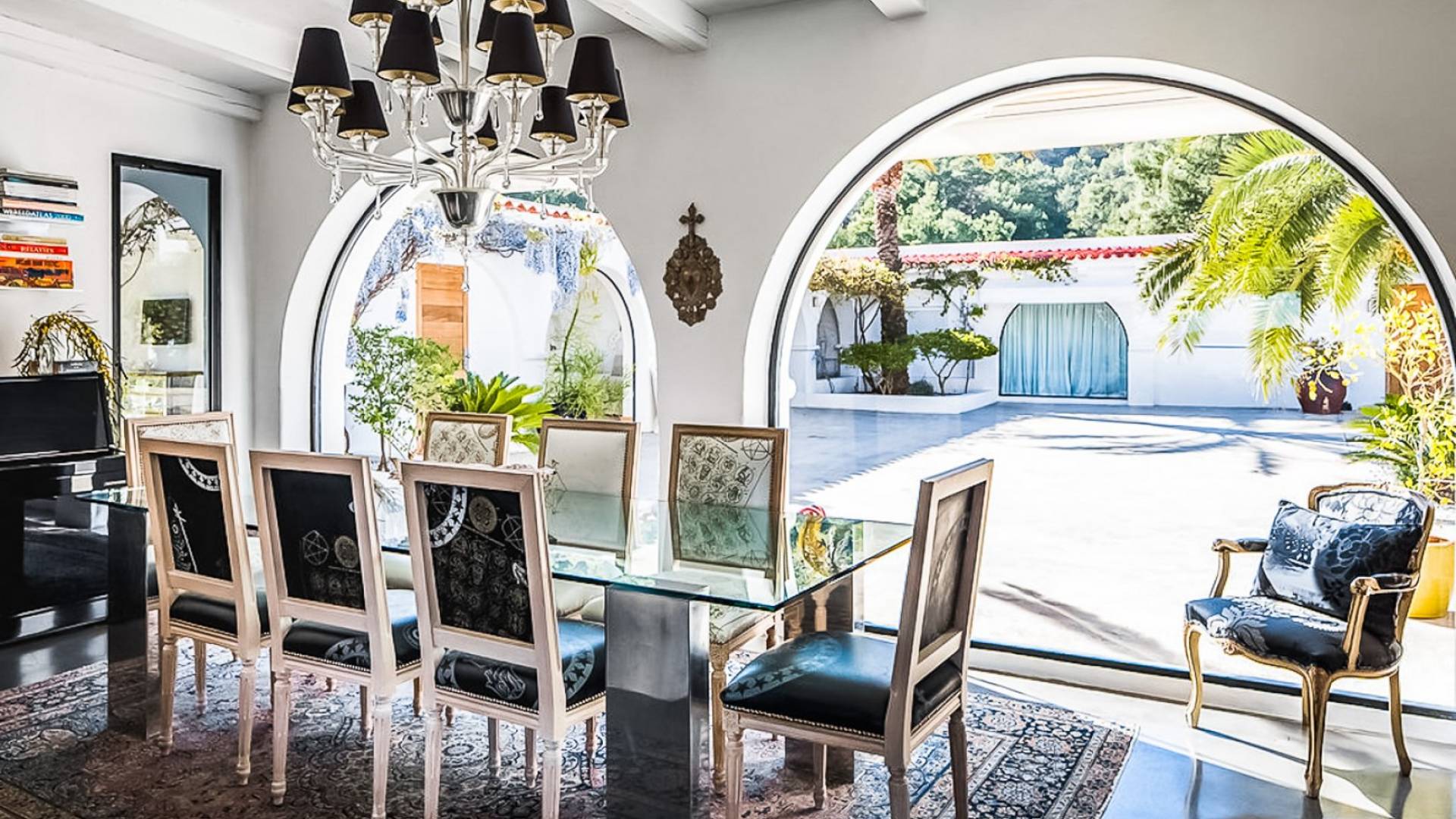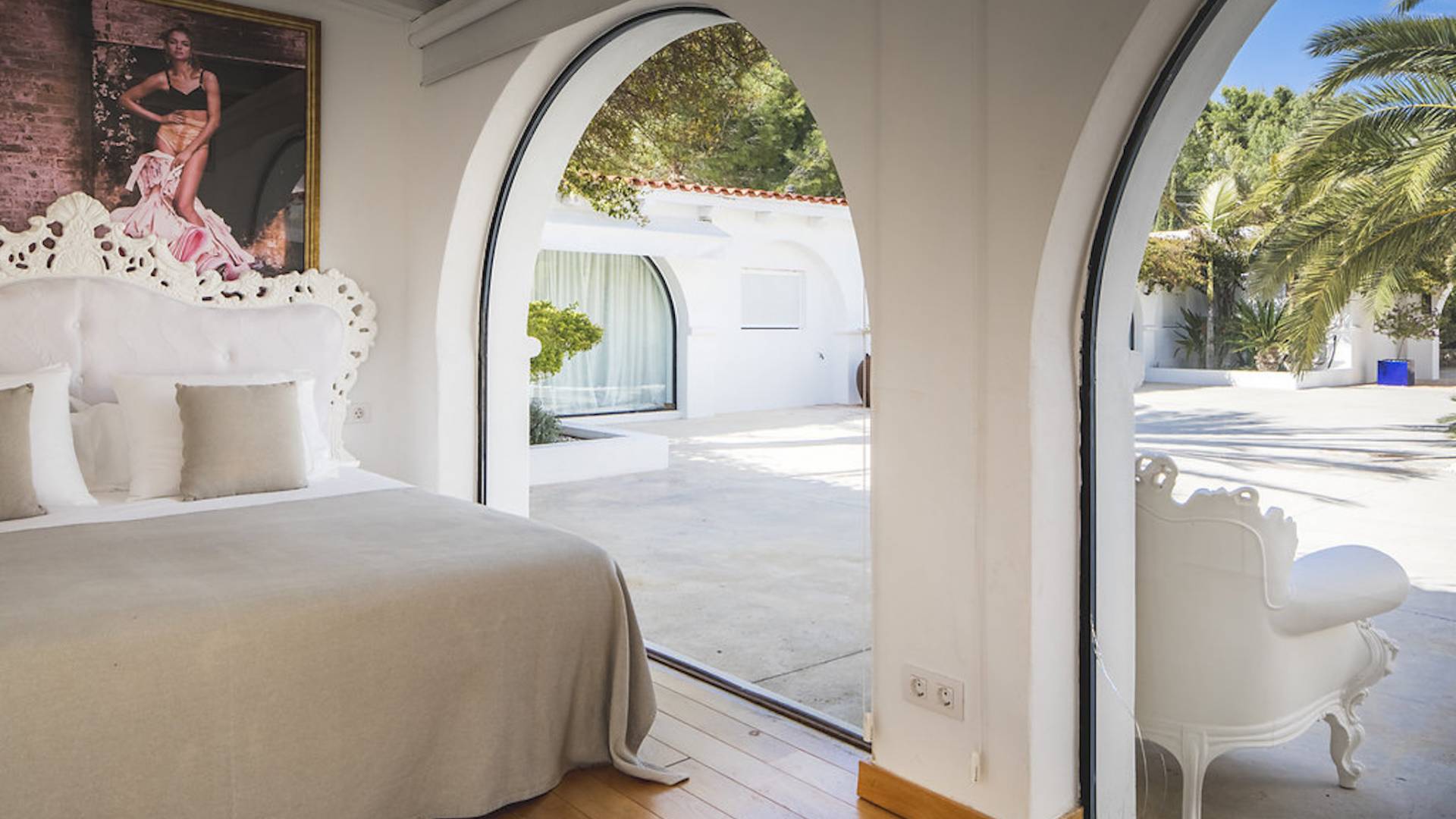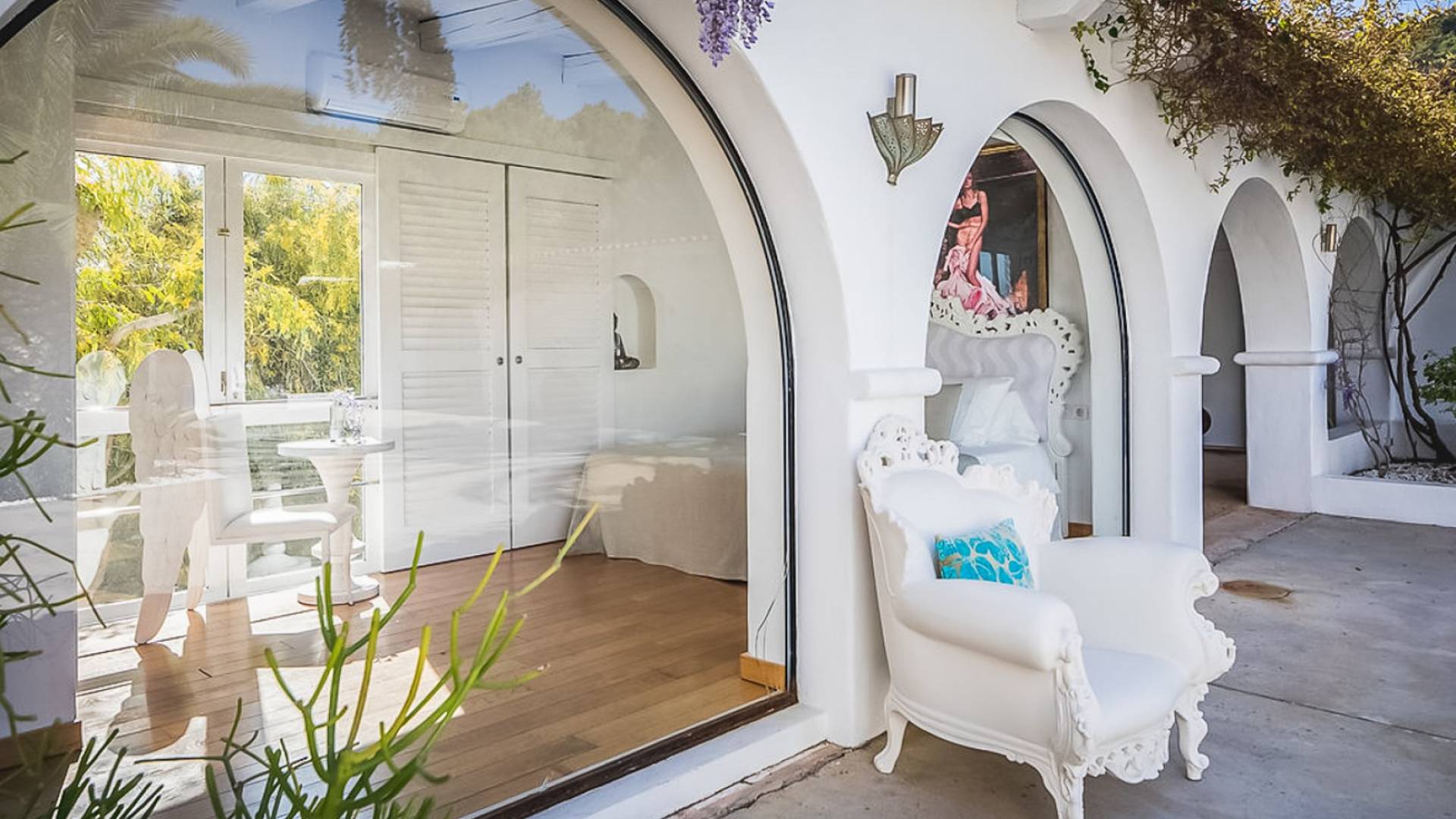 Inside El Zafiro Villa Ibiza is beautifully furnished and styled with high-quality fixtures and fittings, as well as a private gym. The lounge area has a huge sumptuous sofa, a flat-screen Samsung TV + Bose surround system, blue ray DVD player, Spanish and Dutch satellite TV, there are also 2 Bose speakers on the outdoor terrace. The interior dining table seats 8 people comfortably and there is sufficient porcelain, silverware, and glasses to serve all. The kitchen is modern and fully equipped including a double fronted Liebherr fridge/freezer/wine cooler, a Gaggenau microwave and coffee machine which are built into the kitchen front; a Gaggenau dishwasher, oven, and hob with 5 gas flames and the laundry room has a Siemens washing machine and tumble dryer. The house has access to WiFi and is protected with an interior alarm system, which is connected to an alarm company called Red Seguridad, the staff of the house are also available.