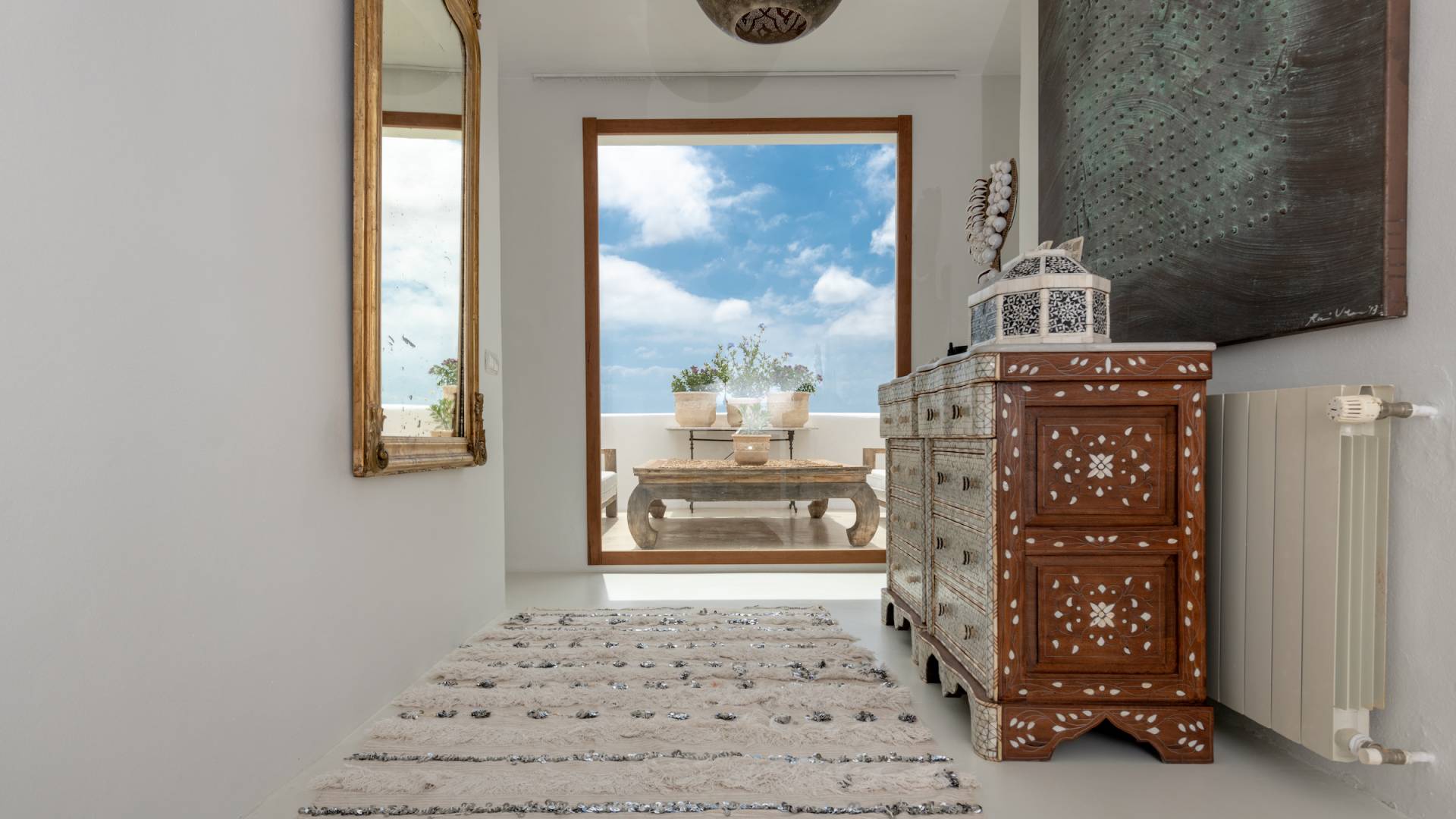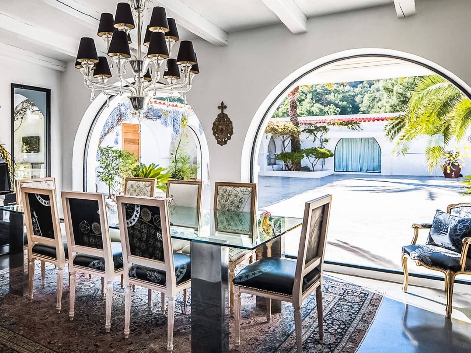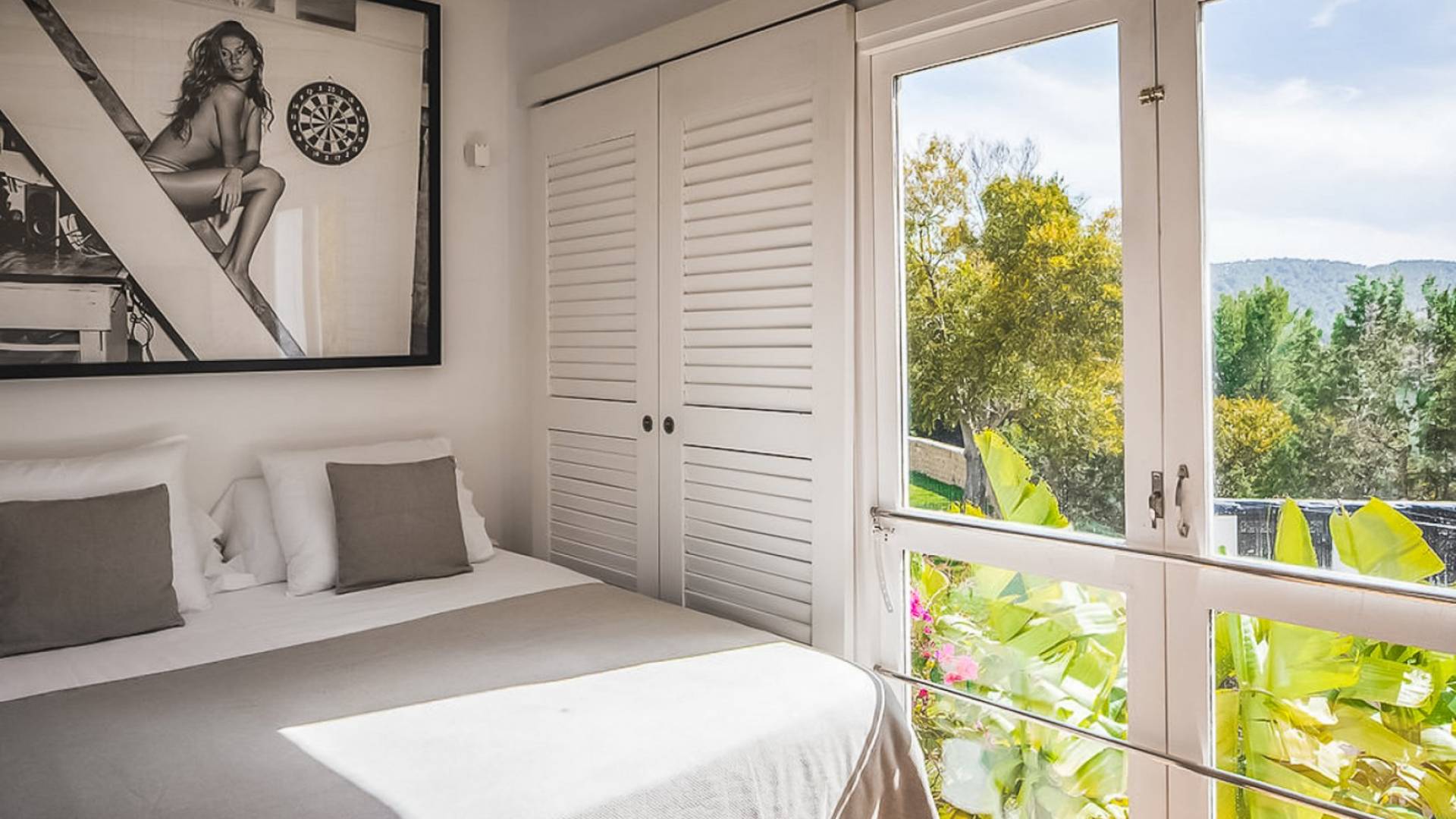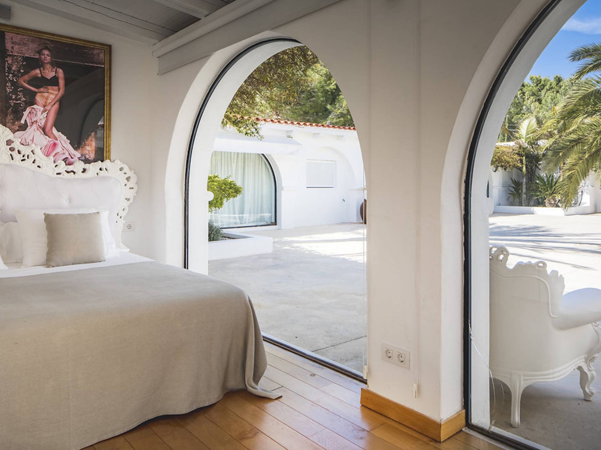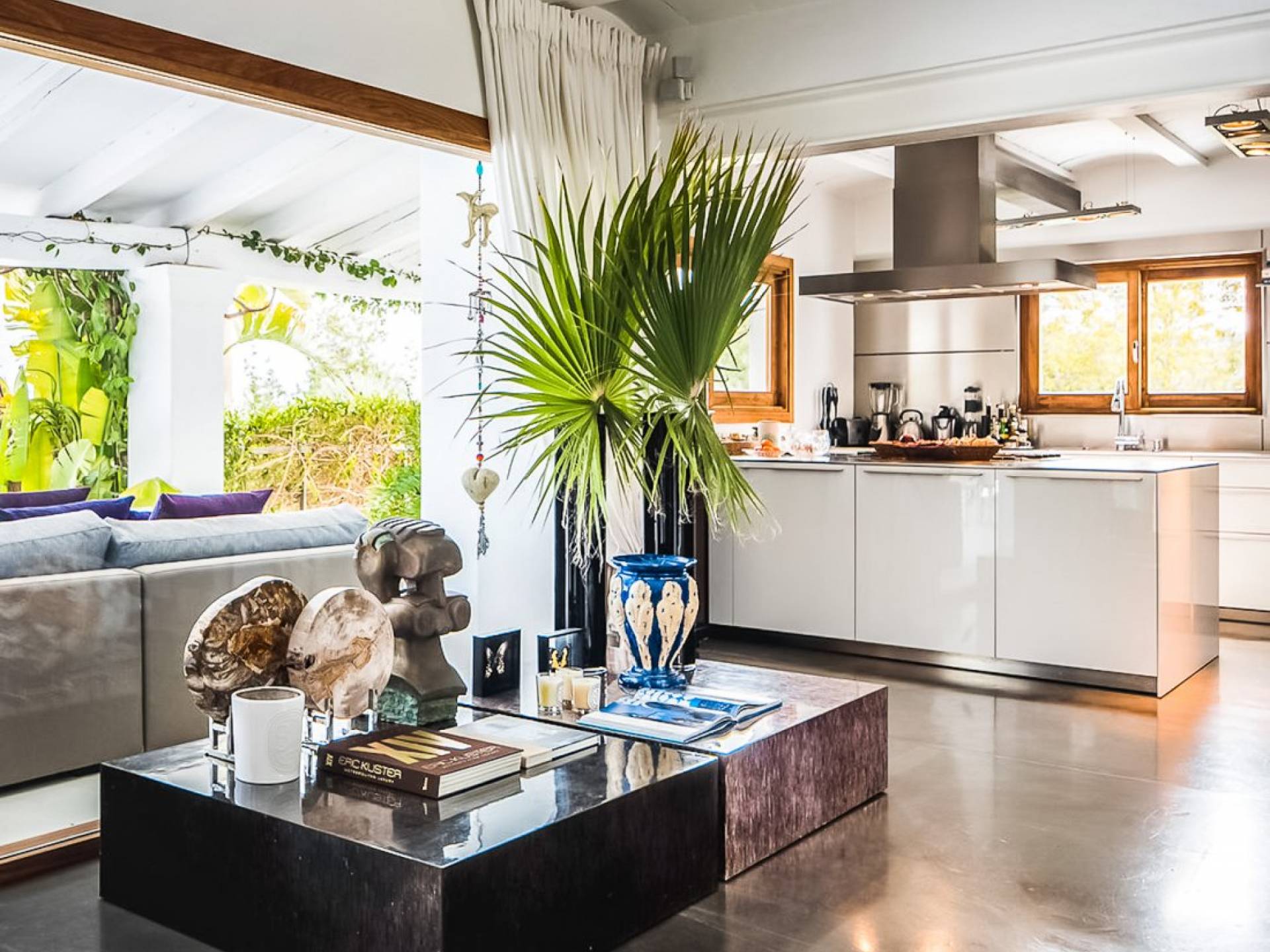 Inside El Zafiro Villa Ibiza is beautifully furnished and styled with high-quality fixtures and fittings, as well as a private gym. The lounge area has a huge sumptuous sofa, a flat-screen Samsung TV + Bose surround system, blue ray DVD player, Spanish and Dutch satellite TV, there are also 2 Bose speakers on the outdoor terrace. The interior dining table seats 8 people comfortably and there is sufficient porcelain, silverware, and glasses to serve all. The kitchen is modern and fully equipped including a double fronted Liebherr fridge/freezer/wine cooler, a Gaggenau microwave and coffee machine which are built into the kitchen front; a Gaggenau dishwasher, oven, and hob with 5 gas flames and the laundry room has a Siemens washing machine and tumble dryer. The house has access to WiFi and is protected with an interior alarm system, which is connected to an alarm company called Red Seguridad, the staff of the house are also available.