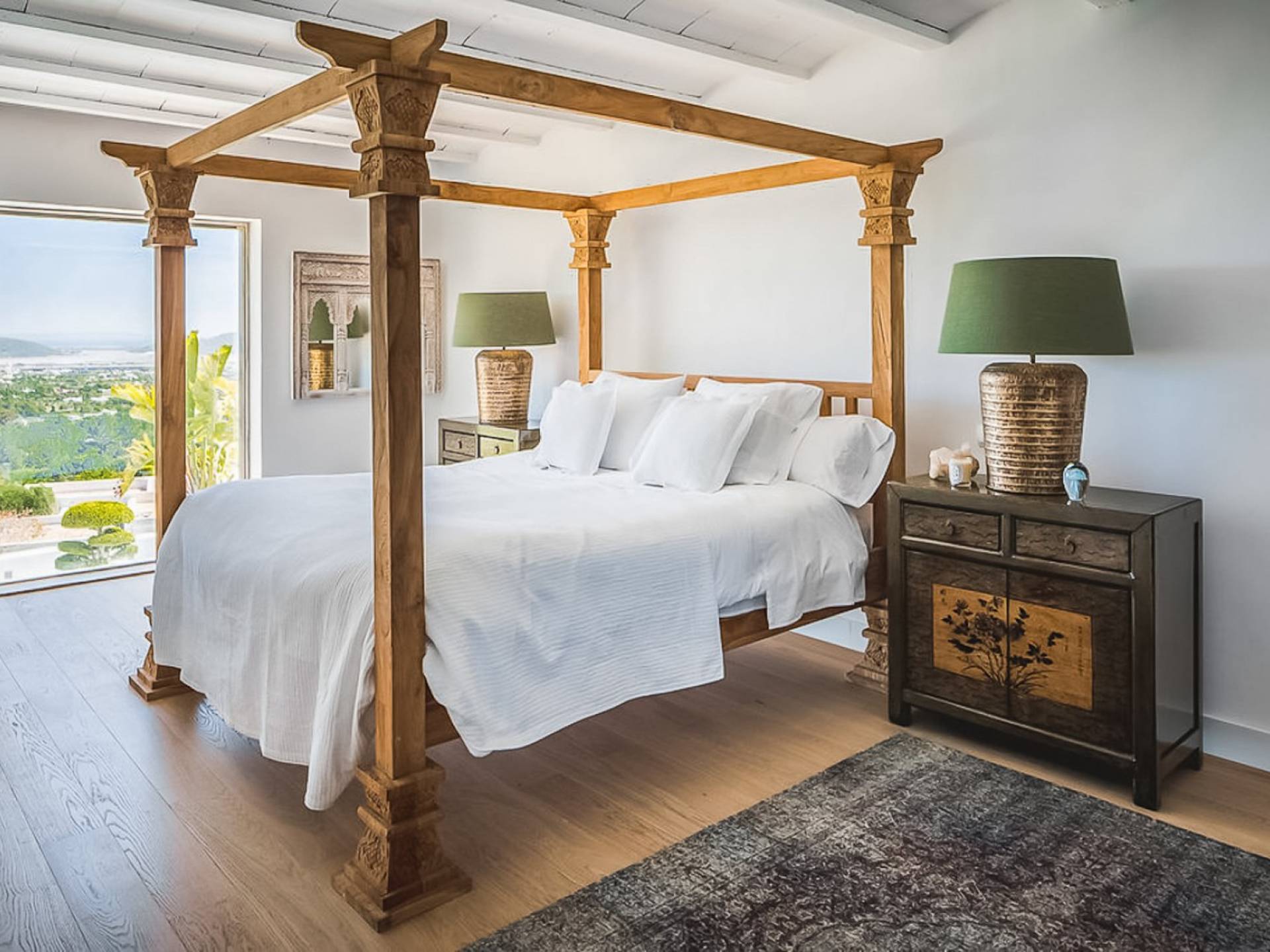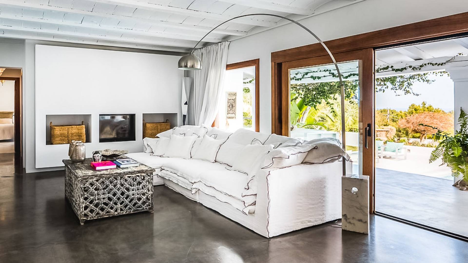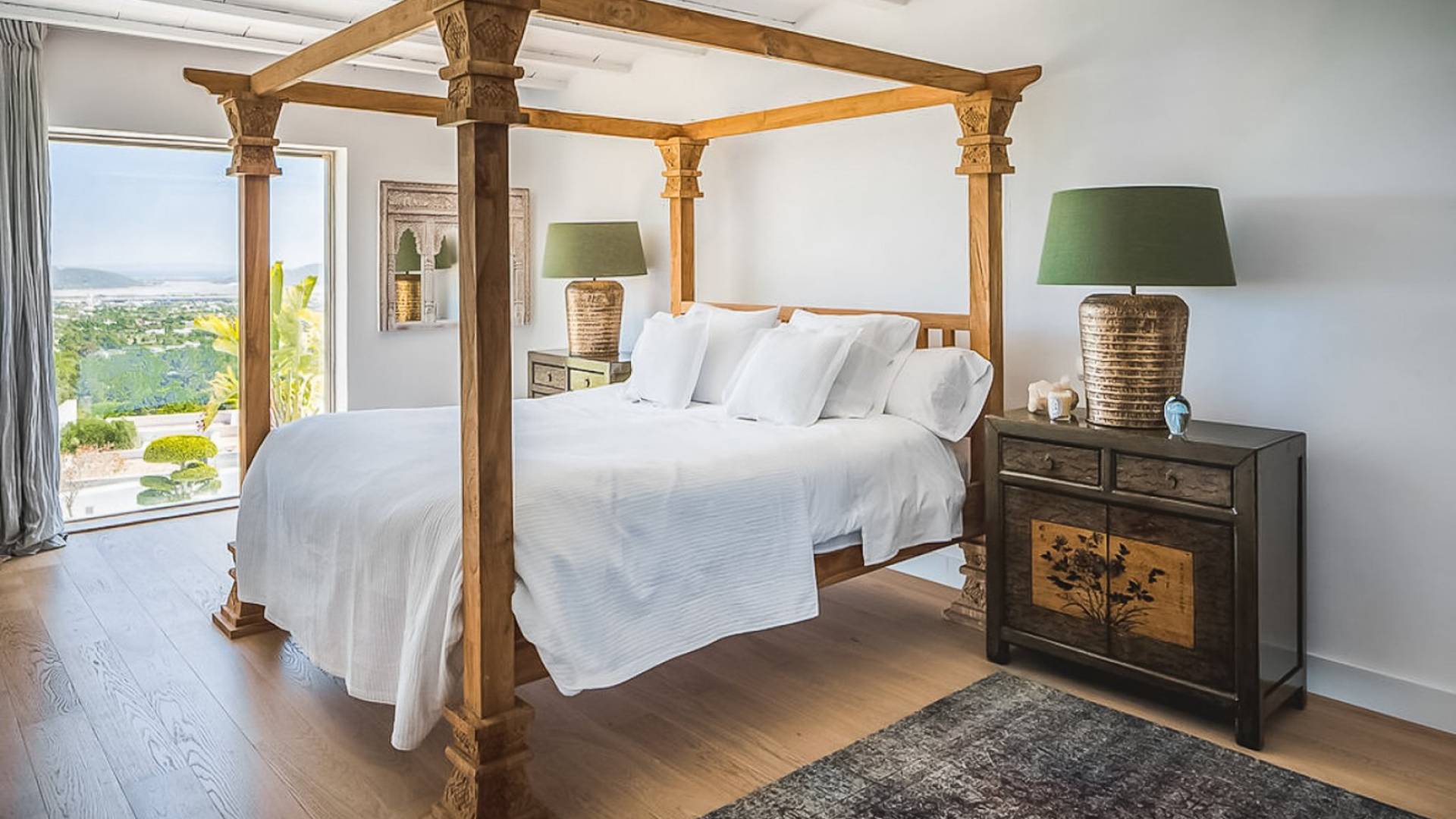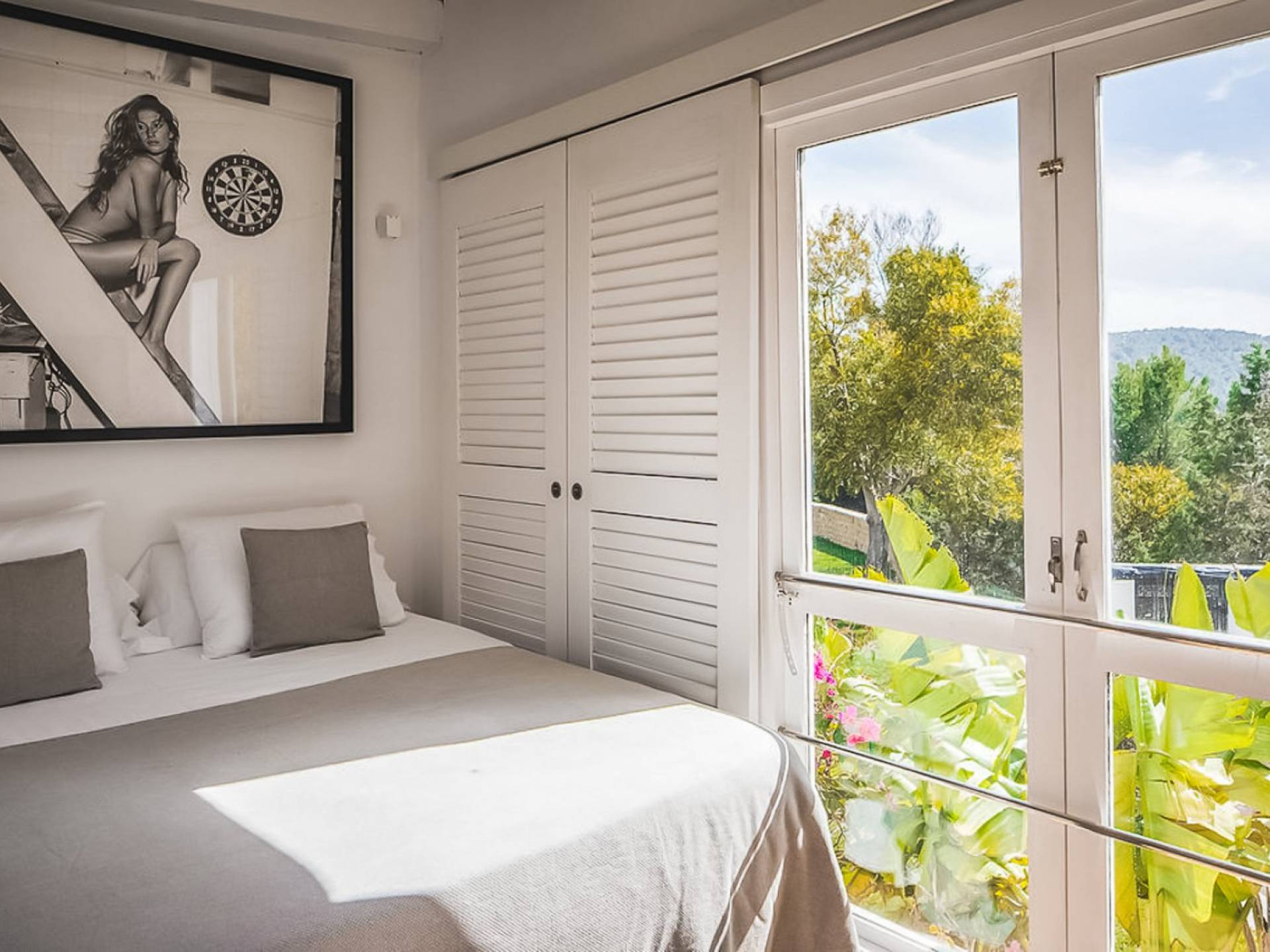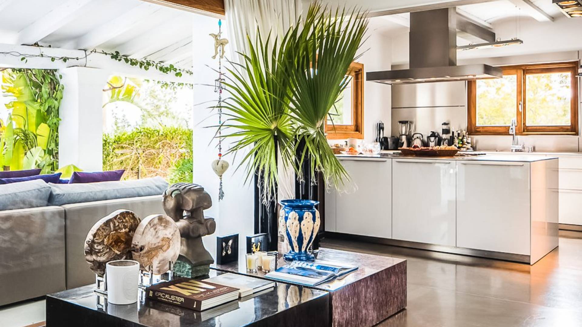 Inside El Zafiro Villa Ibiza is beautifully furnished and styled with high-quality fixtures and fittings, as well as a private gym. The lounge area has a huge sumptuous sofa, a flat-screen Samsung TV + Bose surround system, blue ray DVD player, Spanish and Dutch satellite TV, there are also 2 Bose speakers on the outdoor terrace. The interior dining table seats 8 people comfortably and there is sufficient porcelain, silverware, and glasses to serve all. The kitchen is modern and fully equipped including a double fronted Liebherr fridge/freezer/wine cooler, a Gaggenau microwave and coffee machine which are built into the kitchen front; a Gaggenau dishwasher, oven, and hob with 5 gas flames and the laundry room has a Siemens washing machine and tumble dryer. The house has access to WiFi and is protected with an interior alarm system, which is connected to an alarm company called Red Seguridad, the staff of the house are also available.