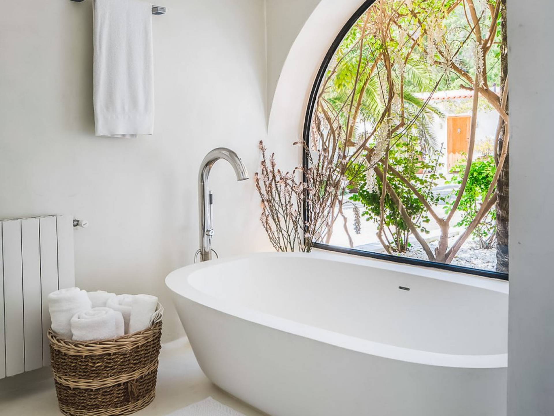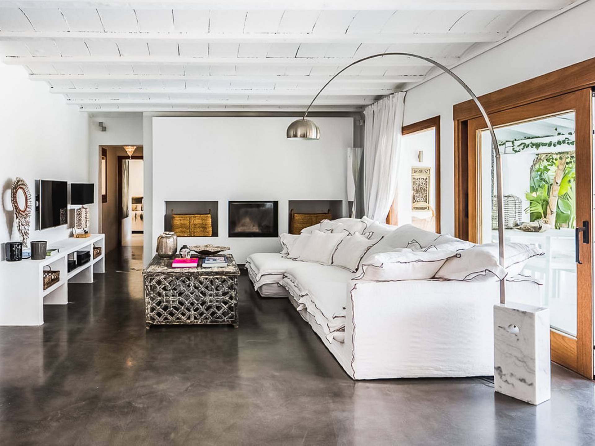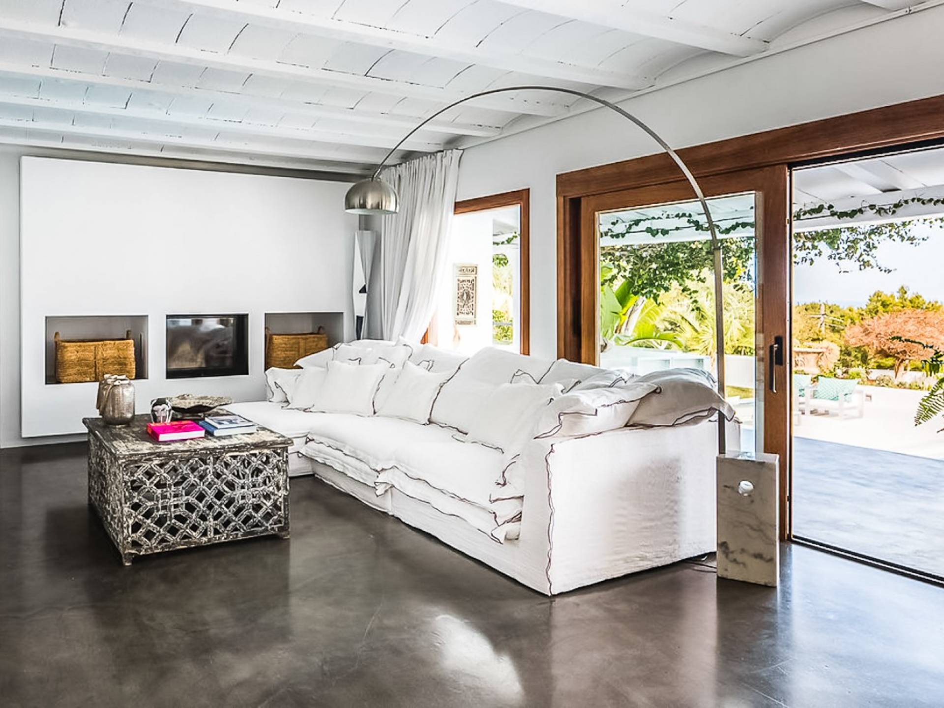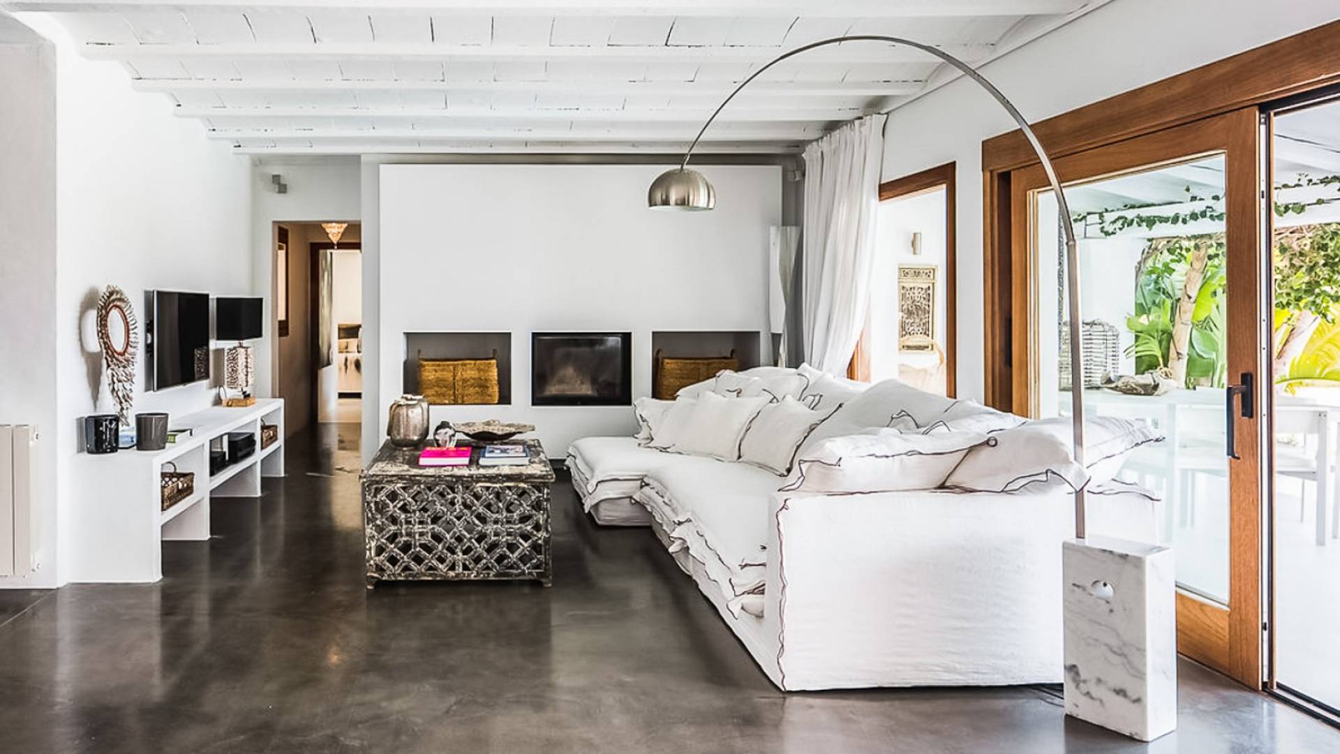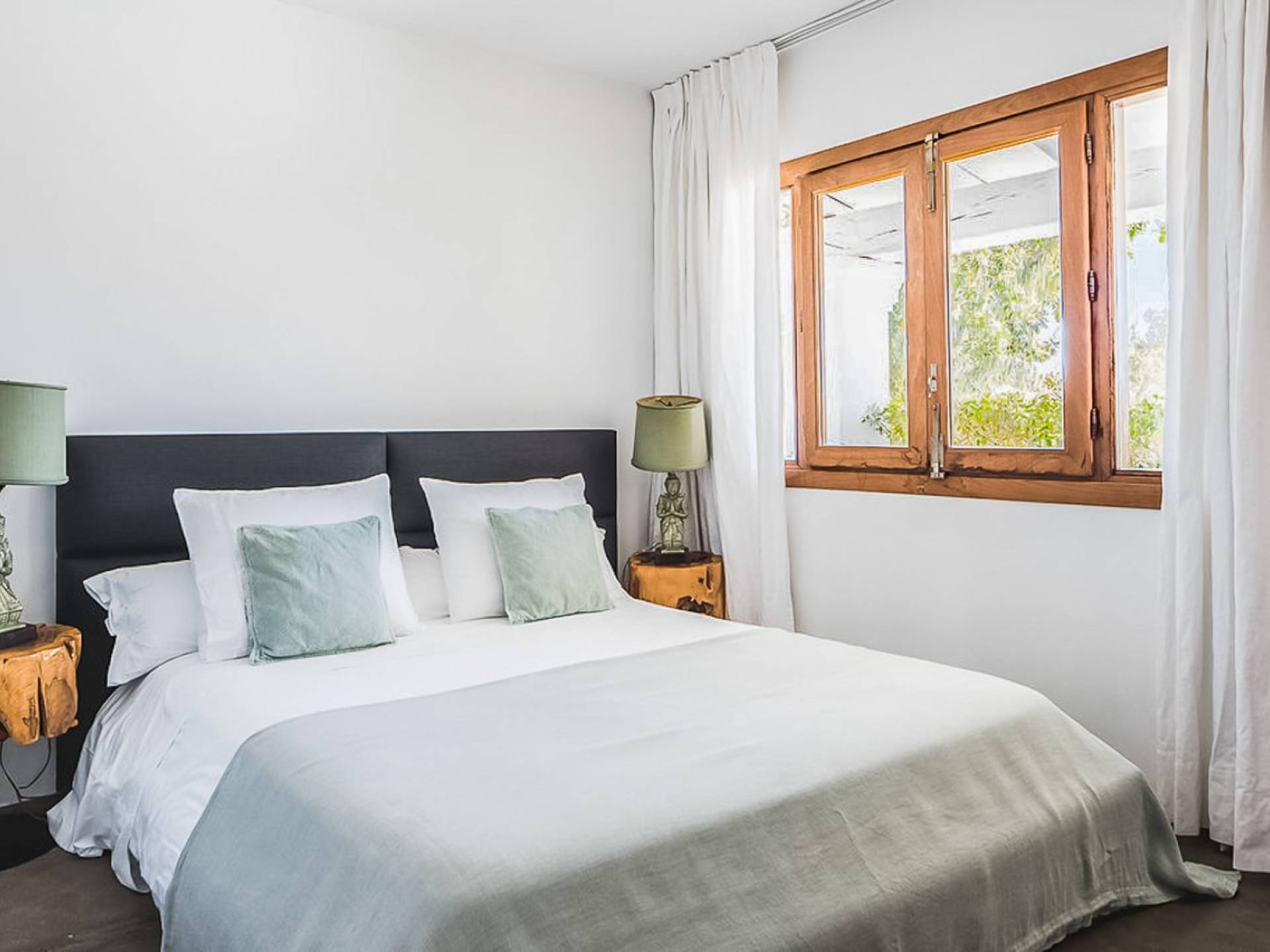 Inside El Zafiro Villa Ibiza is beautifully furnished and styled with high-quality fixtures and fittings, as well as a private gym. The lounge area has a huge sumptuous sofa, a flat-screen Samsung TV + Bose surround system, blue ray DVD player, Spanish and Dutch satellite TV, there are also 2 Bose speakers on the outdoor terrace. The interior dining table seats 8 people comfortably and there is sufficient porcelain, silverware, and glasses to serve all. The kitchen is modern and fully equipped including a double fronted Liebherr fridge/freezer/wine cooler, a Gaggenau microwave and coffee machine which are built into the kitchen front; a Gaggenau dishwasher, oven, and hob with 5 gas flames and the laundry room has a Siemens washing machine and tumble dryer. The house has access to WiFi and is protected with an interior alarm system, which is connected to an alarm company called Red Seguridad, the staff of the house are also available.