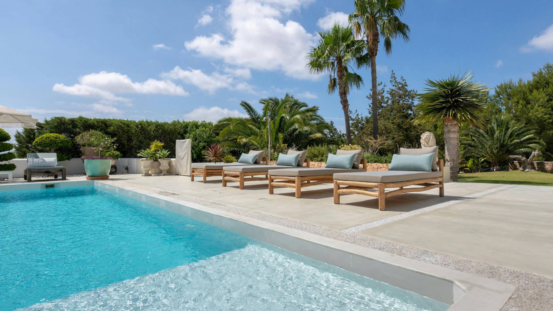 The outdoor areas are spacious and include a swimming pool of 10m x 10m in which no chlorine is used; the water preparation system is based on salt, but with no salty taste to the water, the system is especially good for eyes, skin, and hair. Outside terraces boast ample sunbathing and shaded areas equipped with luxurious high-quality sun loungers, comfortable outdoor sofas, chairs, daybeds, and parasols, there is also a gas barbecue and outdoor dining facilities seating up to 8 people. A large proportion of El Zafiro Villa is landscaped and there are vast areas of beautifully maintained lawns and gardens.