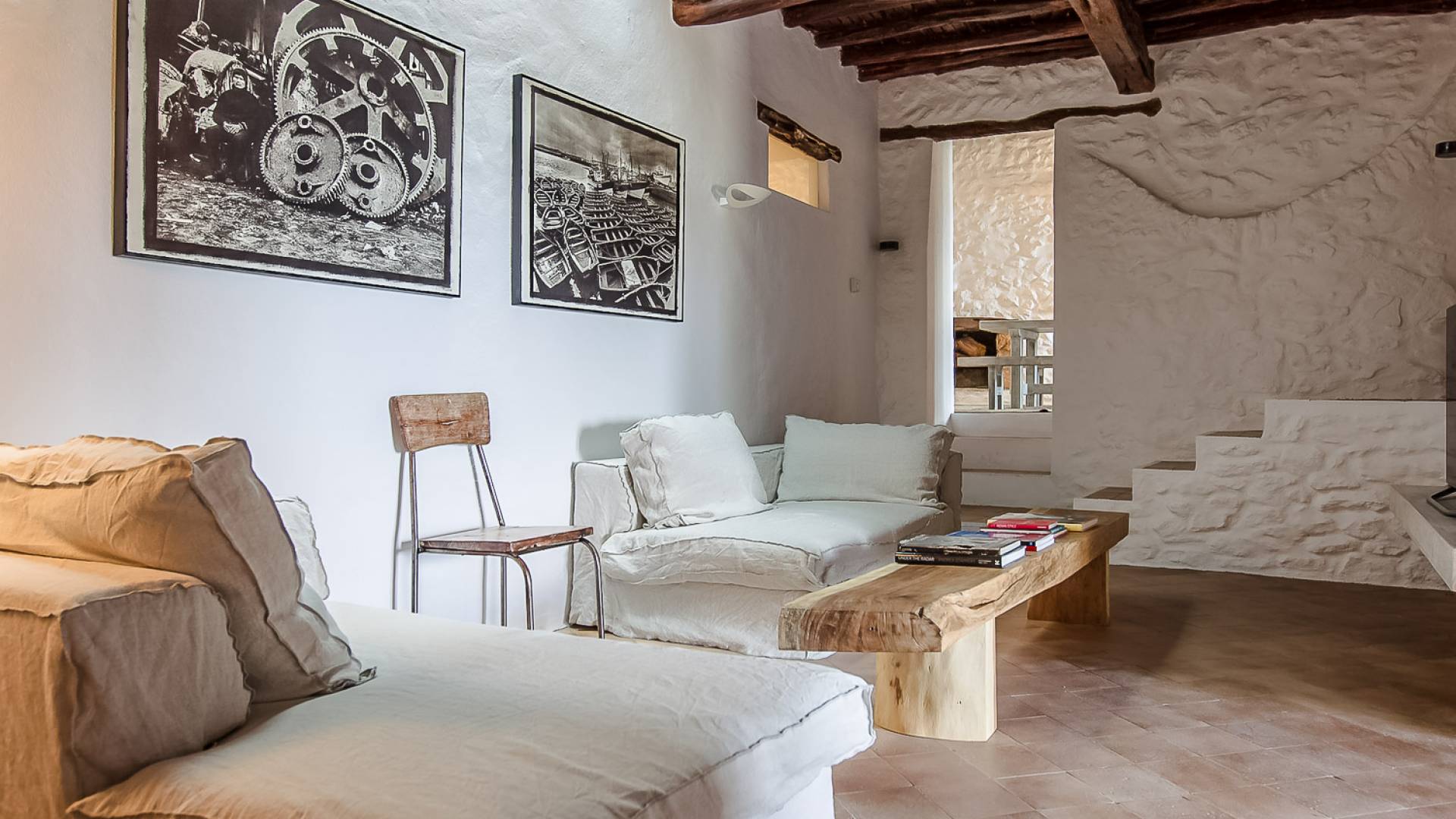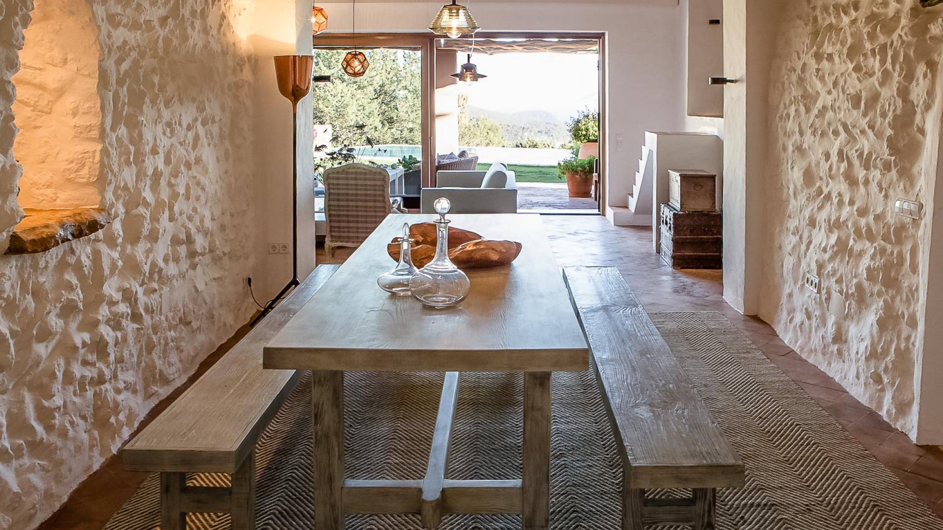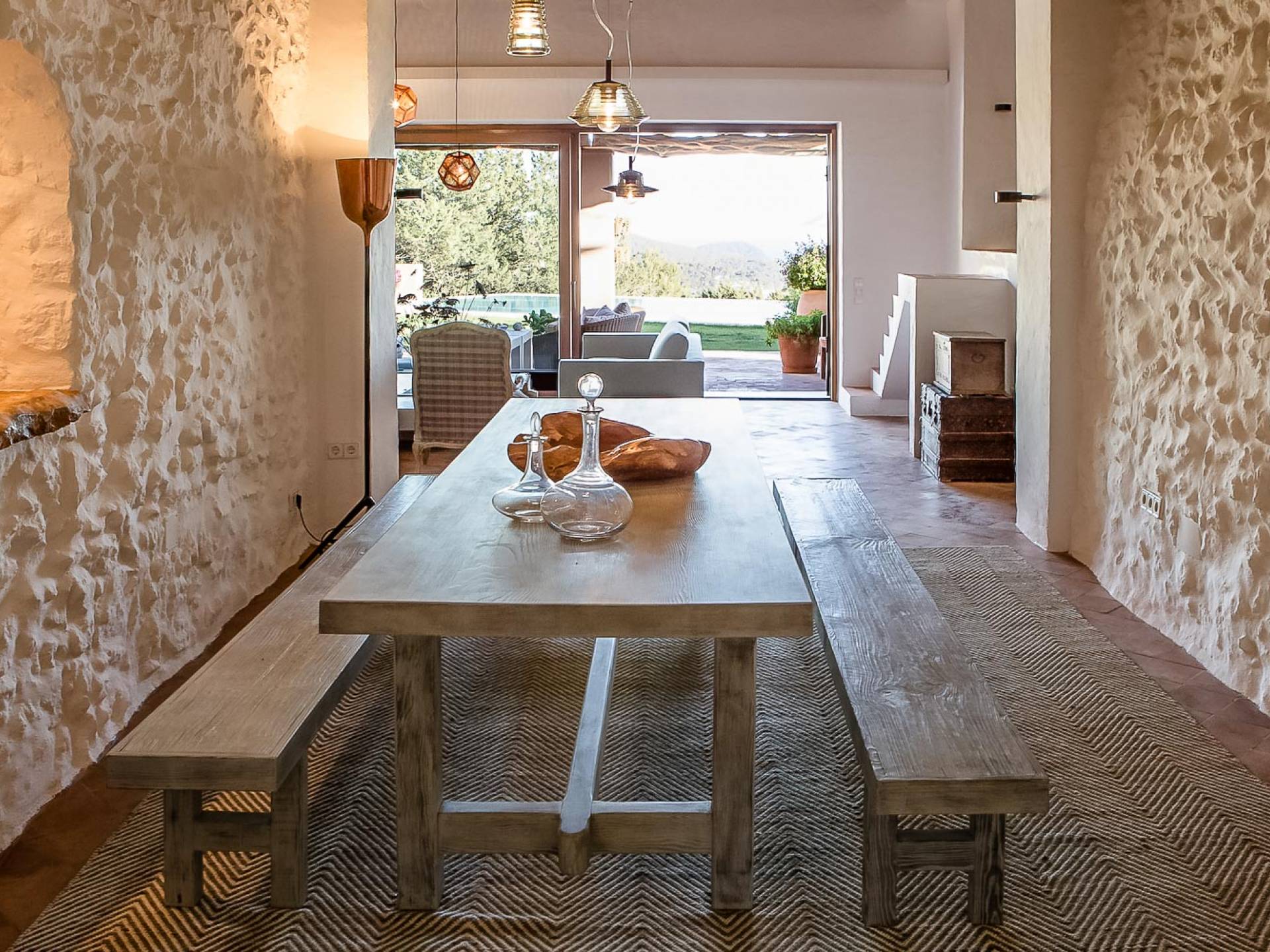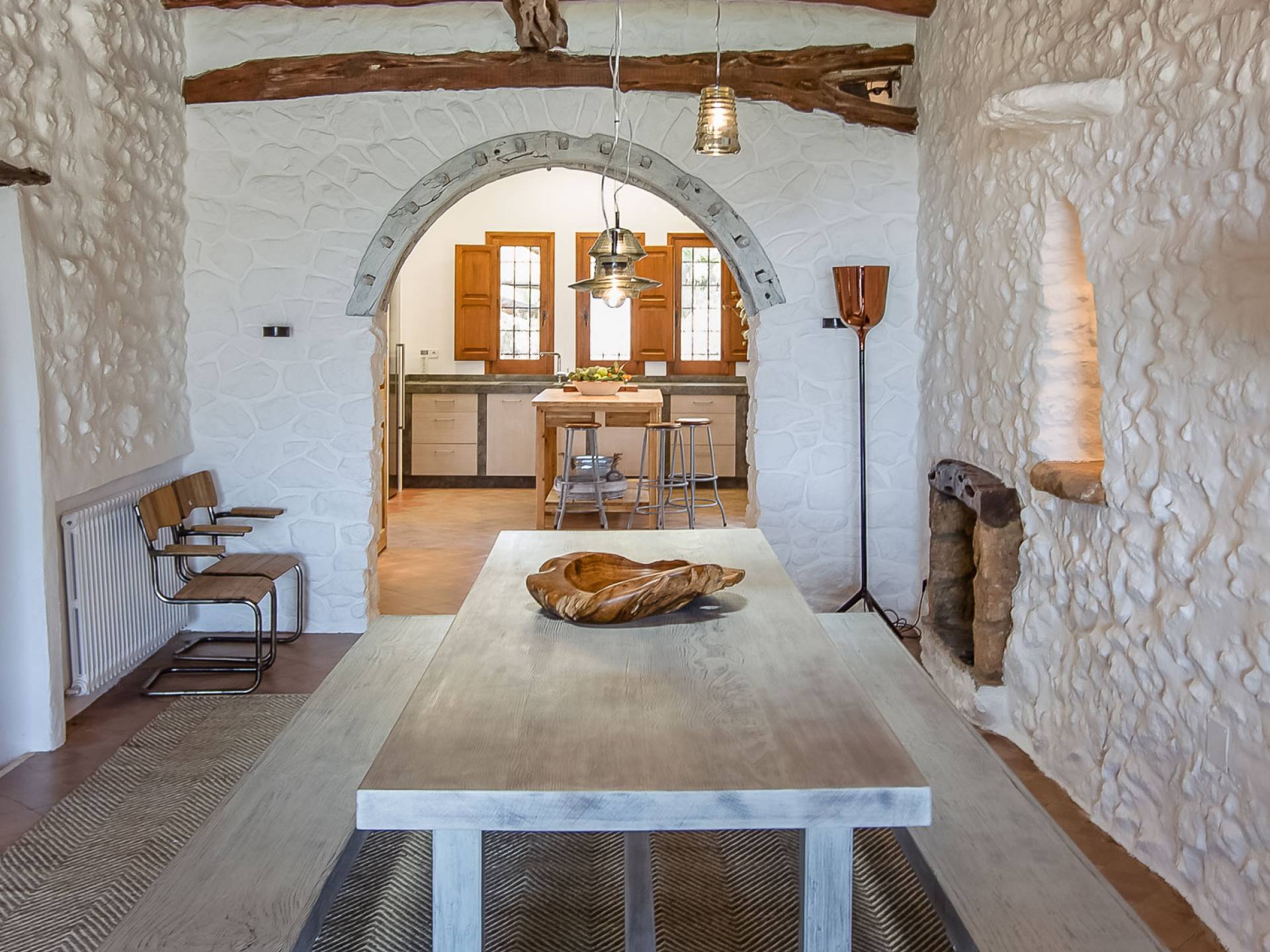 Can Paola Villa Ibiza mix the traditional Finca style with all modern comforts and finishes. The living areas are mainly open plan and there are several relaxing / lounging areas with large comfortable sofas - with the Finca style there are lots of nooks and crannies to relax in and catch up on your holiday hobbies. The dining area comfortably seats 10 people and an archway leads into a spacious, fully equipped modern kitchen.