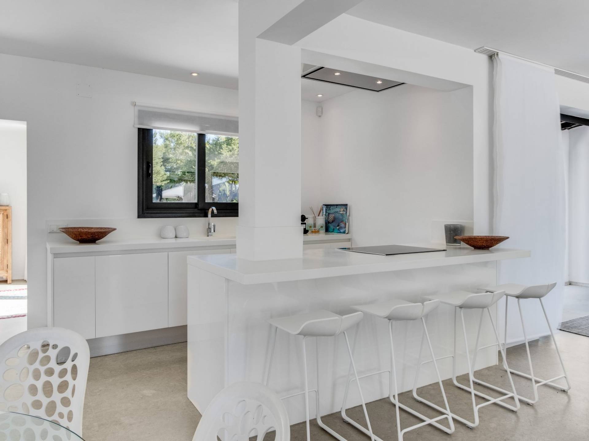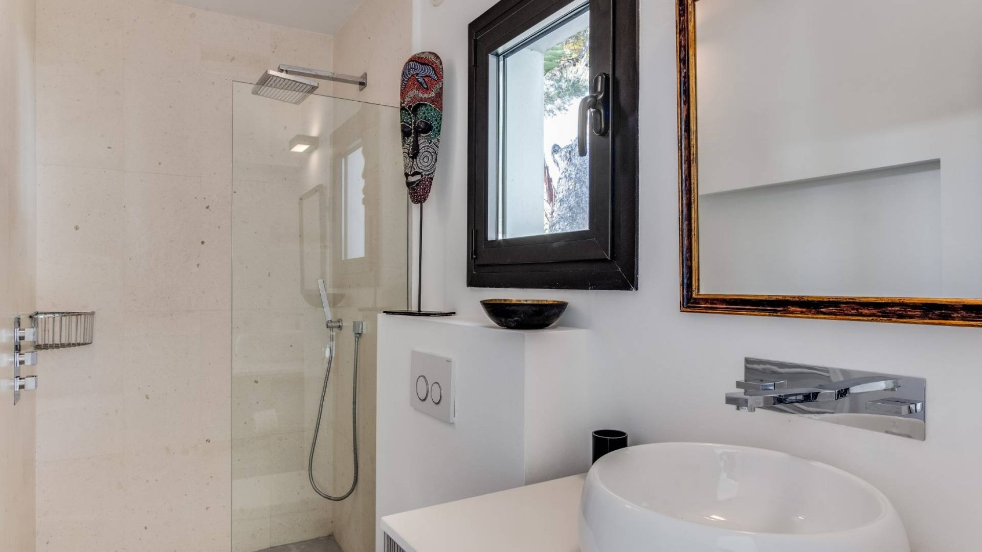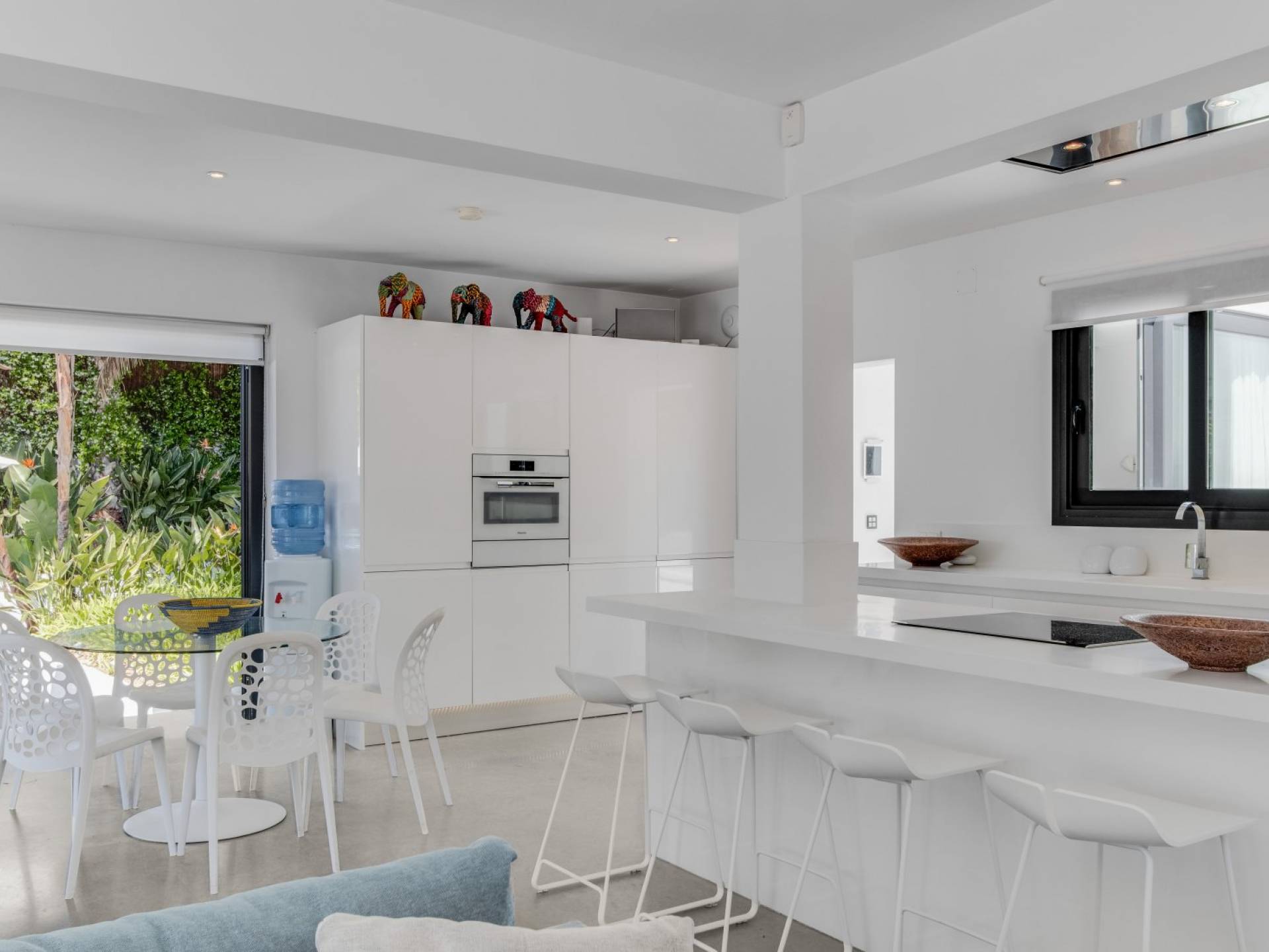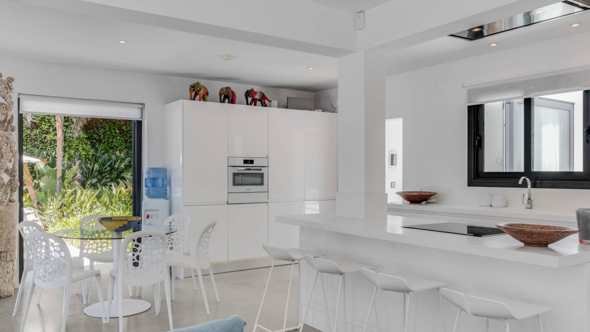 The lounge and kitchen areas are open plan, bright and spacious. The lounge boasts large comfortable sofas, TV, and huge floor-to-ceiling windows that open out onto the main terrace leading to the pool area. The fully equipped kitchen features a breakfast bar and all modern appliances. All areas are air-conditioned and have access to WiFi. Using a cutting-edge home automation system, the cameras, the alarm system, and all the outside lighting can be managed from anywhere in the house with an iPhone or iPad and can also be fully accessed when you are away from the villa.