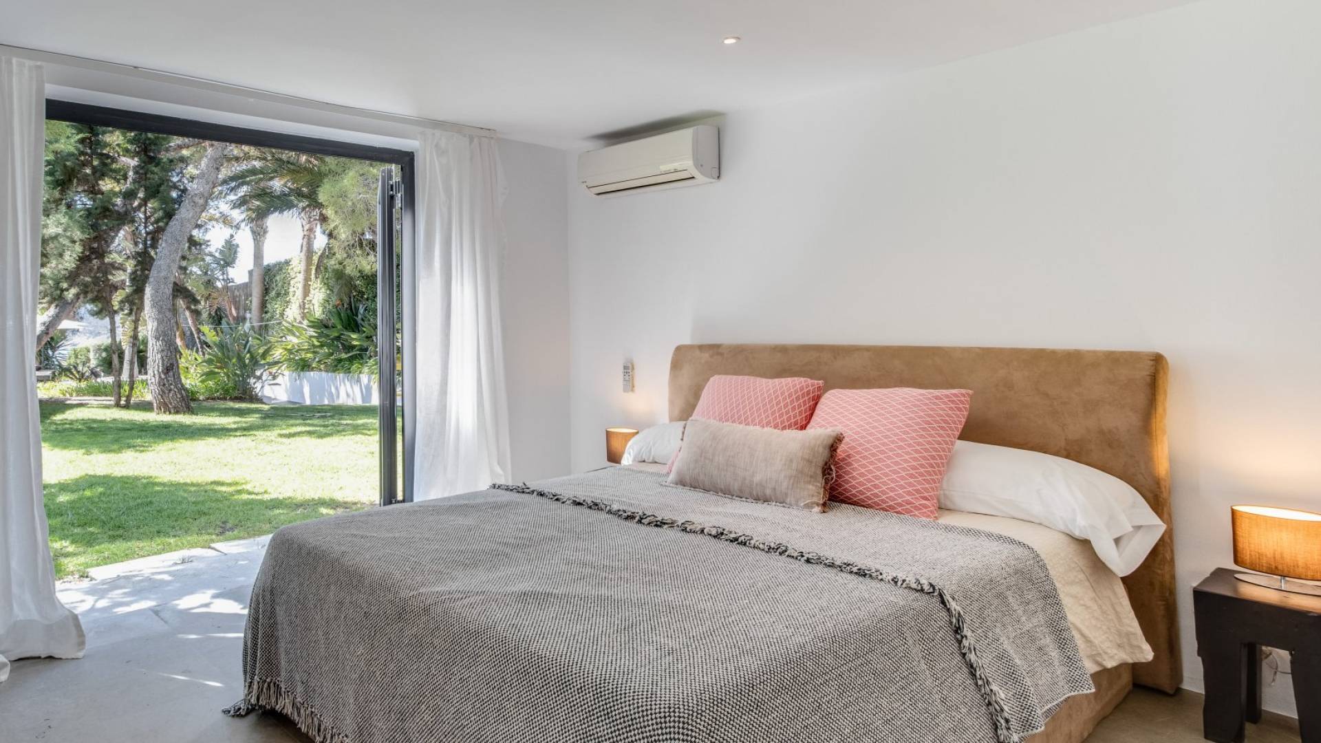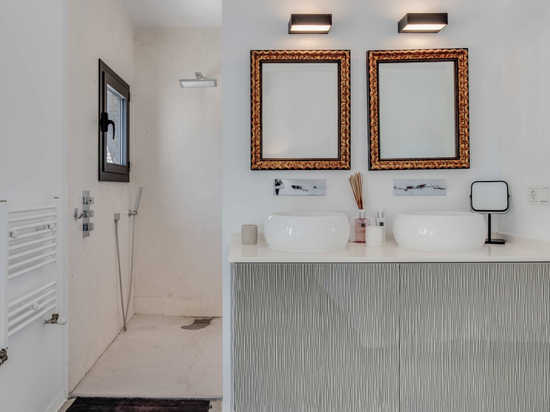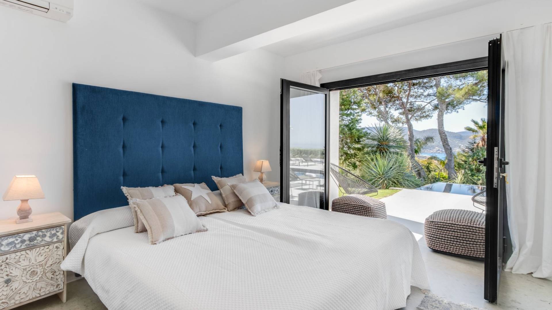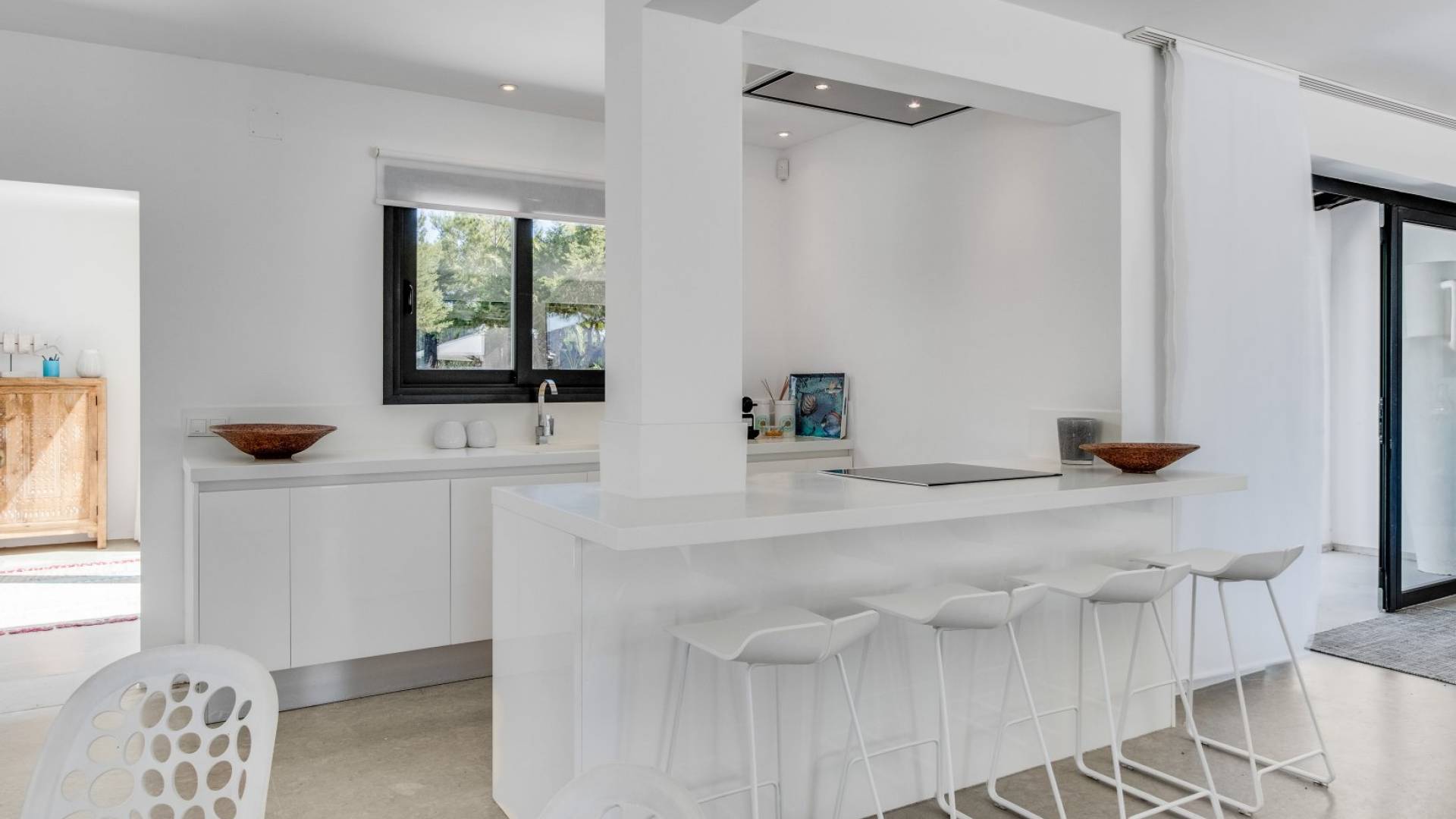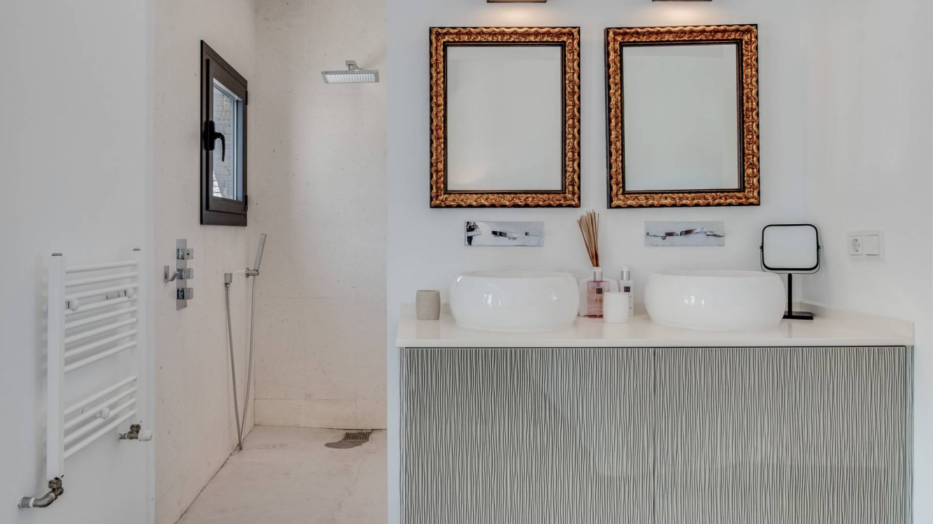 The lounge and kitchen areas are open plan, bright and spacious. The lounge boasts large comfortable sofas, TV, and huge floor-to-ceiling windows that open out onto the main terrace leading to the pool area. The fully equipped kitchen features a breakfast bar and all modern appliances. All areas are air-conditioned and have access to WiFi. Using a cutting-edge home automation system, the cameras, the alarm system, and all the outside lighting can be managed from anywhere in the house with an iPhone or iPad and can also be fully accessed when you are away from the villa.