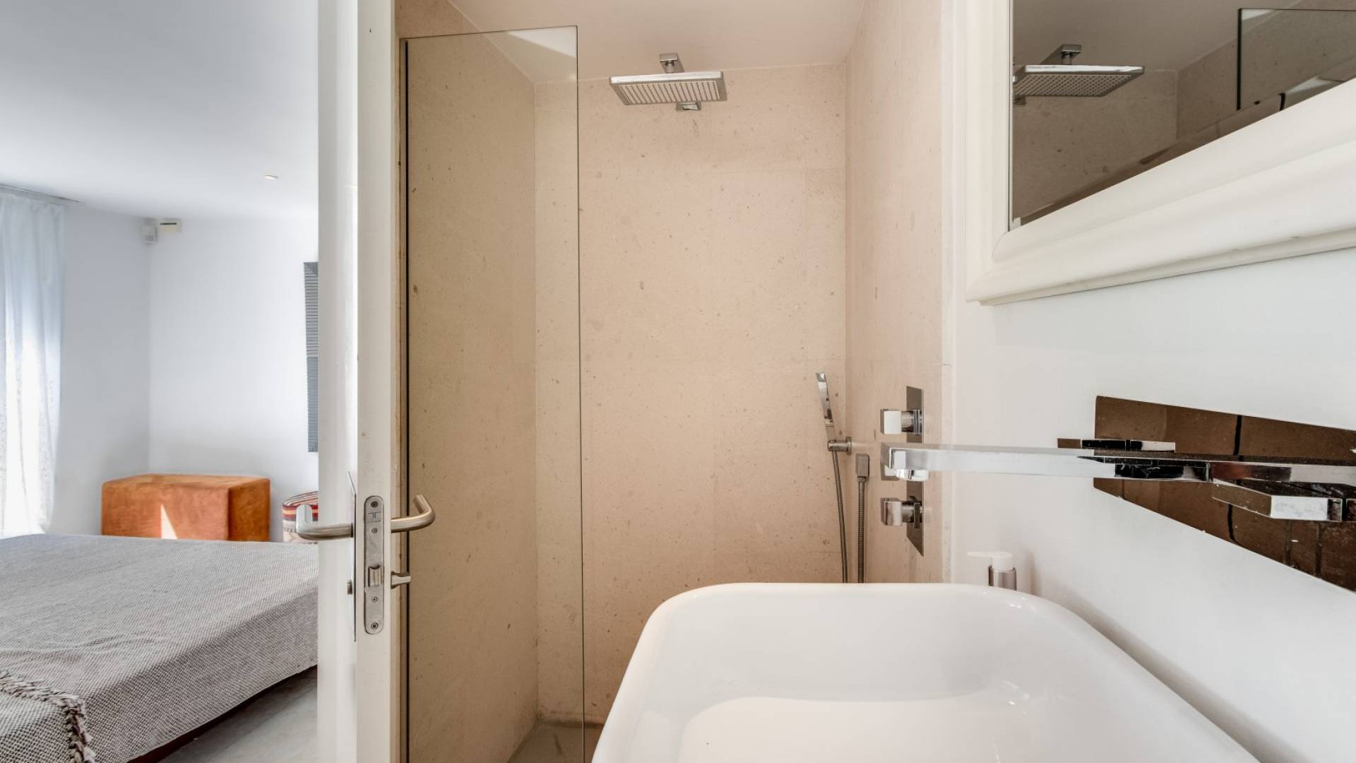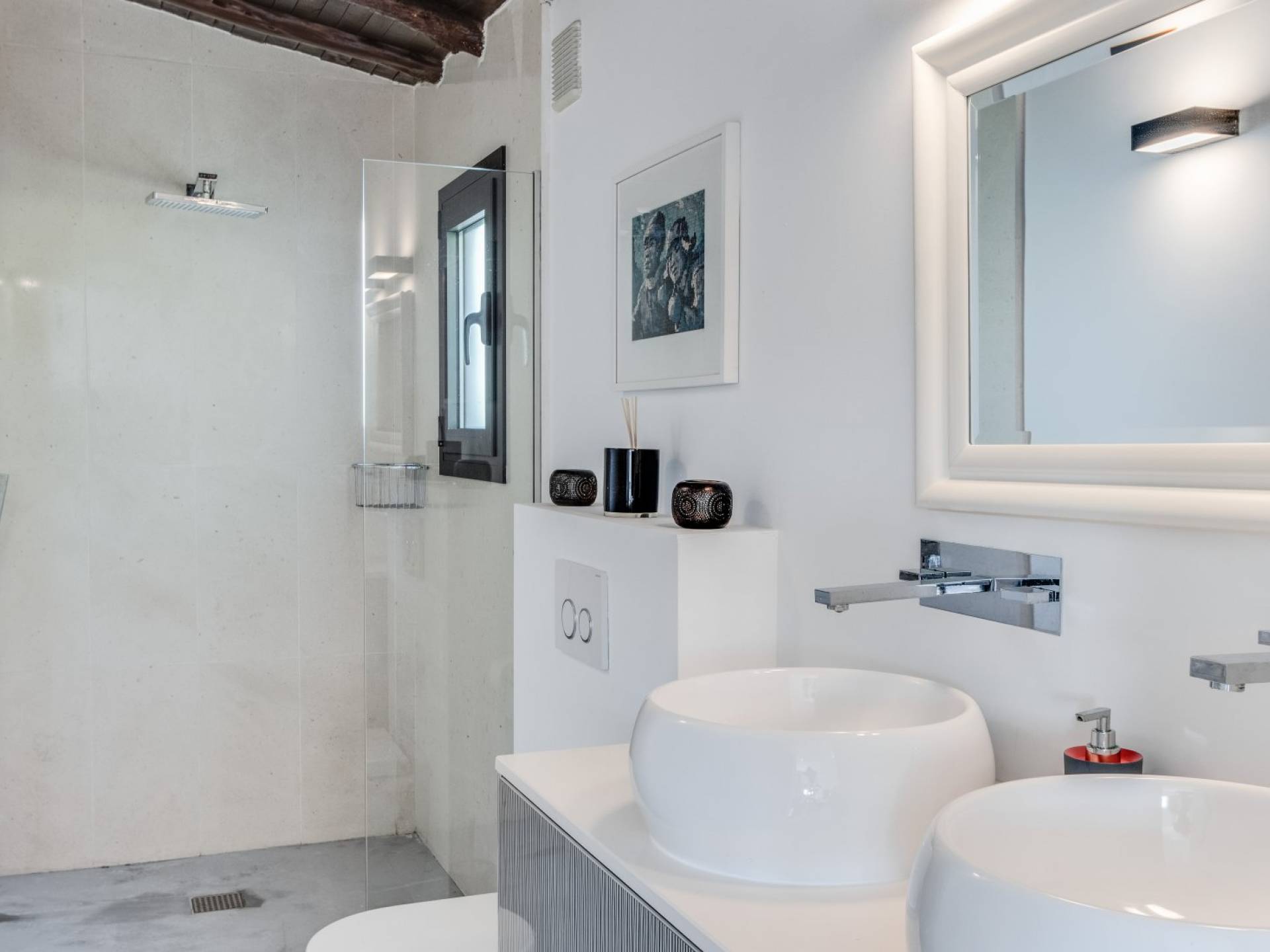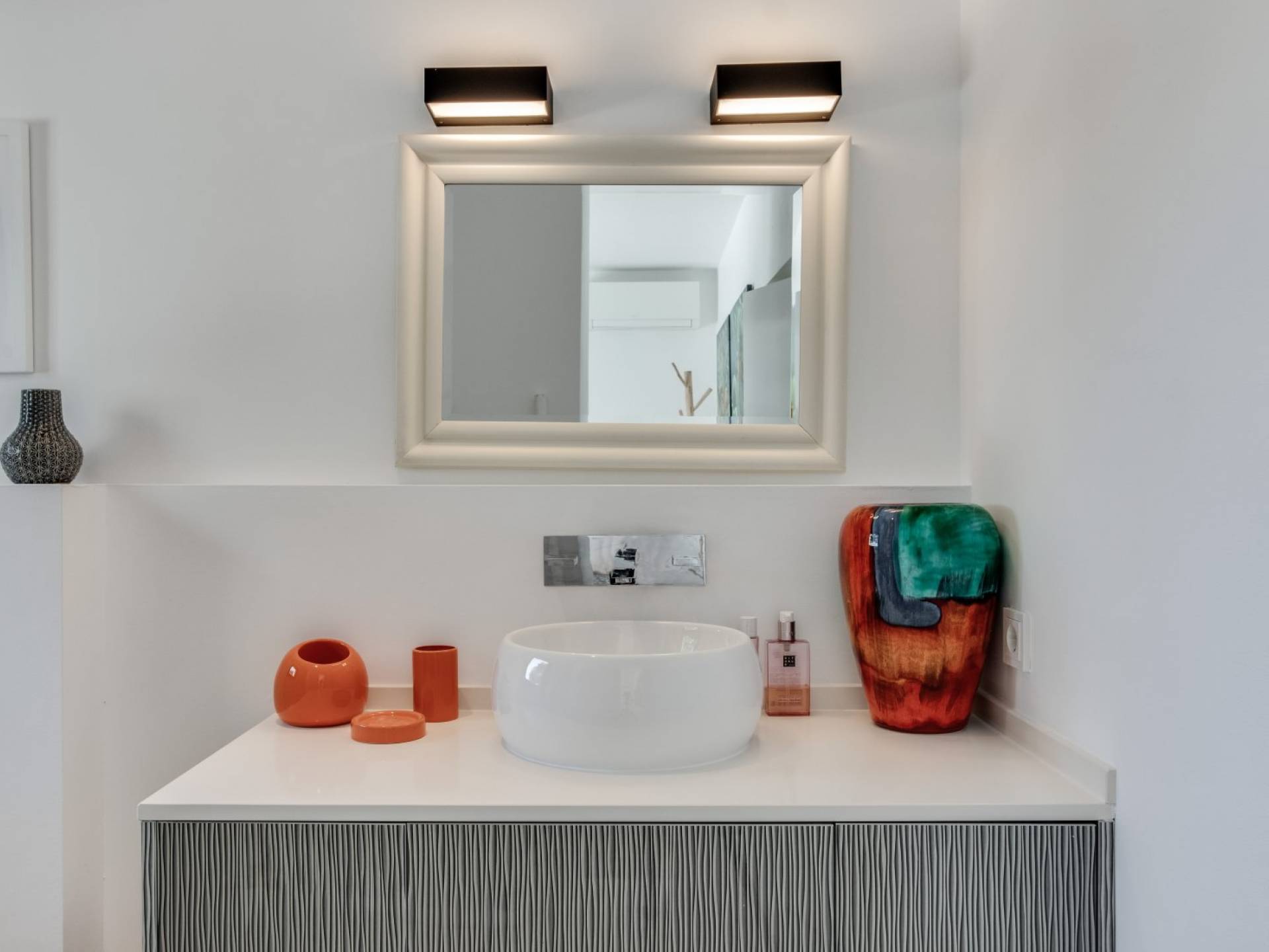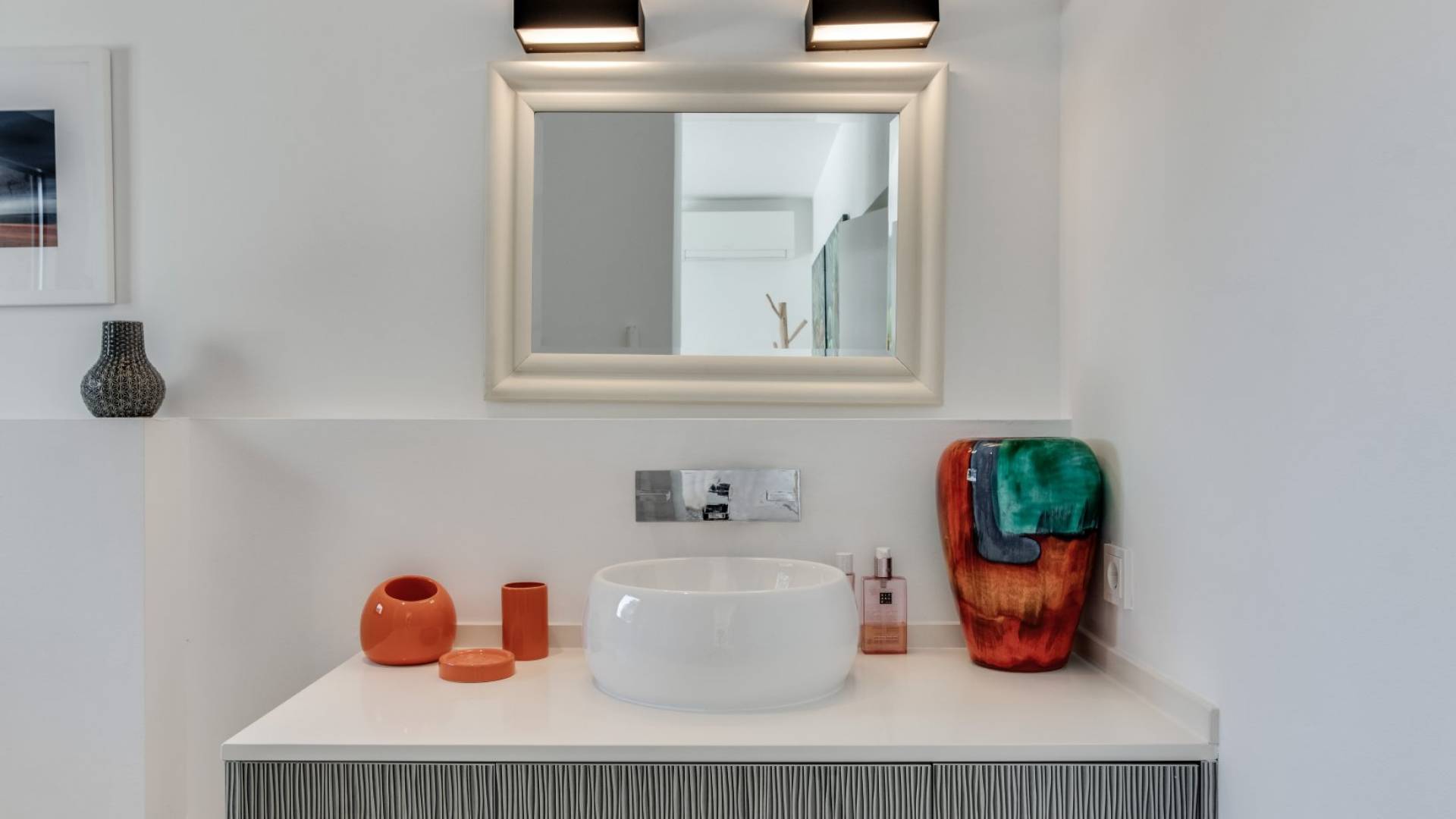 The lounge and kitchen areas are open plan, bright and spacious. The lounge boasts large comfortable sofas, TV, and huge floor-to-ceiling windows that open out onto the main terrace leading to the pool area. The fully equipped kitchen features a breakfast bar and all modern appliances. All areas are air-conditioned and have access to WiFi. Using a cutting-edge home automation system, the cameras, the alarm system, and all the outside lighting can be managed from anywhere in the house with an iPhone or iPad and can also be fully accessed when you are away from the villa.