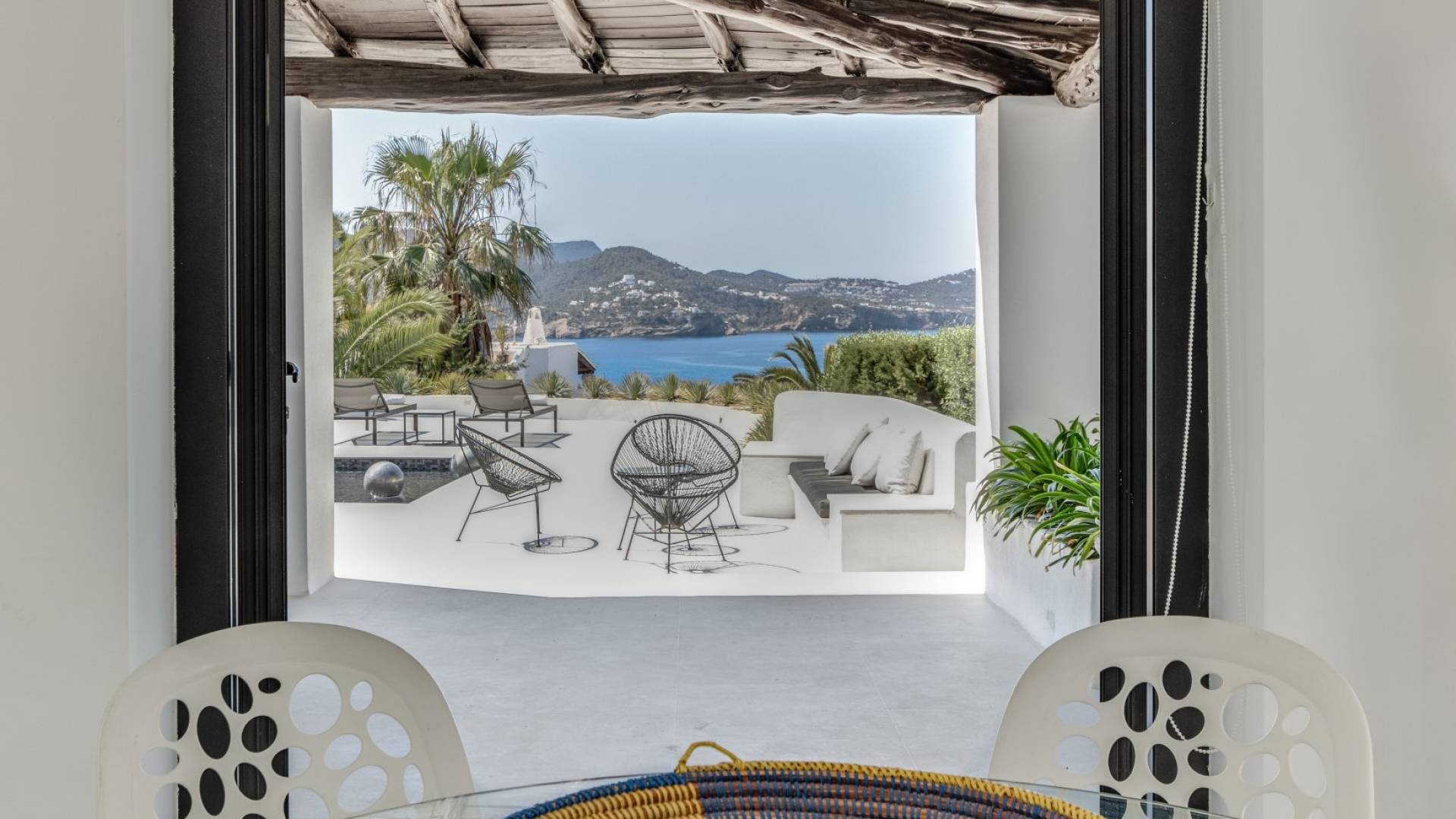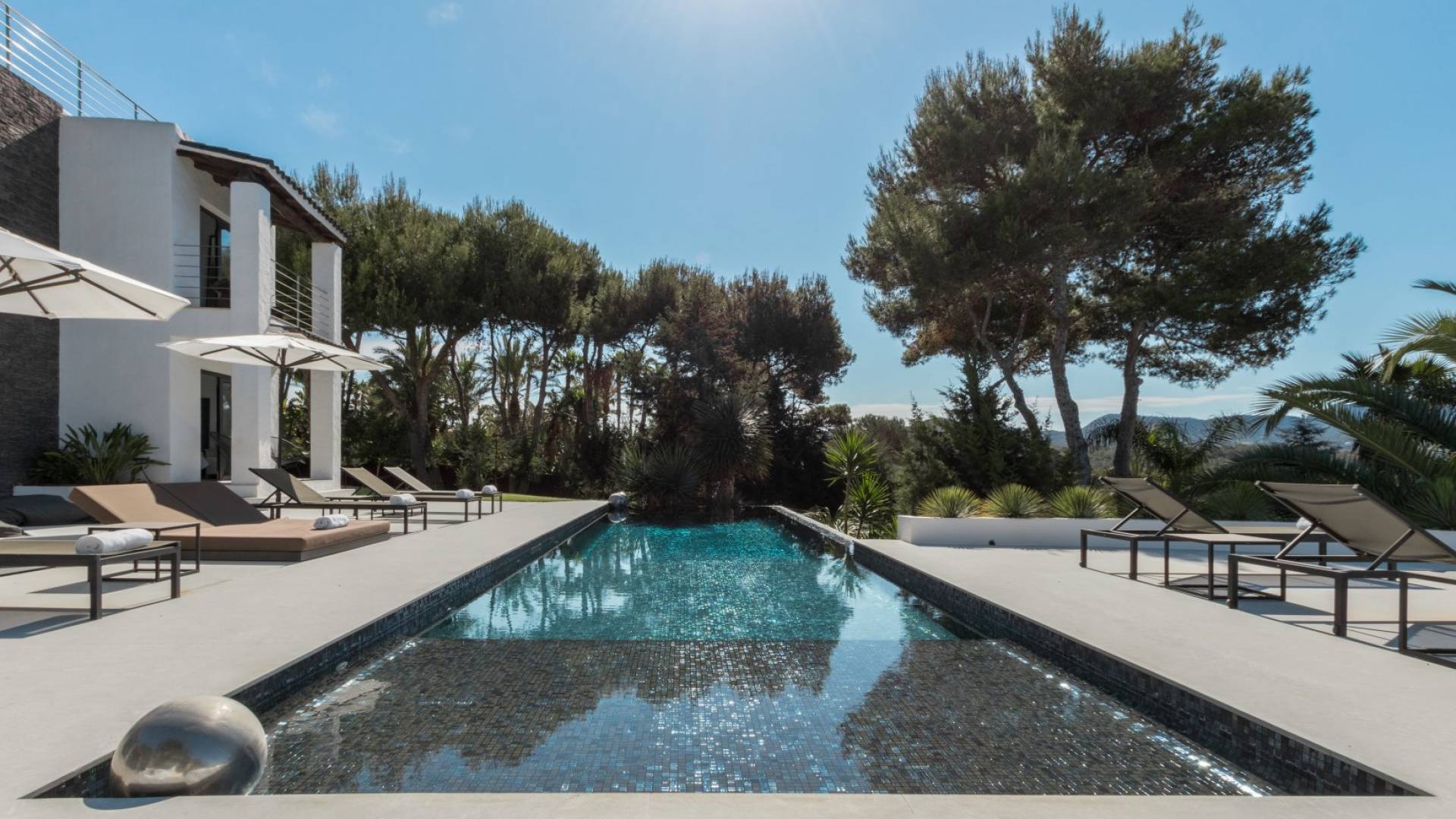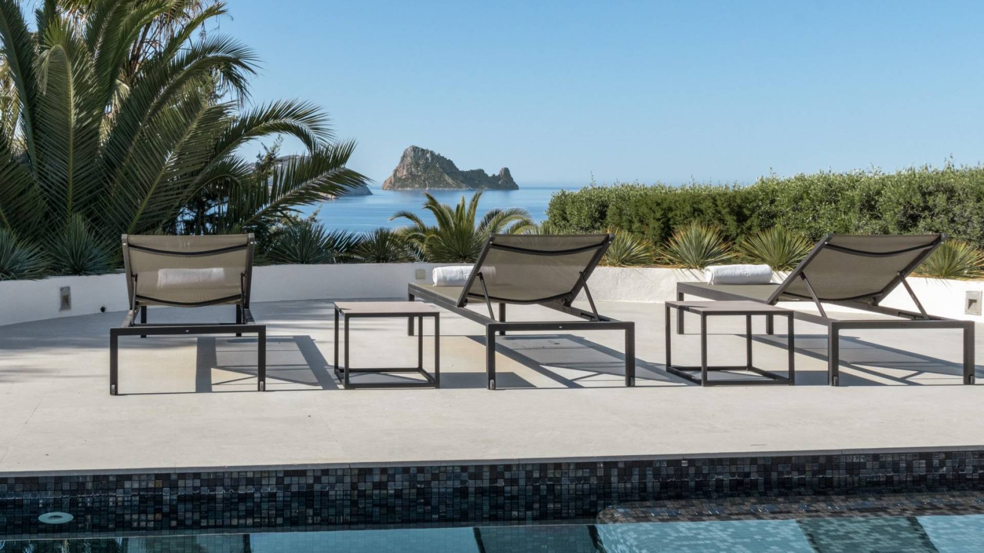 Externally Es Vedra Style Villa Ibiza features a huge terrace leading to a fantastic pool and sunbathing area where the stunning views can be truly appreciated. (Pool size - 13 m x 3.5 m). There are sun loungers and parasols on all terraces as well as an outdoor dining area. There are 10 professional security cameras that cover the entire outside area and the gated entrance from the street. Clients can choose to keep the cameras recording all the time or only once they are leaving the house and the high-end alarm system offers two modes of operation, a home mode, and an away mode.