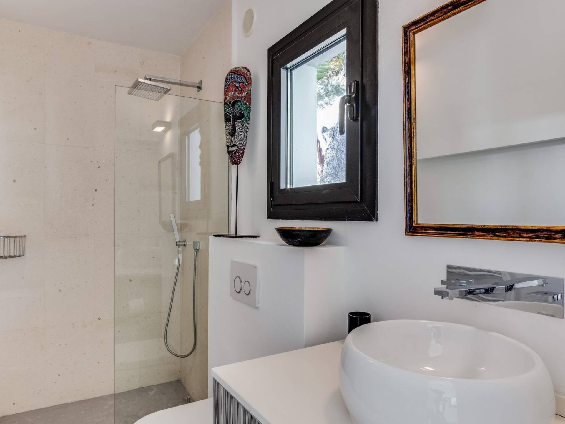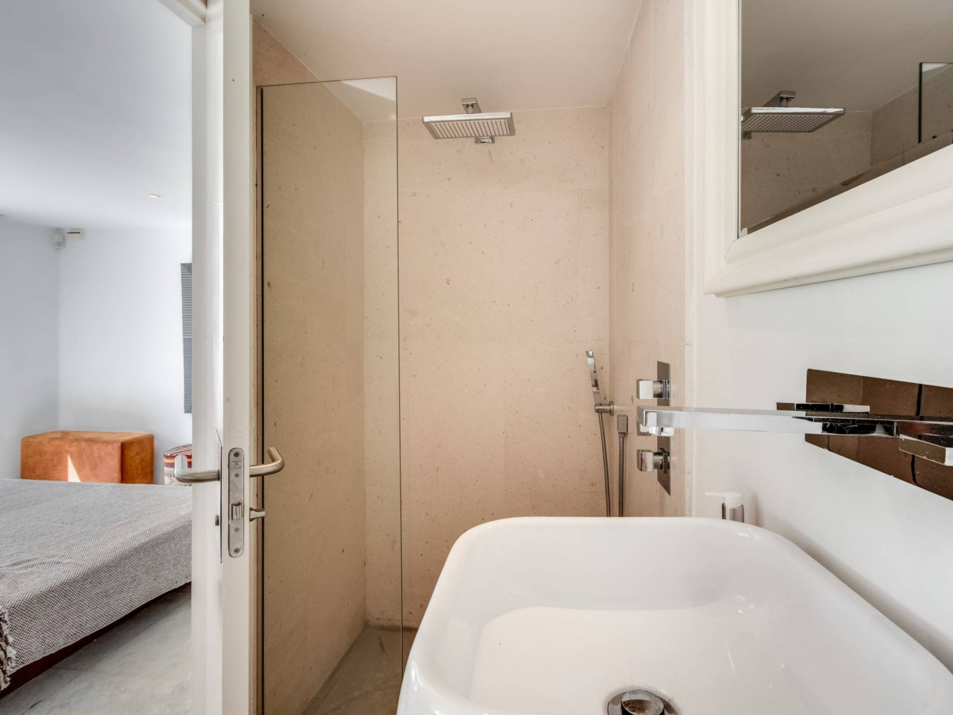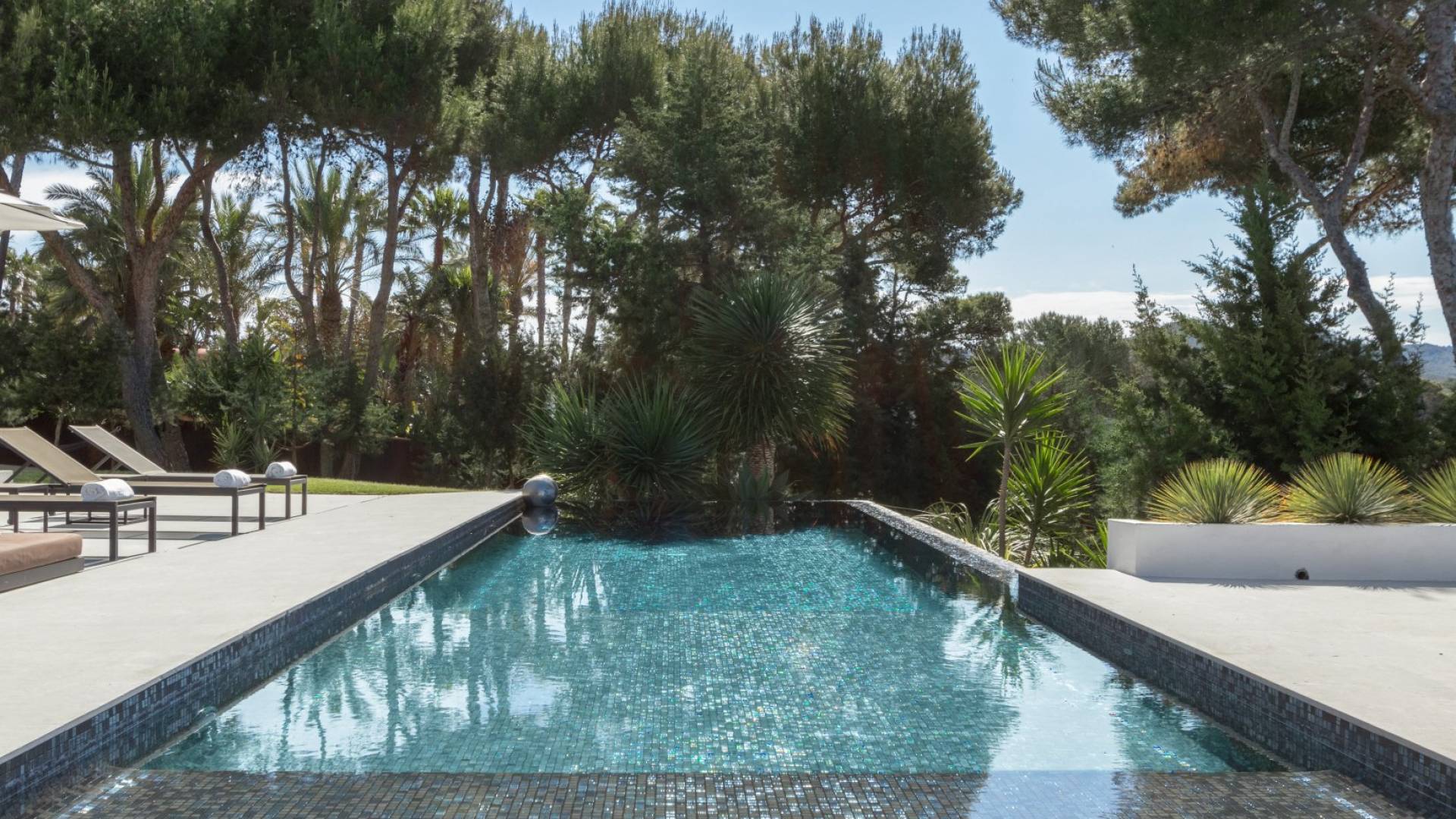 Externally Es Vedra Style Villa Ibiza features a huge terrace leading to a fantastic pool and sunbathing area where the stunning views can be truly appreciated. (Pool size - 13 m x 3.5 m). There are sun loungers and parasols on all terraces as well as an outdoor dining area. There are 10 professional security cameras that cover the entire outside area and the gated entrance from the street. Clients can choose to keep the cameras recording all the time or only once they are leaving the house and the high-end alarm system offers two modes of operation, a home mode, and an away mode.