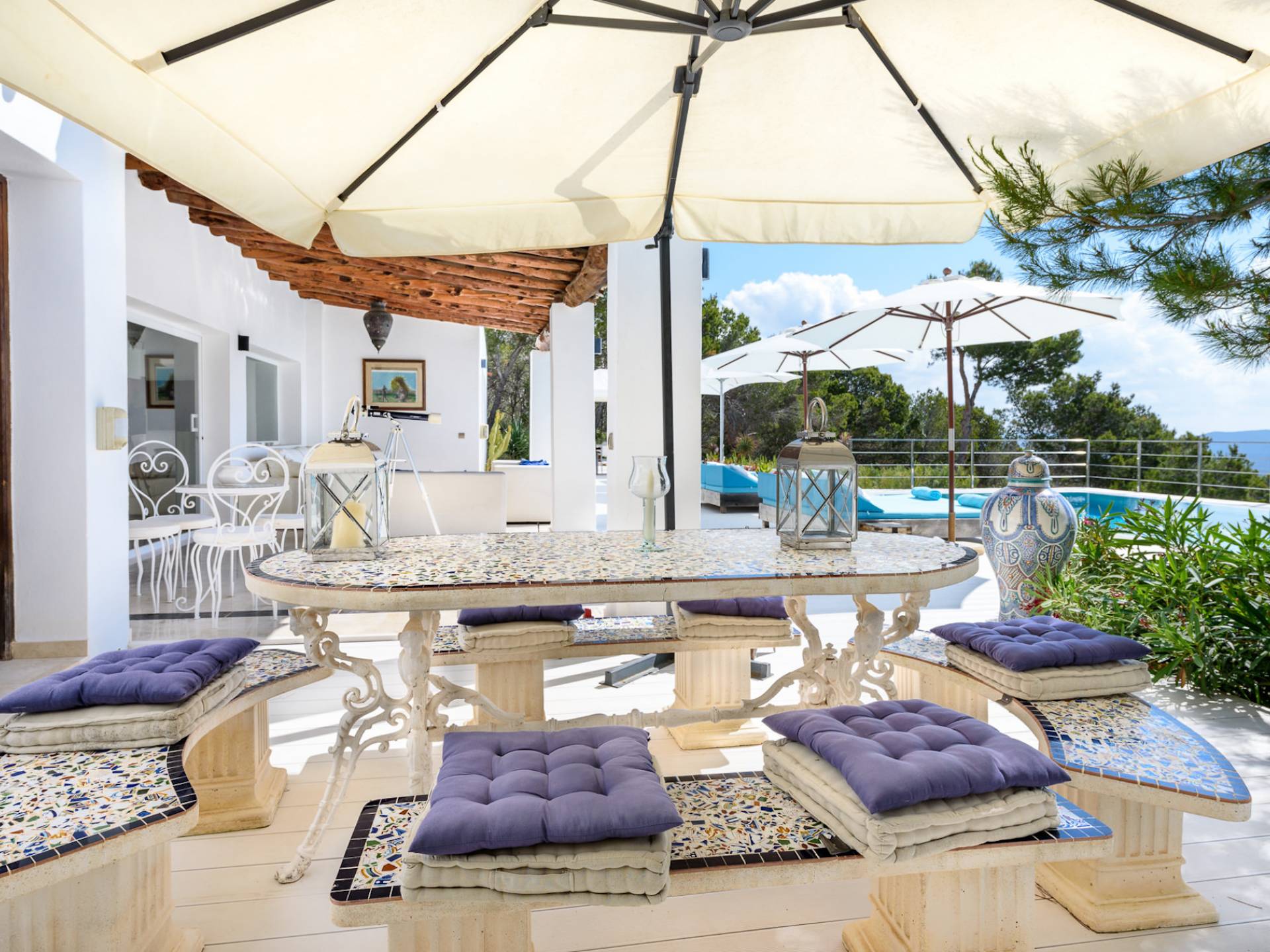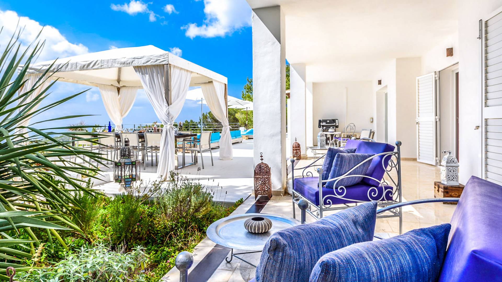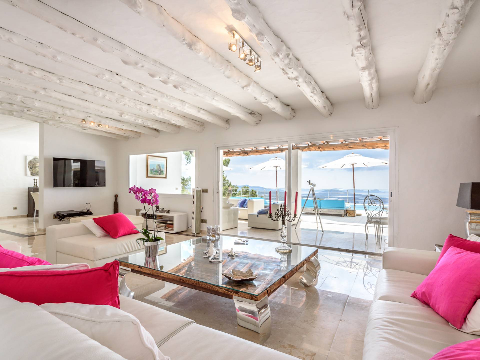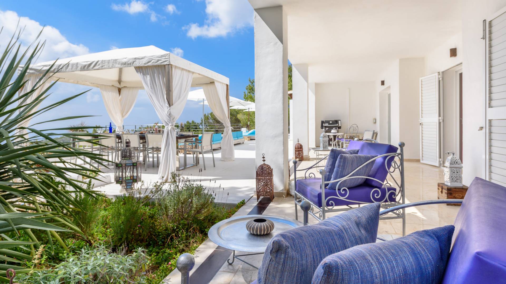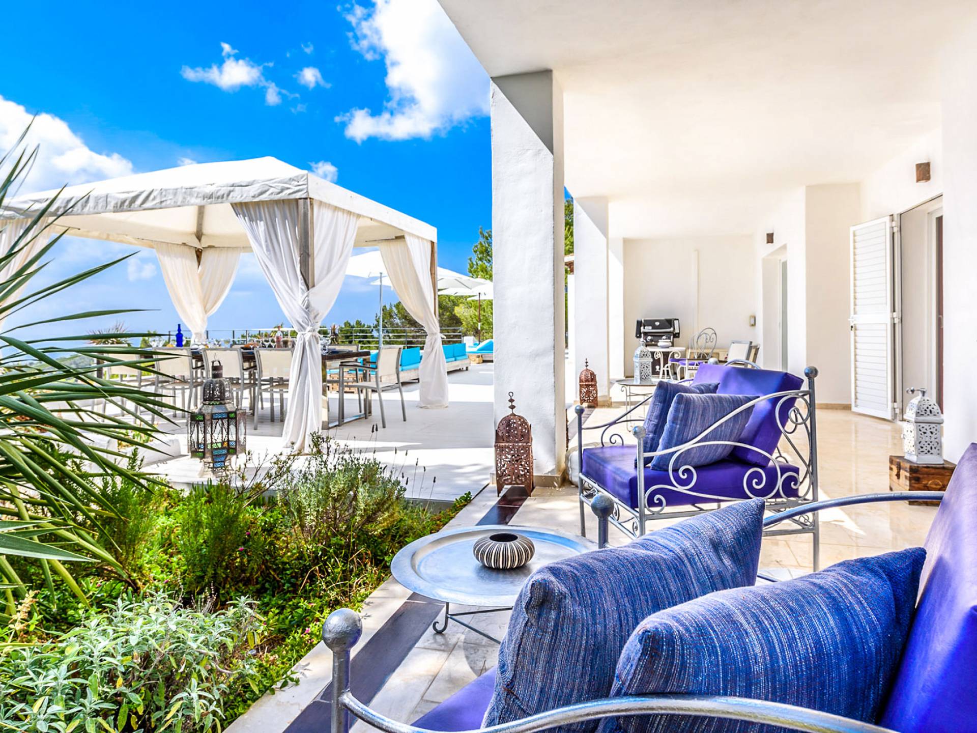 La Casa Romero Ibiza is a modern Moroccan-influenced property with amazing sea views situated in the heart of Ibiza’s golden mile. This beautiful 6 bedroom villa located in Es Cubells is built on a 4,500 m² plot which is fully enclosed with the added security of an electric gate. It is south facing with spectacular sea views to Salinas, Cala Jondal, and Formentera and only 10 minutes from San Jose and Cala Jondal Beach, Ibiza Town is only 20 minutes away.