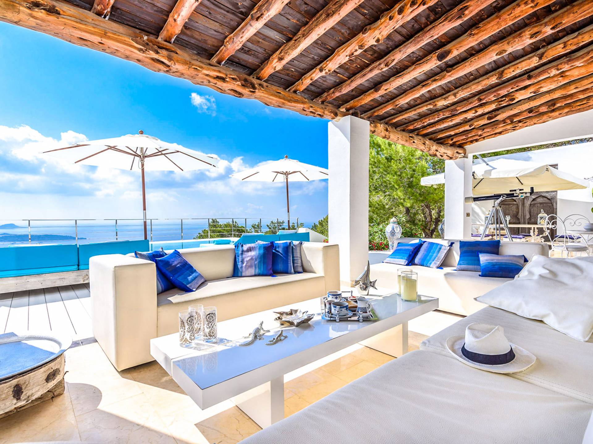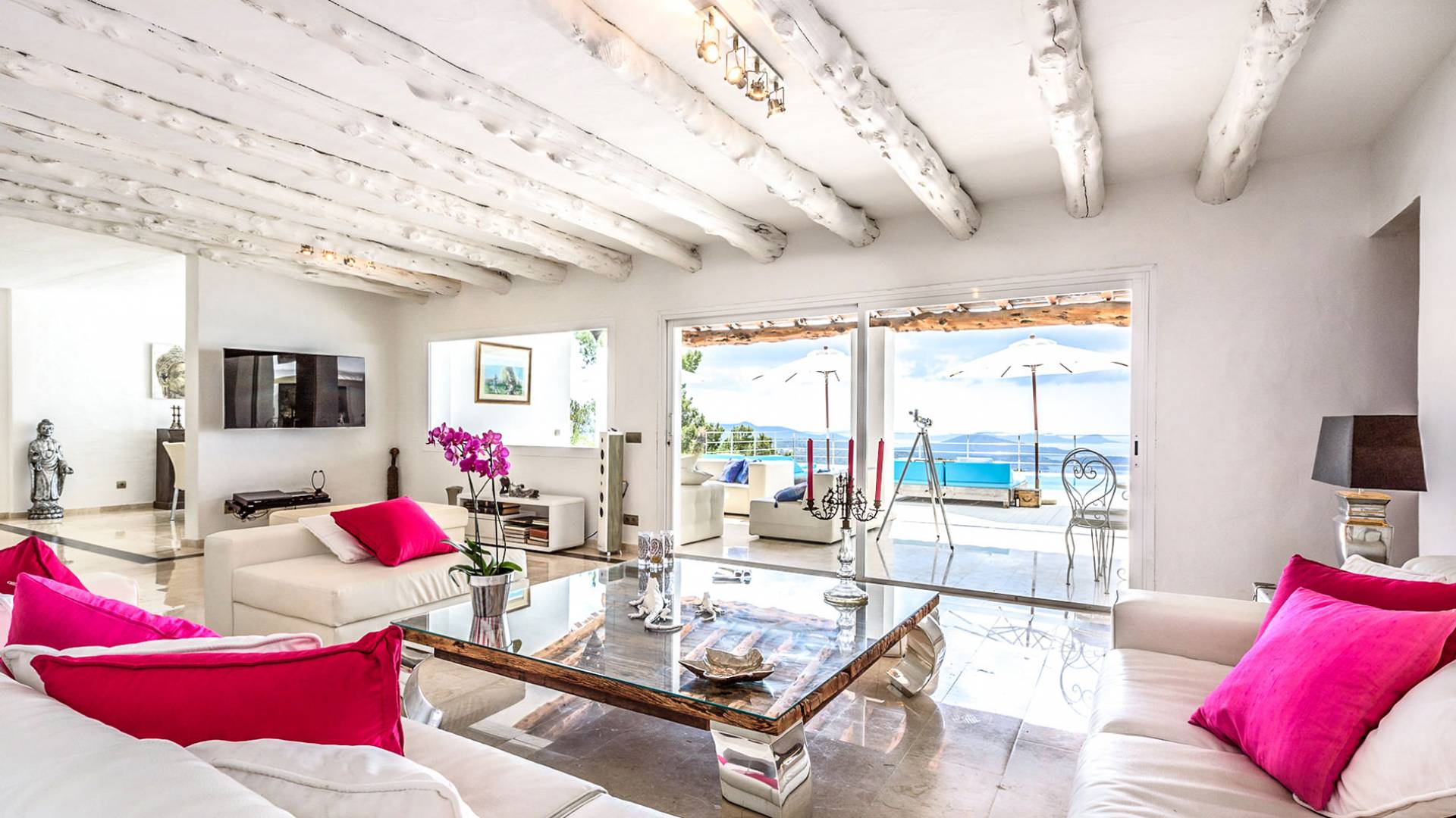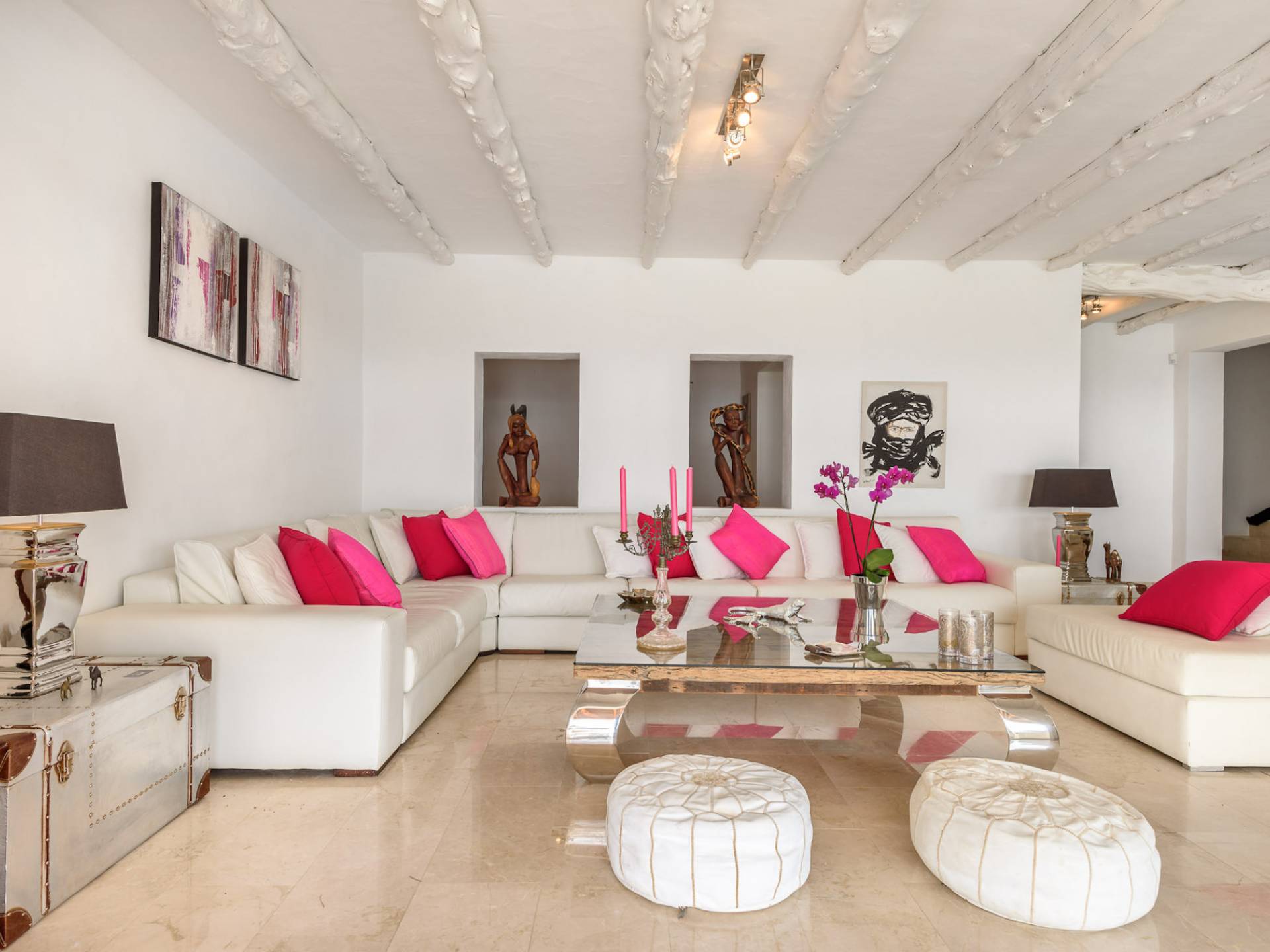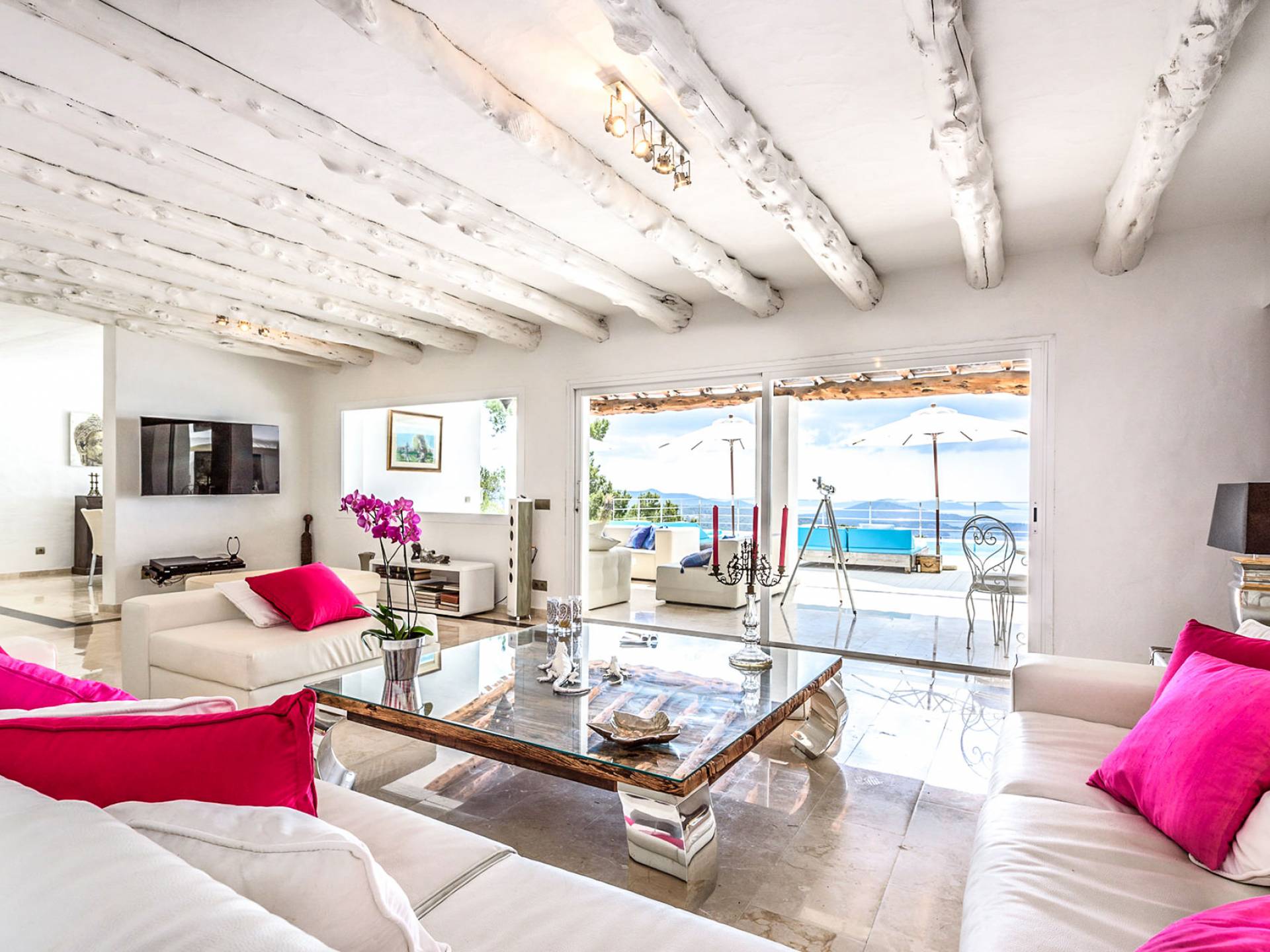 La Casa Romero Ibiza is a modern Moroccan-influenced property with amazing sea views situated in the heart of Ibiza’s golden mile. This beautiful 6 bedroom villa located in Es Cubells is built on a 4,500 m² plot which is fully enclosed with the added security of an electric gate. It is south facing with spectacular sea views to Salinas, Cala Jondal, and Formentera and only 10 minutes from San Jose and Cala Jondal Beach, Ibiza Town is only 20 minutes away.