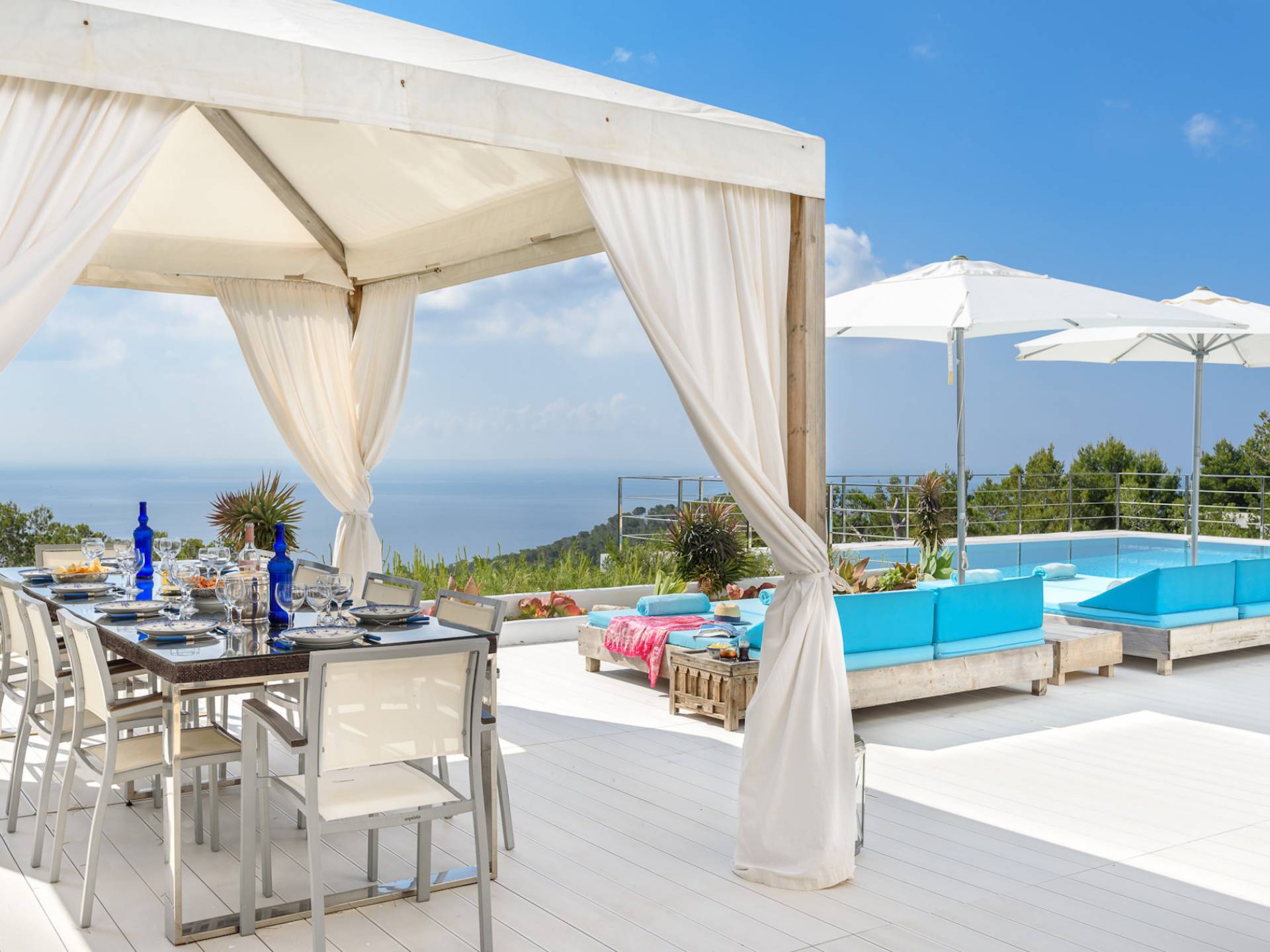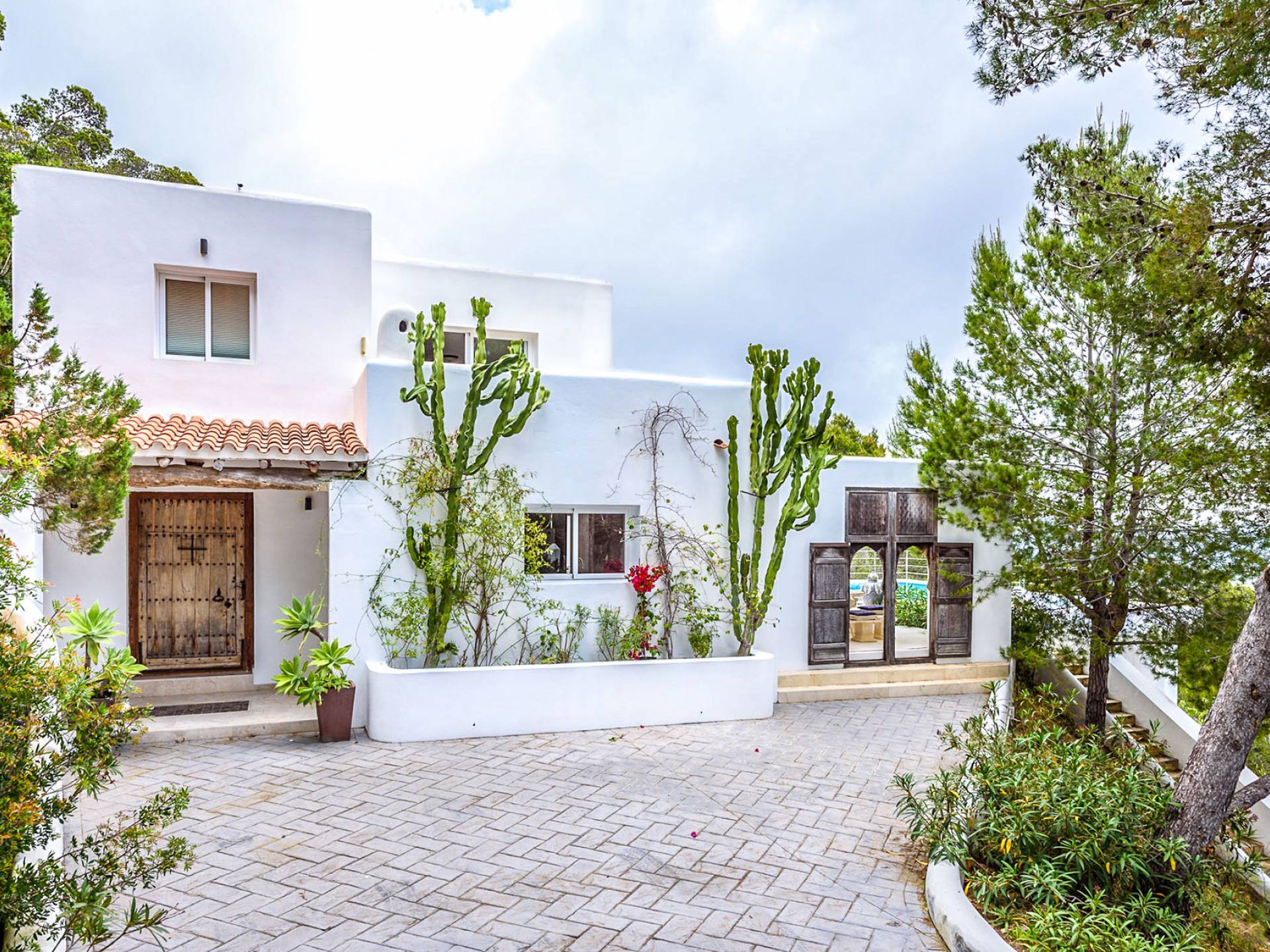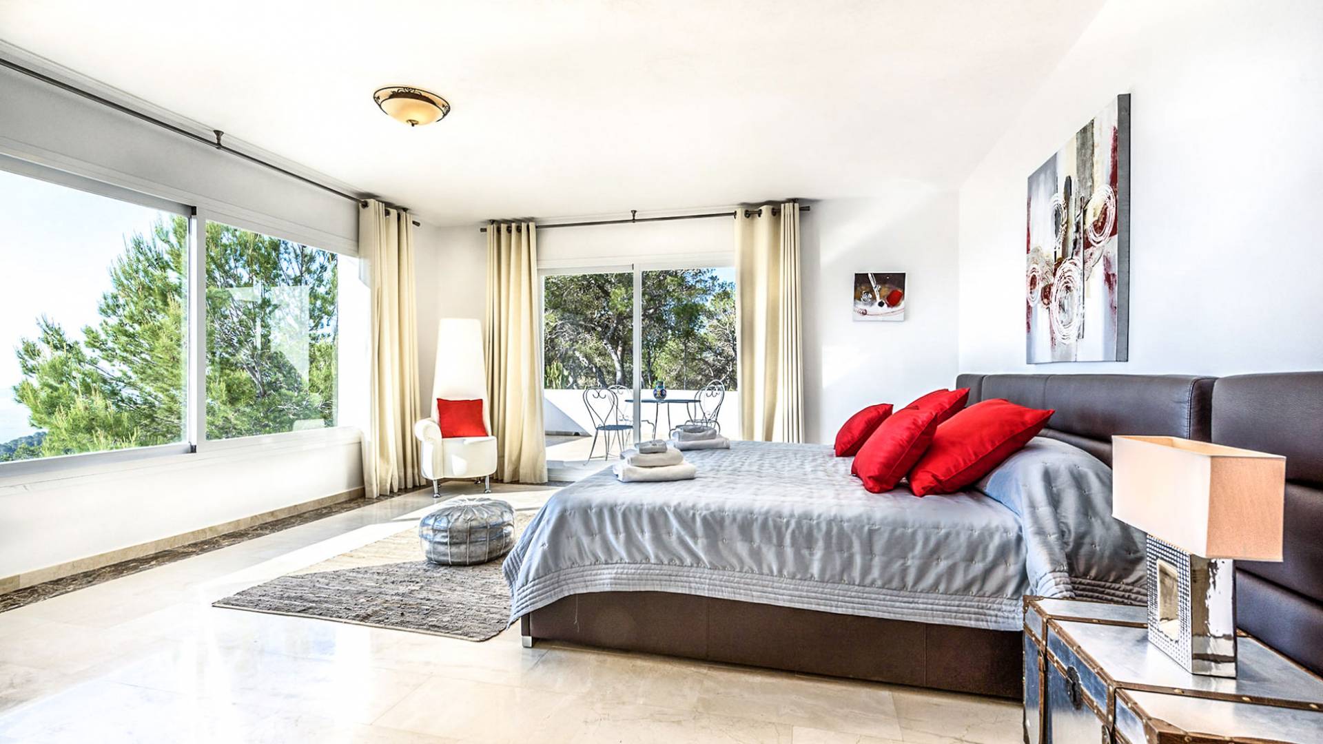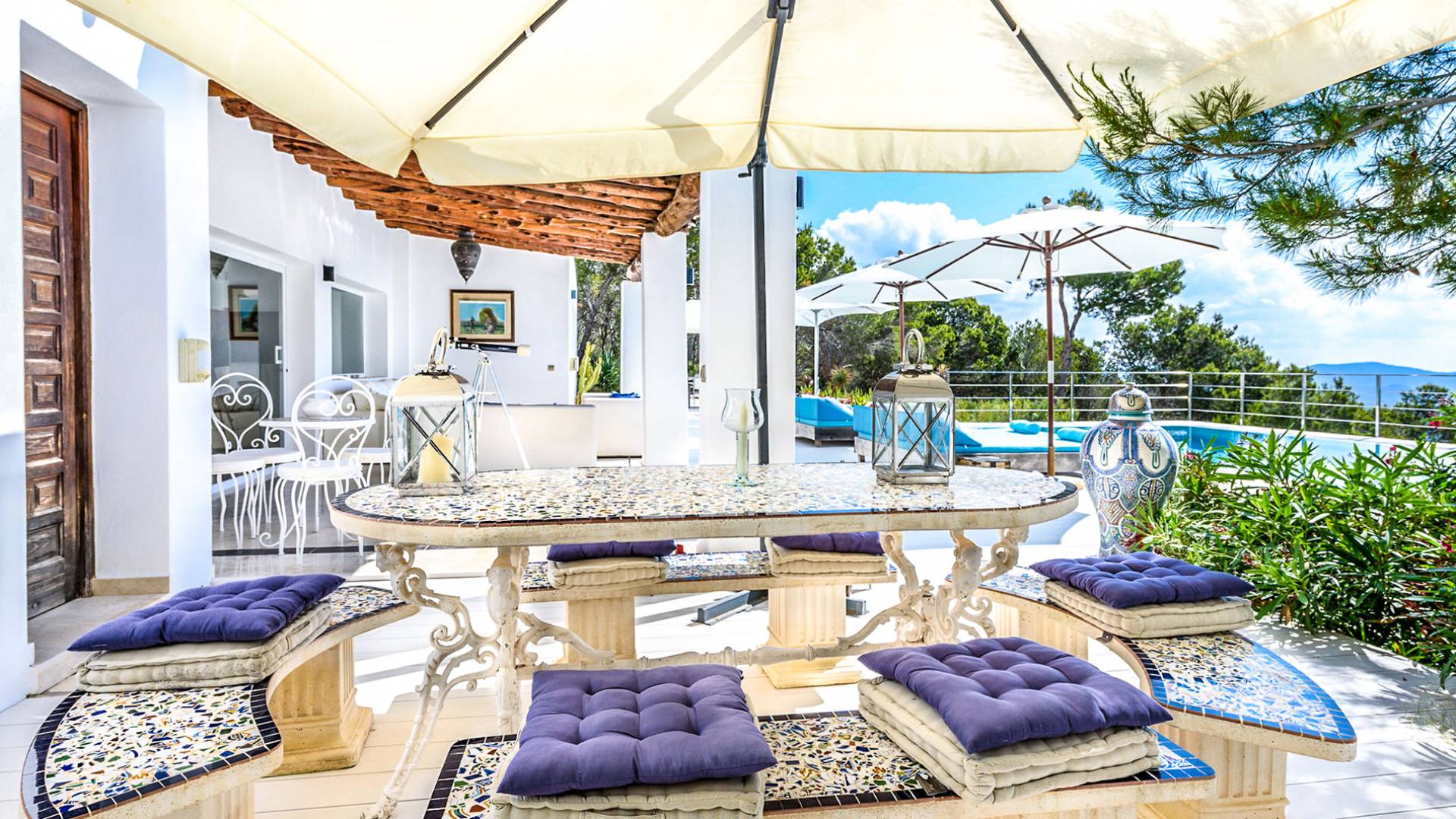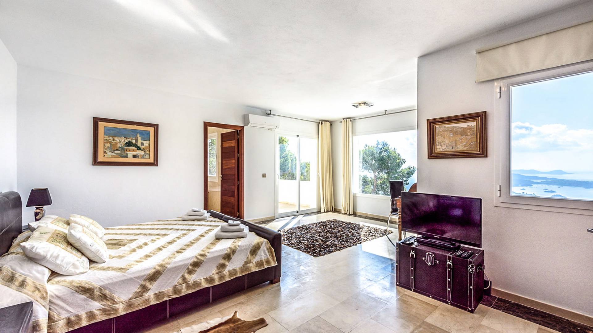 La Casa Romero Ibiza is a modern Moroccan-influenced property with amazing sea views situated in the heart of Ibiza’s golden mile. This beautiful 6 bedroom villa located in Es Cubells is built on a 4,500 m² plot which is fully enclosed with the added security of an electric gate. It is south facing with spectacular sea views to Salinas, Cala Jondal, and Formentera and only 10 minutes from San Jose and Cala Jondal Beach, Ibiza Town is only 20 minutes away.