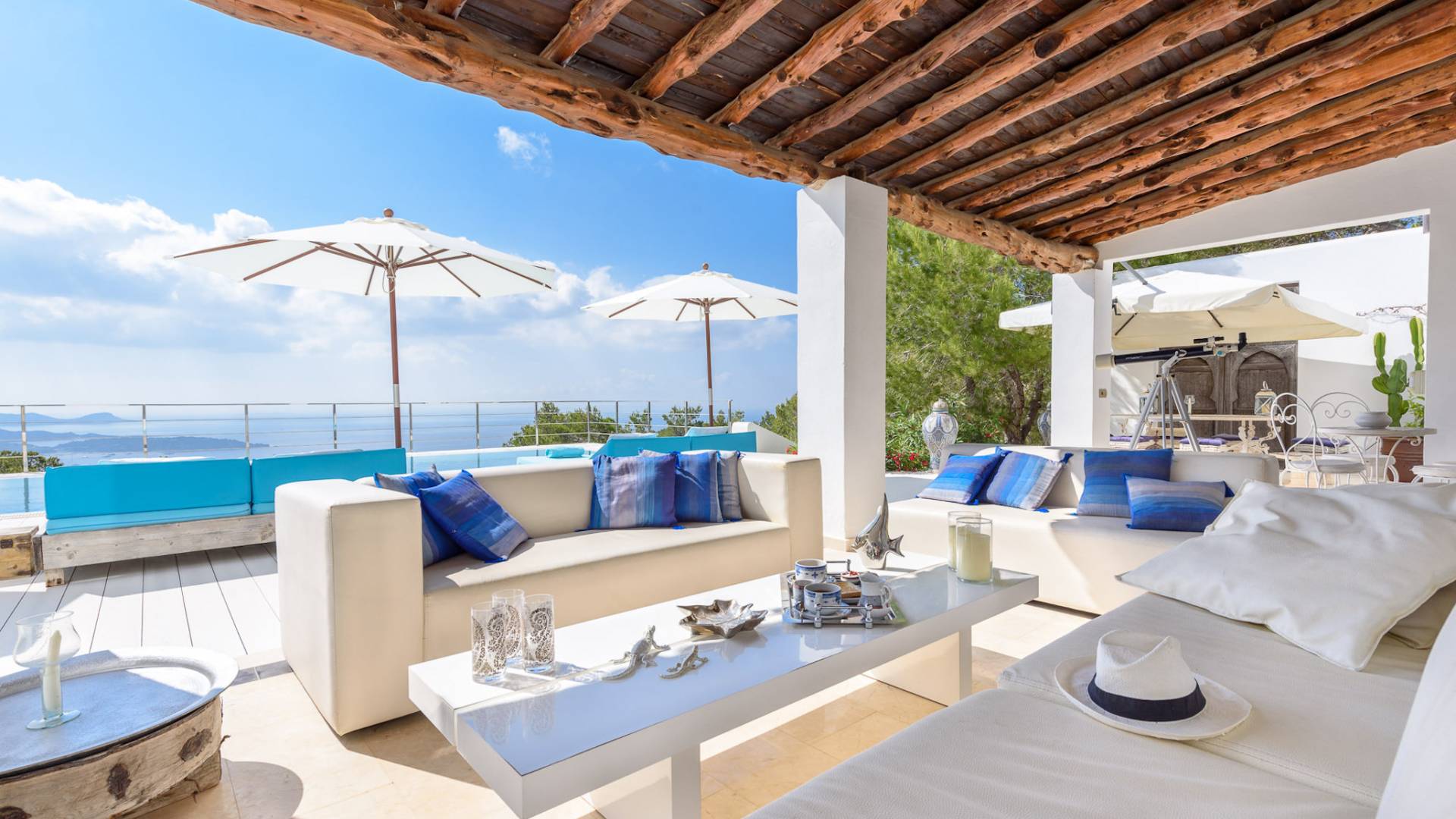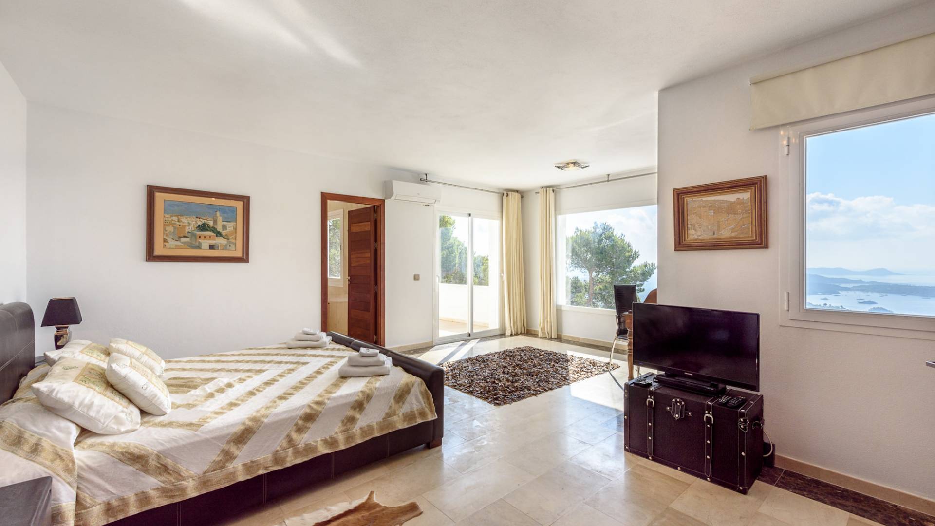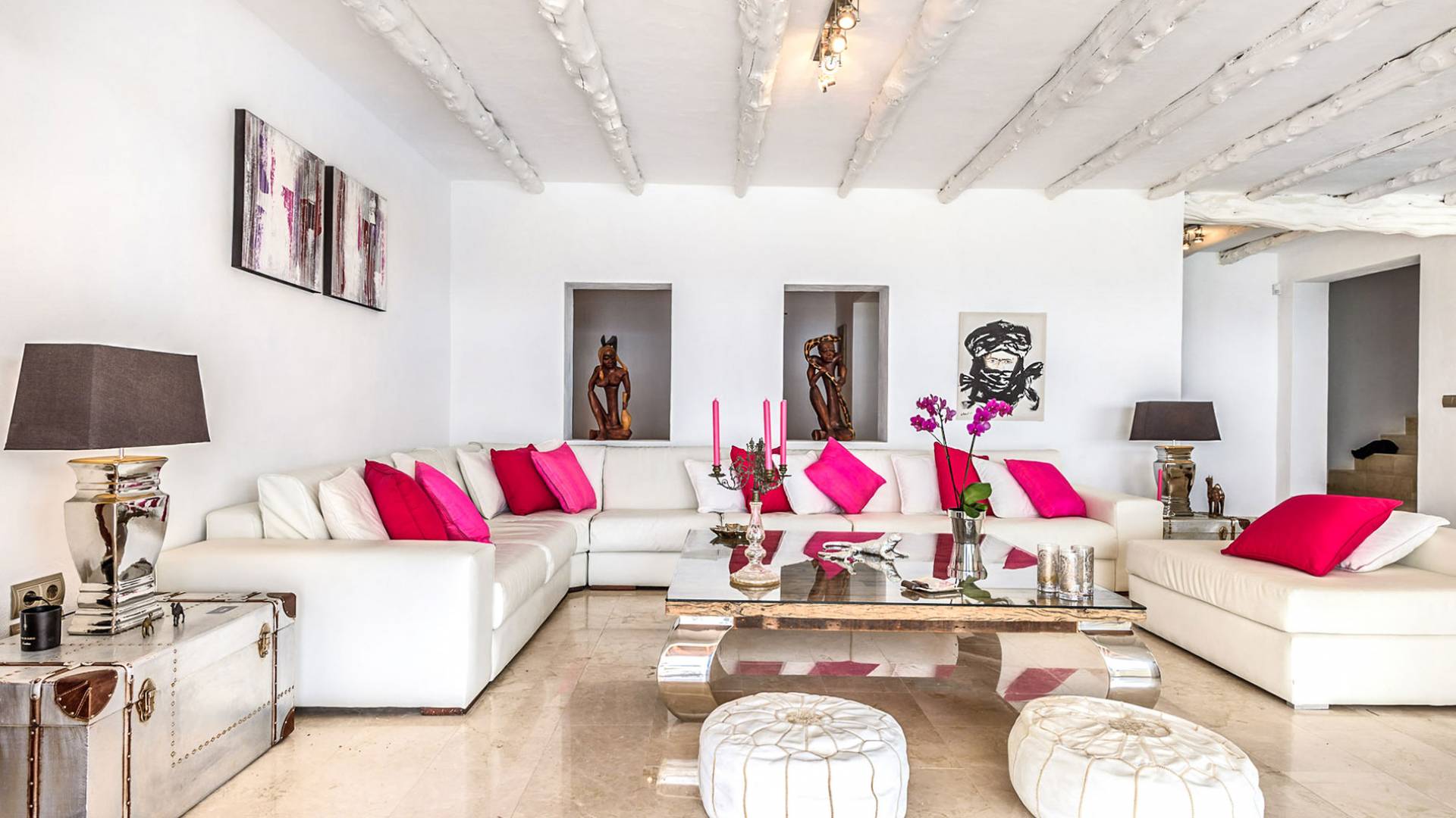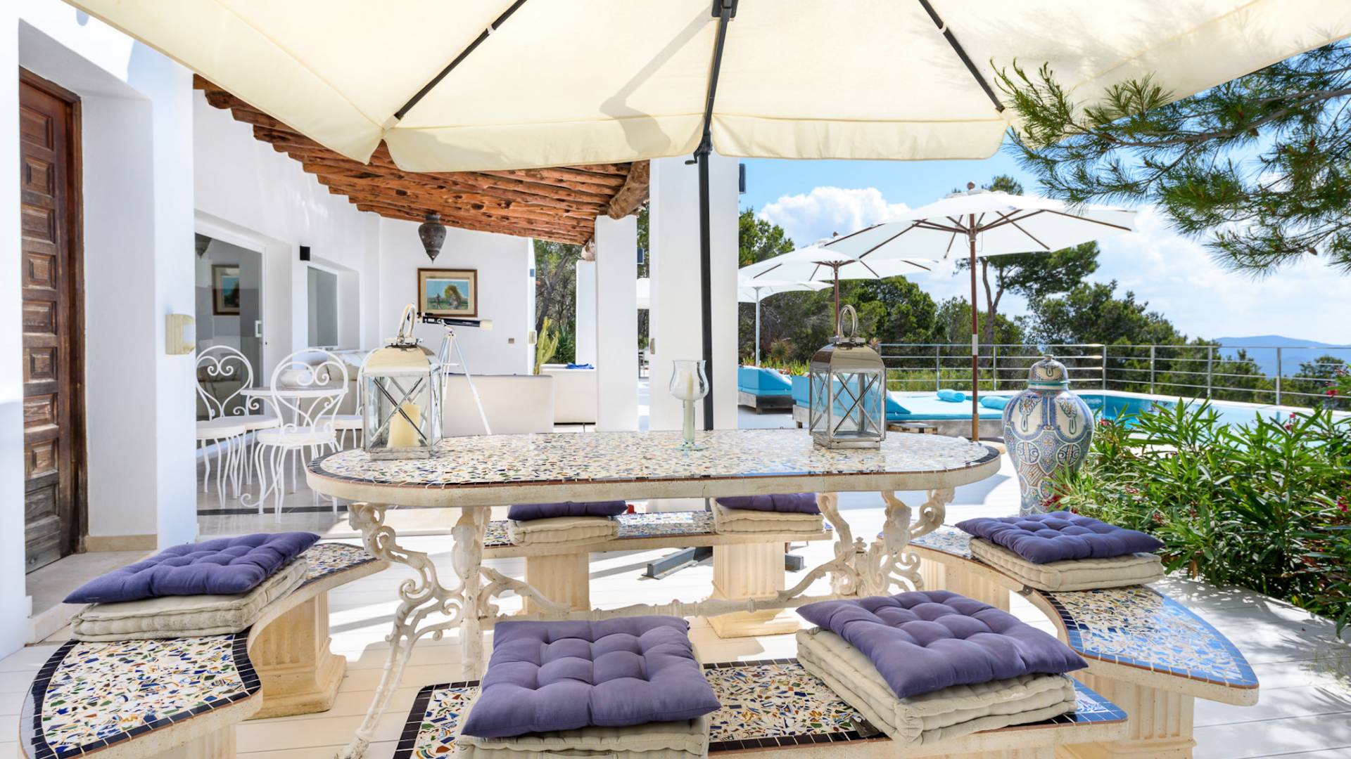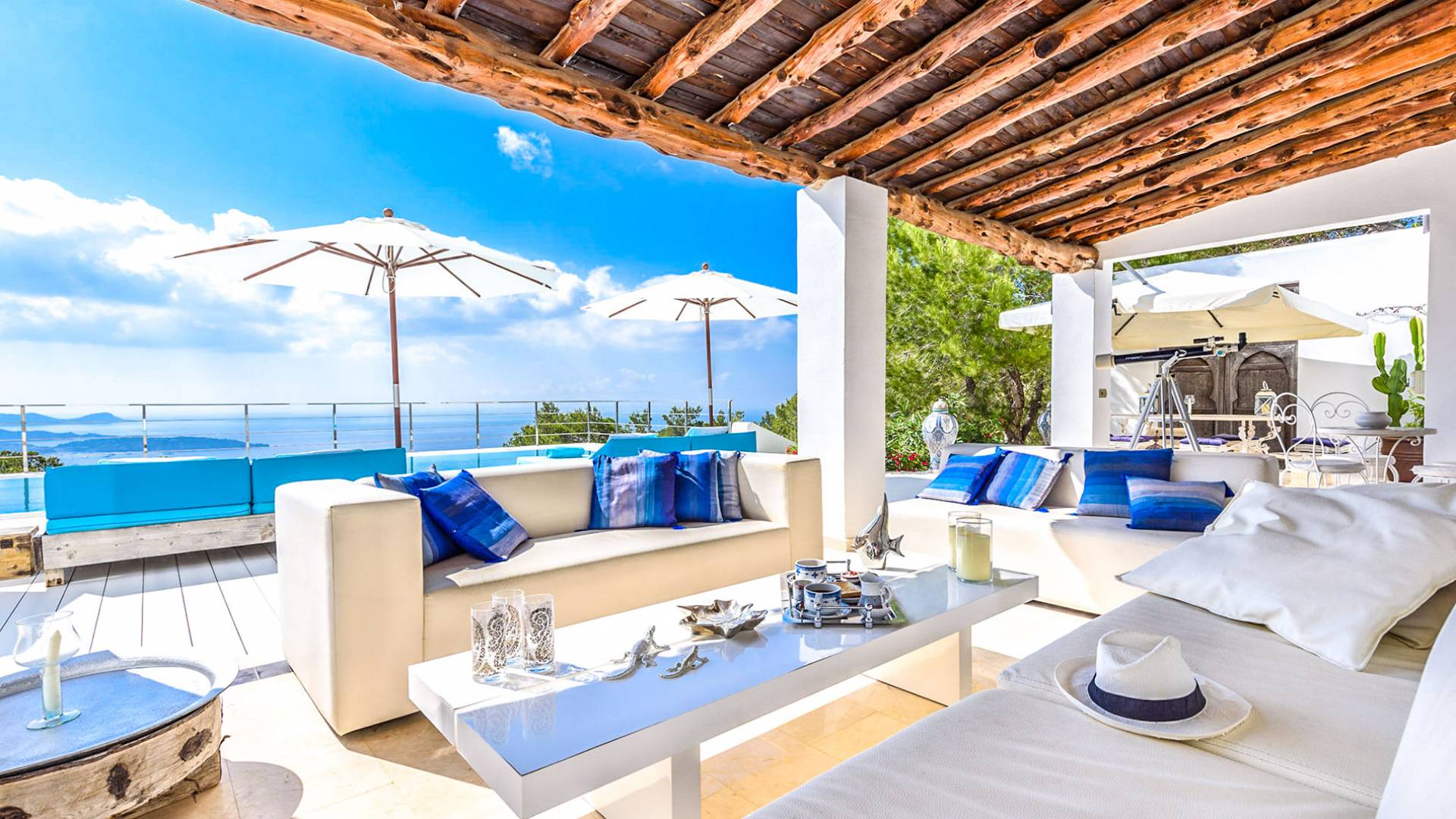 La Casa Romero Ibiza is a modern Moroccan-influenced property with amazing sea views situated in the heart of Ibiza’s golden mile. This beautiful 6 bedroom villa located in Es Cubells is built on a 4,500 m² plot which is fully enclosed with the added security of an electric gate. It is south facing with spectacular sea views to Salinas, Cala Jondal, and Formentera and only 10 minutes from San Jose and Cala Jondal Beach, Ibiza Town is only 20 minutes away.