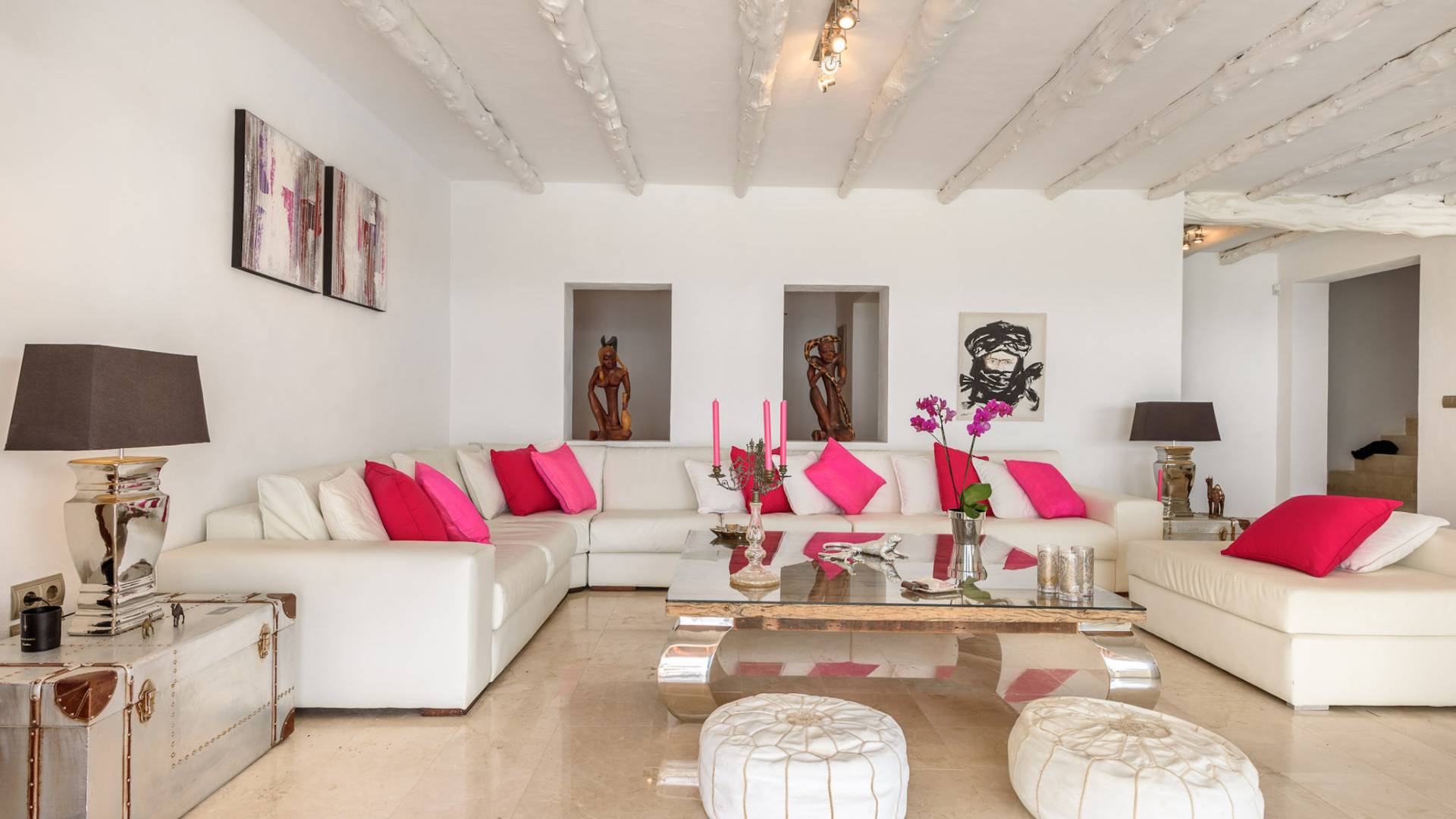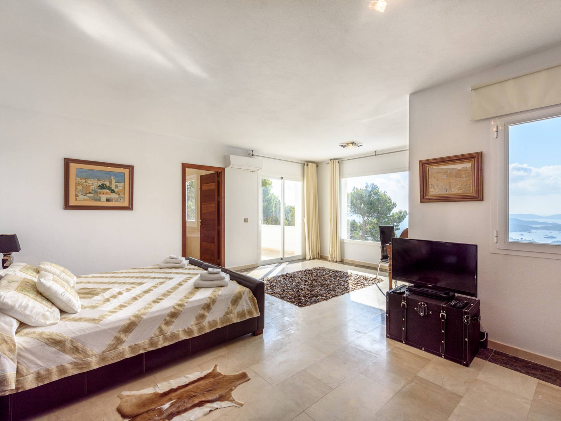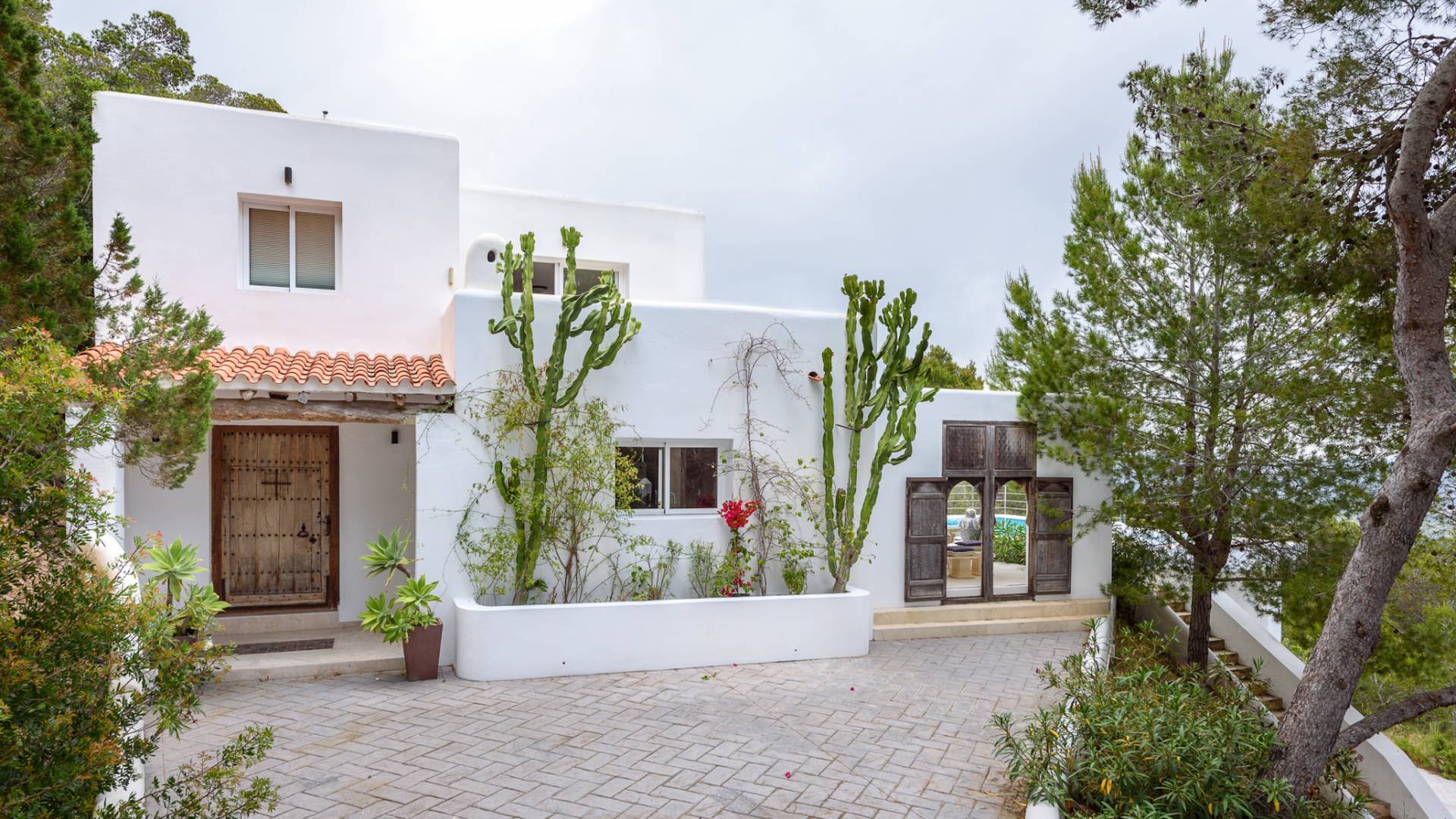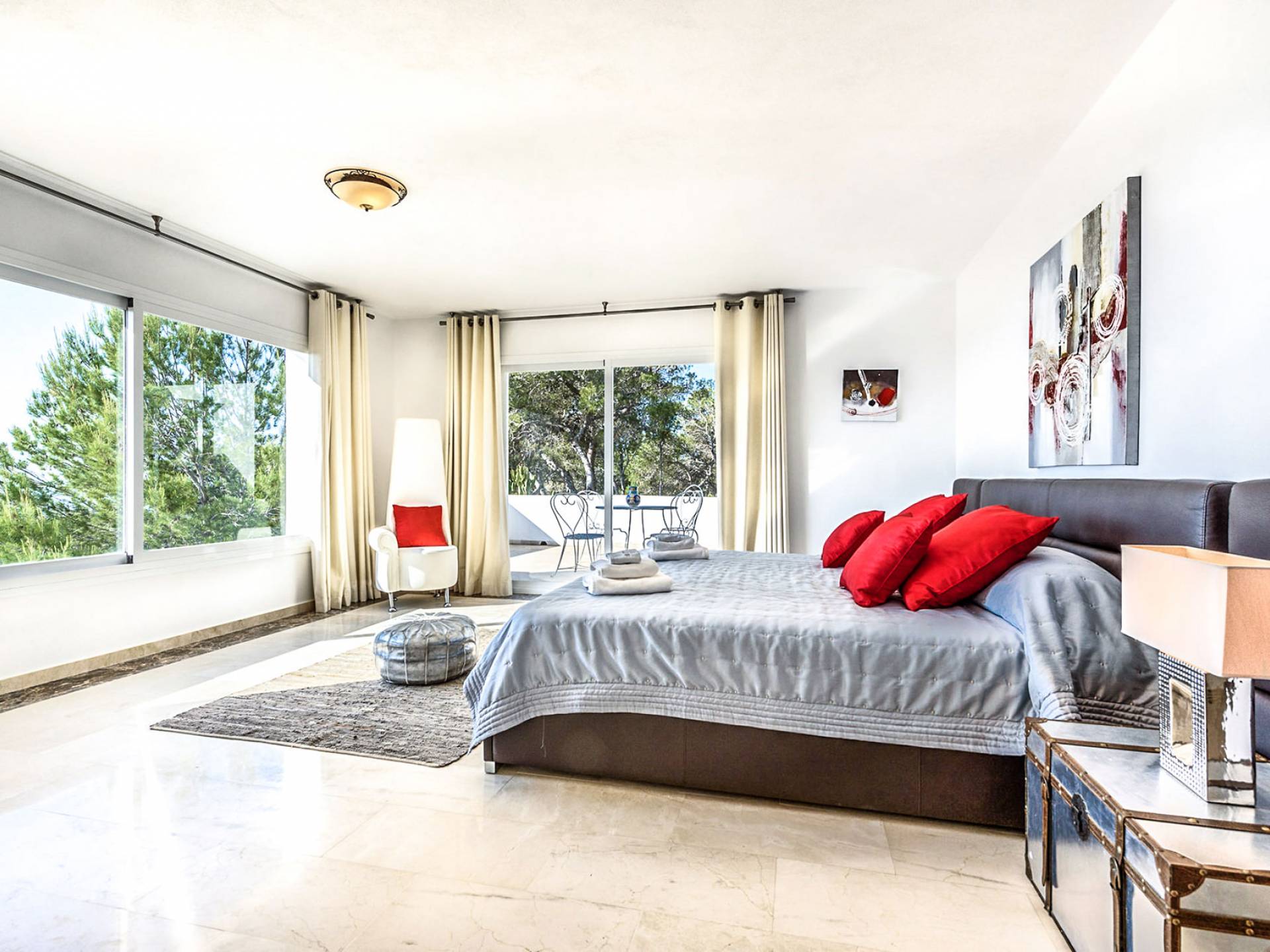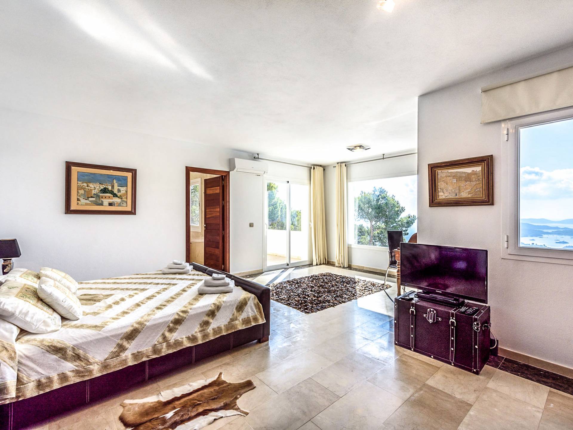 La Casa Romero Ibiza is a modern Moroccan-influenced property with amazing sea views situated in the heart of Ibiza’s golden mile. This beautiful 6 bedroom villa located in Es Cubells is built on a 4,500 m² plot which is fully enclosed with the added security of an electric gate. It is south facing with spectacular sea views to Salinas, Cala Jondal, and Formentera and only 10 minutes from San Jose and Cala Jondal Beach, Ibiza Town is only 20 minutes away.